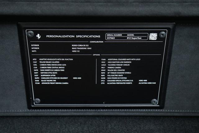 Ferrari 812 Superfast- FRONT END PPF -- FERRARI CERTIFIED PRE-OWNED - AVAILABLE EXTENDED FERRARI WARRANTY -- Rosso Corsa over Beige - ONE OWNER - Very Low Miles - Pristine Condition - Many Fine Options - Expertly Maintained by Our Factory Trained Technicians - Available Extended Ferrari Warranty - Complimentary Ferrari Maintenance to 4/13/28 -Factory Options:- Suspension Lifter- Carbon Fiber Driver Zone with LED Steering Wheel- Carbon Fiber Dashboard Inserts- Carbon Fiber Central Bridge- 20-inch Forged Diamond Wheels- Yellow Brake Calipers- Scuderia Ferrari Shields- Full Electric Seats- Daytona Style Seats- Perforated Alcantara Seat Inserts in Nero- Cavallino Stitched to Headrests in Nero- Special Stitching in Nero- Carpets in Nero- Adaptive Headlights- Advanced Front Driving Camera- Black Tailpipe Tips- Embroidered Mats with Logo- High Emotion Low Emission (HELE) System- Parking Camera- Yellow Rev CounterIf you are in the market for a Ferrari 812 Superfast, please call or email us today.This Ferrari has passed a multi-point inspection performed by our factory trained technicians, and has been enrolled in the Ferrari Approved Certified Pre-Owned Program. The Certified program makes available up to two years of additional Ferrari Power Approved Warranty coverage. Please see dealer for more details.