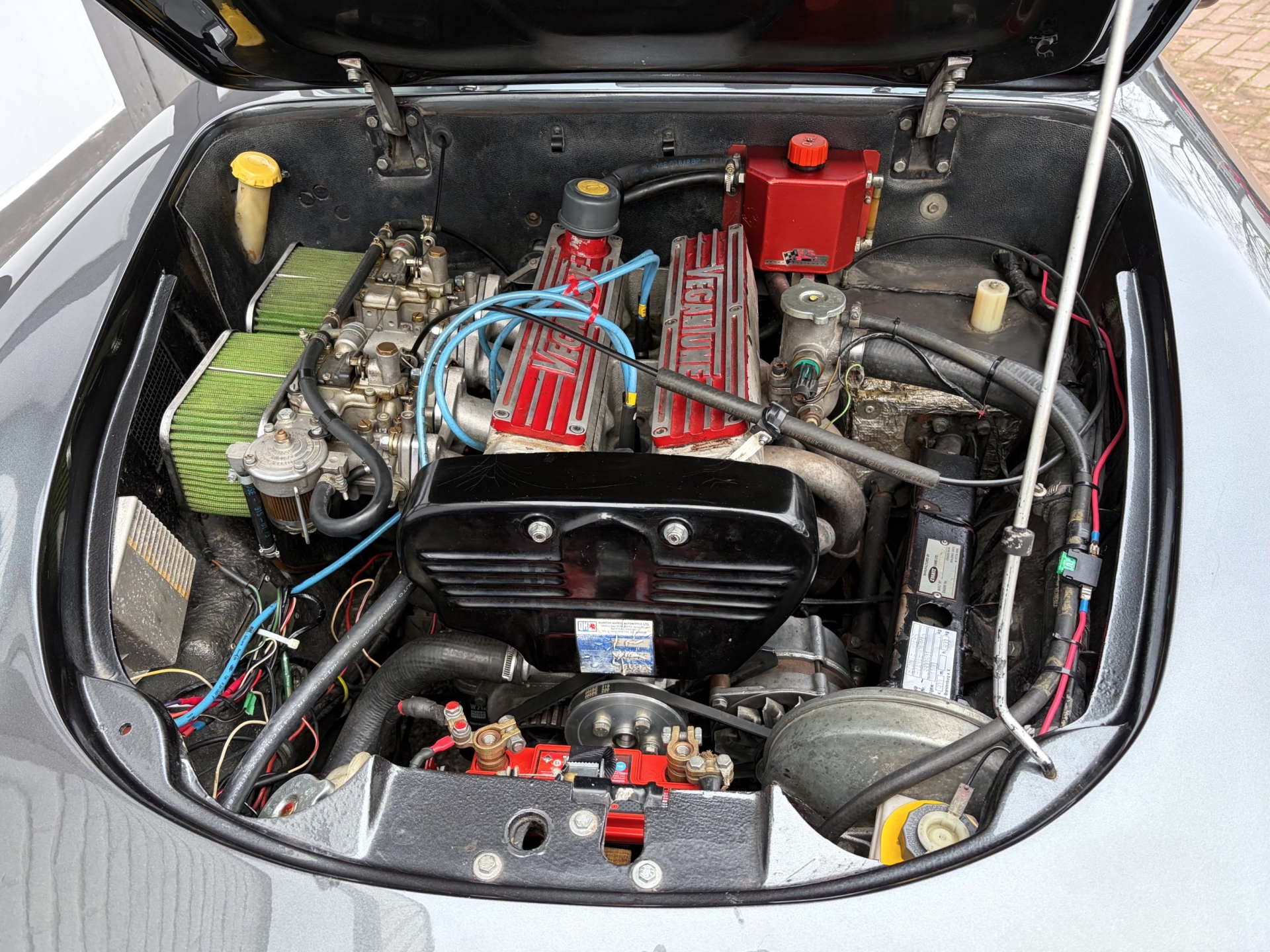 This Evante has been repainted in its original colour, ‘Anthracite Metallic’, and the paintwork is of high quality. The body is made of polyester, reinforced with Kevlar. So it is ultra-light, very rigid and extremely strong. Everything is built by hand and every connoisseur knows that it is very difficult to get a polyester bodywork nice and smooth. Time-consuming and costly. The advantage is that rust has no chance. There are some signs of wear on the left side, but that is to be expected after almost 37 years. The original bonnet is still remarkably beautiful and closes tightly. The original cover is also present, as is the tonneau cover. A few clips are missing. The original rims are beautiful and fitted with the correct tyres.