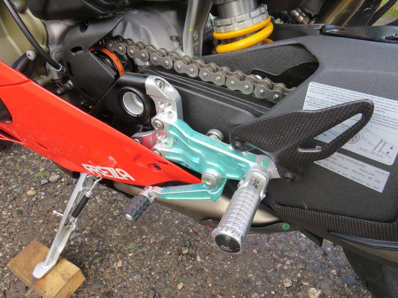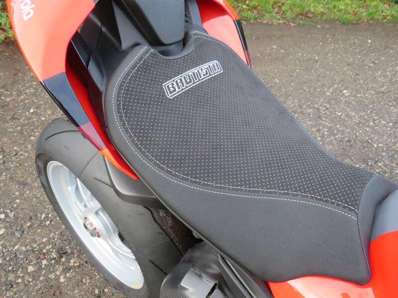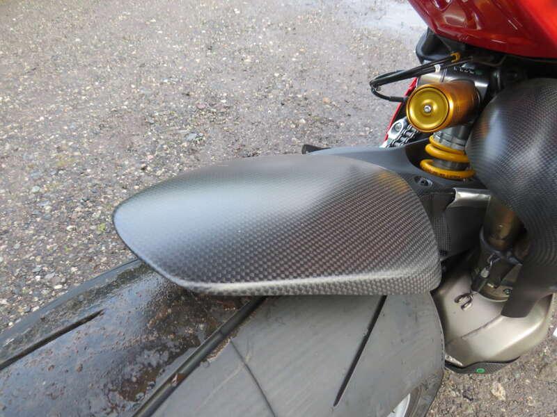 - Fitted with a single race seat, dry clutch, Akrapovic exhaust, carbon exhaust cover and mudguards, Brembo calipers and adjustable Rizoma billet footpegs