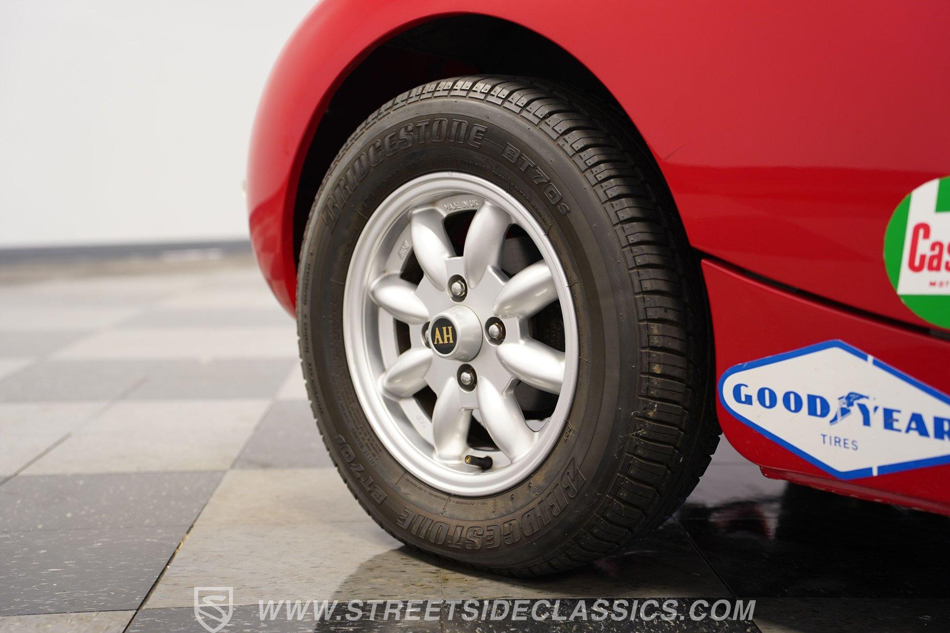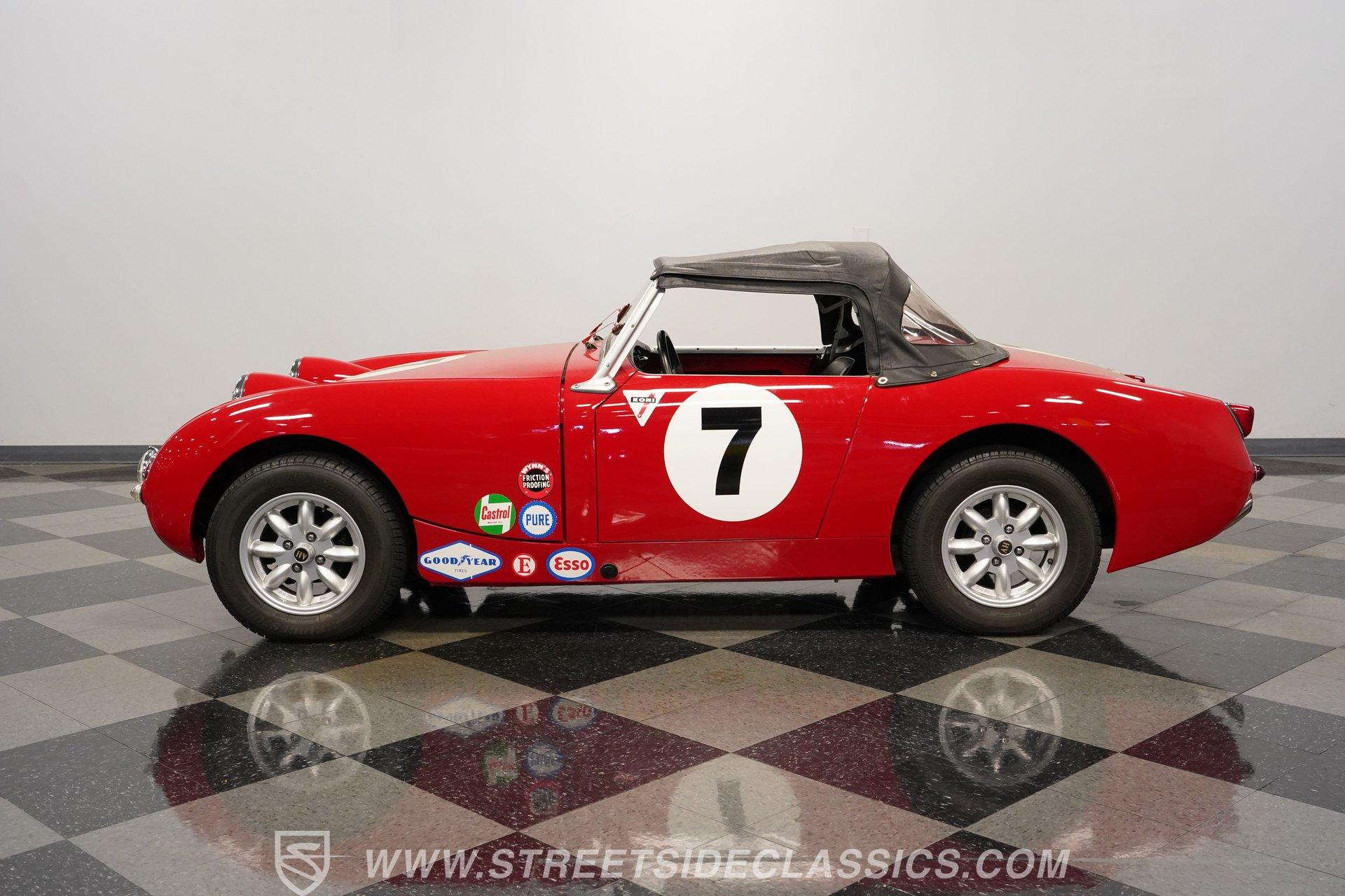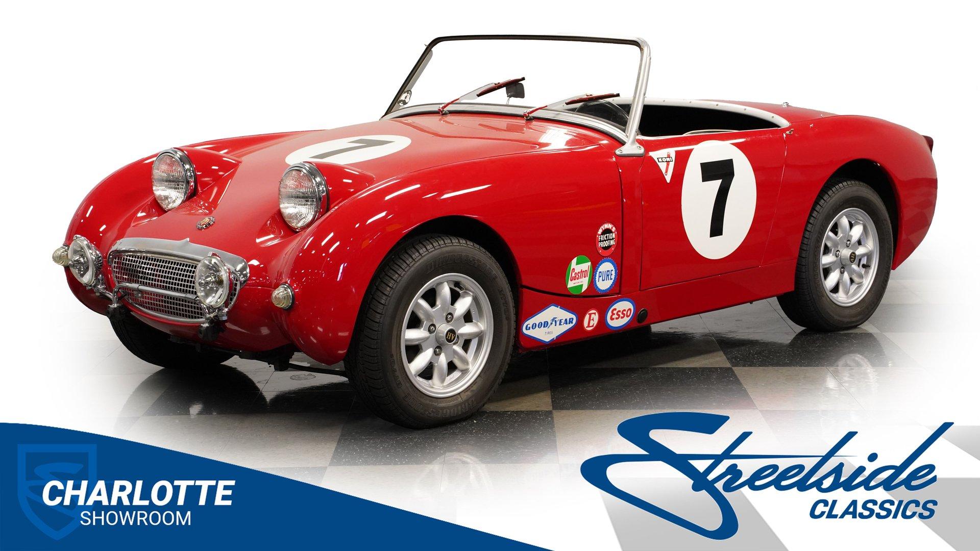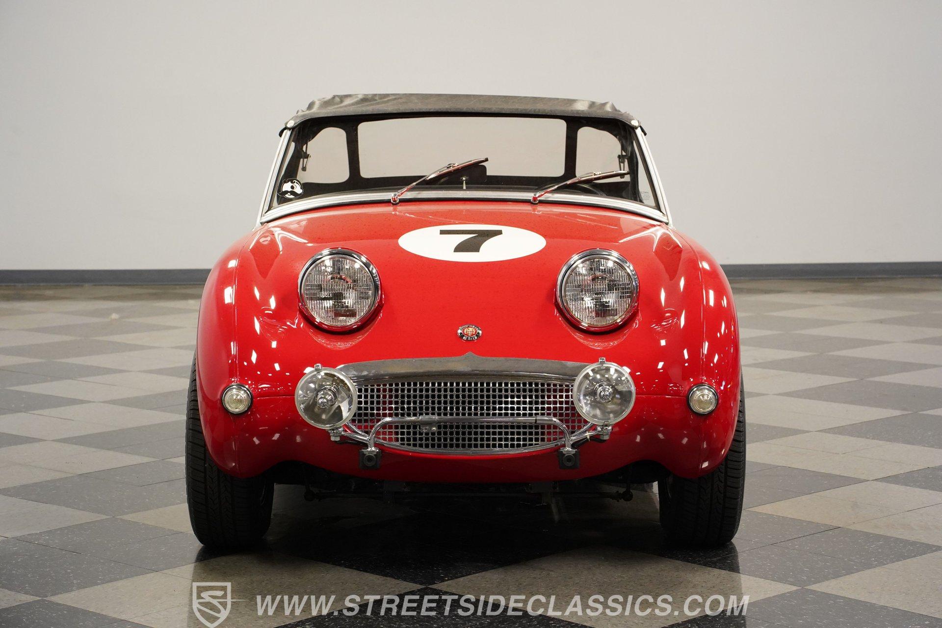 It's not all that often that you can say a car possesses true personality, but this 1960 Austin Healey Sprite MK1 Bugeye represents one of those rare instances. Dressed in vibrant red paint that's ornamented with a collection of decals conveying an authentically vintage racing appearance, this compact ride looks like it just hopped off the screen of a recent "Cars" movie. Those signature headlights from which this British classic gets its nickname are in fine shape, and they're accompanied by a pair of "flamethrower"-style driving lights that not only light the way ahead in more unforgiving driving conditions, but are also still in good form as well, as is the collection of bright work. Should the skies threaten rain when you're behind the wheel, the featured black canvas convertible top fits well and includes side curtains that make driving a whole lot easier in such conditions. Climb inside and you'll be surrounded by a no-frills, but very functional driving environment that's been left in factory configuration and is in perfect keeping with this car's rally-inspired identity. The vinyl-clad bucket seats still have plenty of life left in them and are outfitted with racing-style lap belts. Up front, the instrument panel features a collection of factory-issue gauges that are still easily readable through clear lenses. The shifter is positioned within easy reach and beckons you to grab hold and put this classic through its paces. This automotive icon delivers on its promise of unadorned driving fun. Weighing less than 1500lbs and outfitted with a period-correct 1298-cc 4-cylinder engine that's fed by a pair of dual SU carburetors, it's an enthusiastic performer with go-cart-like responsiveness. Its 4-speed manual shifts very smoothly via a well-adjusted clutch, and its braking system features discs up front, bringing it to a stop in short order. And, owing to its low center of gravity and modest curb weight that rides on a factory suspension in good working order, you have a ride that's an absolute blast to take through corners. A look below will reveal an undercarriage that's still structurally sound after more than 60 years of service. HIGHLIGHTS PERIOD-CORRECT 1298-CC 4 CYLINDER ENGINE DUAL 2-BARREL SU CARBURETORS 4-SPEED MANUAL TRANSMISSION FRONT DISC BRAKES VIBRANT RED EXTERIOR WITH VINTAGE RACING DECALS BLACK CANVAS CONVERTIBLE TOP, WITH SIDE CURTAINS 13" AFTERMARKET WHEELS PERIOD-CORRECT "FLAMETHROWER-STYLE" DRIVING LIGHTS BLACK VINYL UPHOLSTERY BUCKET SEATS Riding on a clean set of 13" aftermarket wheels, wrapped with Bridgestone tires that appear to have plenty of tread left, this 1960 Austin Healey Sprite MK1 Bugeye is the true epitome of a classic sports car. It would be a perfect fit for the collector seeking an unadorned yet exhilarating driving experience. Call today!