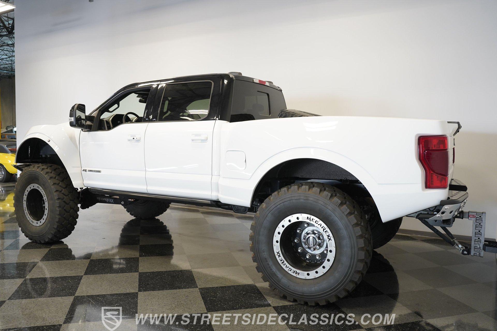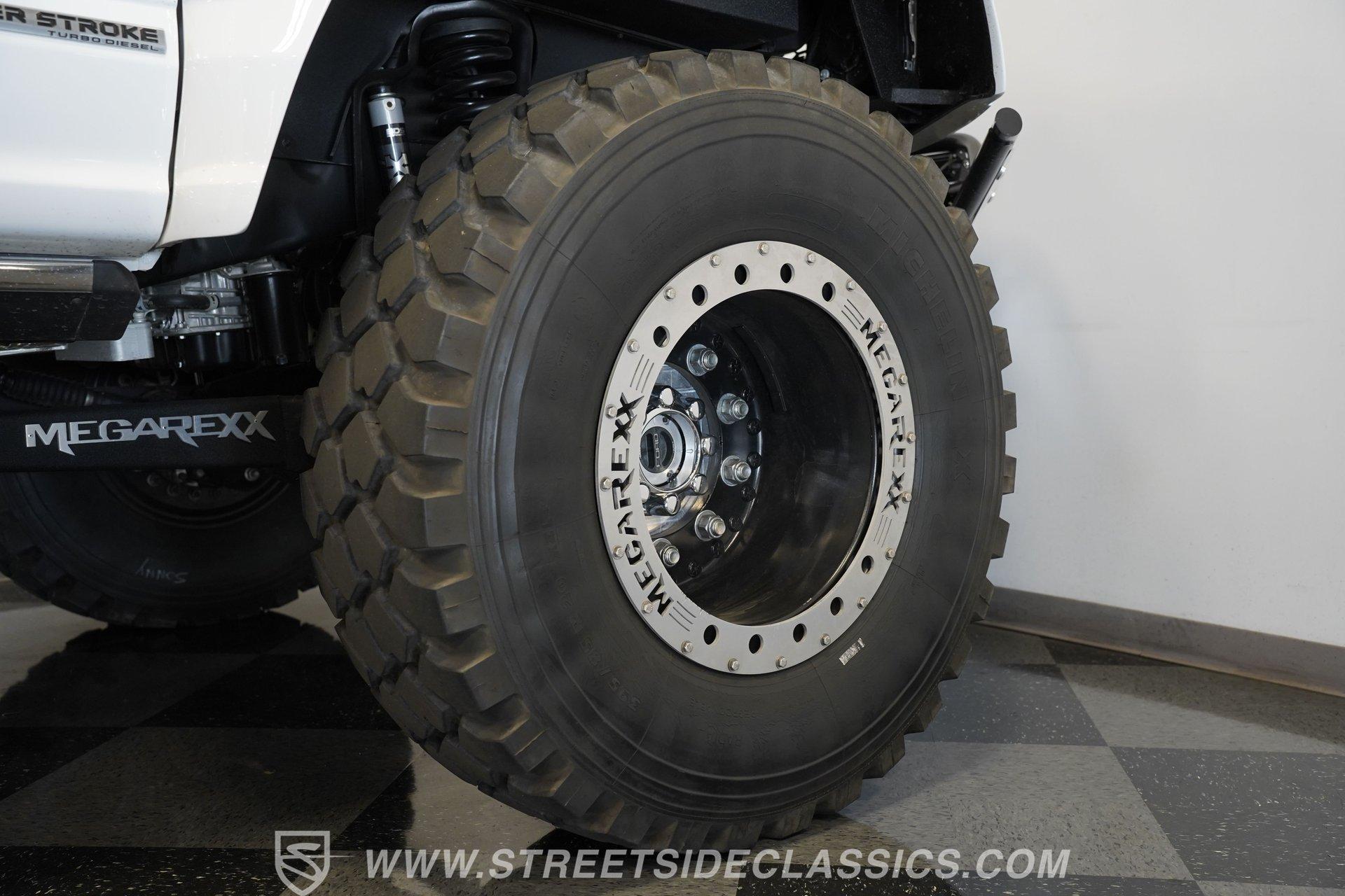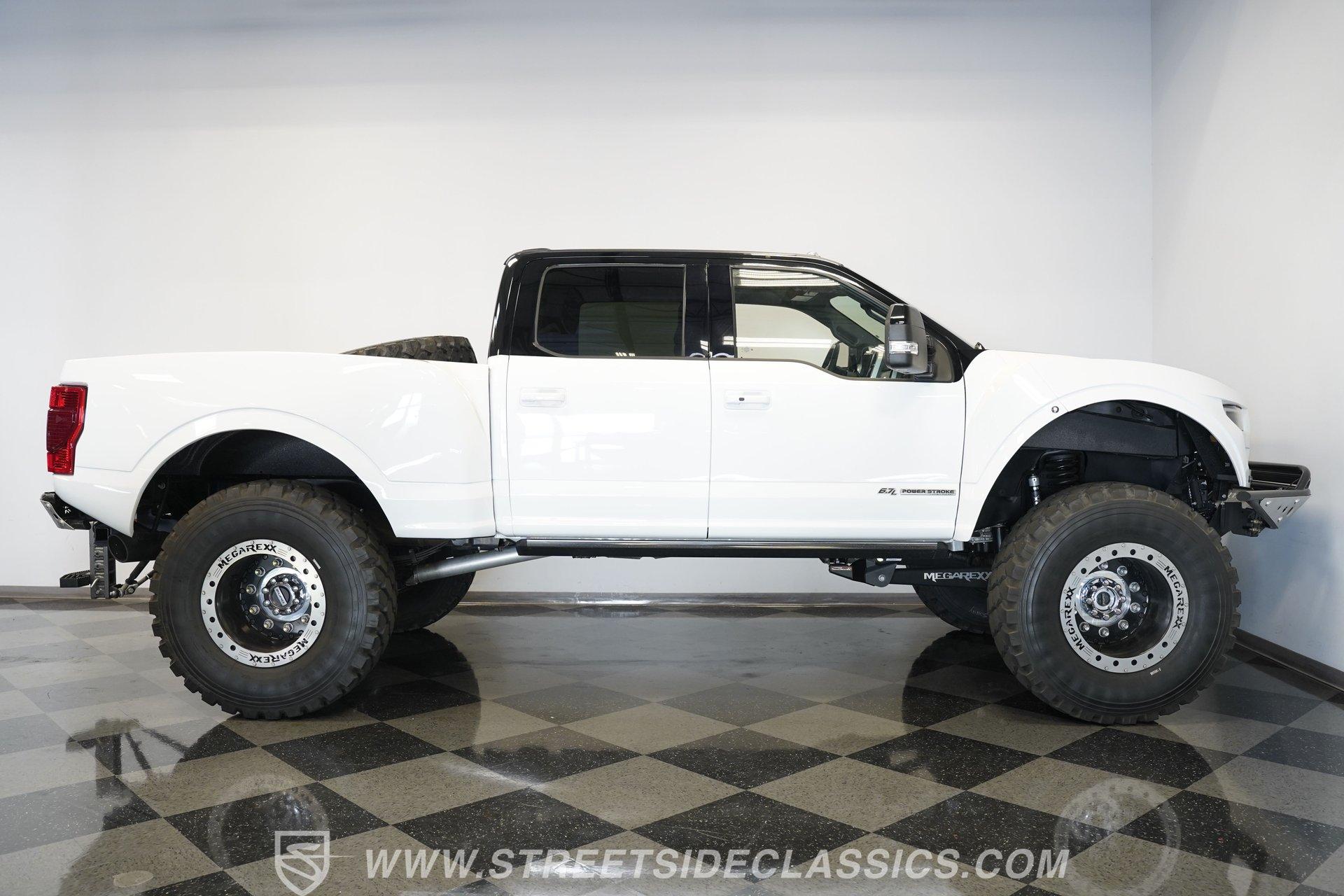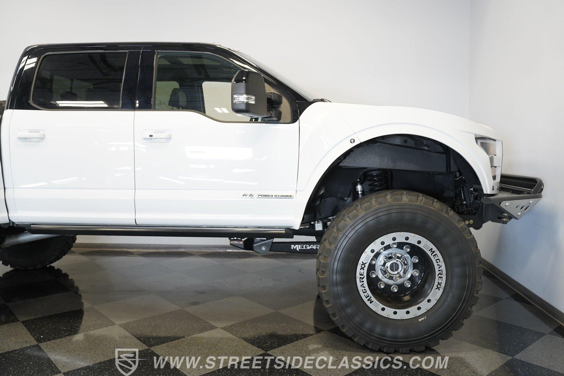 Only a short while ago, the idea of a 'muscle truck' was limited to watching Bigfoot or Gravedigger pummel junk cars at a monster truck rally. But, then, with trucks like the GMC Syclone in the 1990s, the Ford SVT Lightning, and the Dodge Ram SRT-10 in the 2000s, we all could get behind the idea of a fast truck. This 2022 Ford F-250 MegaRexx MegaRaptor we have for you today may be the pinnacle of what the perfect muscle truck could, and should be. One look at its beautiful Oxford White exterior, complete with its one-piece, tilt-action fiberglass front clip, color-matched fenders and steel bumpers, and it's easy to see why. Sitting high up on its high-performance suspension, this Raptor's mega-aggressive demeanor screams, "Get out of my way!" And with a shocking 3,122 actual miles on the odometer, this muscle truck won't be atrophying anytime soon. Step inside this Raptor's expansive interior, and you'll be treated to an enchanting mix of supple leather and advanced technology. A huge center console offers plenty of storage, separating a pair of power and heated bucket seats. Power mirrors, windows, locks, and moonroof, along with navigation, cruise control, air conditioning, backup camera, and an AM/FM/AUX/Satellite/Bluetooth infotainment center, offer all of the modern amenities anyone could want in a late-model truck. Under the hood, we find a version of Ford's powerful 6.7-liter Power Stroke Turbo Diesel V8 engine. With its graphite-iron block and lightweight aluminum heads, this massive motor pumps out an impressive 475 horsepower at 2,600 rpm and a ridiculous 1,050 pound-feet of torque at just 1,600 rpm. That power is then routed through Ford's 10-speed automatic transmission before being sent out to either the rear wheels or all four corners, should four-wheel drive be engaged for maximum traction. HIGHLIGHTS: 3,122 Actual Miles Built on Ford F250 Super Duty Crew Cab One Piece Tilt Fiberglass Front Clip Fiberglass Bed Sides High Approach Front and Rear Bumpers LED Lighting 6.7-Liter Power Stroke Turbo Diesel 475 HP 1,050 LB FT 10 Speed Auto 4.5in Dual Rate Front Coils 5in Full Progressive Rear Leaf Springs Remote Adjustable Shocks Military Spec 3 Piece Wheels Aluminum Rock Rings 46in Michelins Four Wheel Power Discs Dana Front Axle Leather Interior Power Everything Moonroof Navigation AM/FM/AUX Satellite Radio Bluetooth Factory Build Sheet Original Window Sticker Owner's Manual This 2022 Ford F-250 MegaRexx MegaRaptor rides on a suspension that features 4.5-inch high-performance, dual-rate front coil springs, 5-inch full-progressive rear leaf springs, four-wheel remote adjustable reservoir shocks, upgraded radius arms, dual stabilizer bars, and adjustable track bars and bump stops. Military-spec MRAP 3-piece aluminum wheels and custom MegaRexx aluminum rock rings help the massive 46x15.5 inch (395/85R-20) Michelin XZL tires tackle anything you can throw at them. Whatever your goals are with this Raptor happen to be, whether that's taking on the Baja, or just looking good in the Home Depot parking lot, there is no doubt you'll achieve them behind the wheel of this muscle truck. Call today!