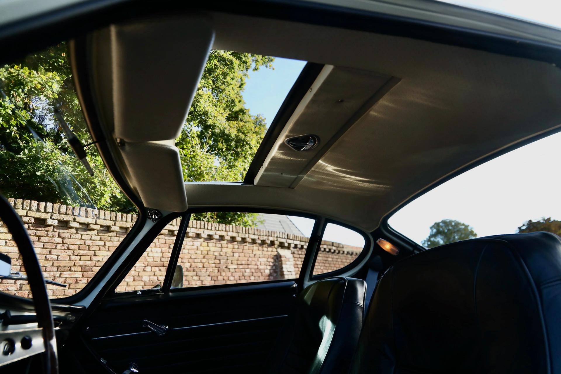 The result? A magnificent Volvo P1800S presented in its original Ice Blue exterior with black leather upholstery, accompanied by extensive documentation. The options are equally outstanding—for example, the rare Caspars & Lotte sliding sunroof and a classic wood-rimmed steering wheel.