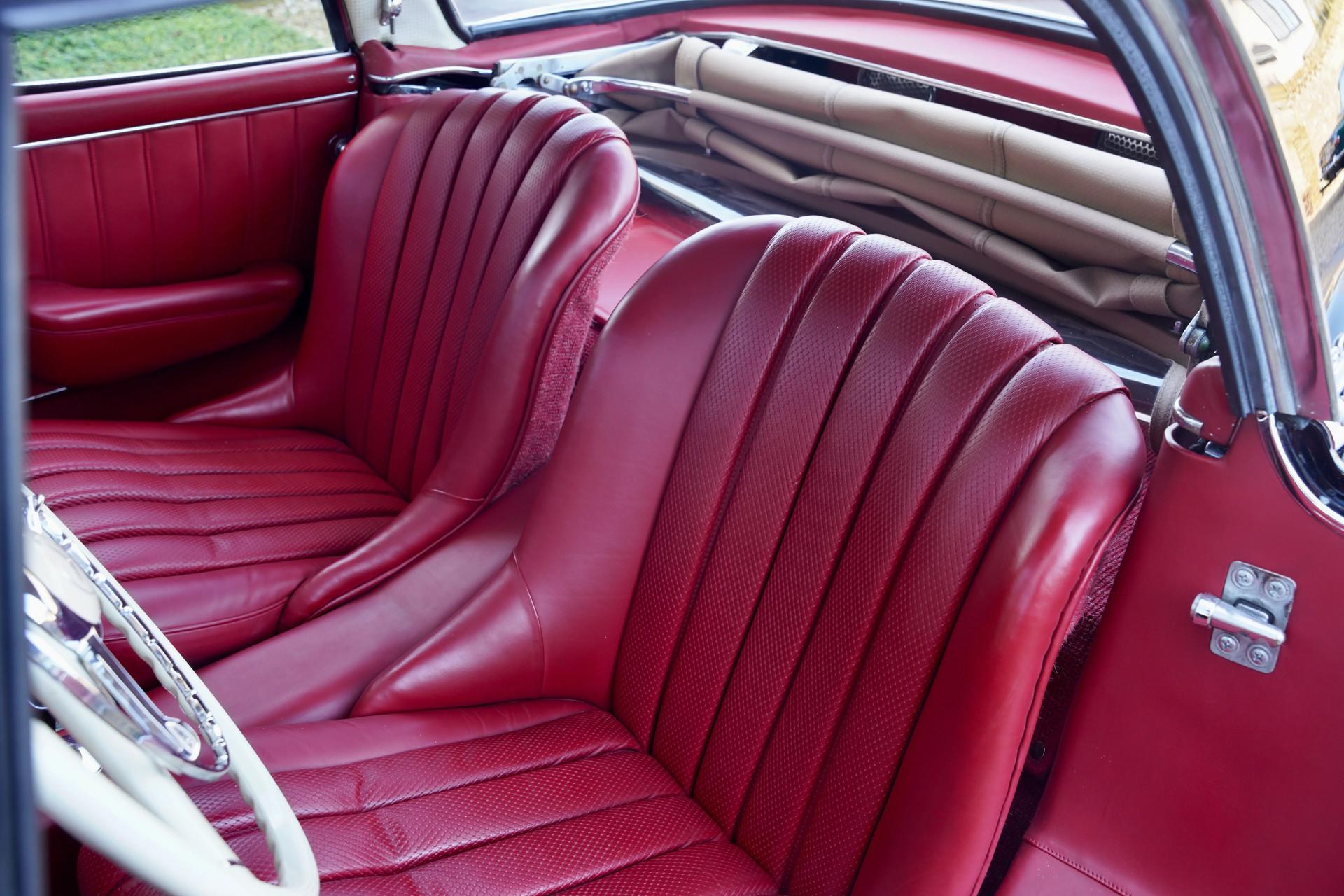 This 300 SL Roadster has been restored with absolute precision while preserving its originality. The deep black paint contrasts beautifully with the red leather interior, a combination that perfectly complements the elegant lines of this automotive icon. The beautifully sculpted headlights complete the masterpiece, turning dreams into reality.
