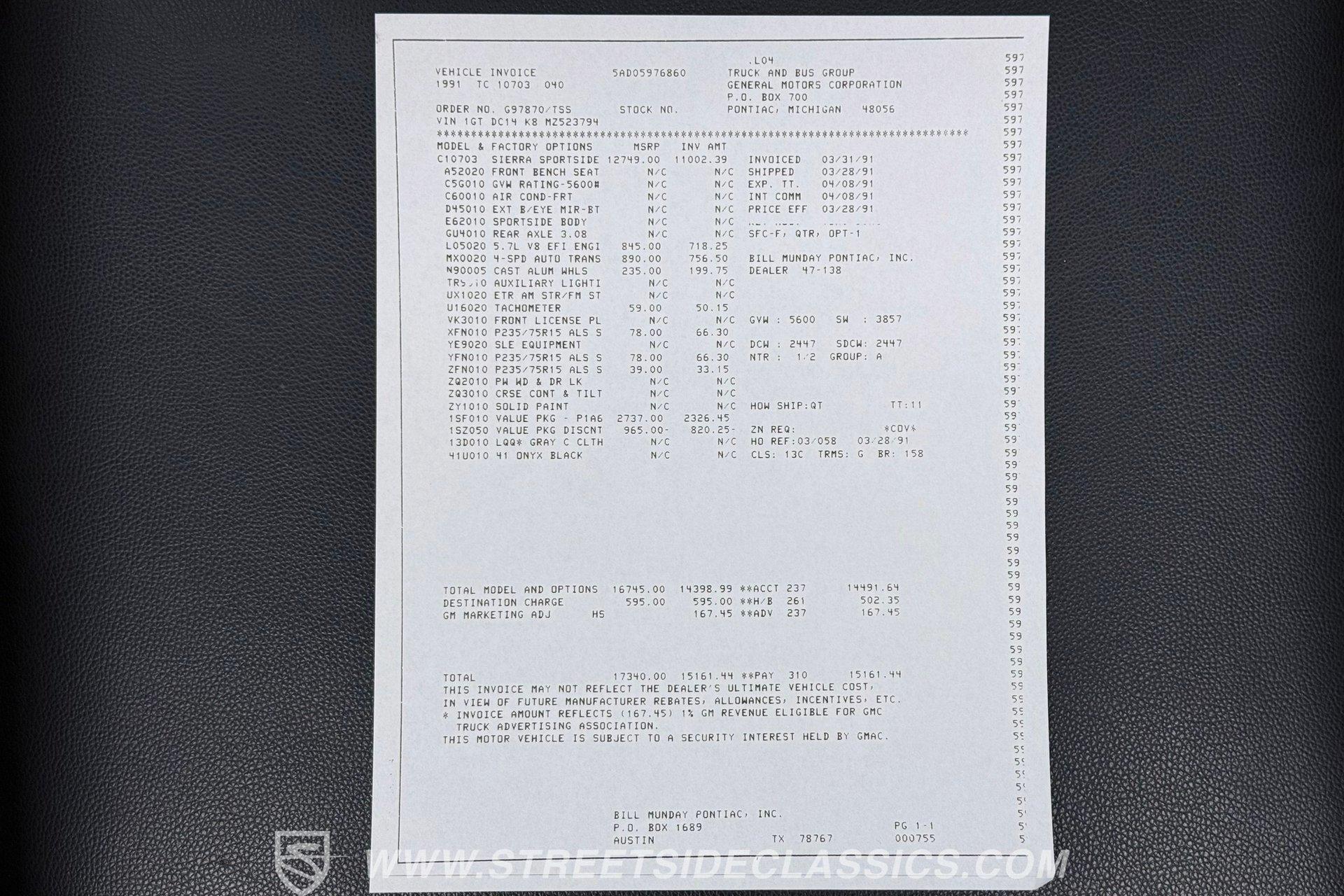 This 1991 GMC Sierra 1500 Stepside embodies rugged charm and classic American muscle, blending nostalgia with raw power. Whether you're a collector or someone who appreciates a solid build with character, this 1991 GMC Sierra Stepside invites you to own a piece of the past with undeniable presence. Inside, the cabin offers a blend of comfort and practicality with a reupholstered gray vinyl bench seat. The factory dash and gauges remain intact, upgraded with a Jensen AM/FM/AUX radio featuring Bluetooth connectivity for modern convenience. Power windows and locks add ease, while the gray carpets and headliner maintain the vintage vibe with a cozy atmosphere. Under the hood, this truck boasts a fuel injected 5.7L V8 engine paired with a 700R4 four-speed automatic transmission featuring a column shifter. The engine bay remains stock and straightforward. The lowered factory-style suspension and power front disc brakes ensure a smooth, controlled ride, while power steering contributes to confident handling on the road. Highlights 5.7L V8 Engine 700R4 Four-Speed Automatic Transmission Power Steering Power Front Disc Brakes Lowered Factory-Style Suspension Power Windows And Locks Jensen AM/FM/AUX Bluetooth Radio Reupholstered Gray Vinyl Bench Seat Air Conditioning Tilt Steering Wheel Short Bed Configuration Dealer Invoice Included Financing Available Vehicle Protection Plans Available Worldwide Shipping This 1991 GMC Sierra 1500 Stepside is a fantastic opportunity to own a truck that blends style with features for everyday usability. Call, email, or come visit our showroom today!