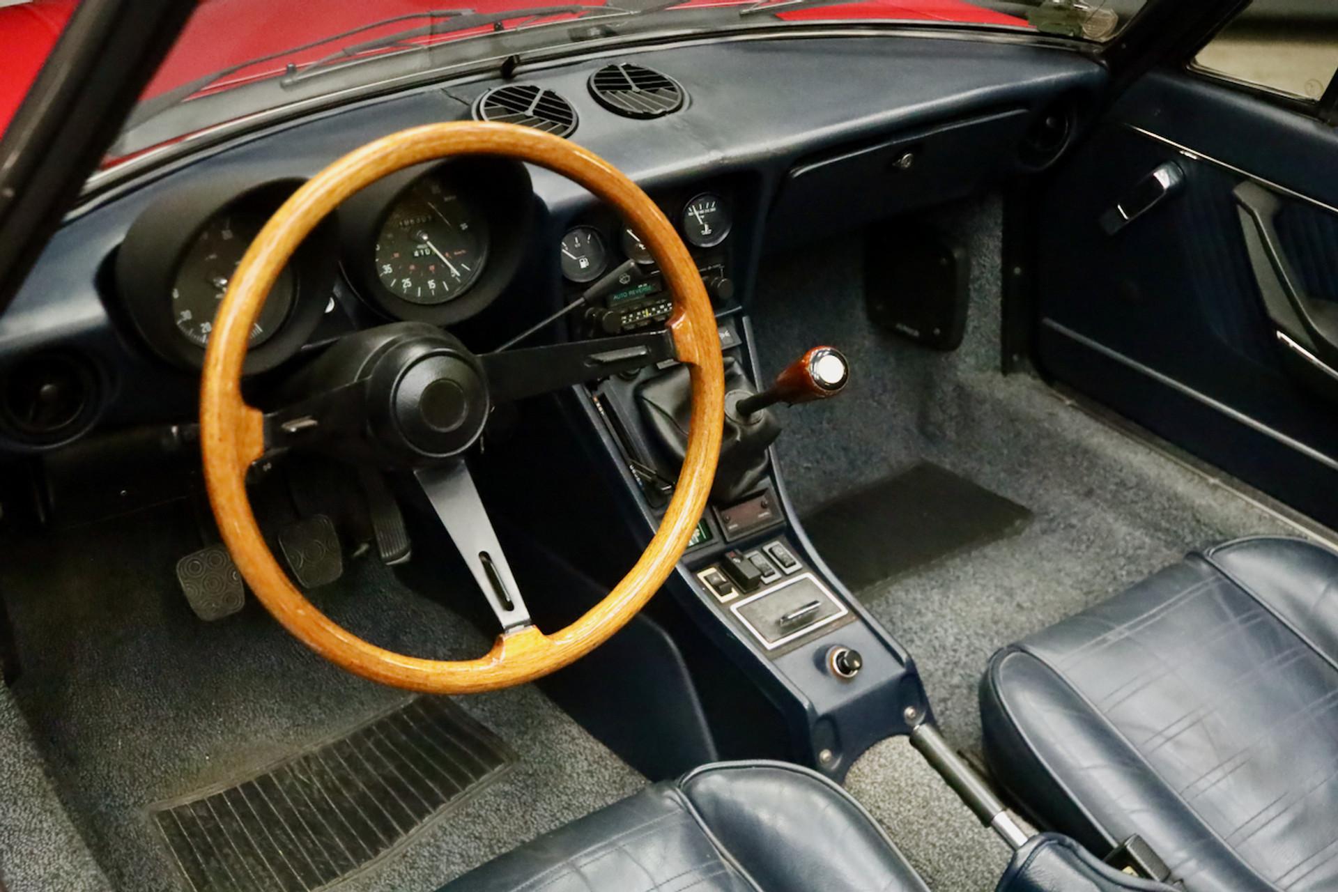 The interior has recently been reupholstered with sumptuous fine blue leather. The leather is delightfully supple and well maintained. The well-fitting, high quality carpets are also new. The grand looking instrument cluster and controls all work as they should. This Spider also has the benefit of electric windows and a car radio.