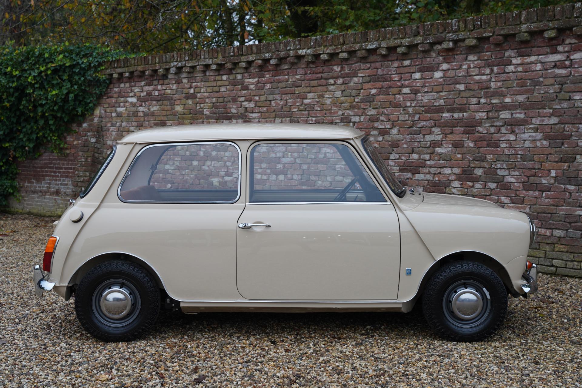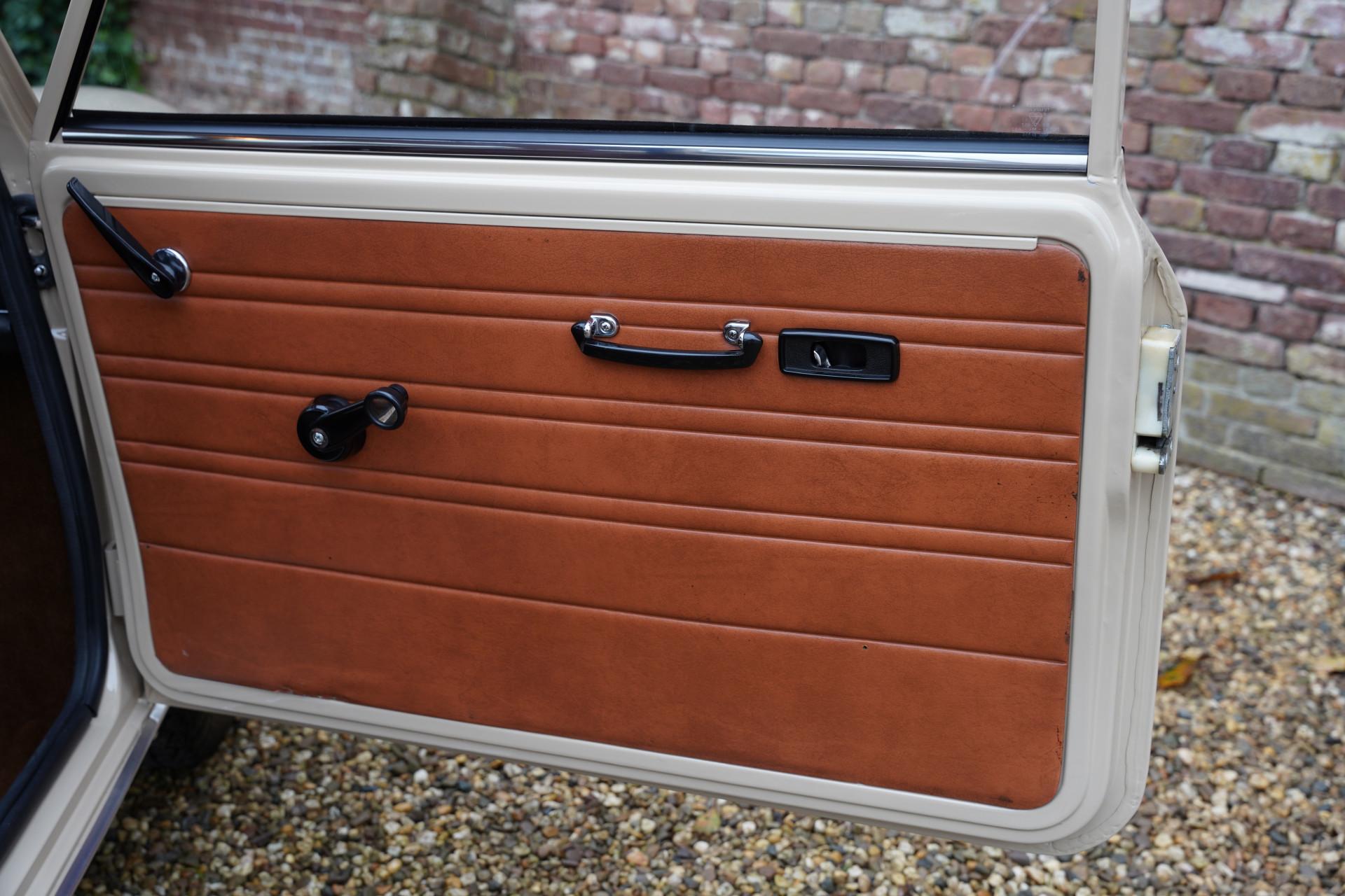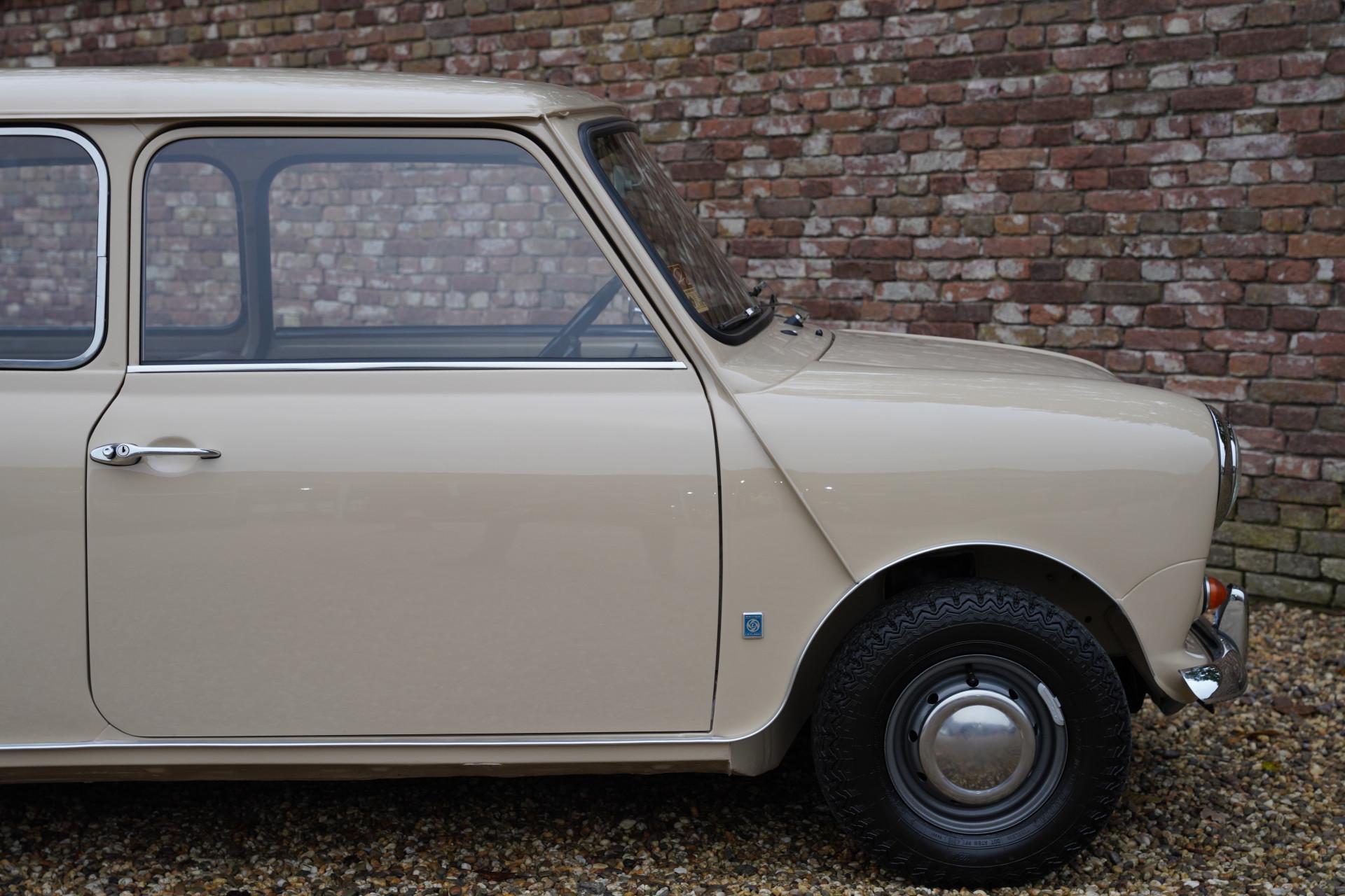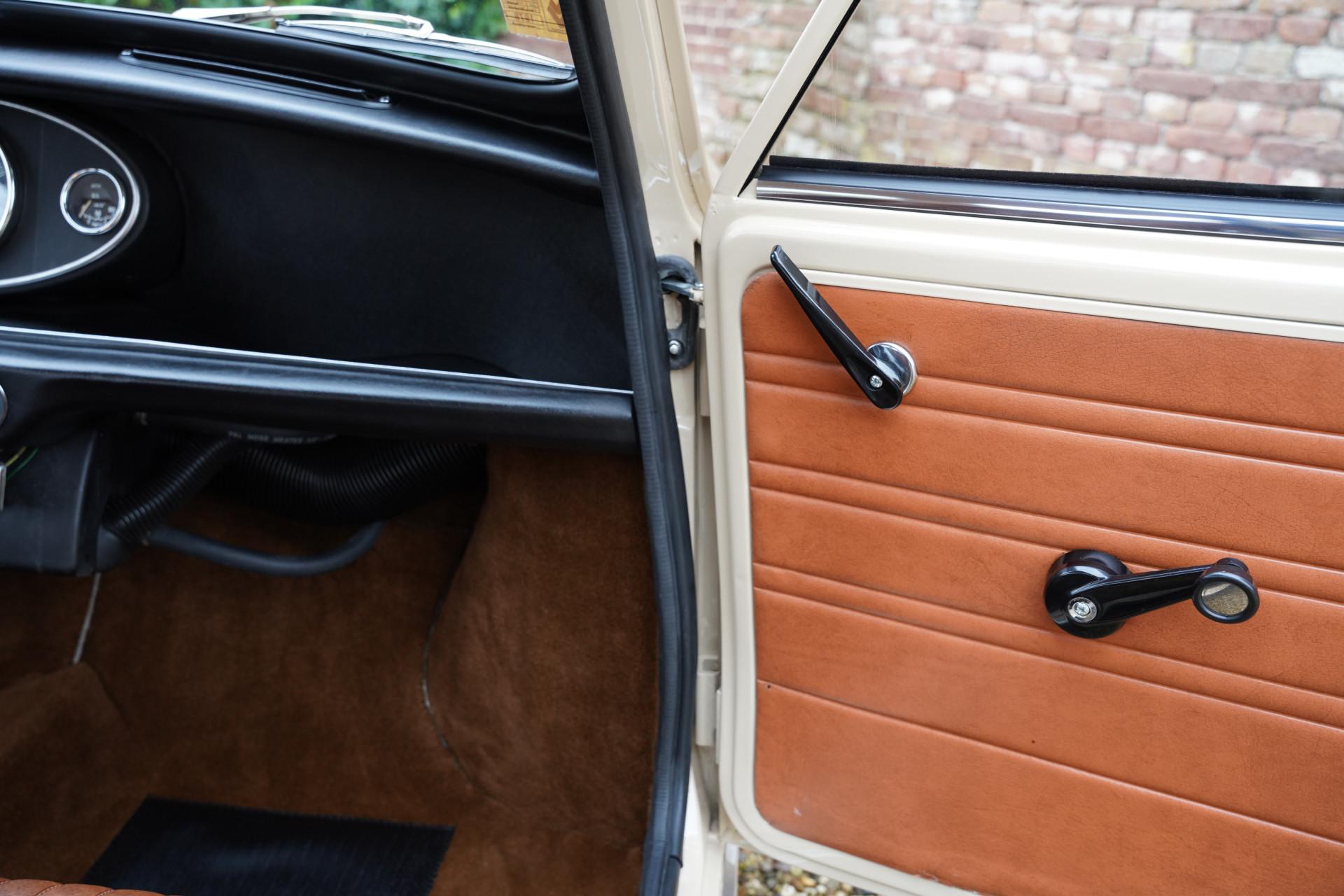 The entire car is immaculate. The exterior has been resprayed in the original color with which this Mini was delivered in 1970: Bedouin. With sleek sheet metal and beautiful chrome parts, the exterior is a beauty! The same goes for the interior. The original upholstery color, Autumn Leaf (what a beautiful name), is stunning, and everything has been completely renewed. As a result, the interior also looks magnificent.