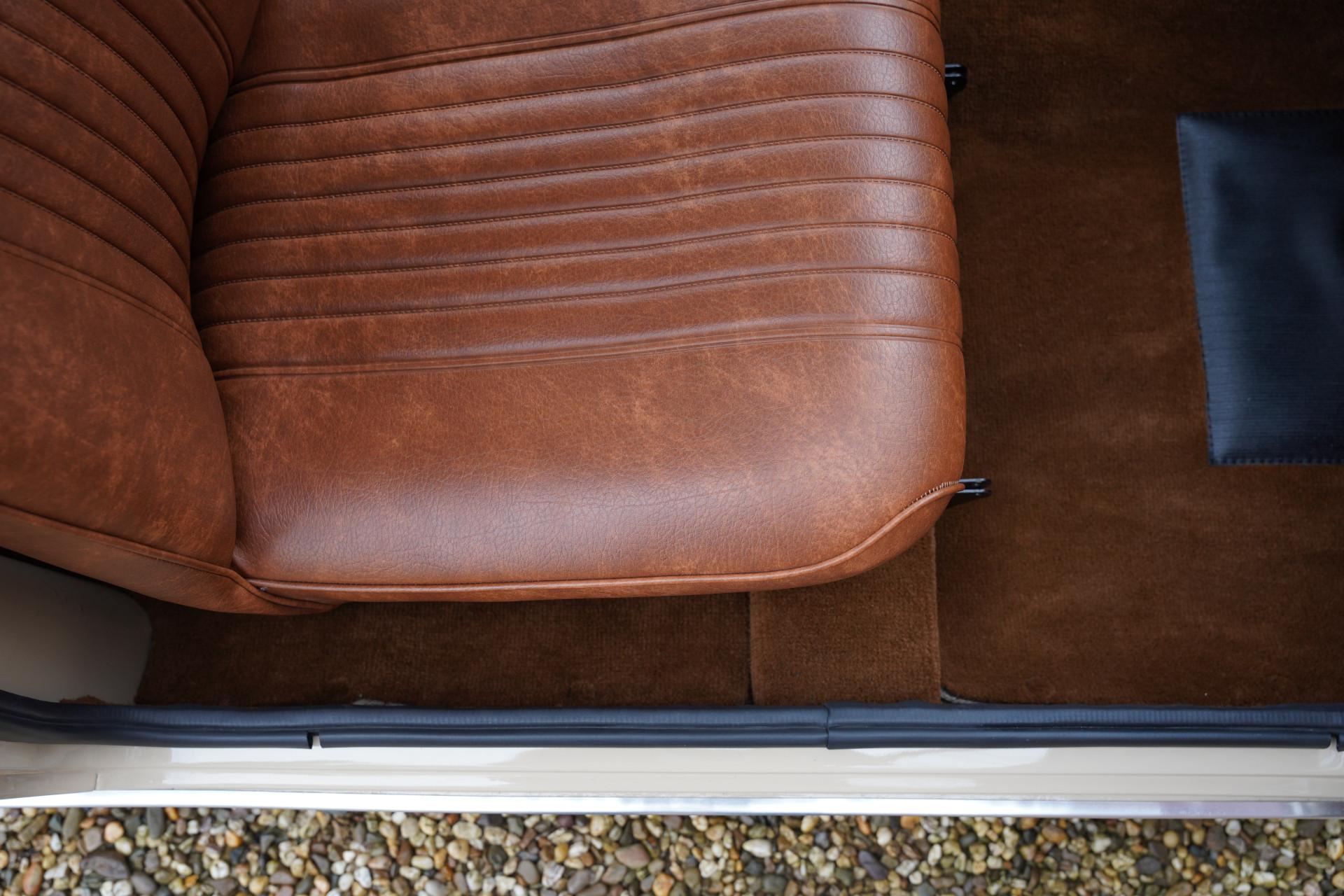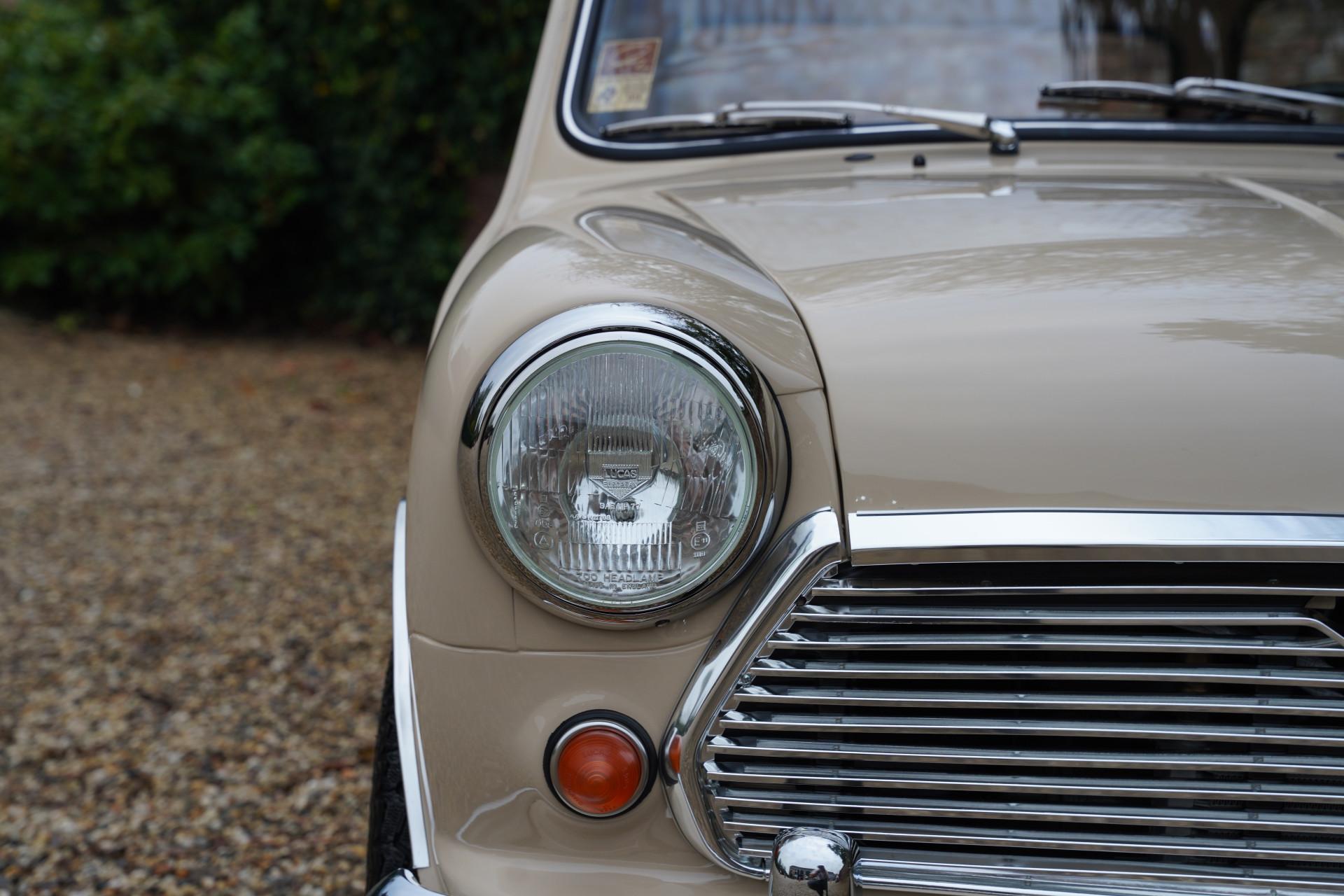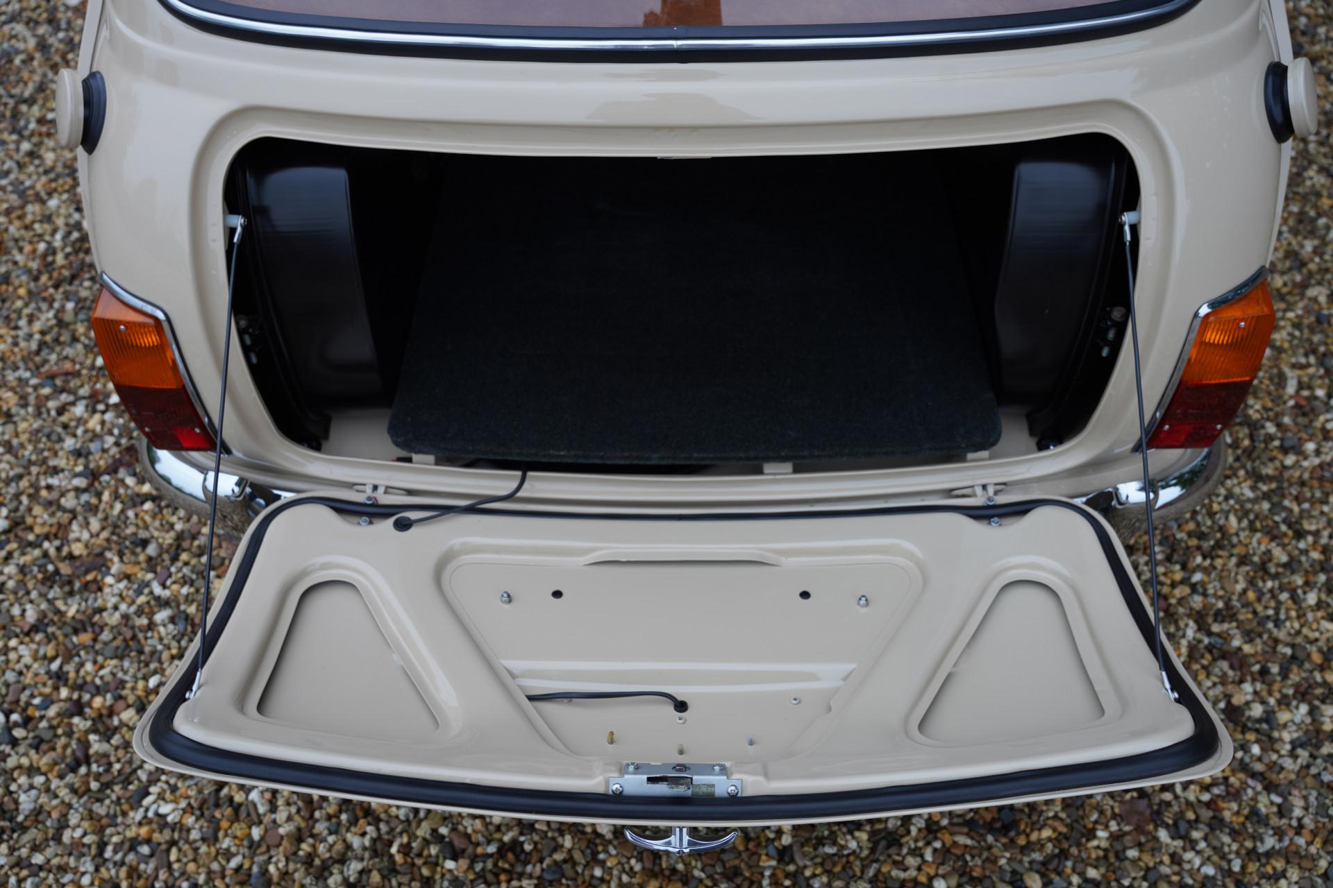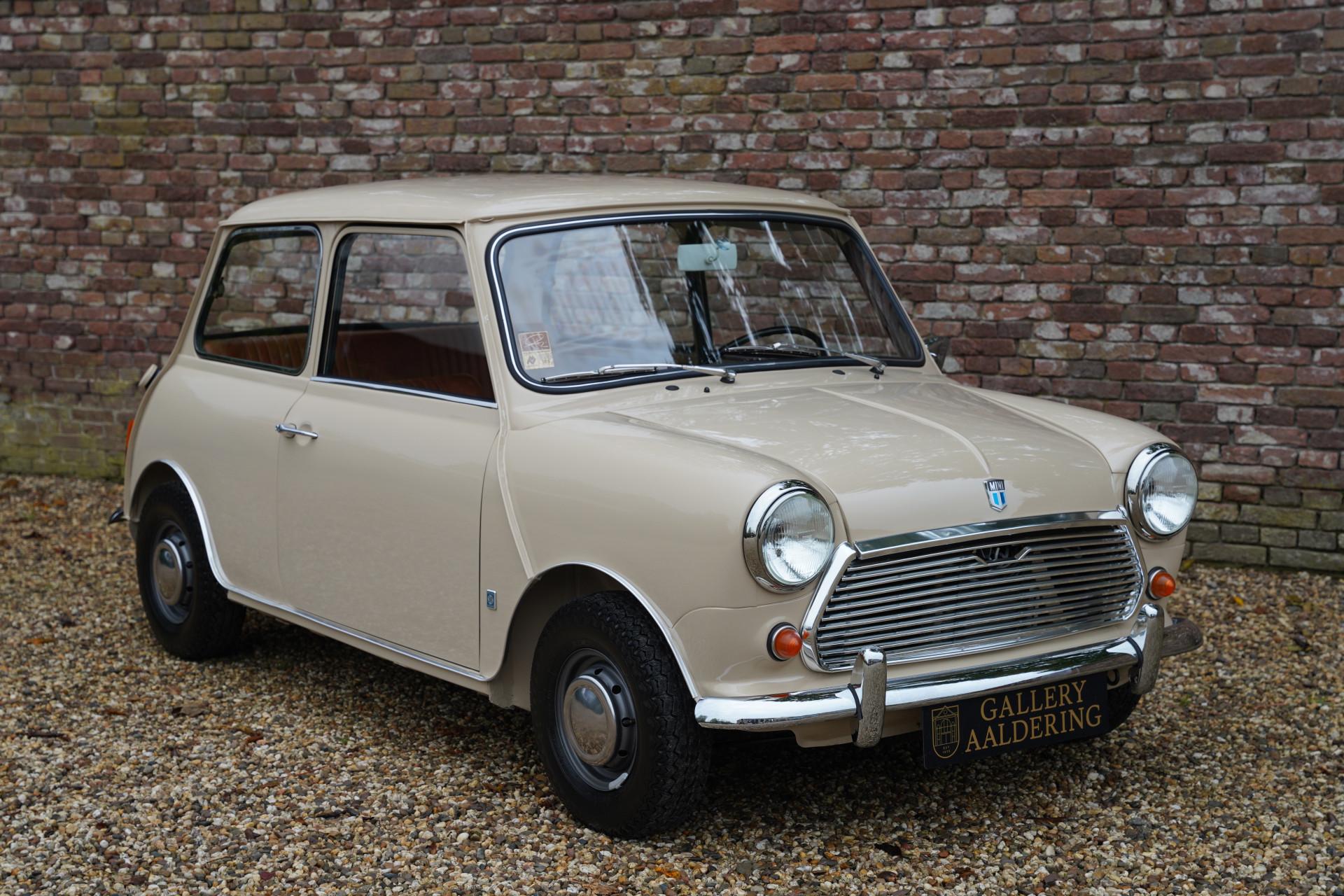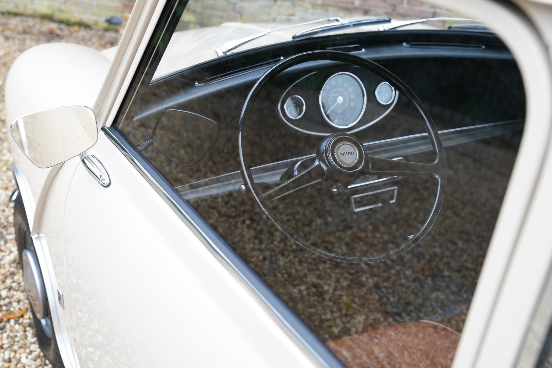 The entire car is immaculate. The exterior has been resprayed in the original color with which this Mini was delivered in 1970: Bedouin. With sleek sheet metal and beautiful chrome parts, the exterior is a beauty! The same goes for the interior. The original upholstery color, Autumn Leaf (what a beautiful name), is stunning, and everything has been completely renewed. As a result, the interior also looks magnificent.