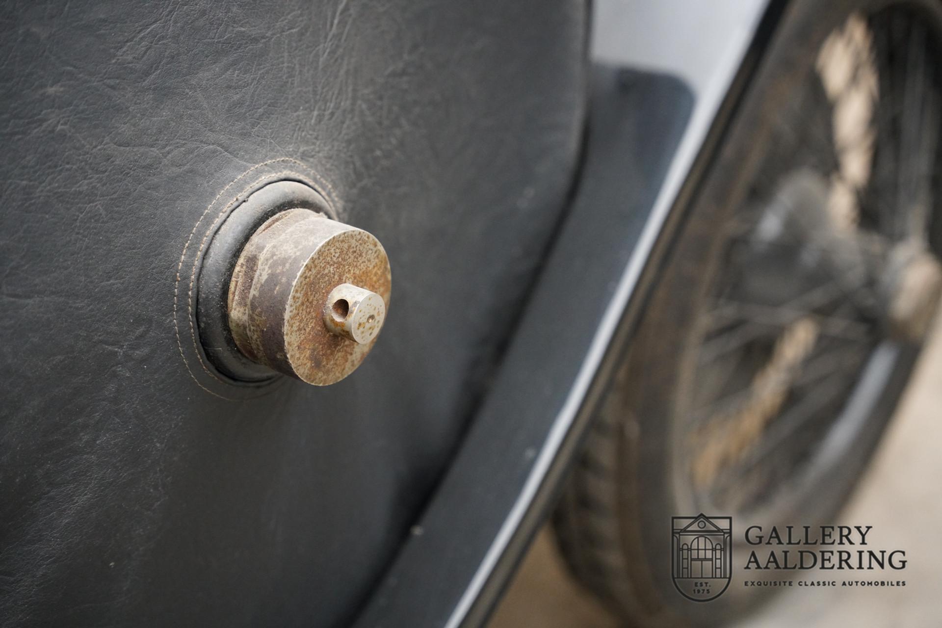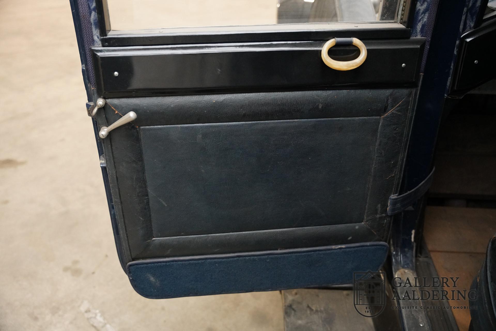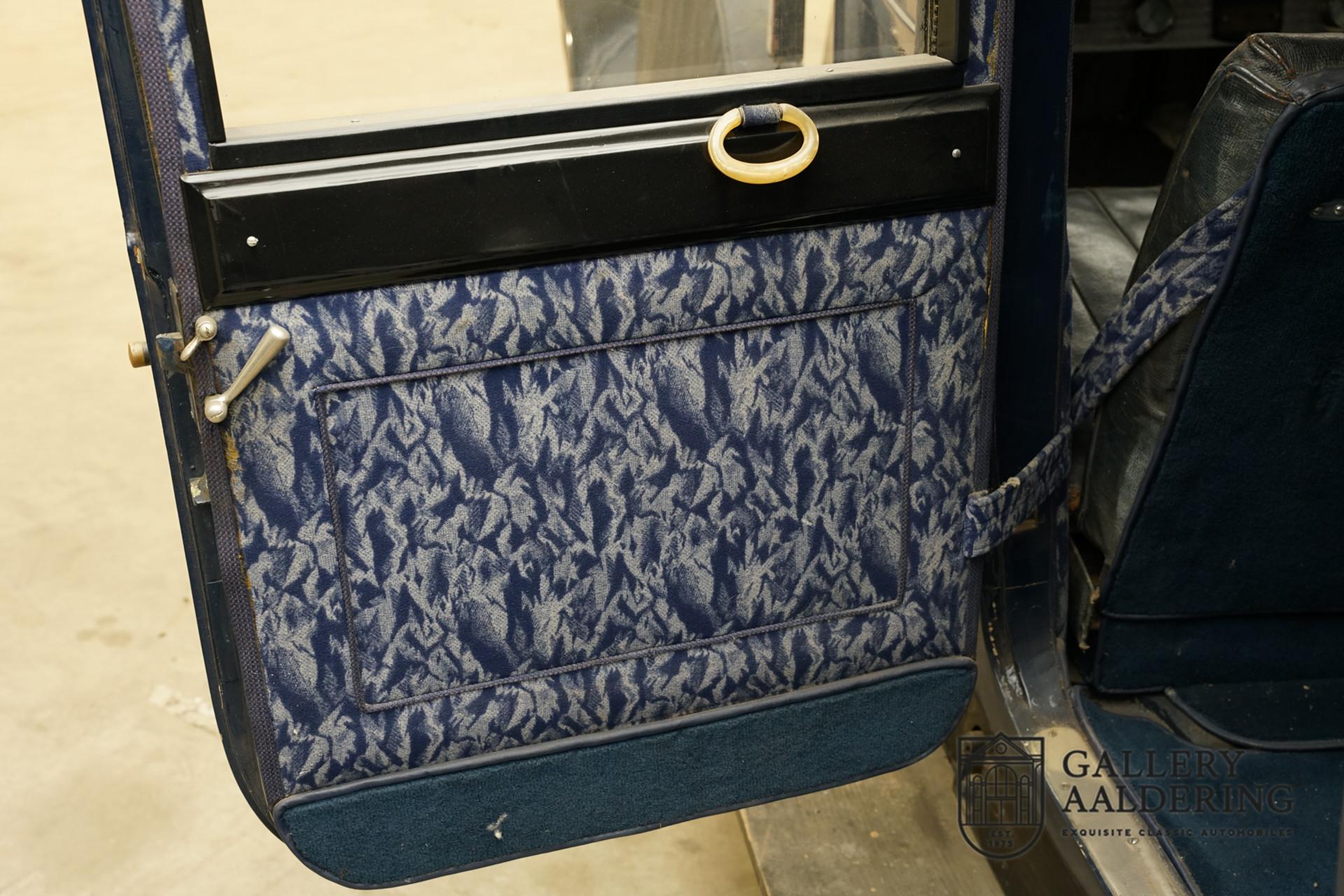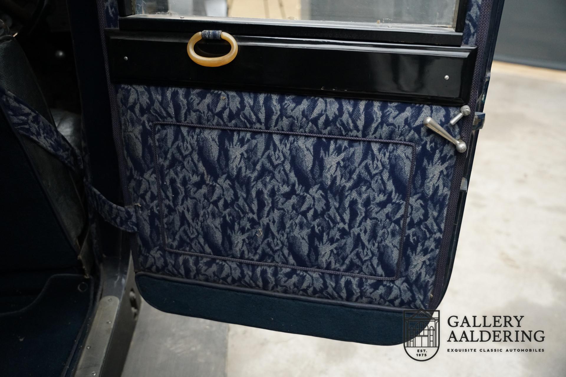 For its age, the bodywork is remarkably good shape. The car is even partly original with correct alignment. The C1 was given a blue finish at the time. The paintwork still looks good with only minor signs of the effect the years have had. The interior trim consists of black leather on the drivers and passengers seat with the typical Avions Voisin Art-Deco designed cloth upholstery in the back. It certainly creates an absolutely unique look. Just as special are the two little stool in front of the rear bench that doubles up as footstools for the rear passengers.