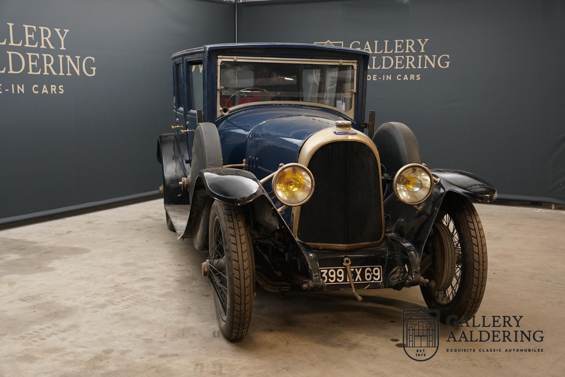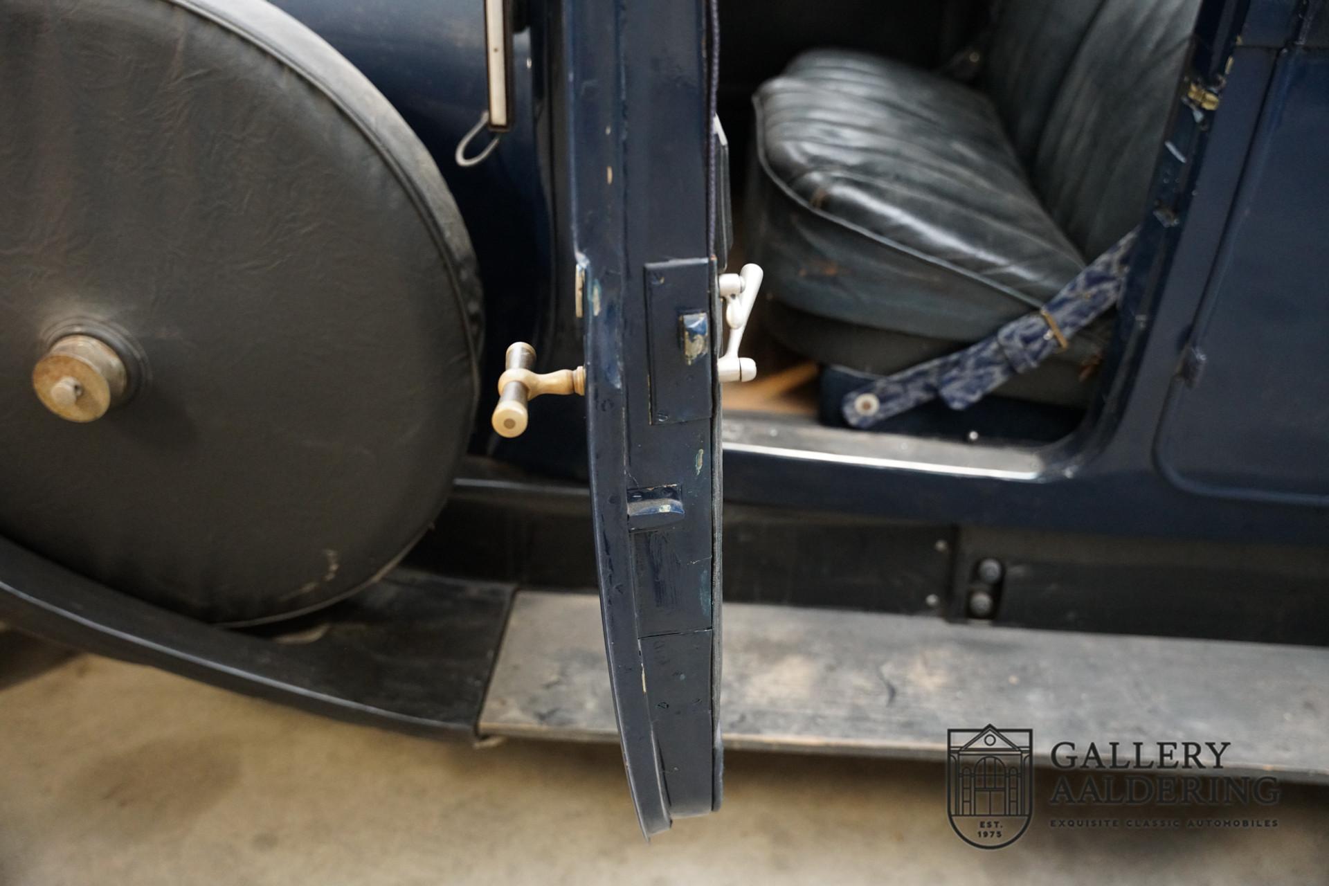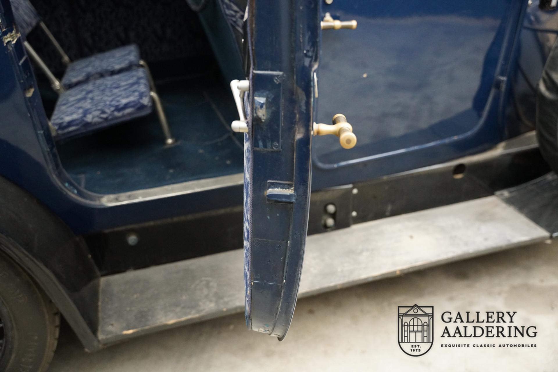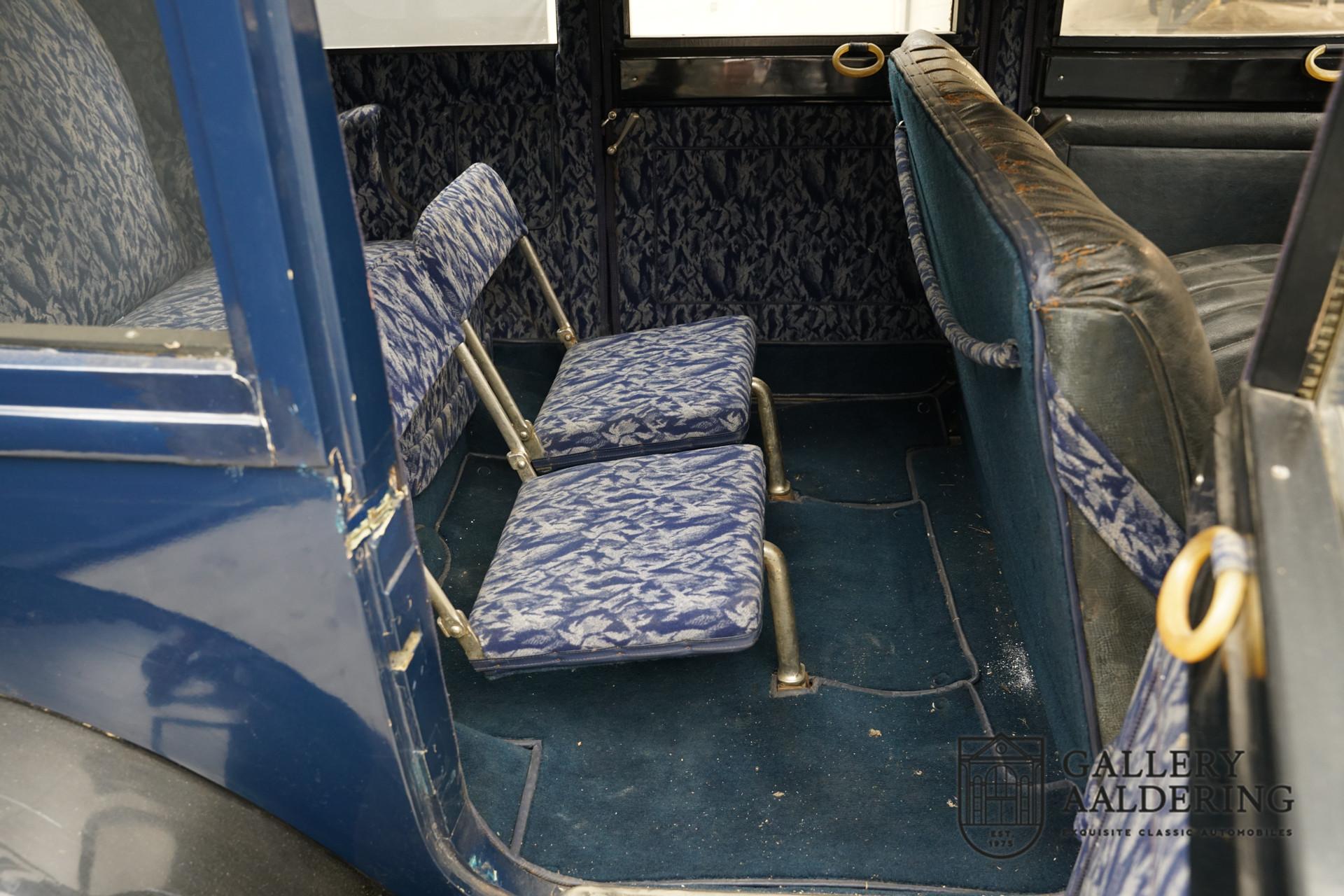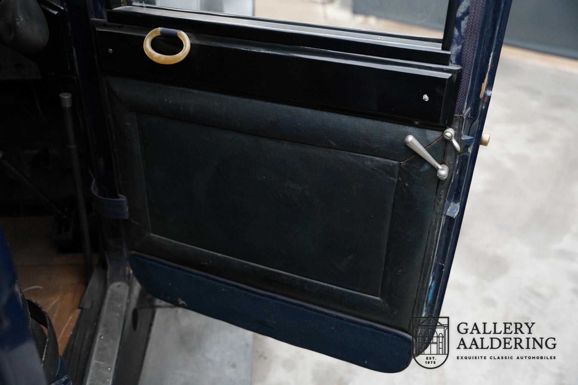 For its age, the bodywork is remarkably good shape. The car is even partly original with correct alignment. The C1 was given a blue finish at the time. The paintwork still looks good with only minor signs of the effect the years have had. The interior trim consists of black leather on the drivers and passengers seat with the typical Avions Voisin Art-Deco designed cloth upholstery in the back. It certainly creates an absolutely unique look. Just as special are the two little stool in front of the rear bench that doubles up as footstools for the rear passengers.