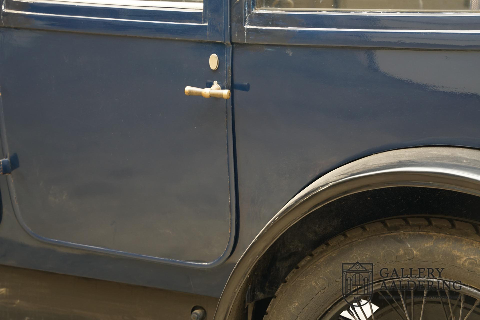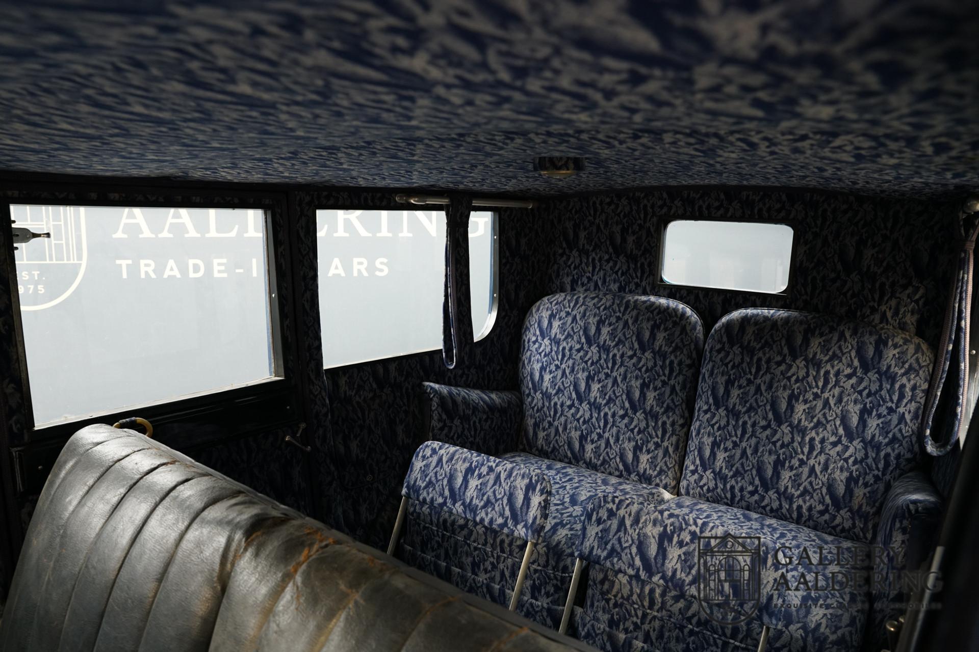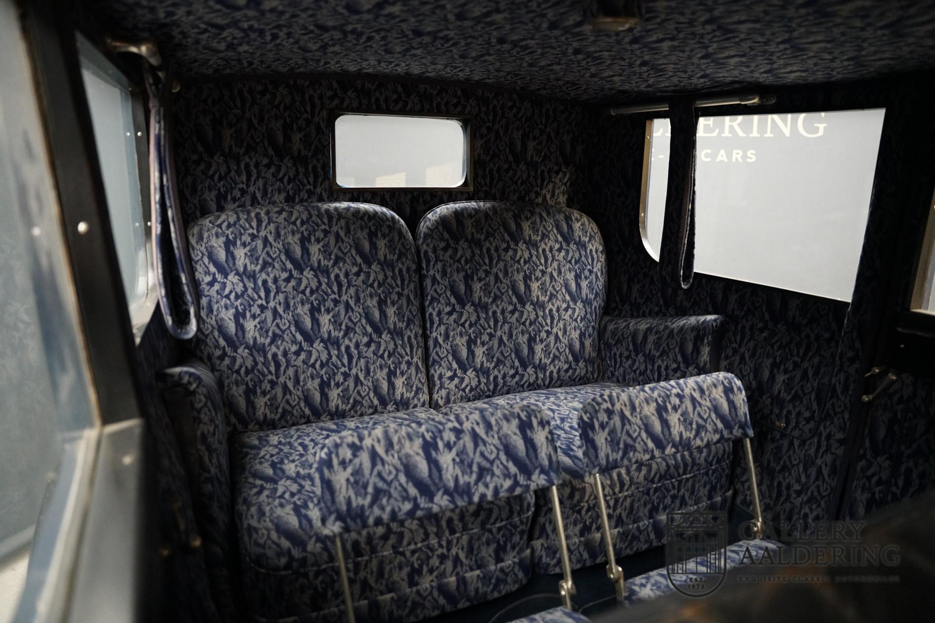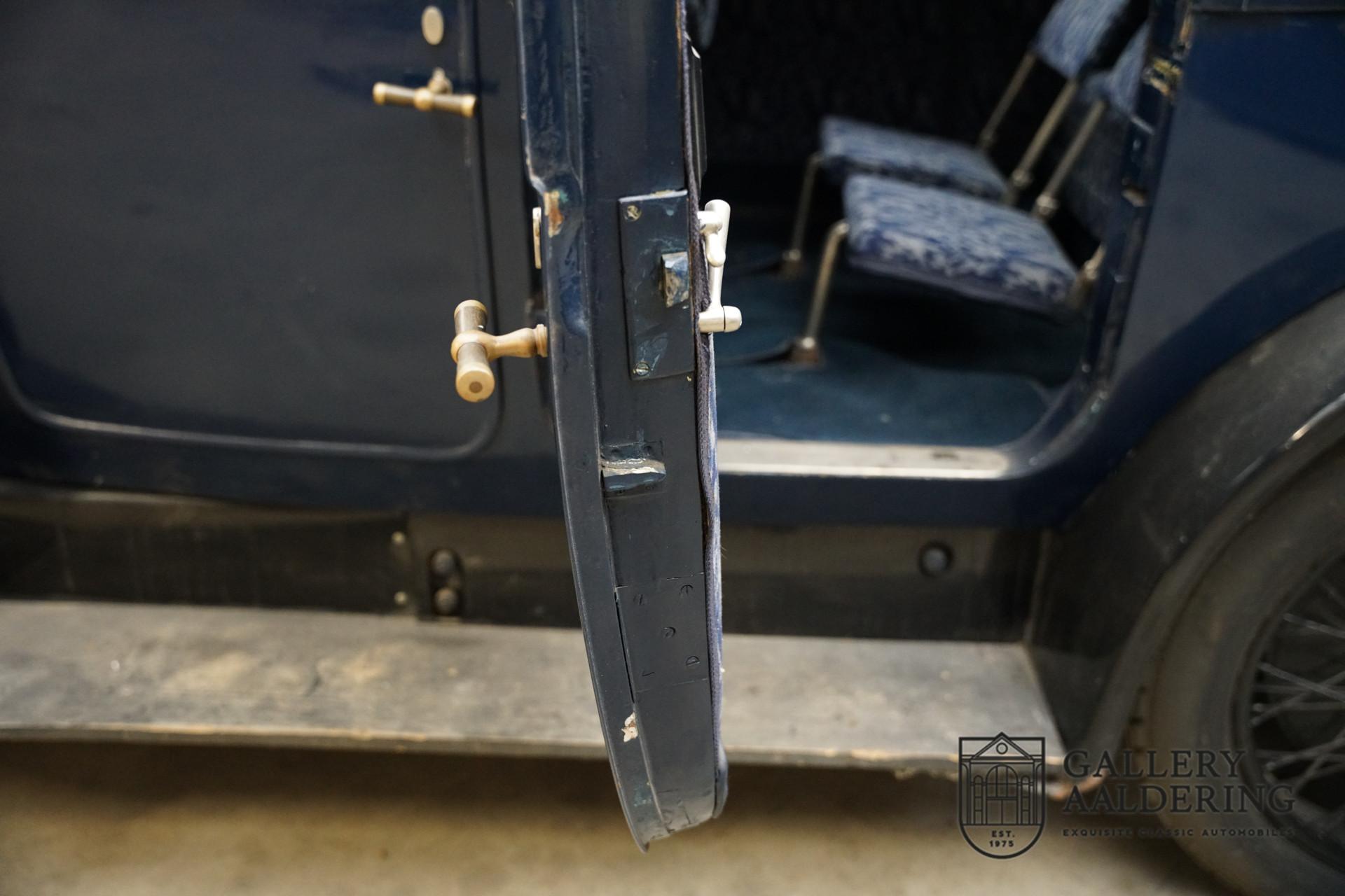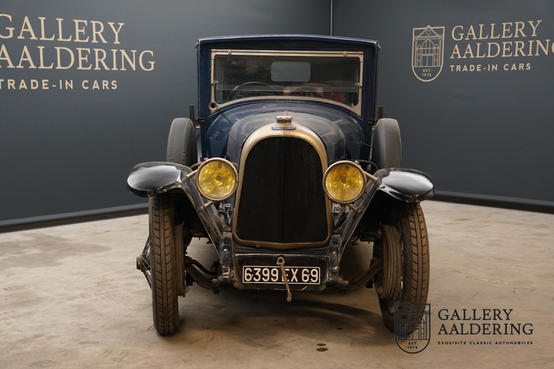 For its age, the bodywork is remarkably good shape. The car is even partly original with correct alignment. The C1 was given a blue finish at the time. The paintwork still looks good with only minor signs of the effect the years have had. The interior trim consists of black leather on the drivers and passengers seat with the typical Avions Voisin Art-Deco designed cloth upholstery in the back. It certainly creates an absolutely unique look. Just as special are the two little stool in front of the rear bench that doubles up as footstools for the rear passengers.