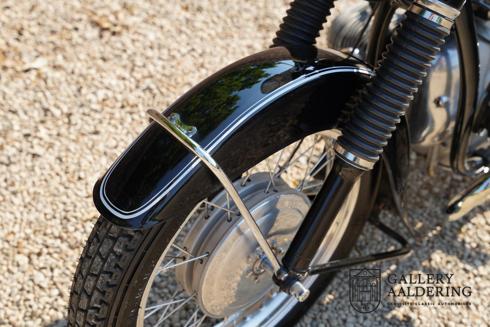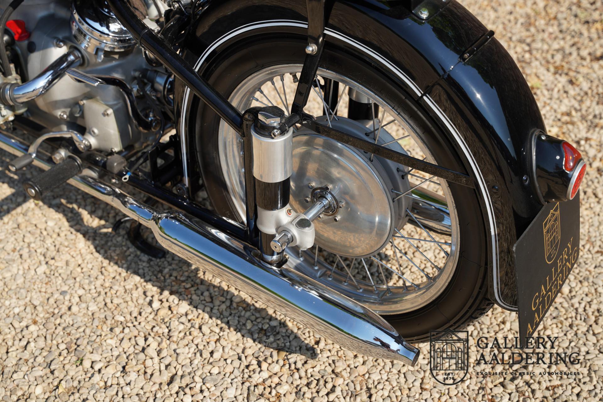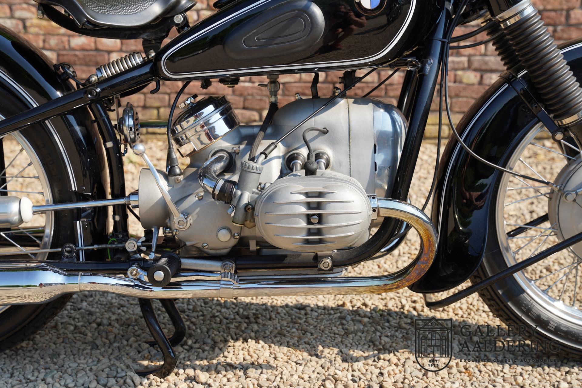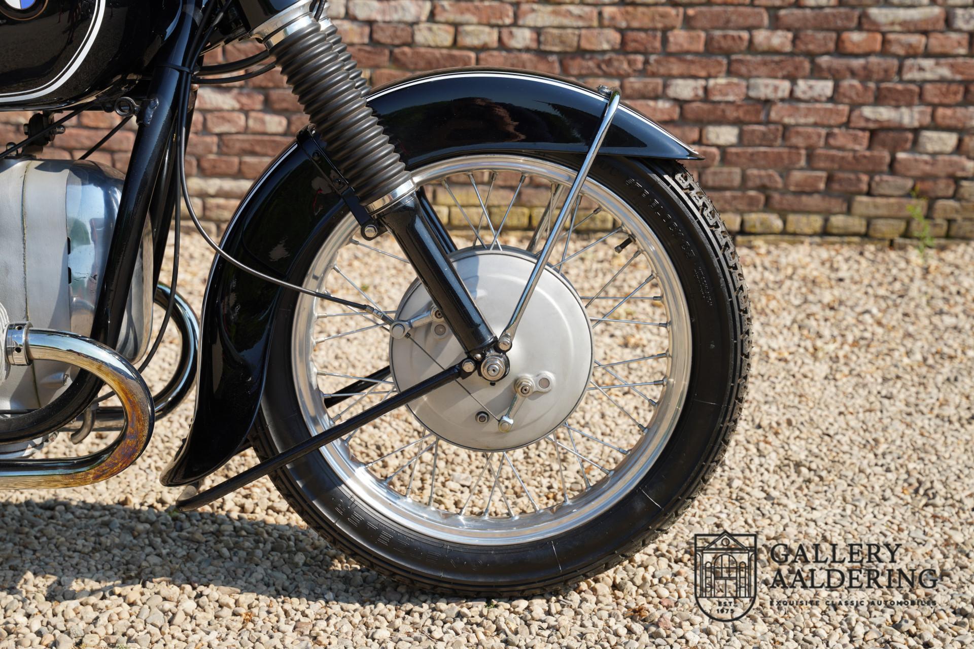 It is believed that this matching-numbers R51/3 was delivered new to The Netherlands, as it comes with an old Dutch registration document dated 1961. The current vendor purchased the machine from the Belgian BMW specialists Oldlima in 2008, at which time it had covered a mere 25 kilometres since a full restoration. The BMW has been on static display since acquisition and is presented in magnificent condition; highly sought-after and collectible, it comes with old NL registration documents and a Belgian Demande d'Immatriculation.