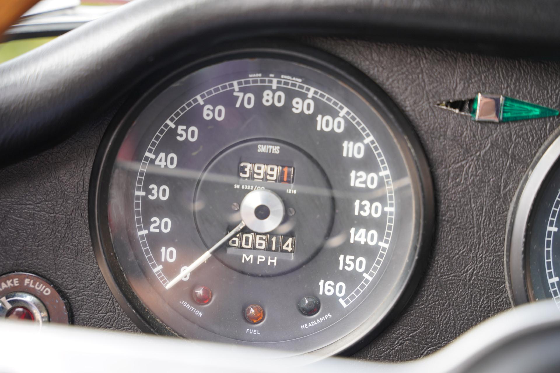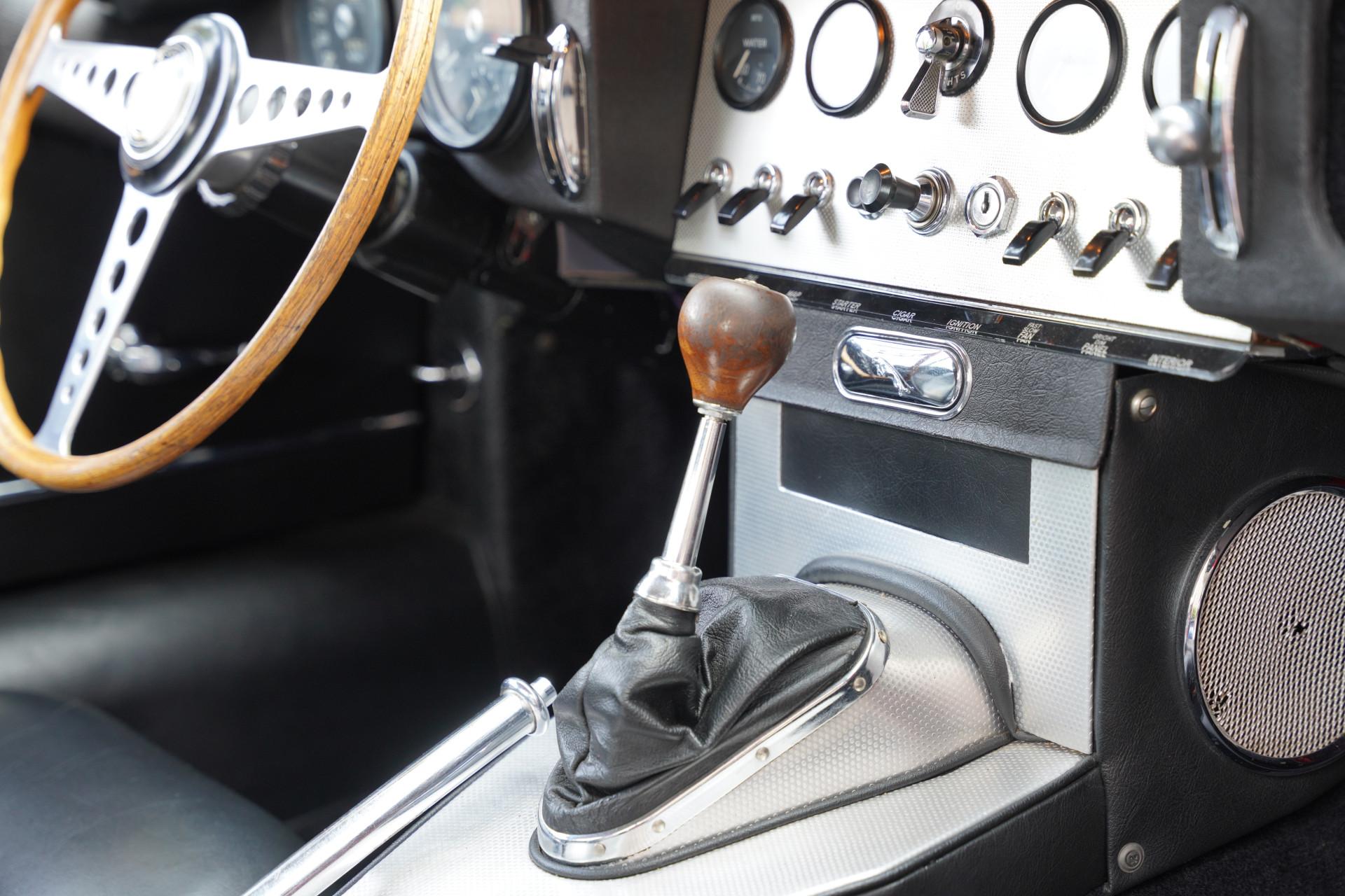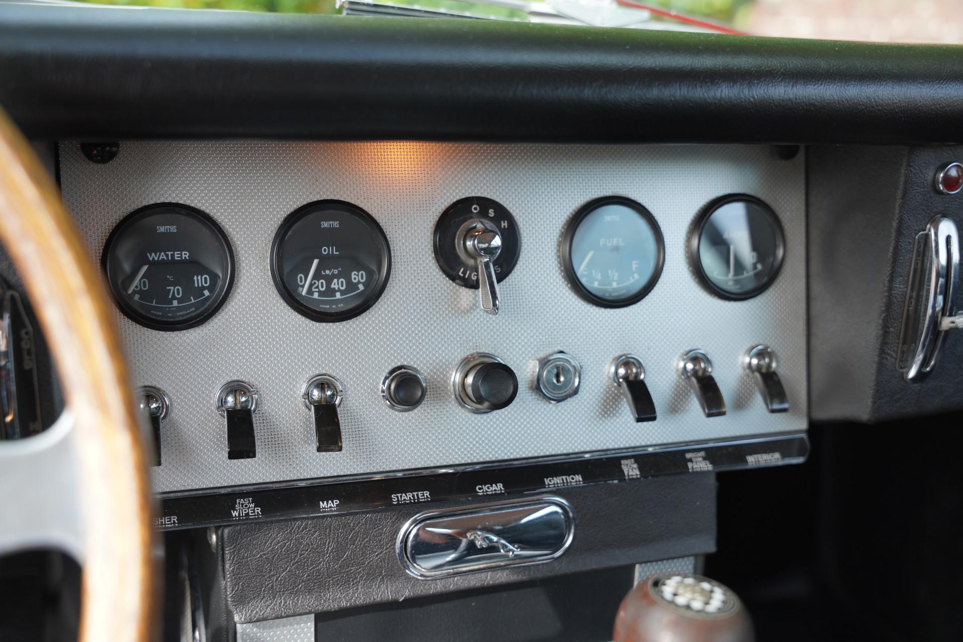 The interior of an E-type remains fantastic, with an unprecedented amount of atmosphere and the wonderful smell of leather. The rubber seals are all very fresh. All trim parts, metal, wood and leather, are also completely intact. The original plywood side windows are still present, which is rare, they are in neat condition. Lucas's original rear-view mirror is also still present.