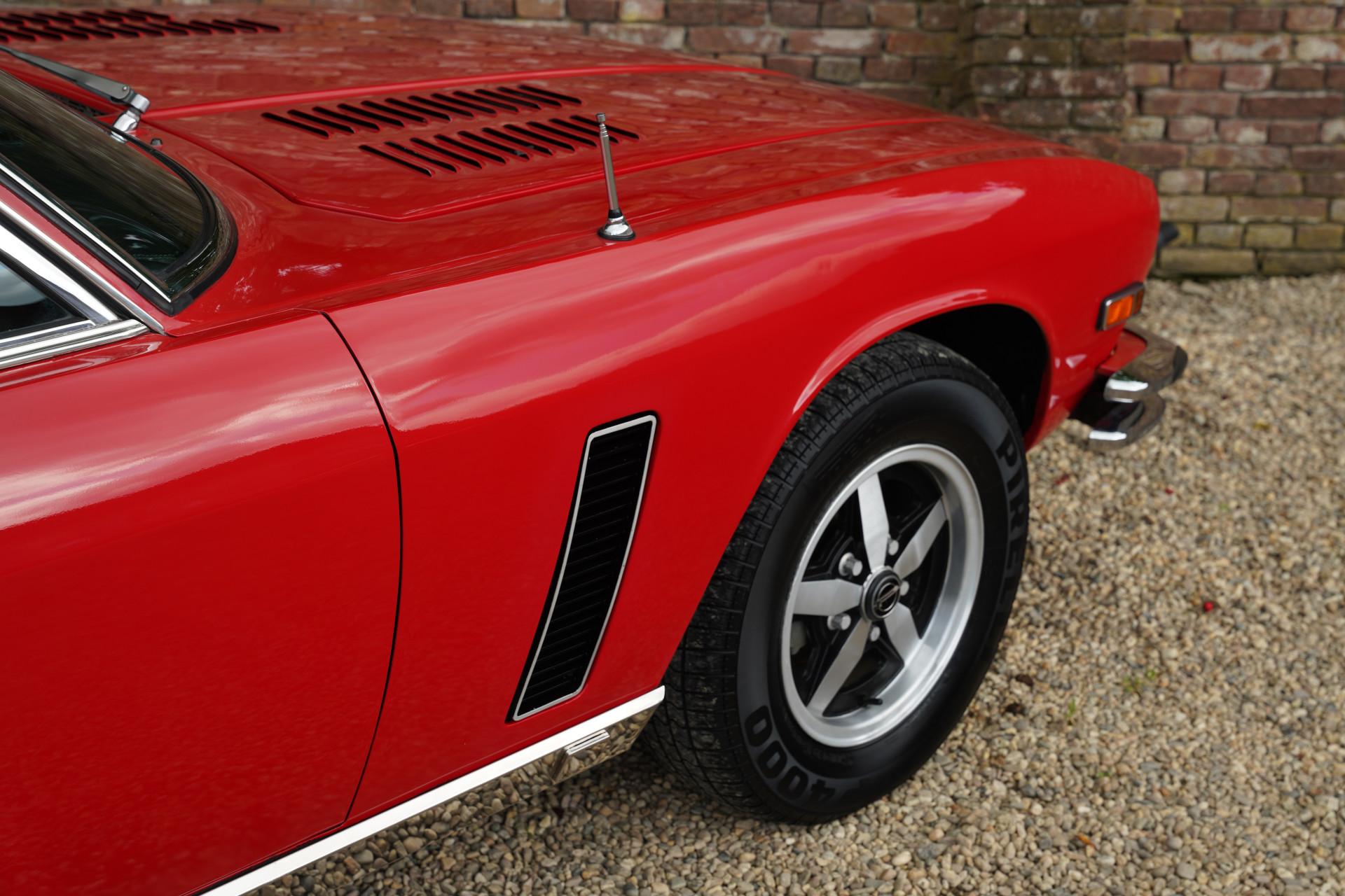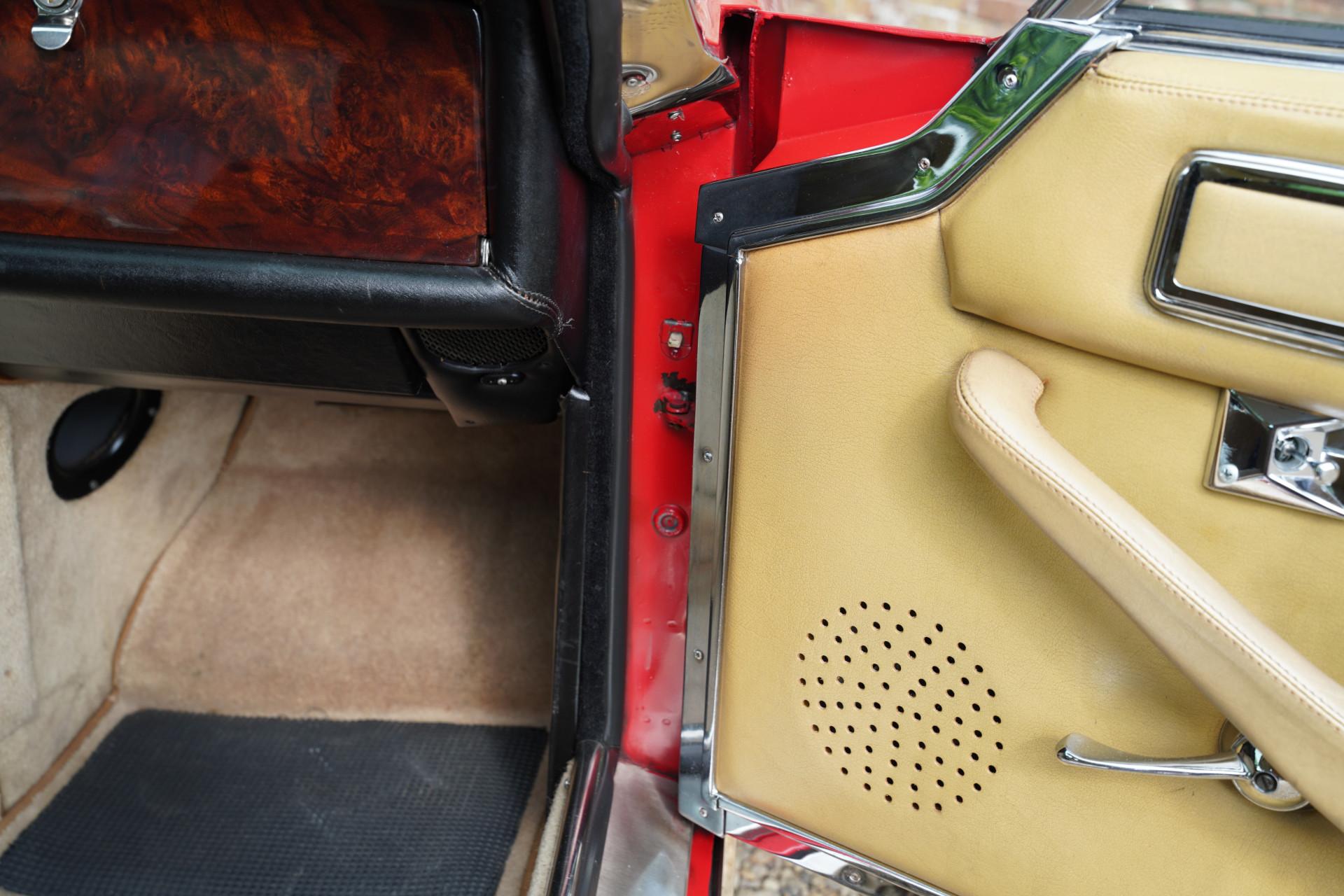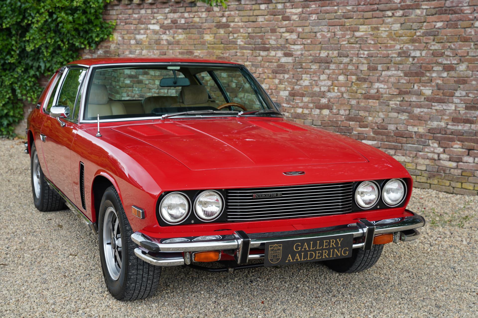 This particular example, one of the last 100 Interceptor IIIs, was originally delivered to Canada in 1976. The car has been restored and overhauled in the past, with the body color repainted in a striking “Flag Red” shade. The paint is in neat condition, and the chrome parts, which appear to be original, have developed a beautiful patina, adding to the car's authenticity. The rubber parts are partly used but still in neat condition. The interior of this Jensen is truly a sight to behold. The leather upholstery has developed a wonderful patina, enhancing the car's authenticity. The dashboard is still neat and functional.