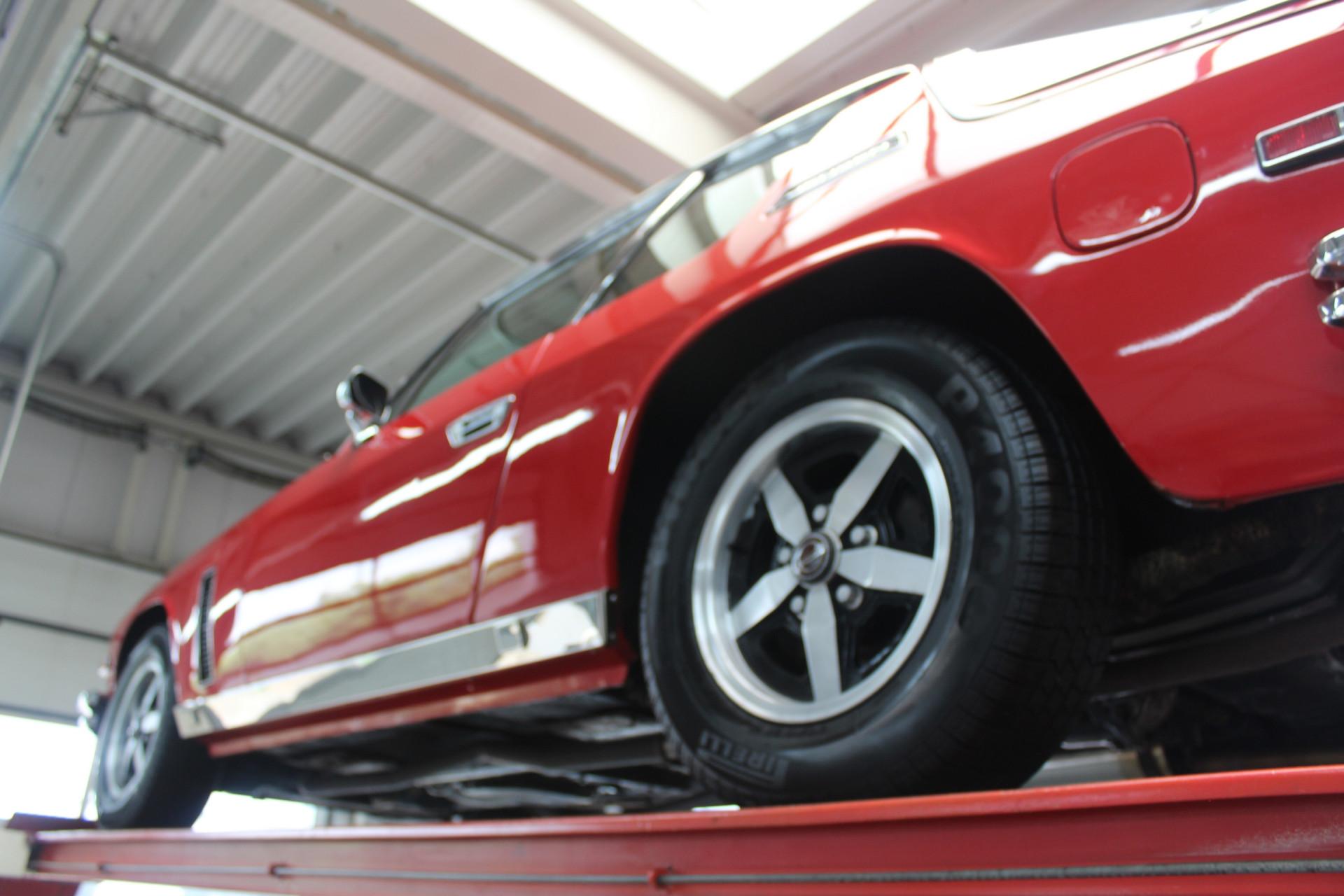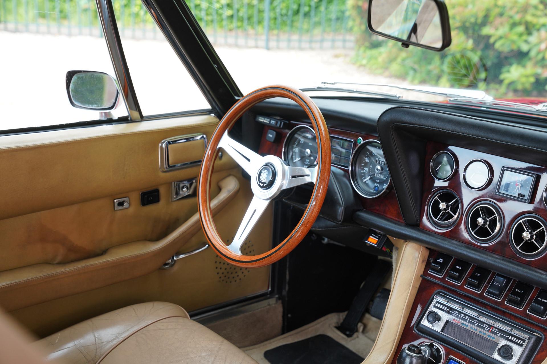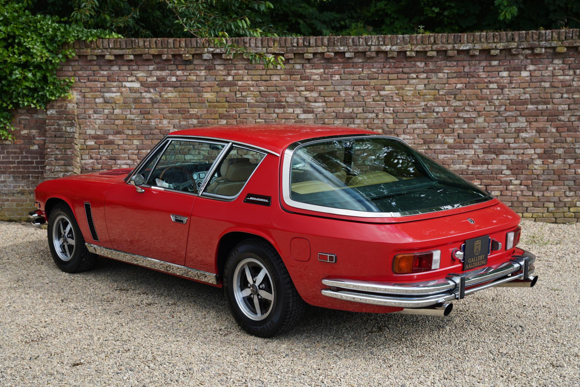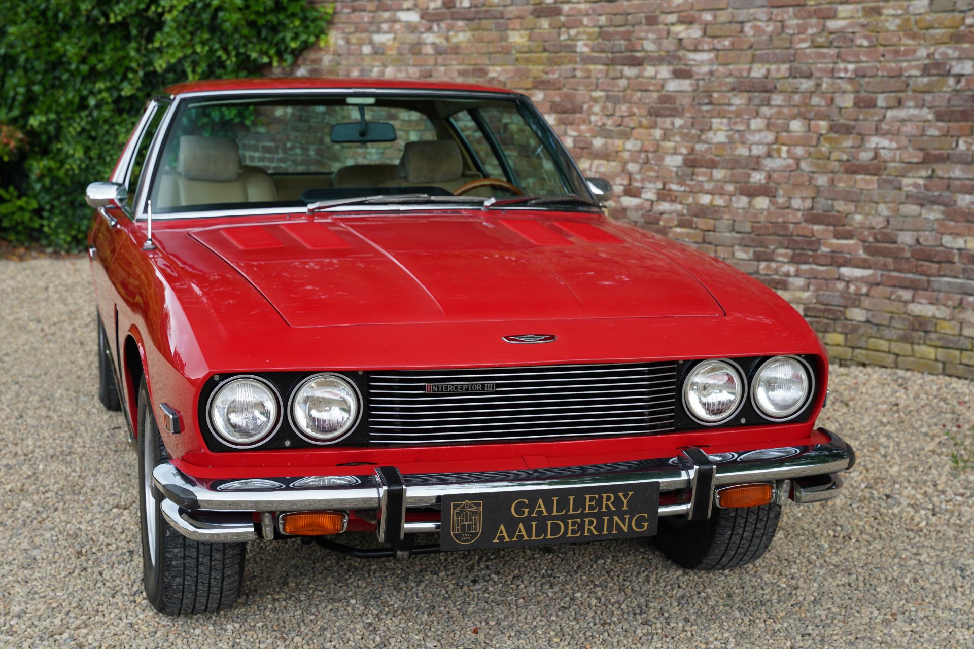This particular example, one of the last 100 Interceptor IIIs, was originally delivered to Canada in 1976. The car has been restored and overhauled in the past, with the body color repainted in a striking “Flag Red” shade. The paint is in neat condition, and the chrome parts, which appear to be original, have developed a beautiful patina, adding to the car's authenticity. The rubber parts are partly used but still in neat condition. The interior of this Jensen is truly a sight to behold. The leather upholstery has developed a wonderful patina, enhancing the car's authenticity. The dashboard is still neat and functional.