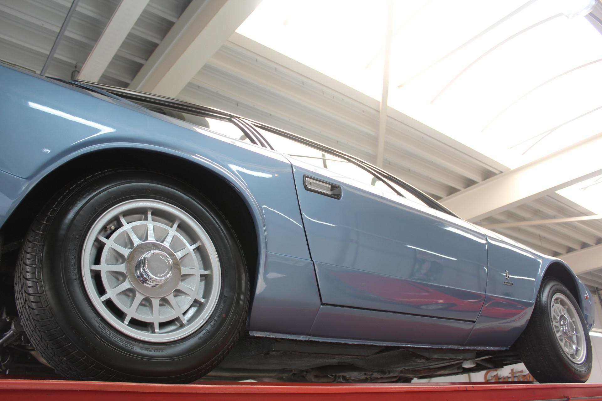 This particular example, built in 1976, wears the striking shade of Blu Metallizzato paired with a black Connolly leather interior. It has been fully restored by Maserati's own Classiche department. The bodywork presents nicely, the paintwork gleams, and the overall quality of the restoration was executed to a good standard. Panel fit is neat, while the interior retains many original details. For decades this Khamsin was cherished by a true Maserati aficionado as part of a dedicated Maserati collection.