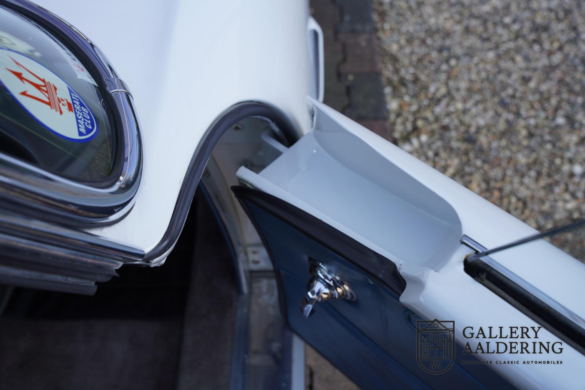 What makes this Maserati so remarkable is how authentic it still is. The car has never undergone a full restoration but has been carefully preserved over the years. It has only been repainted once in its original color, 'Grigio Biacca', and the result is stunning. The bodywork is sleek, with beautifully fitting panel gaps. This Maserati remains pure and in great condition, with a well-preserved body and original details.