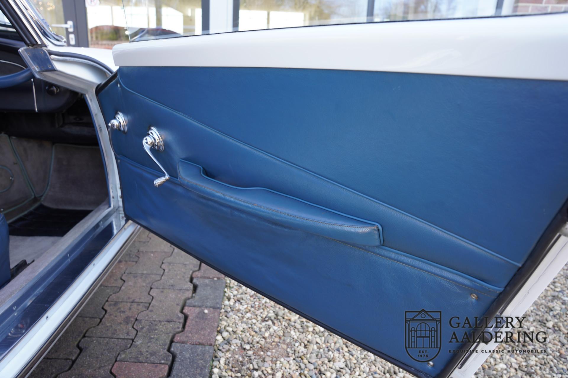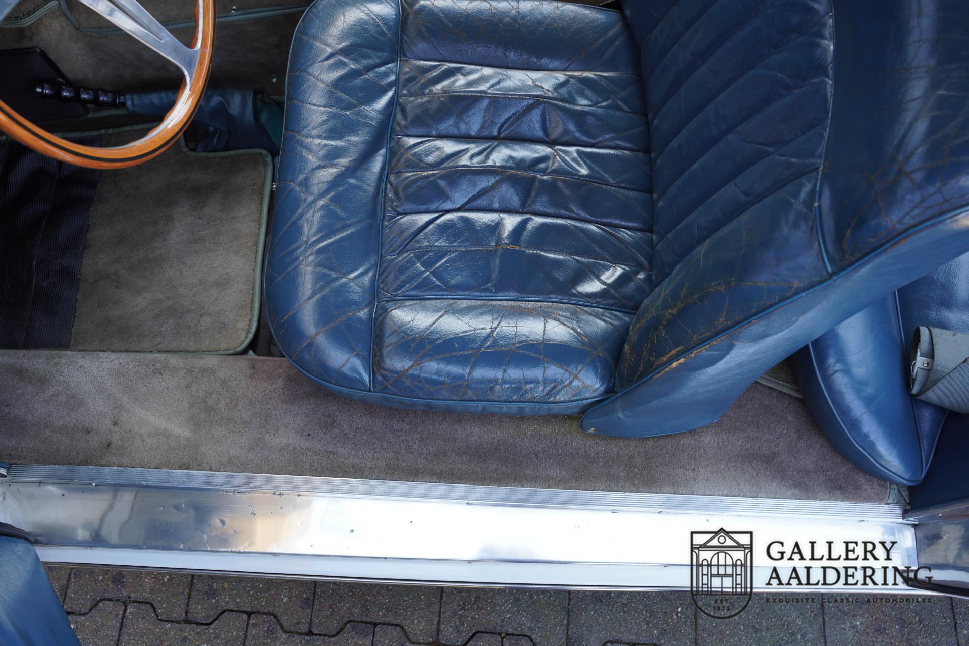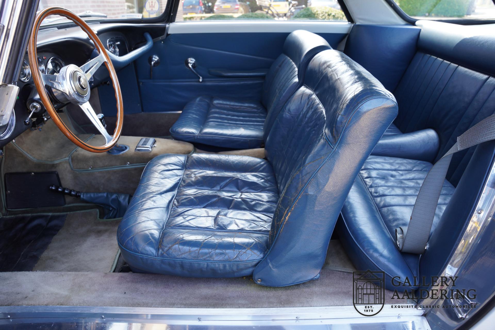 This sense of authenticity continues inside the car. The dark blue leather upholstery is still the original leather that left the factory in 1958 — and it still looks fantastic. A beautiful patina enhances the character of this remarkable Maserati. The dashboard retains its original charm, and the instruments are still in excellent condition.