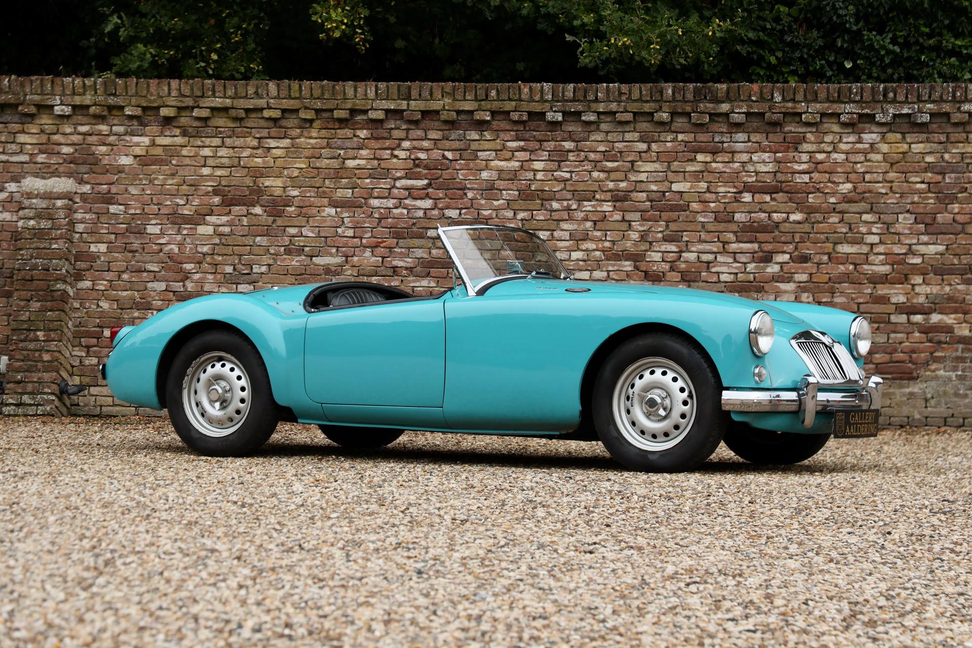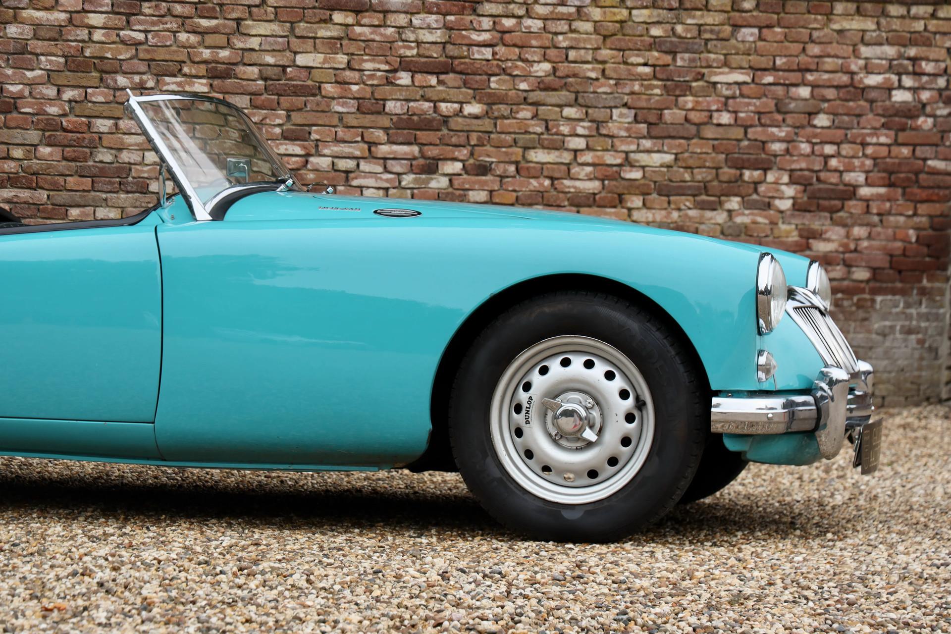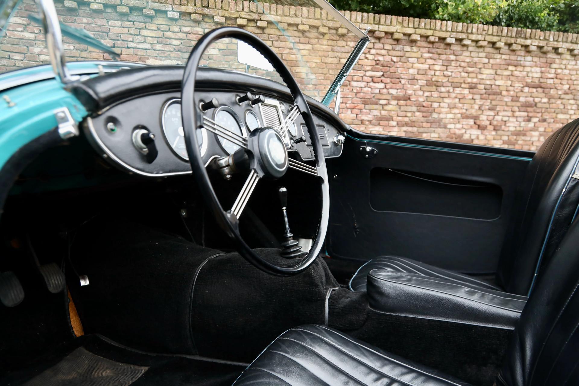 Under the hood is the 108-hp Twin Cam engine, which runs smoothly and powerfully. Thanks to the extra power and Dunlop disc brakes, this MG A Twin Cam offers an impressive driving experience. The clutch pedal is light to operate, the brakes are well dosed, and the steering feel is sharp and direct, adding to the driving pleasure. With sporty bucket seats and 15-inch knock-off steel wheels, this roadster is perfectly prepared for participation in rally's and touring.