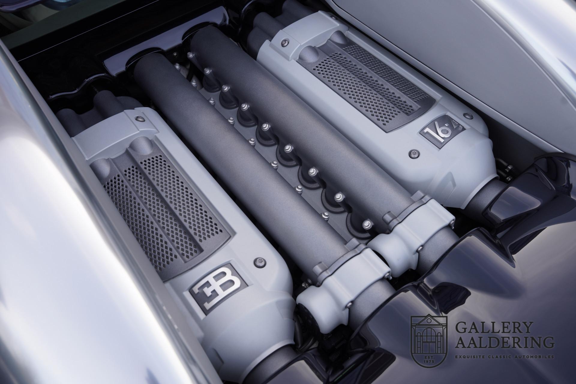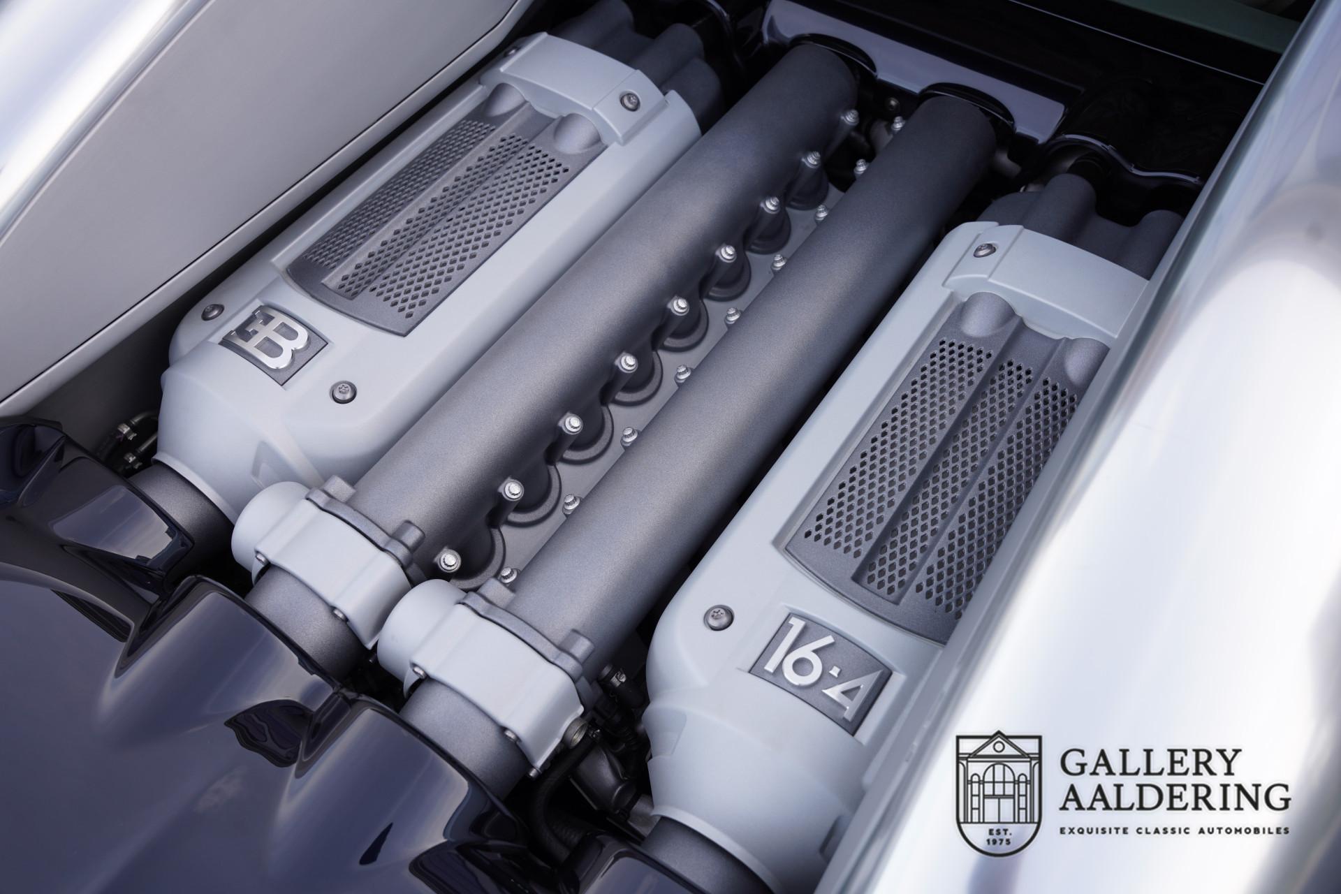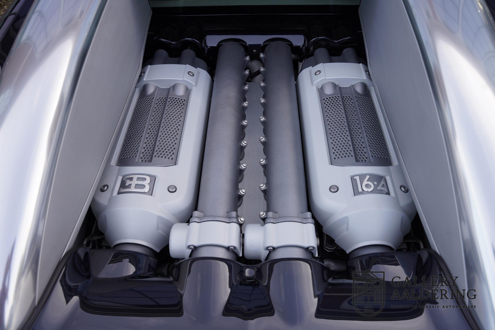 The Veyron features an 8.0-litre, quad-turbocharged, W16 cylinder engine, equivalent to two narrow-angle V8 engines bolted together. Each cylinder has four valves for a total of 64, but the configuration of each bank allows two overhead camshafts to drive two banks of cylinders so only four camshafts are needed. The engine is fed by four turbochargers and displaces 7,993 cc, with a square 86 by 86 mm bore and stroke.