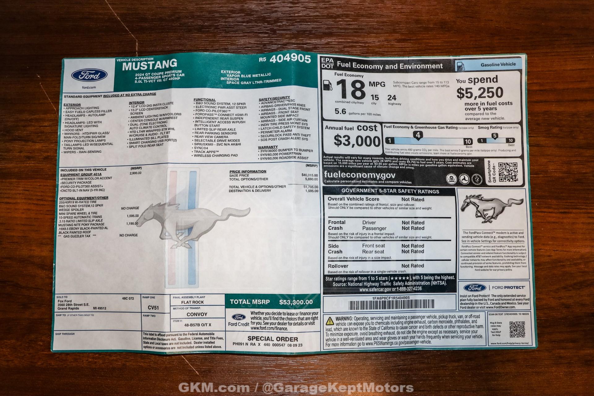2024 Ford Mustang GT Premium- One Owner - Only 3,650 Original Miles- Dealer Installed Whipple Supercharged - 5.0L V8 with 10 Speed Automatic - Vapor Blue Exterior- Space Grey Leather Interior- 7 Year Ceramic Coating- Lowering Springs- Equipment Group 401A- Mustang Nite Pony Package- Original Window Sticker & Both KeysThis 2024 Ford Mustang GT Premium is an exceptional, one-owner example that blends modern muscle, cutting-edge technology, and serious performance upgrades. With only 3,650 miles, it presents essentially as new and is finished in striking Vapor Blue over a refined Space Grey leather interior. This GT Premium stands out not only for its condition, but for the thoughtful enhancements that elevate it well beyond a standard Mustang.Power comes from Ford's legendary 5.0L Coyote V8, further transformed by a dealer-installed Whipple supercharger that delivers exhilarating acceleration and an unmistakable supercharged presence. Paired with a 10-speed automatic transmission, this Mustang offers lightning-quick shifts, impressive drivability, and the ability to comfortably cruise or unleash its full performance at a moments notice. The modern S650 platform is widely praised for its improved chassis rigidity, handling balance, and advanced driver-focused technology, making this one of the most capable Mustangs Ford has ever produced.The exterior is enhanced with lowering springs that give the car a more aggressive stance while maintaining everyday usability. A professionally applied 7-year ceramic coating protects the Vapor Blue paint, ensuring long-term gloss, durability, and ease of maintenance. Inside, the Space Grey leather interior delivers the premium feel expected from the GT Premium trim, complemented by Ford's latest digital displays, infotainment system, and comfort features.With ultra-low mileage, a transferable modern driving experience, and the added excitement of a Whipple supercharger, this 2024 Mustang GT Premium offers the rare opportunity to own a nearly new, professionally upgraded performance car without the wait or cost of building one yourself. Whether you're looking for a high-end daily driver, a weekend thrill machine, or a standout modern muscle car, this Mustang delivers power, style, and presence in equal measure.