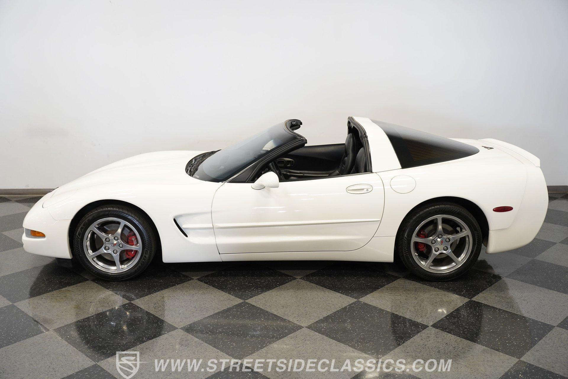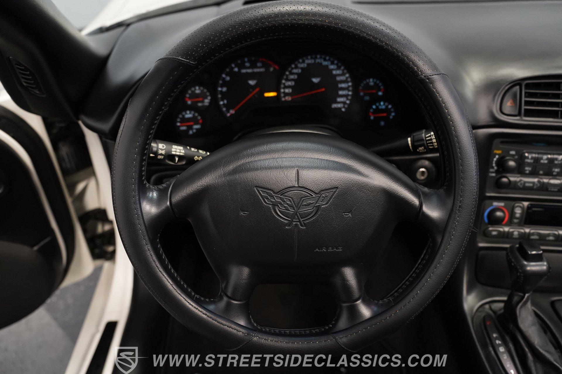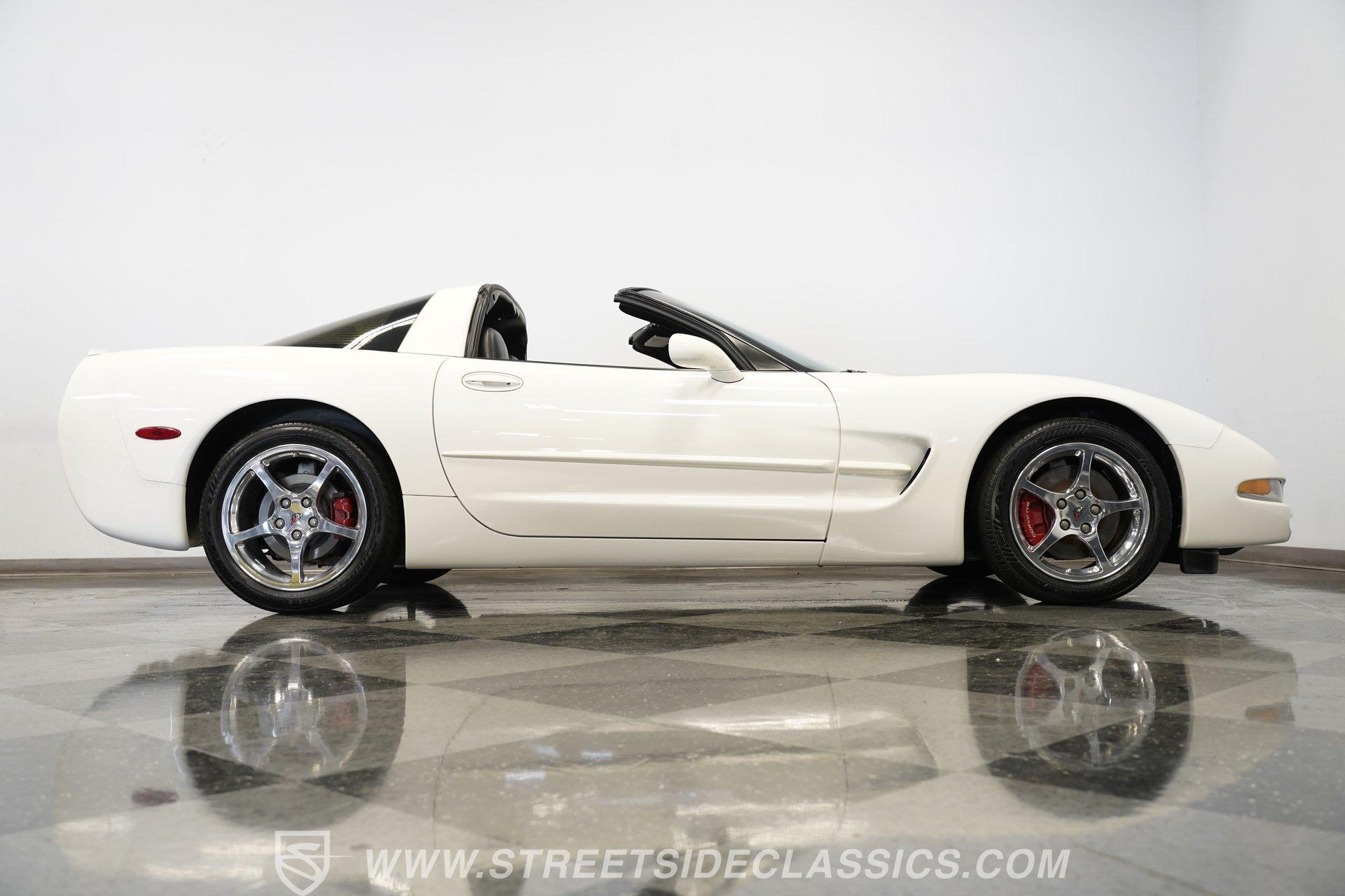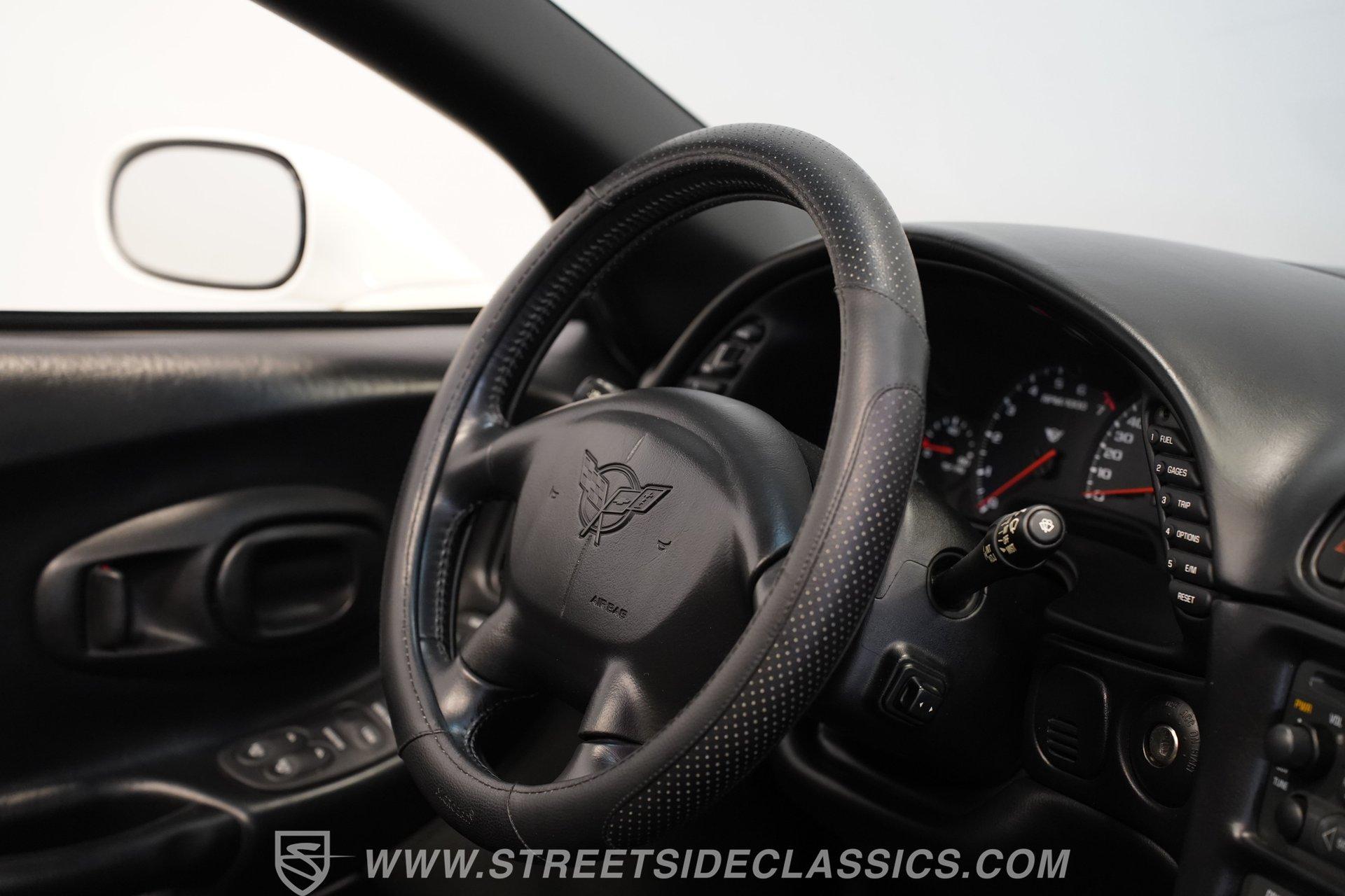 While technically not a 'classic' by insurance standards, the C5 Corvette is a landmark in Chevy's history, representing a turning point towards the future for Chevy. Any true Corvette enthusiast will tell you that finding one, regardless of condition, is always exciting, but finding one that is nearly completely stock sends heart rates to another level of happiness, which is why this numbers-matching 2002 Chevrolet Corvette has us smiling from ear to ear. With just 44,874 actual miles, this Speedway White beauty sports its original paint and body panels, with no accident history. Inside, the original black leather interior remains in great shape, with a center locking console separating plush power bucket seats. Power locks, mirrors, windows, a telescopic steering wheel, cruise control, air conditioning, an AM/FM/CD/AUX stereo, a heads-up display, and a clear view of the sky through its targa top. Pop the classic front-hinged hood of this C5, and you'll find its original 346 cubic-inch LS1 small-block V-8 in its stock condition. Mods aren't necessary when you have 350 horsepower and 360 pound-feet of torque on tap, but thanks to an added cold air intake and full Corsa cat-back exhaust. That power is then routed through its rear-mounted 4L60E four-speed automatic transmission, which looks to be original, before heading out to the 2.73-geared rear end. HIGHLIGHTS: 44,874 Actual Miles Rare Speedway White Believed Original Paint Believed Original Body Panels Rear Spoiler Targa Top Original LS1 V8 Cold Air Intake Full Corsa Cat Back 4L60E Four Speed Auto 2.73 Rear Original Black Leather Power Seats Power Windows Power Locks Power Mirrors Telescopic Wheel AC Cruise Heads Up Display AM/FM/CD/AUX Receipts Owner's Manual This 2002 Chevrolet Corvette rides on a factory-style suspension, with four-wheel power disc brakes all around. Staggered five-spoke chrome wheels measure 17 inches in front and 18 inches in the rear. This Speedway White C5 is a perfect example of the perfect collector's car. Unaltered in any significant way, no accidents, and the rarest exterior color of the 2002 model year, all make for a car that can be bought with confidence. With less than 45,000 miles on the odometer, this is also a car that can allow you to enjoy the magic of a C5 if you missed it the first time around, or simply want to relive it all over again. Call today!