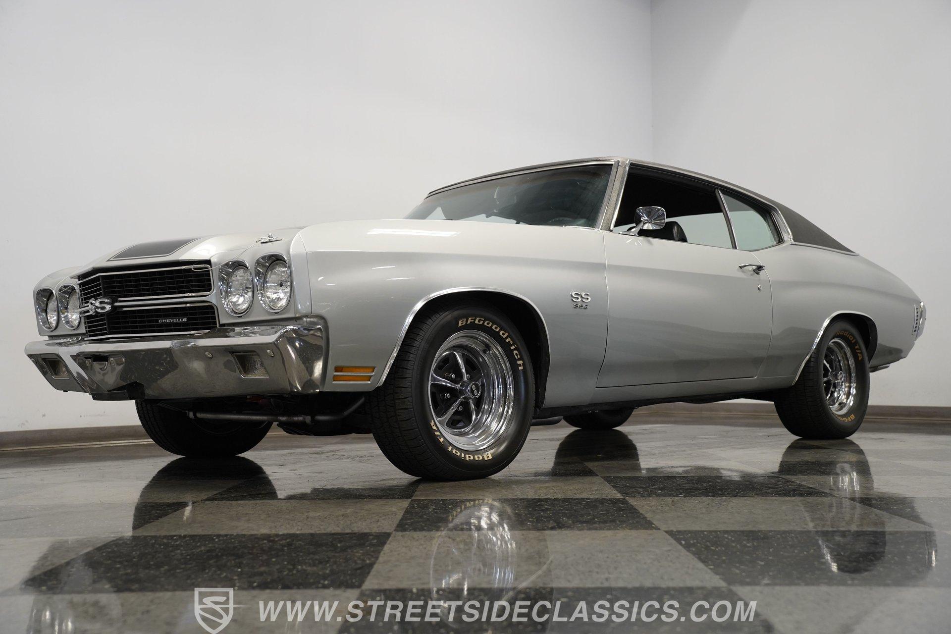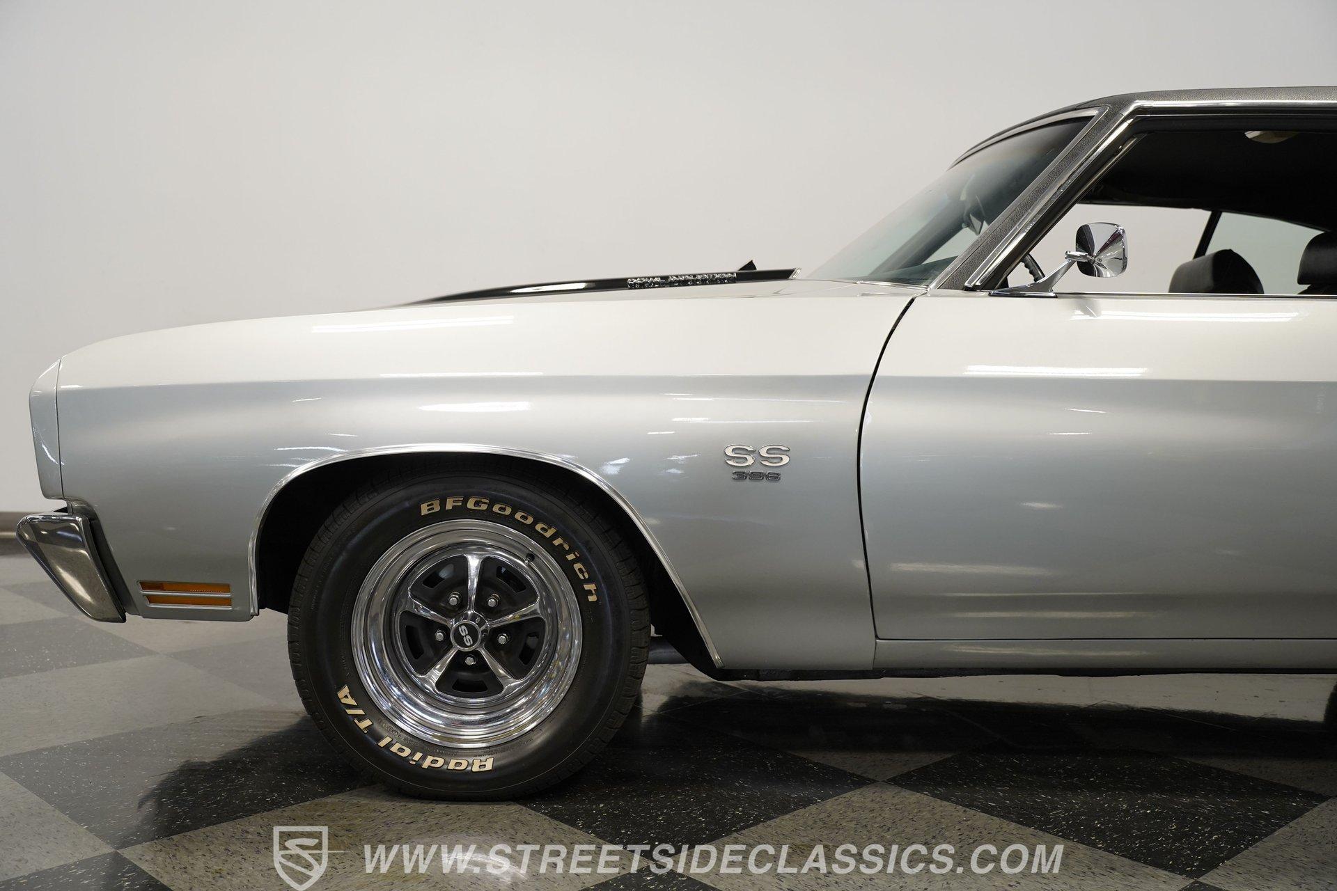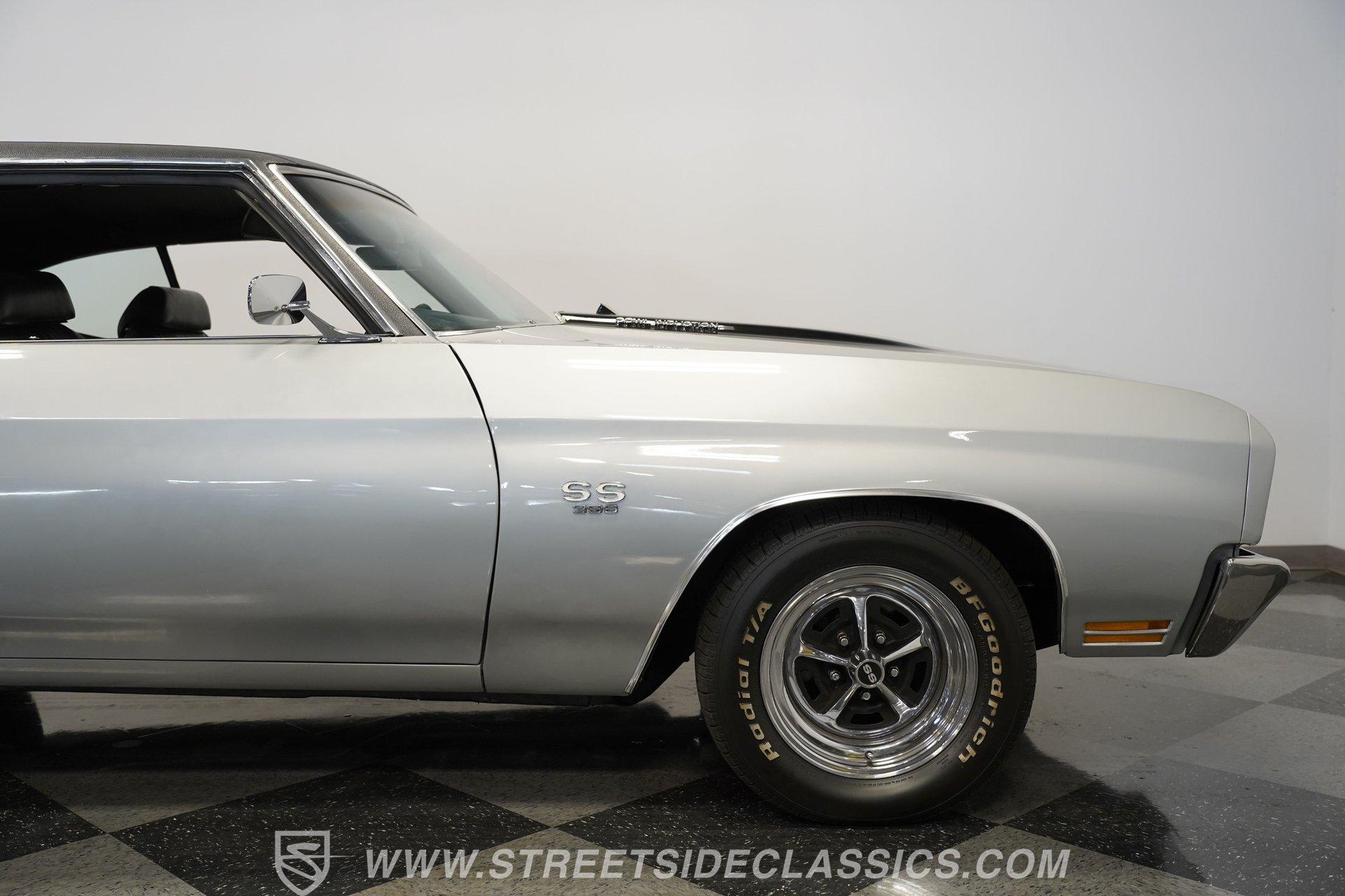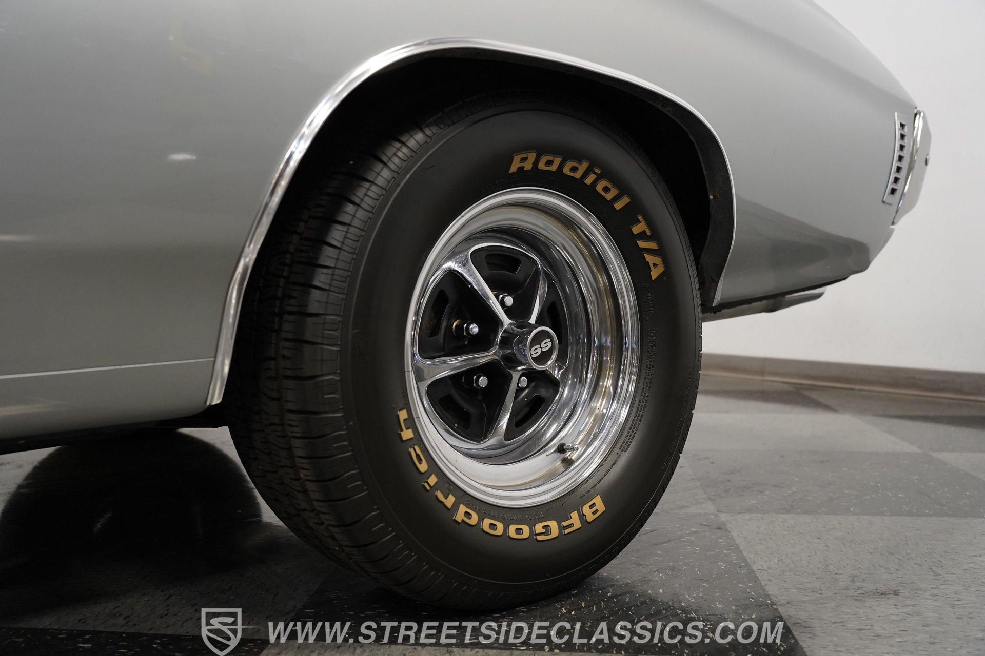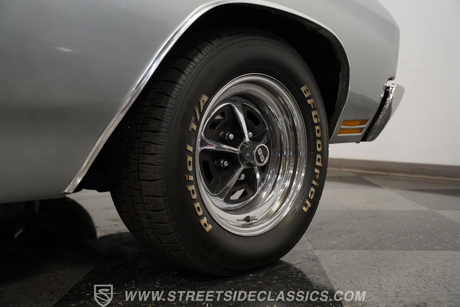 Black vinyl bucket seats anchor the performance-focused cockpit. The floor-mounted Hurst 5-speed shifter rises from the center console, ready for quick gear changes. Amenities include a modern Classic Auto Air air conditioning system, factory-style in-dash tach and gauge cluster, tilt steering column and a factory-style three-spoke sport steering wheel. An upgraded retro AM/FM/AUX/Bluetooth stereo provides music for cruising. The healthy 396 cubic-inch V8 pairs with a 5-speed manual transmission, channeling power through a stout 12-bolt rear end. The engine compartment is detailed and largely stock in appearance. Features include a GM aluminum intake manifold, Edelbrock AVS2 four-barrel carburetor, functional cowl induction hood, serpentine belt system, stock chrome valve covers, power steering, power brakes with front discs and a Champion aluminum radiator. A rumbling dual exhaust system equipped with chambered Flowmaster-style mufflers provides the perfect muscle car sound. The suspension setup includes coil springs, shocks, and a rear sway bar with heavy-duty boxed rear lower control arms for improved handling and street performance. HIGHLIGHTS: 396 V8 Engine 5-Speed Manual Transmission Edelbrock 4-Barrel Carburetor 12-Bolt Rear End Front Power Disc Brakes Dual Exhaust Aluminum Radiator Rear Sway Bar with Boxed Control Arms Cortez Silver Paint SS Badging Modern Air Conditioning 15-inch Chrome SS-Style Wheels Functional Cowl Induction Hood Black Interior with Bucket Seats Center Console Hurst Shifter Power Steering Retro AM/FM/AUX Stereo Tilt Steering Column Factory-Style Tach and Gauge Cluster Serpentine Belt System This 1970 Chevelle SS 396 Tribute combines V8 muscle, manual shifting action, and street-ready style in one potent package. The silver-on-black color scheme and upgraded audio system make this classic perfect for both cruising and showing. Call today!
