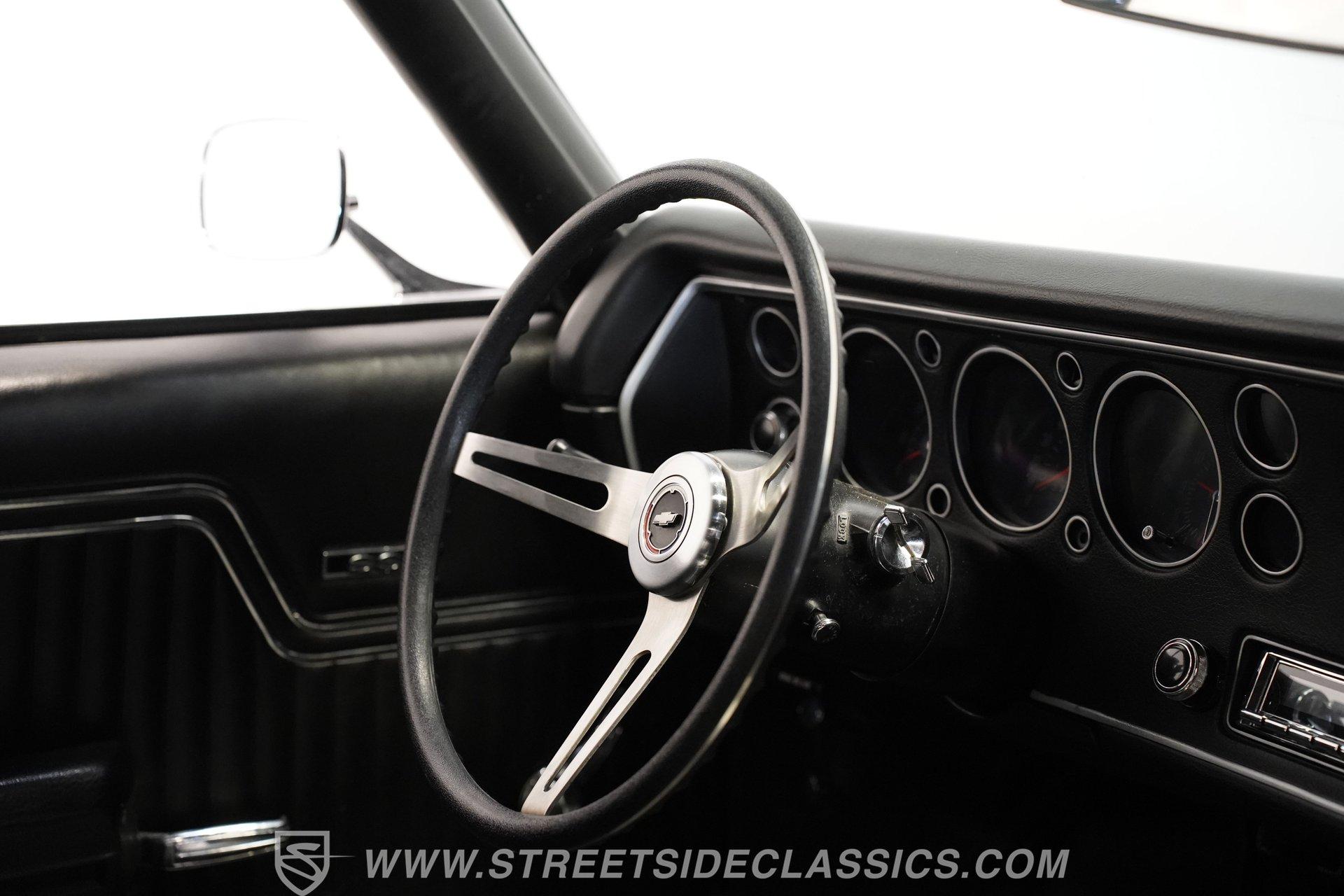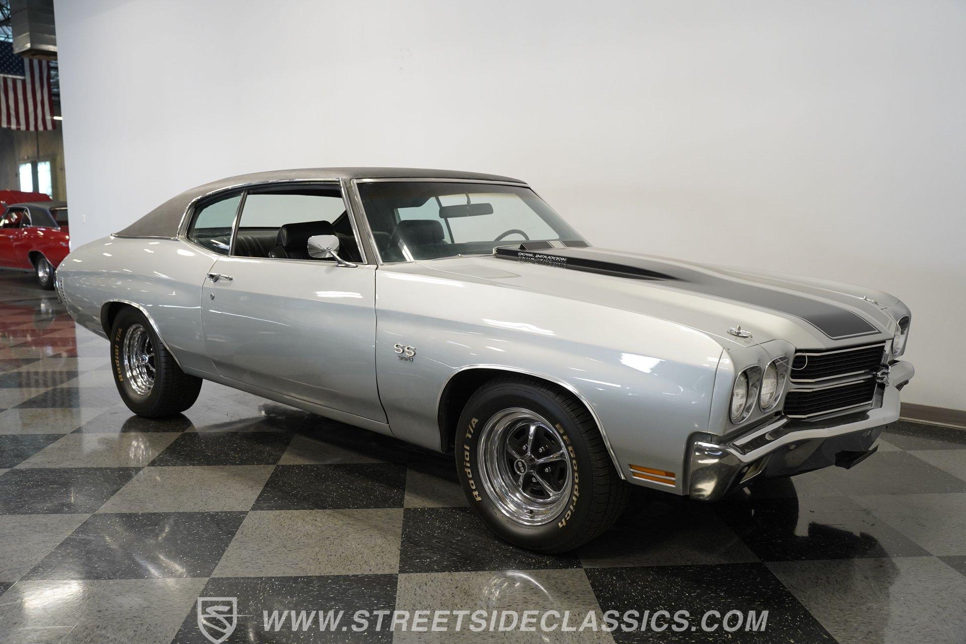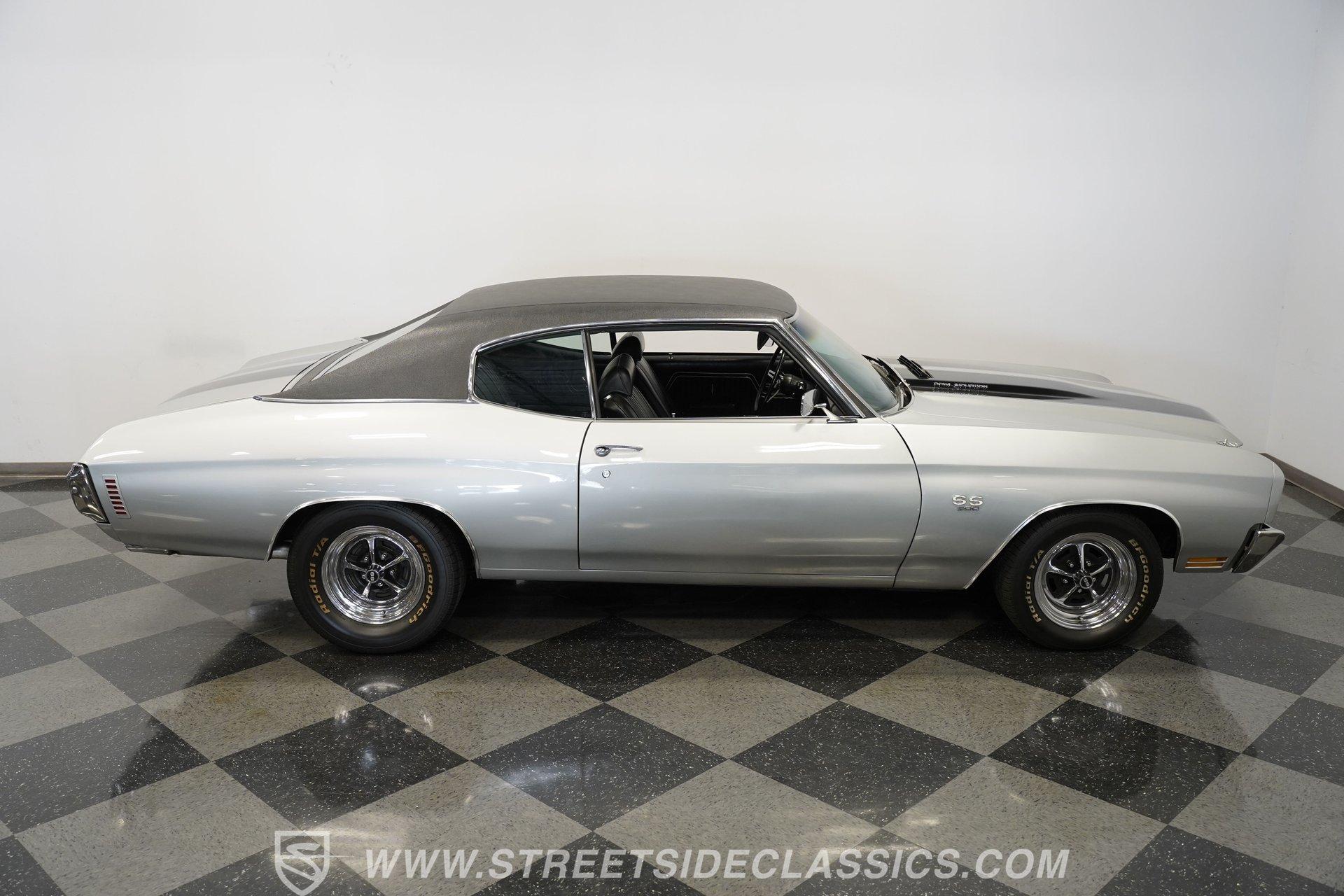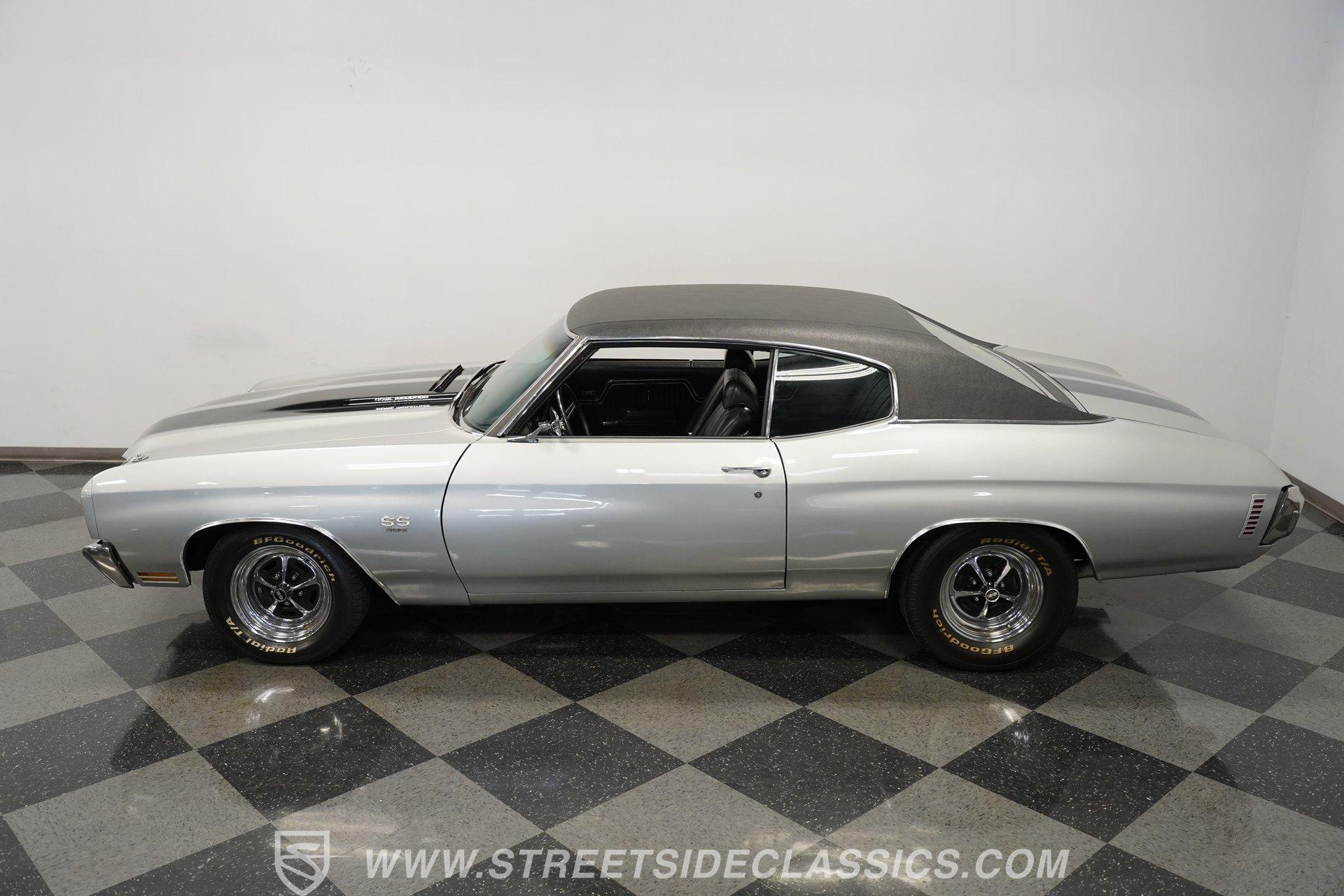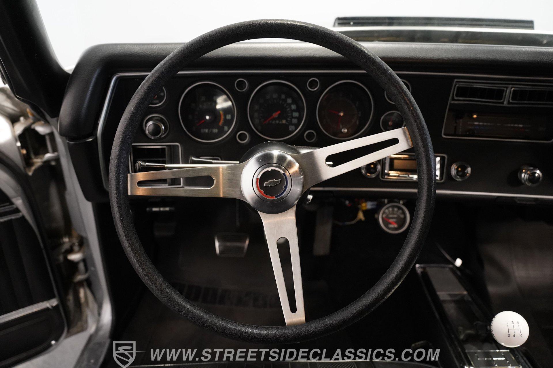 Black vinyl bucket seats anchor the performance-focused cockpit. The floor-mounted Hurst 5-speed shifter rises from the center console, ready for quick gear changes. Amenities include a modern Classic Auto Air air conditioning system, factory-style in-dash tach and gauge cluster, tilt steering column and a factory-style three-spoke sport steering wheel. An upgraded retro AM/FM/AUX/Bluetooth stereo provides music for cruising. The healthy 396 cubic-inch V8 pairs with a 5-speed manual transmission, channeling power through a stout 12-bolt rear end. The engine compartment is detailed and largely stock in appearance. Features include a GM aluminum intake manifold, Edelbrock AVS2 four-barrel carburetor, functional cowl induction hood, serpentine belt system, stock chrome valve covers, power steering, power brakes with front discs and a Champion aluminum radiator. A rumbling dual exhaust system equipped with chambered Flowmaster-style mufflers provides the perfect muscle car sound. The suspension setup includes coil springs, shocks, and a rear sway bar with heavy-duty boxed rear lower control arms for improved handling and street performance. HIGHLIGHTS: 396 V8 Engine 5-Speed Manual Transmission Edelbrock 4-Barrel Carburetor 12-Bolt Rear End Front Power Disc Brakes Dual Exhaust Aluminum Radiator Rear Sway Bar with Boxed Control Arms Cortez Silver Paint SS Badging Modern Air Conditioning 15-inch Chrome SS-Style Wheels Functional Cowl Induction Hood Black Interior with Bucket Seats Center Console Hurst Shifter Power Steering Retro AM/FM/AUX Stereo Tilt Steering Column Factory-Style Tach and Gauge Cluster Serpentine Belt System This 1970 Chevelle SS 396 Tribute combines V8 muscle, manual shifting action, and street-ready style in one potent package. The silver-on-black color scheme and upgraded audio system make this classic perfect for both cruising and showing. Call today!
