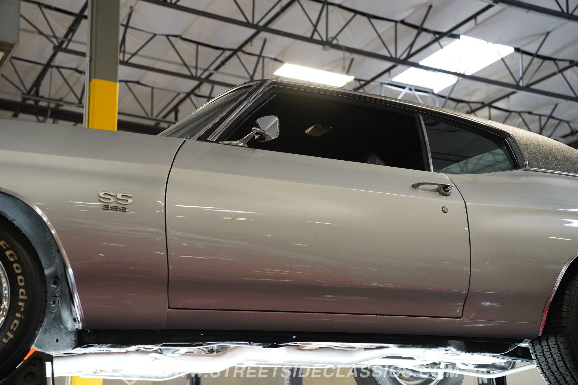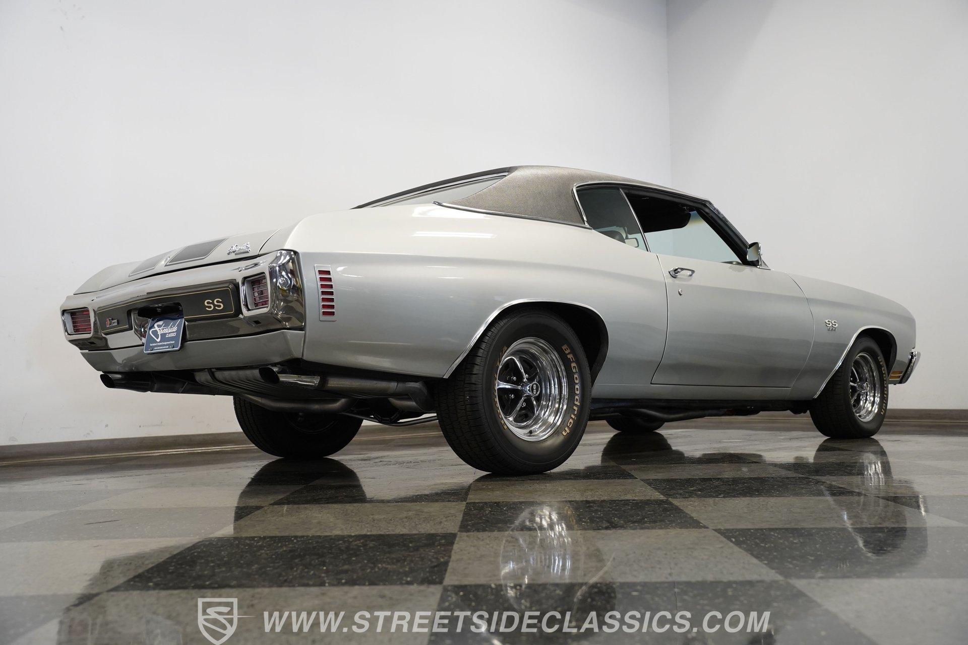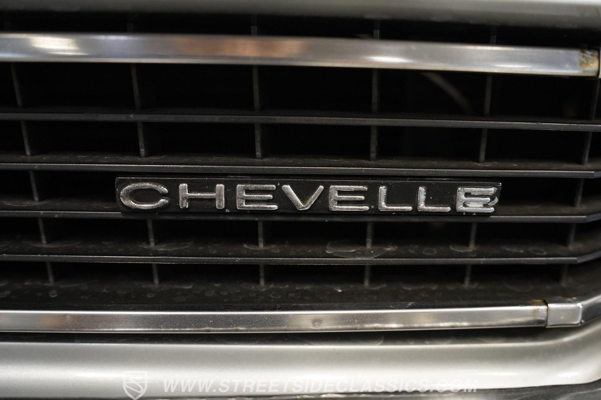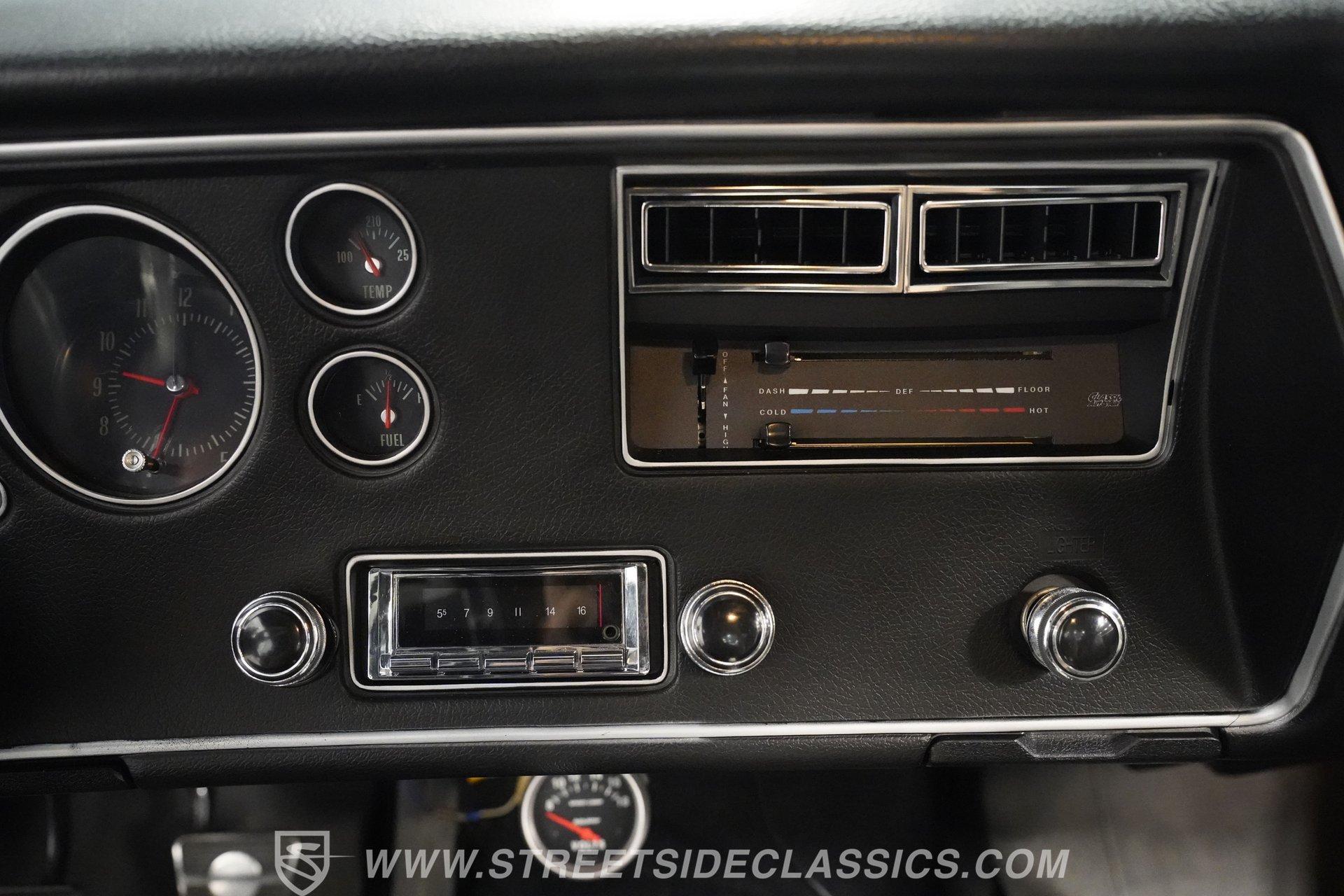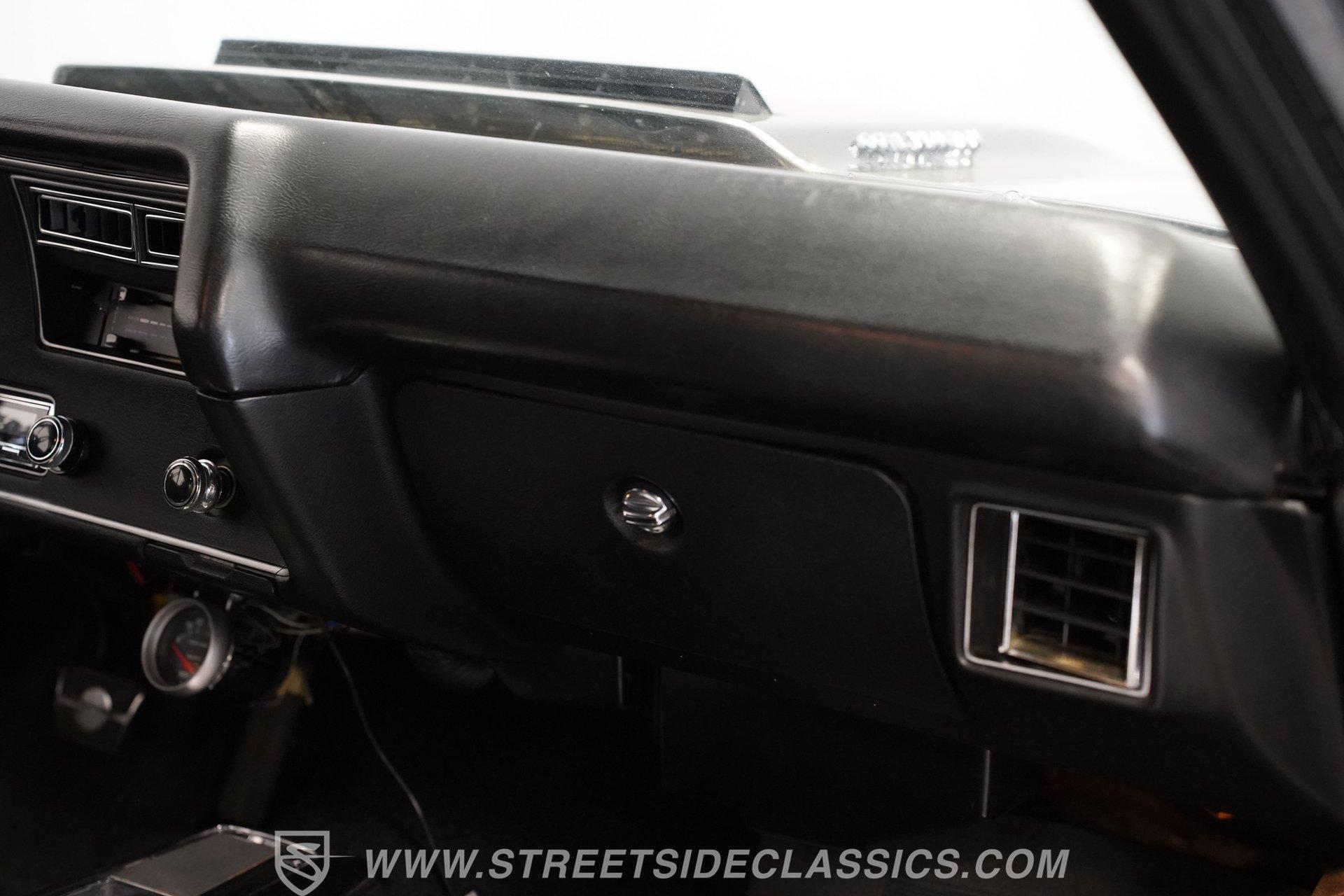 Black vinyl bucket seats anchor the performance-focused cockpit. The floor-mounted Hurst 5-speed shifter rises from the center console, ready for quick gear changes. Amenities include a modern Classic Auto Air air conditioning system, factory-style in-dash tach and gauge cluster, tilt steering column and a factory-style three-spoke sport steering wheel. An upgraded retro AM/FM/AUX/Bluetooth stereo provides music for cruising. The healthy 396 cubic-inch V8 pairs with a 5-speed manual transmission, channeling power through a stout 12-bolt rear end. The engine compartment is detailed and largely stock in appearance. Features include a GM aluminum intake manifold, Edelbrock AVS2 four-barrel carburetor, functional cowl induction hood, serpentine belt system, stock chrome valve covers, power steering, power brakes with front discs and a Champion aluminum radiator. A rumbling dual exhaust system equipped with chambered Flowmaster-style mufflers provides the perfect muscle car sound. The suspension setup includes coil springs, shocks, and a rear sway bar with heavy-duty boxed rear lower control arms for improved handling and street performance. HIGHLIGHTS: 396 V8 Engine 5-Speed Manual Transmission Edelbrock 4-Barrel Carburetor 12-Bolt Rear End Front Power Disc Brakes Dual Exhaust Aluminum Radiator Rear Sway Bar with Boxed Control Arms Cortez Silver Paint SS Badging Modern Air Conditioning 15-inch Chrome SS-Style Wheels Functional Cowl Induction Hood Black Interior with Bucket Seats Center Console Hurst Shifter Power Steering Retro AM/FM/AUX Stereo Tilt Steering Column Factory-Style Tach and Gauge Cluster Serpentine Belt System This 1970 Chevelle SS 396 Tribute combines V8 muscle, manual shifting action, and street-ready style in one potent package. The silver-on-black color scheme and upgraded audio system make this classic perfect for both cruising and showing. Call today!
