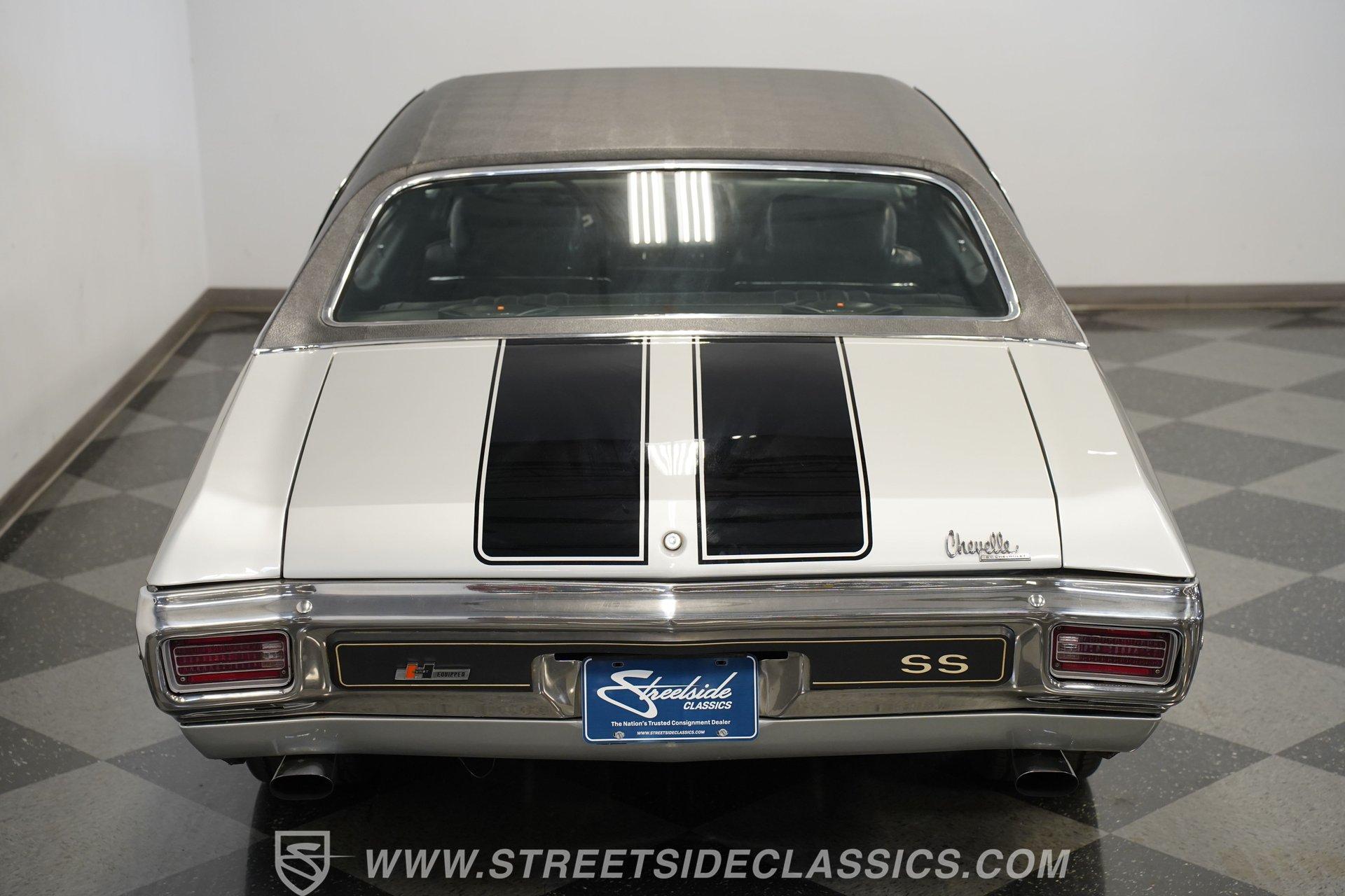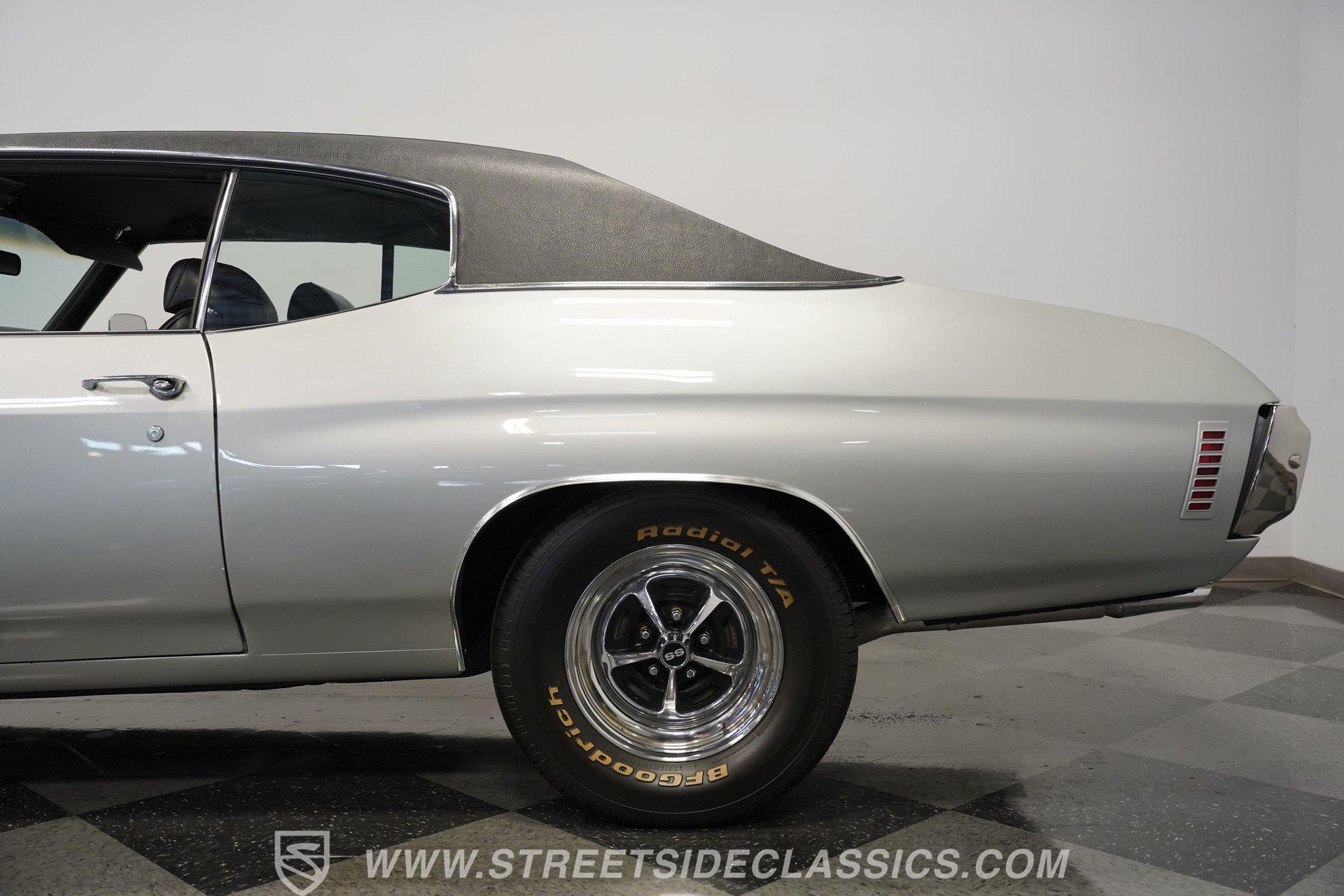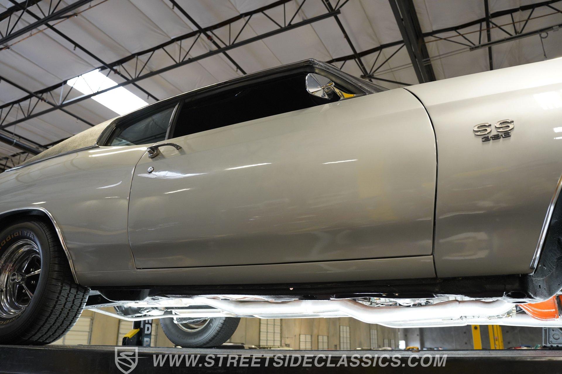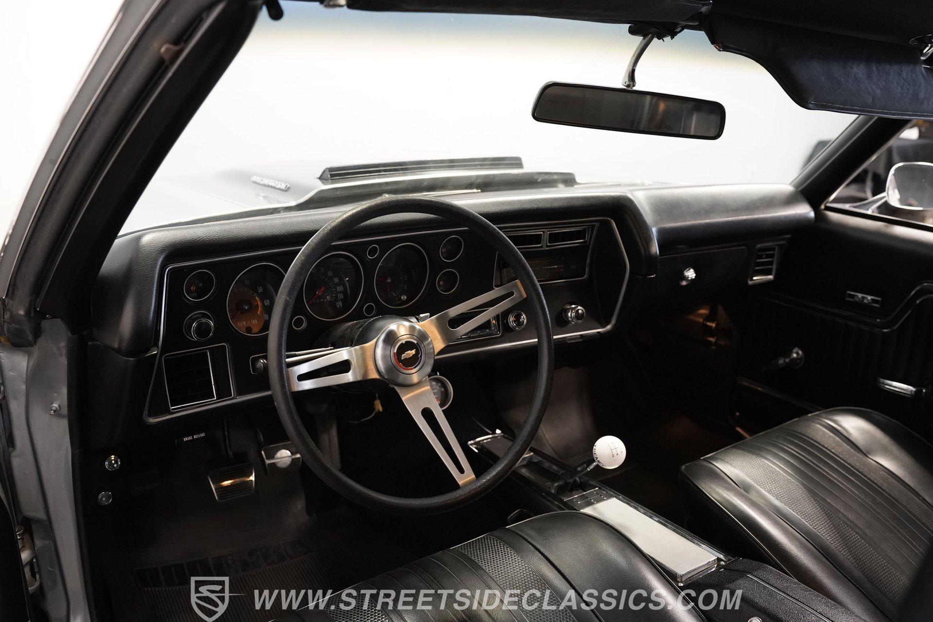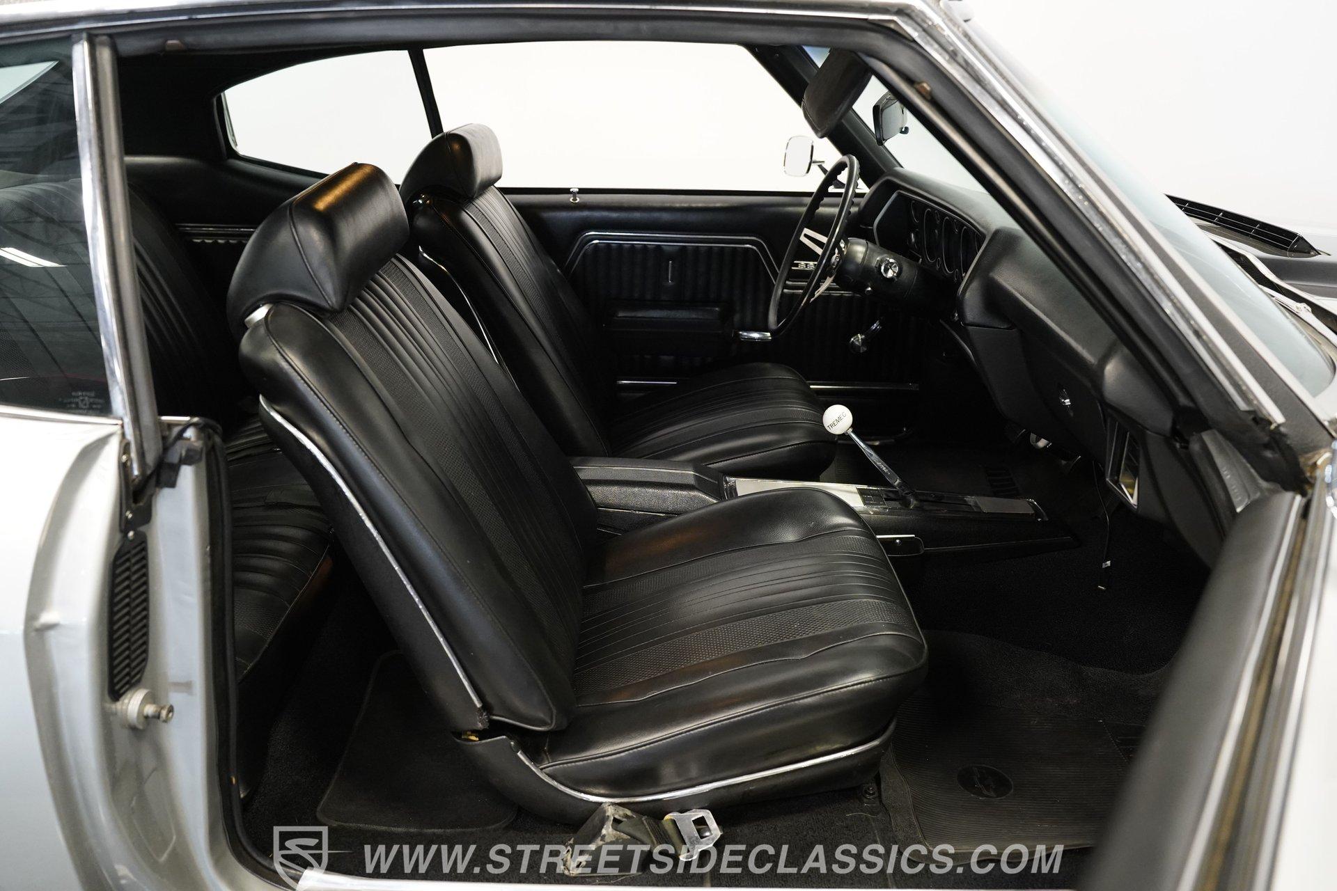 Black vinyl bucket seats anchor the performance-focused cockpit. The floor-mounted Hurst 5-speed shifter rises from the center console, ready for quick gear changes. Amenities include a modern Classic Auto Air air conditioning system, factory-style in-dash tach and gauge cluster, tilt steering column and a factory-style three-spoke sport steering wheel. An upgraded retro AM/FM/AUX/Bluetooth stereo provides music for cruising. The healthy 396 cubic-inch V8 pairs with a 5-speed manual transmission, channeling power through a stout 12-bolt rear end. The engine compartment is detailed and largely stock in appearance. Features include a GM aluminum intake manifold, Edelbrock AVS2 four-barrel carburetor, functional cowl induction hood, serpentine belt system, stock chrome valve covers, power steering, power brakes with front discs and a Champion aluminum radiator. A rumbling dual exhaust system equipped with chambered Flowmaster-style mufflers provides the perfect muscle car sound. The suspension setup includes coil springs, shocks, and a rear sway bar with heavy-duty boxed rear lower control arms for improved handling and street performance. HIGHLIGHTS: 396 V8 Engine 5-Speed Manual Transmission Edelbrock 4-Barrel Carburetor 12-Bolt Rear End Front Power Disc Brakes Dual Exhaust Aluminum Radiator Rear Sway Bar with Boxed Control Arms Cortez Silver Paint SS Badging Modern Air Conditioning 15-inch Chrome SS-Style Wheels Functional Cowl Induction Hood Black Interior with Bucket Seats Center Console Hurst Shifter Power Steering Retro AM/FM/AUX Stereo Tilt Steering Column Factory-Style Tach and Gauge Cluster Serpentine Belt System This 1970 Chevelle SS 396 Tribute combines V8 muscle, manual shifting action, and street-ready style in one potent package. The silver-on-black color scheme and upgraded audio system make this classic perfect for both cruising and showing. Call today!