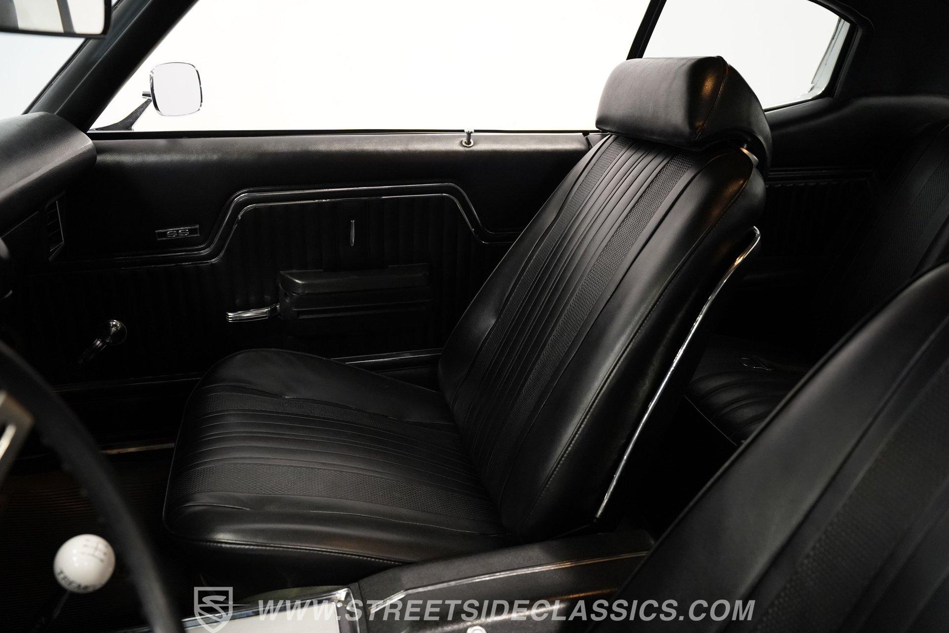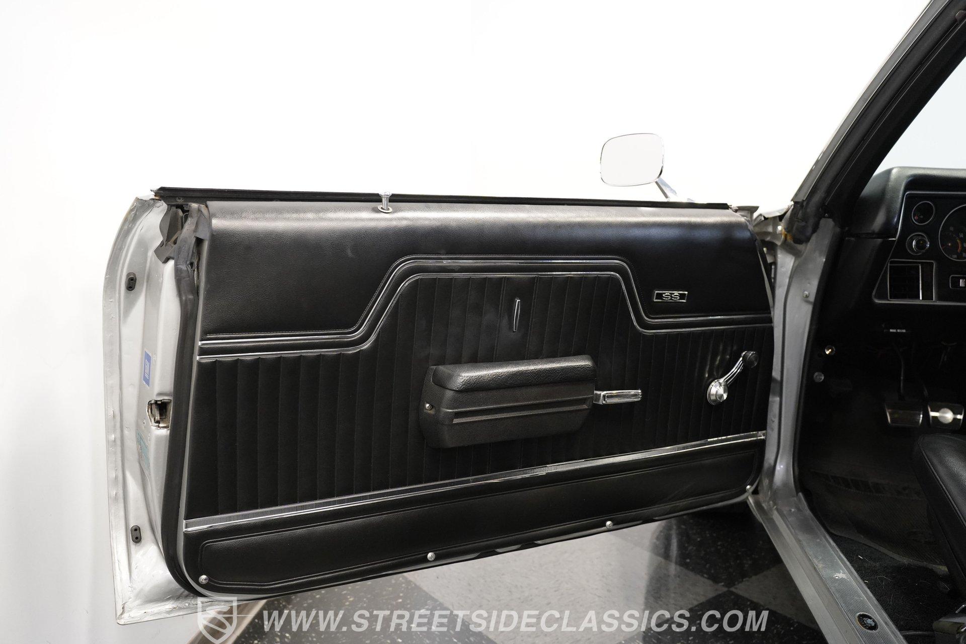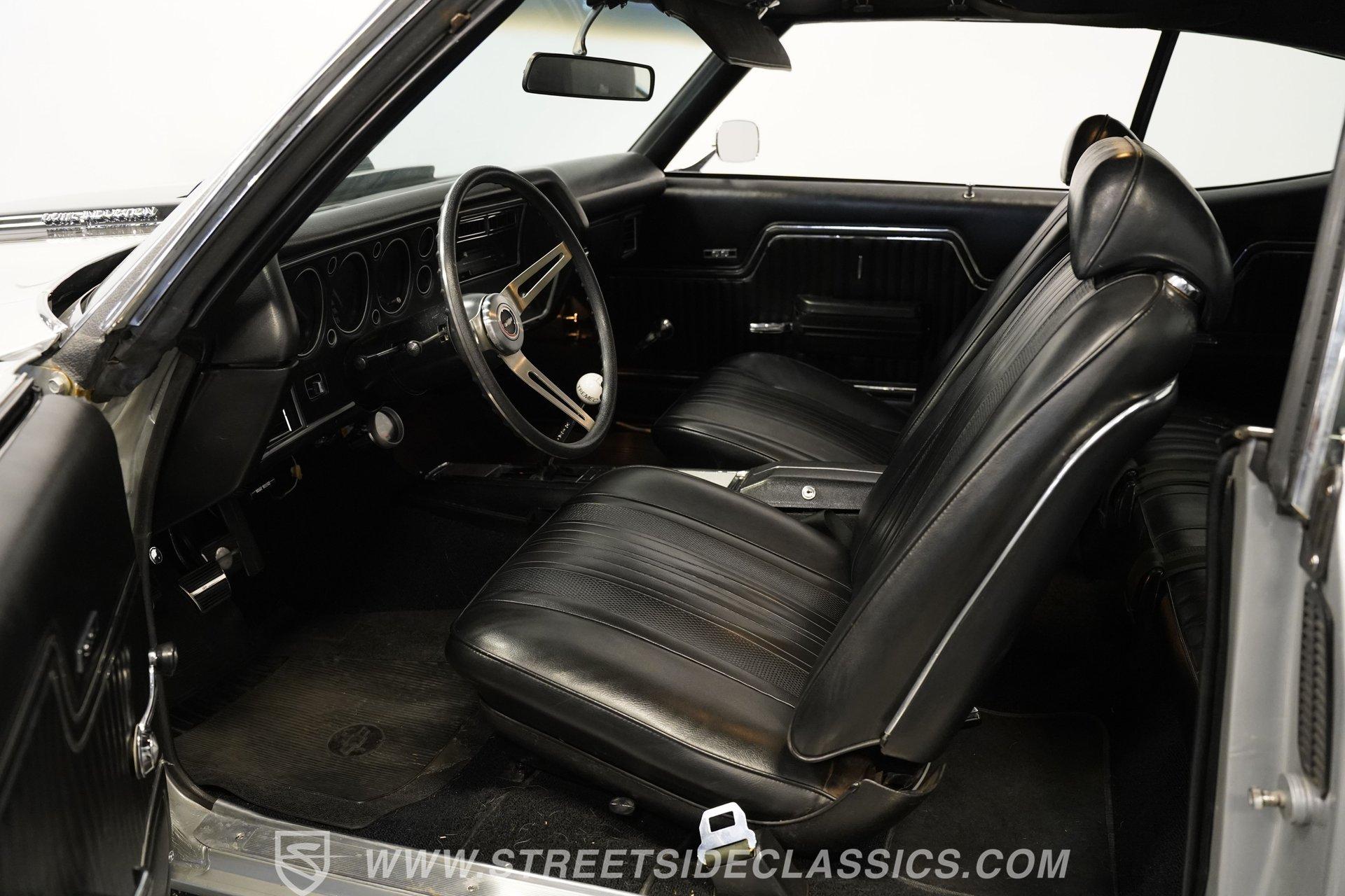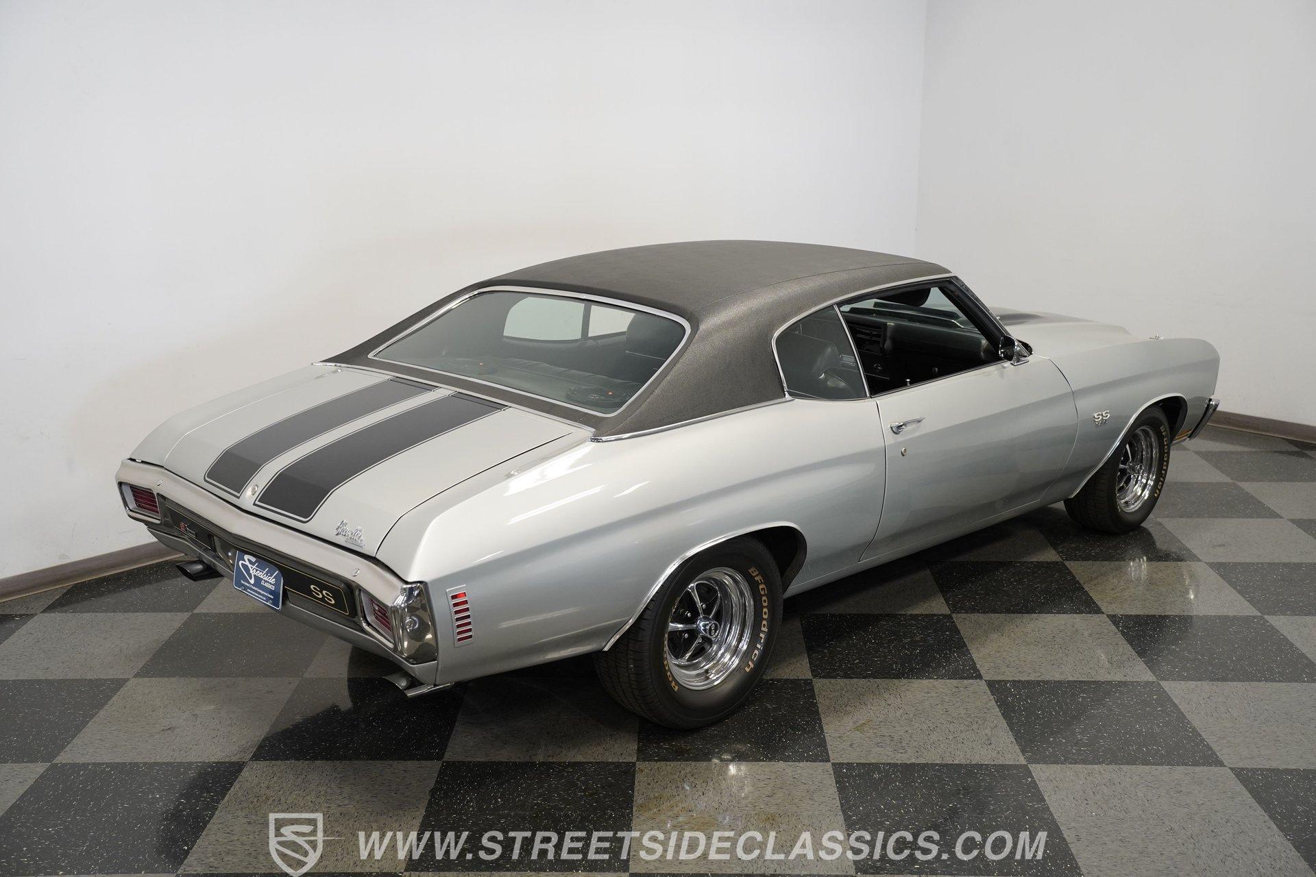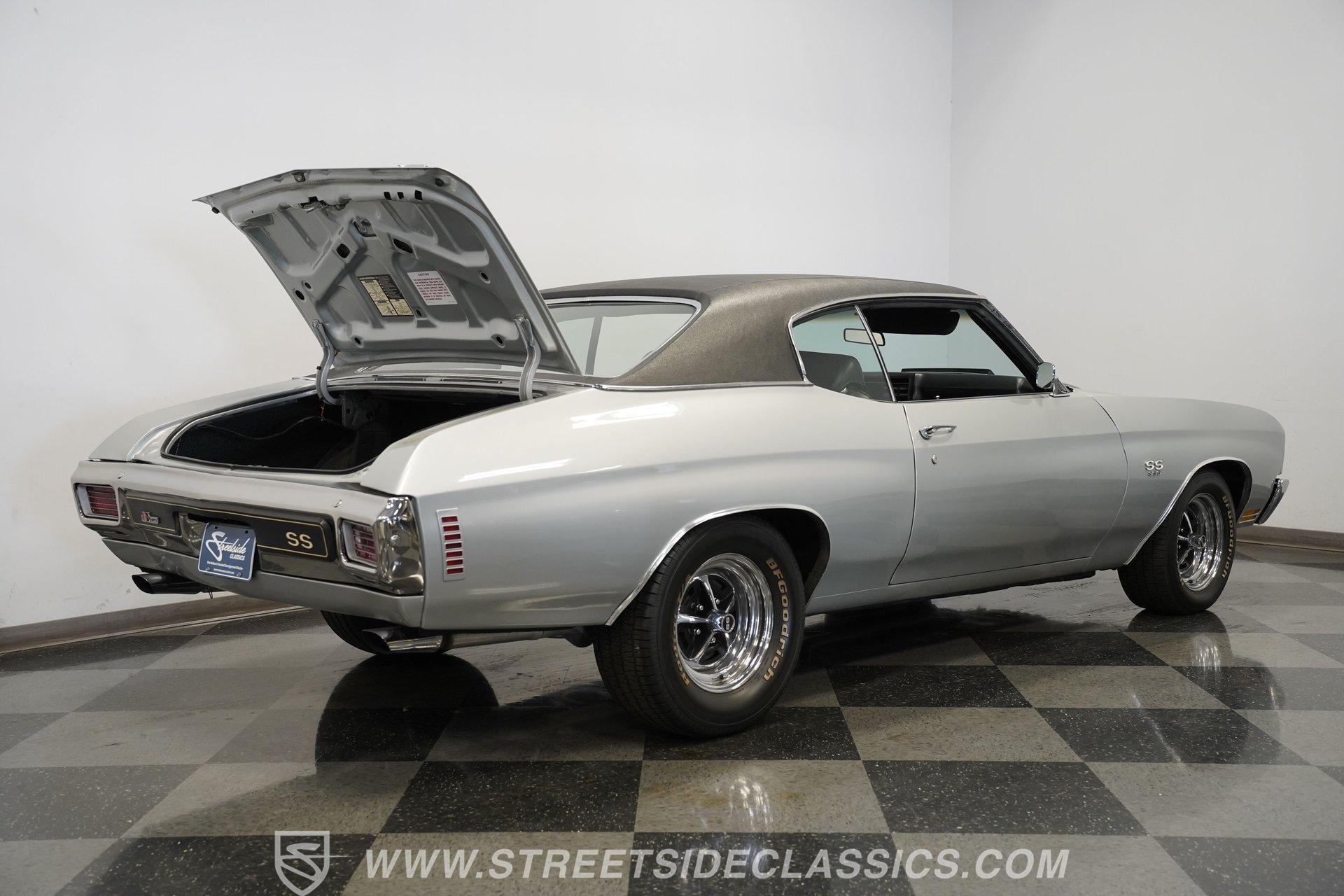 Black vinyl bucket seats anchor the performance-focused cockpit. The floor-mounted Hurst 5-speed shifter rises from the center console, ready for quick gear changes. Amenities include a modern Classic Auto Air air conditioning system, factory-style in-dash tach and gauge cluster, tilt steering column and a factory-style three-spoke sport steering wheel. An upgraded retro AM/FM/AUX/Bluetooth stereo provides music for cruising. The healthy 396 cubic-inch V8 pairs with a 5-speed manual transmission, channeling power through a stout 12-bolt rear end. The engine compartment is detailed and largely stock in appearance. Features include a GM aluminum intake manifold, Edelbrock AVS2 four-barrel carburetor, functional cowl induction hood, serpentine belt system, stock chrome valve covers, power steering, power brakes with front discs and a Champion aluminum radiator. A rumbling dual exhaust system equipped with chambered Flowmaster-style mufflers provides the perfect muscle car sound. The suspension setup includes coil springs, shocks, and a rear sway bar with heavy-duty boxed rear lower control arms for improved handling and street performance. HIGHLIGHTS: 396 V8 Engine 5-Speed Manual Transmission Edelbrock 4-Barrel Carburetor 12-Bolt Rear End Front Power Disc Brakes Dual Exhaust Aluminum Radiator Rear Sway Bar with Boxed Control Arms Cortez Silver Paint SS Badging Modern Air Conditioning 15-inch Chrome SS-Style Wheels Functional Cowl Induction Hood Black Interior with Bucket Seats Center Console Hurst Shifter Power Steering Retro AM/FM/AUX Stereo Tilt Steering Column Factory-Style Tach and Gauge Cluster Serpentine Belt System This 1970 Chevelle SS 396 Tribute combines V8 muscle, manual shifting action, and street-ready style in one potent package. The silver-on-black color scheme and upgraded audio system make this classic perfect for both cruising and showing. Call today!