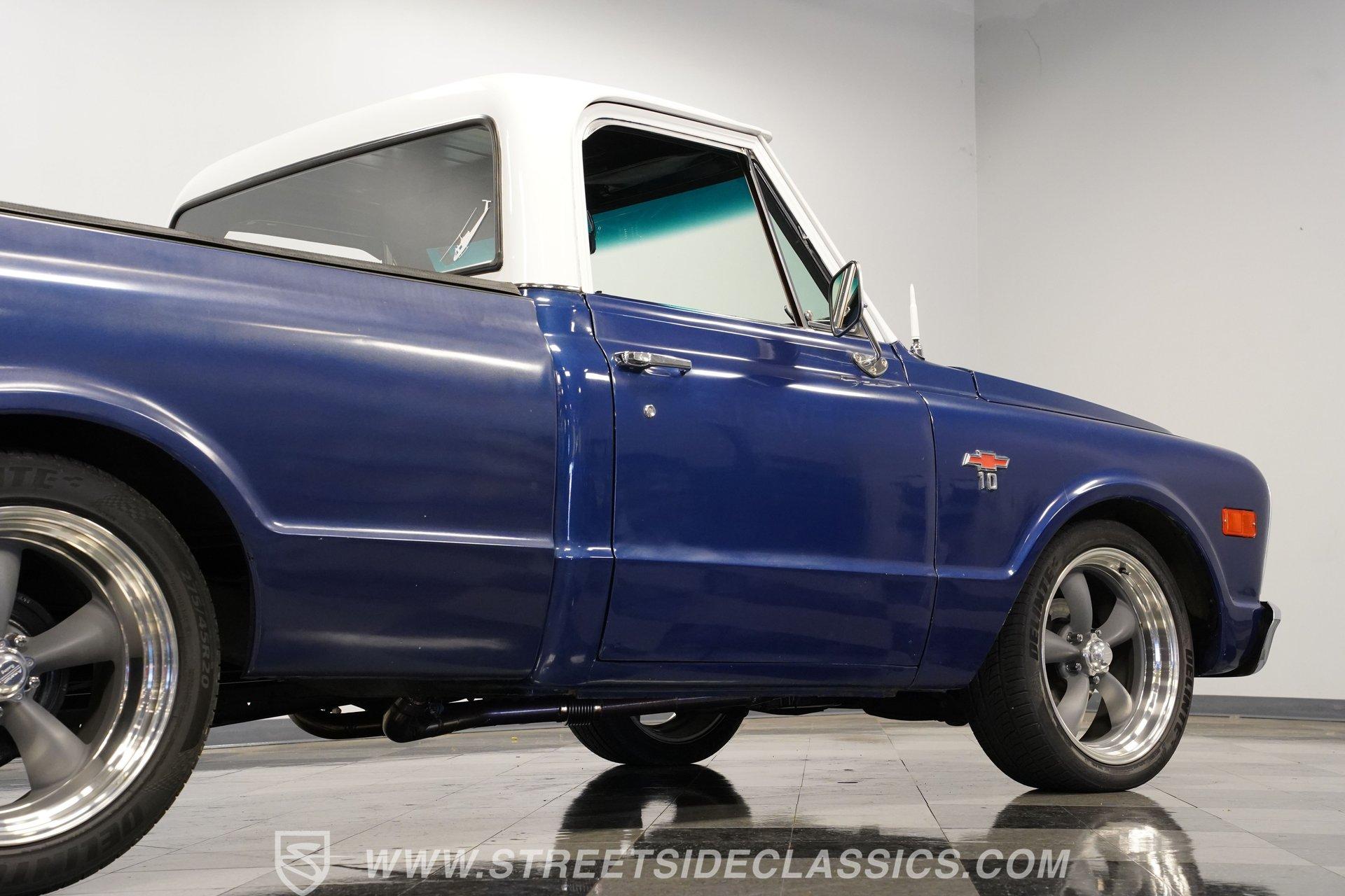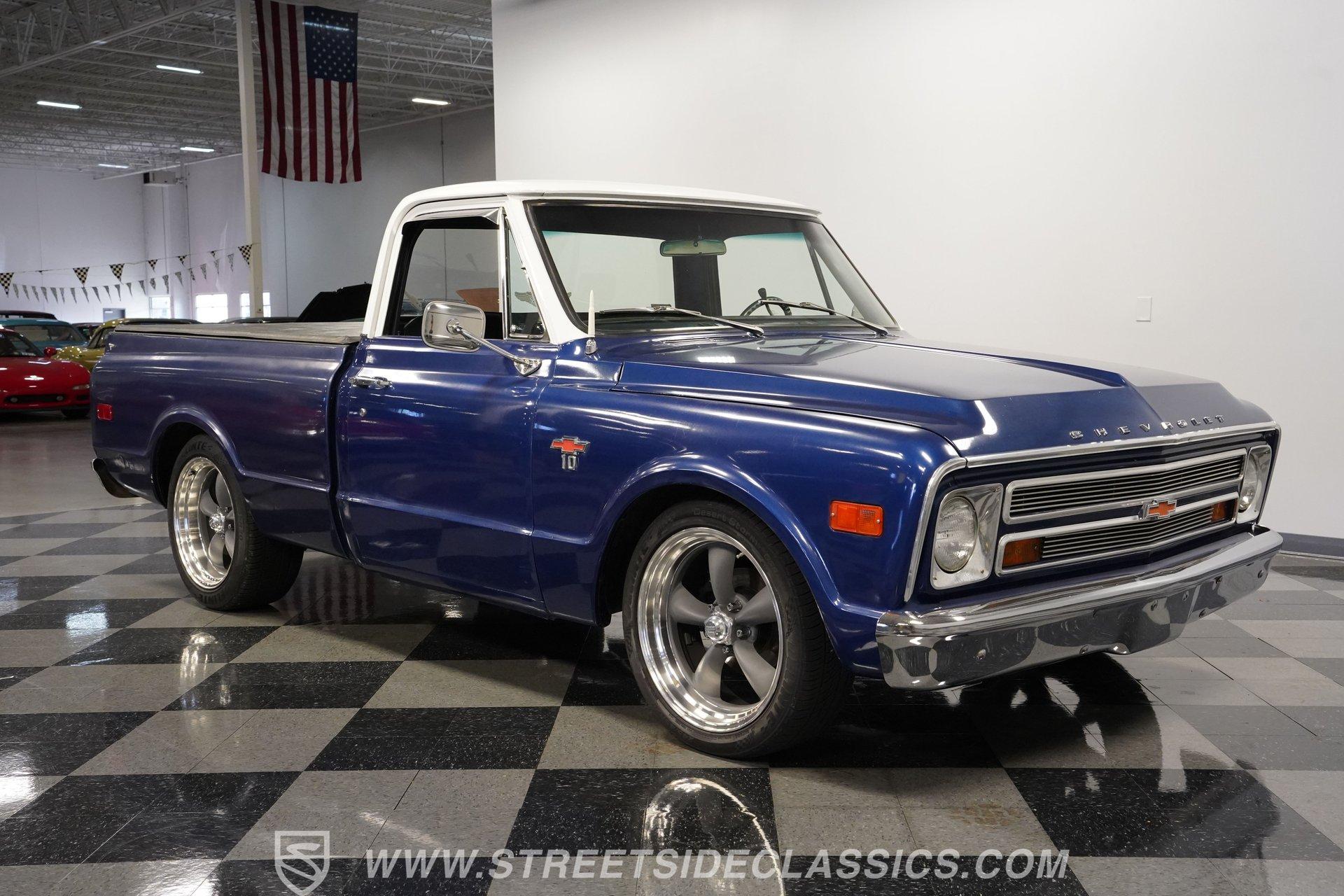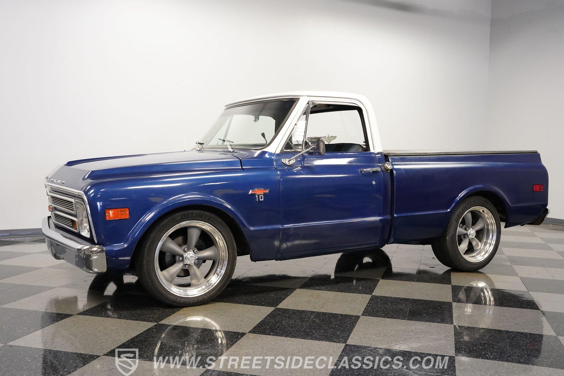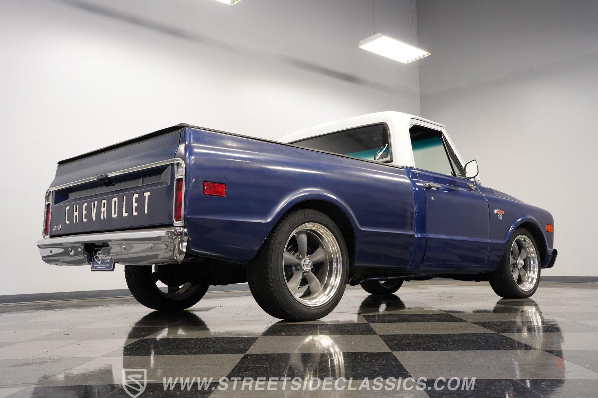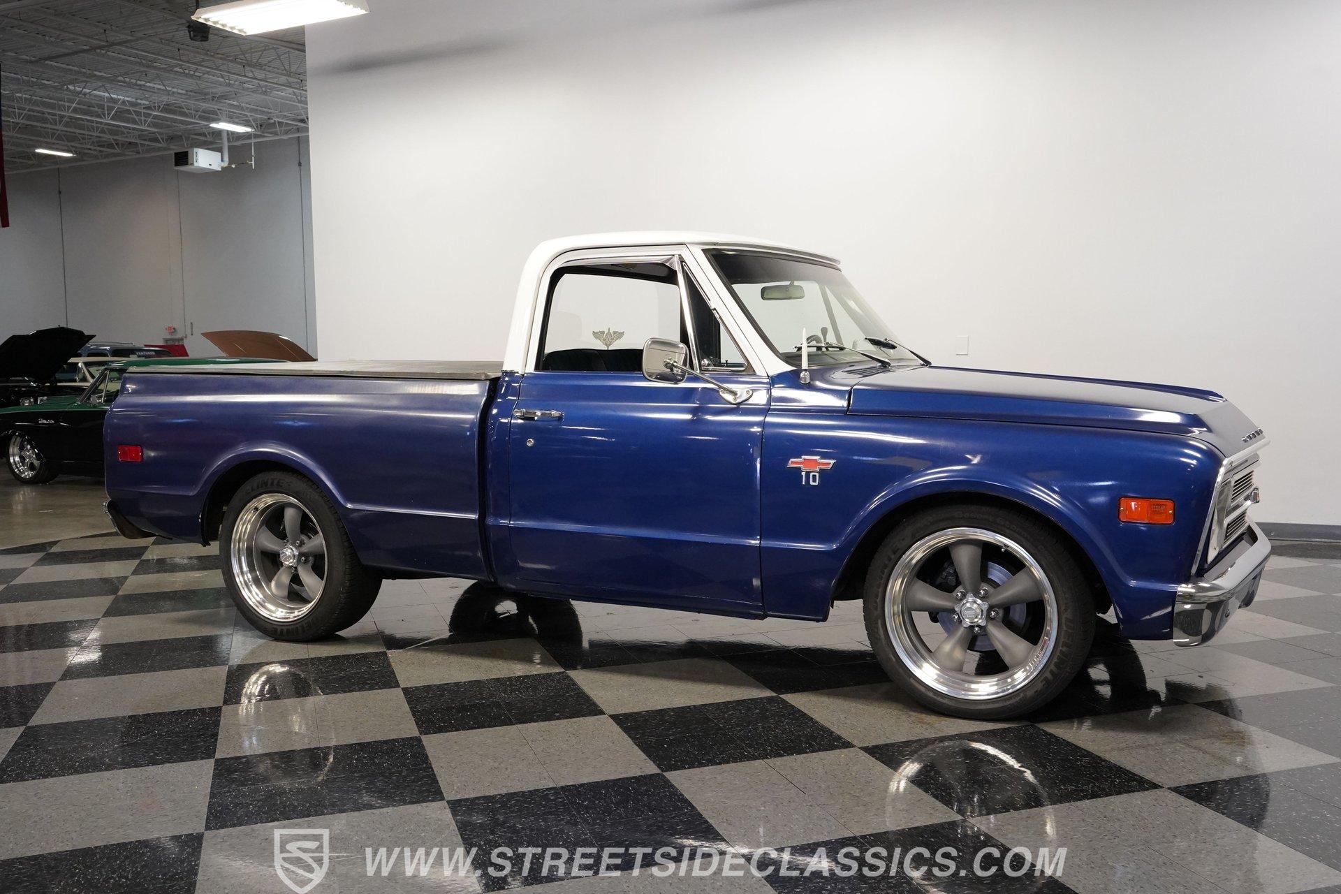 While most older trucks are put out to pasture after their tenure as ranch hands or construction laborers is over, a few occasionally get to experience a second life. Whether that be as a fully stock restoration or something more fun like this 1968 Chevrolet C10 LS1 Restomod, sometimes, just as in human life, retirement can be far more exciting. One look at its gorgeous blue-and-white motif and big 20-inch wheels mounted on low-profile rubber, and it's not hard to tell this truck is something special. Inside, we find a color-matched blue-and-black interior. An aftermarket center console separates the plush bench seating. A six-spoke power-assisted wheel sits just ahead of a Dakota Digital gauge cluster, while the upgraded Pioneer AM/FM/AUX head unit also offers Bluetooth connectivity and a bit more modern entertainment than its predecessor. The old-school HVAC levers remind you how far this truck has come over time, while the Vintage Air setup makes them operate more efficiently than ever before. Under the hood is where this truck turns from laid back to aggressive. A modern 5.7-liter LS1 V-8 sits comfortably in the clean and spacious engine bay. Professionally built by an HMS Race Team engineer and fabricator, this small block features a new BLK powder-coated billet front drive and serpentine belt, ceramic-coated shorty headers, and a new GM CPU. This LS1 does away with spent gases via a stainless-steel dual exhaust and Borla sweet-sounding mufflers. Power from that small block is then sent through a built 4L60E four-speed automatic transmission and a custom driveshaft before heading to the 3.08-geared 12-bolt rear end. HIGHLIGHTS: Professionally Rebuilt LS1V8 GM CPU Injectors and Plug Wires BLK Front Drive Serpentine Belt Ceramic Coated Shorty Headers Stainless Steel Exhaust Borla Mufflers Custom Overflow Tank LS Mounts and Crossmember Built 4L60E Four Speed Auto Custom Driveshaft 3.08 Geared Posi Rear Power Front Disc Brakes Power Steering Dakota Digital Gauges Vintage Air Pioneer AM/FM/AUX Head Unit Receipts This 1968 Chevrolet C10 LS1 Restomod rides on a set of 20-inch American Racing Torq Thrust wheels shod in Z-rated tires, while power brakes, featuring a pair of front discs, stand ready to scrub off speed whenever called upon. We may never know what this truck's first life was all about, but one thing is for sure: this resurrected version is definitely a lot more fun. The only thing it's missing is an owner to enjoy the ride. Call today!