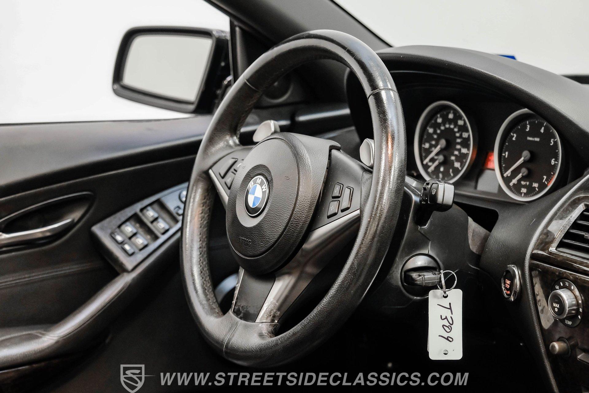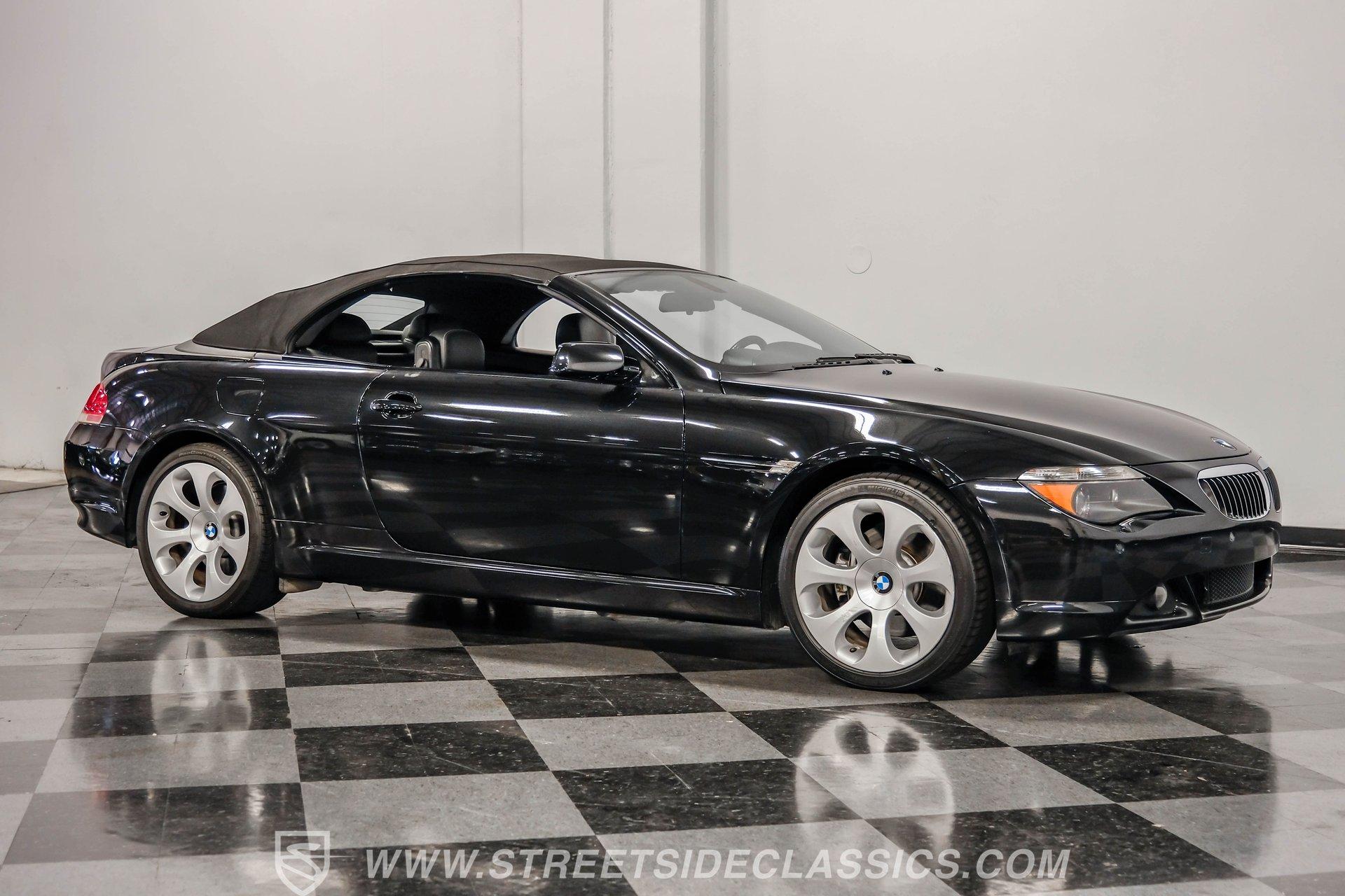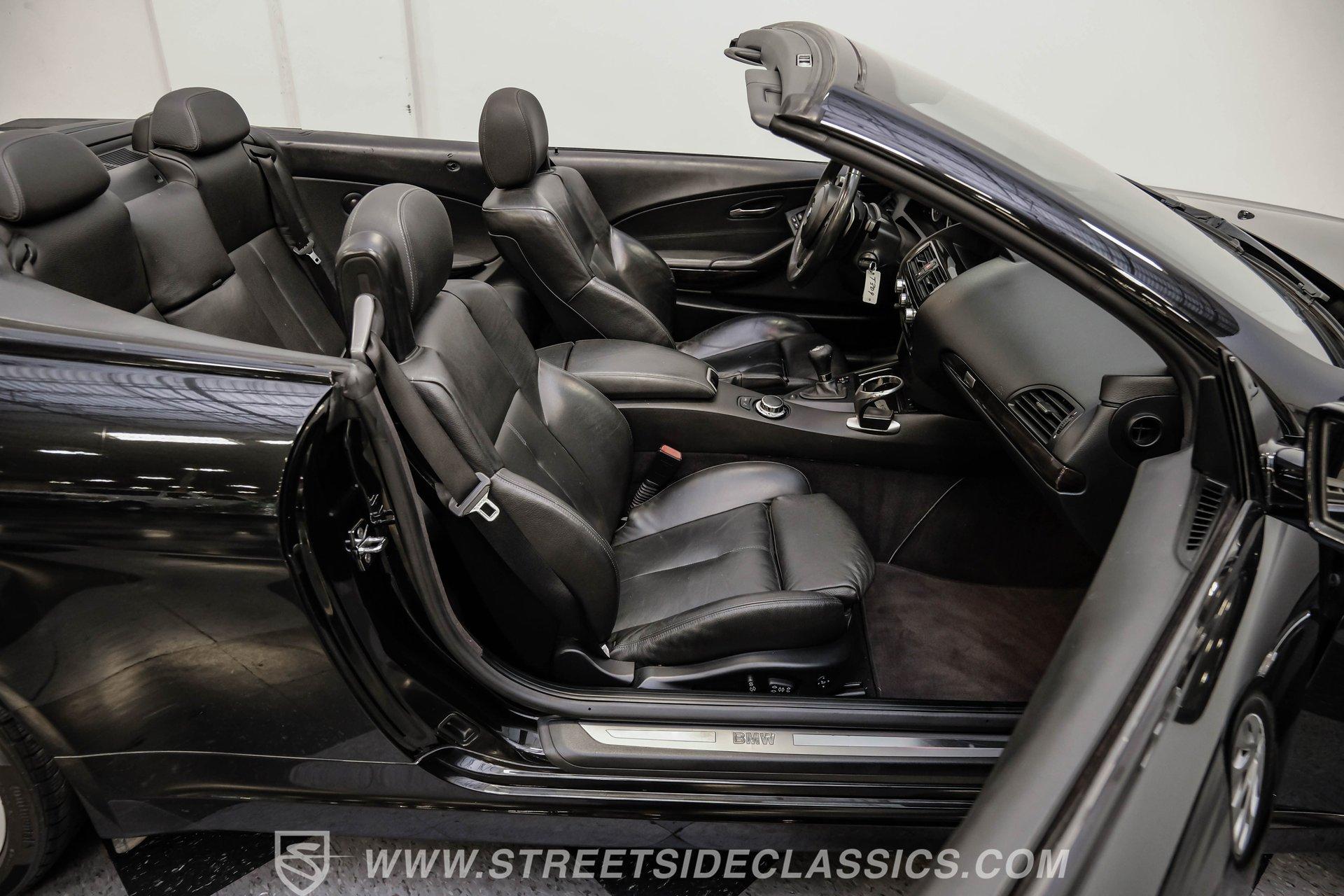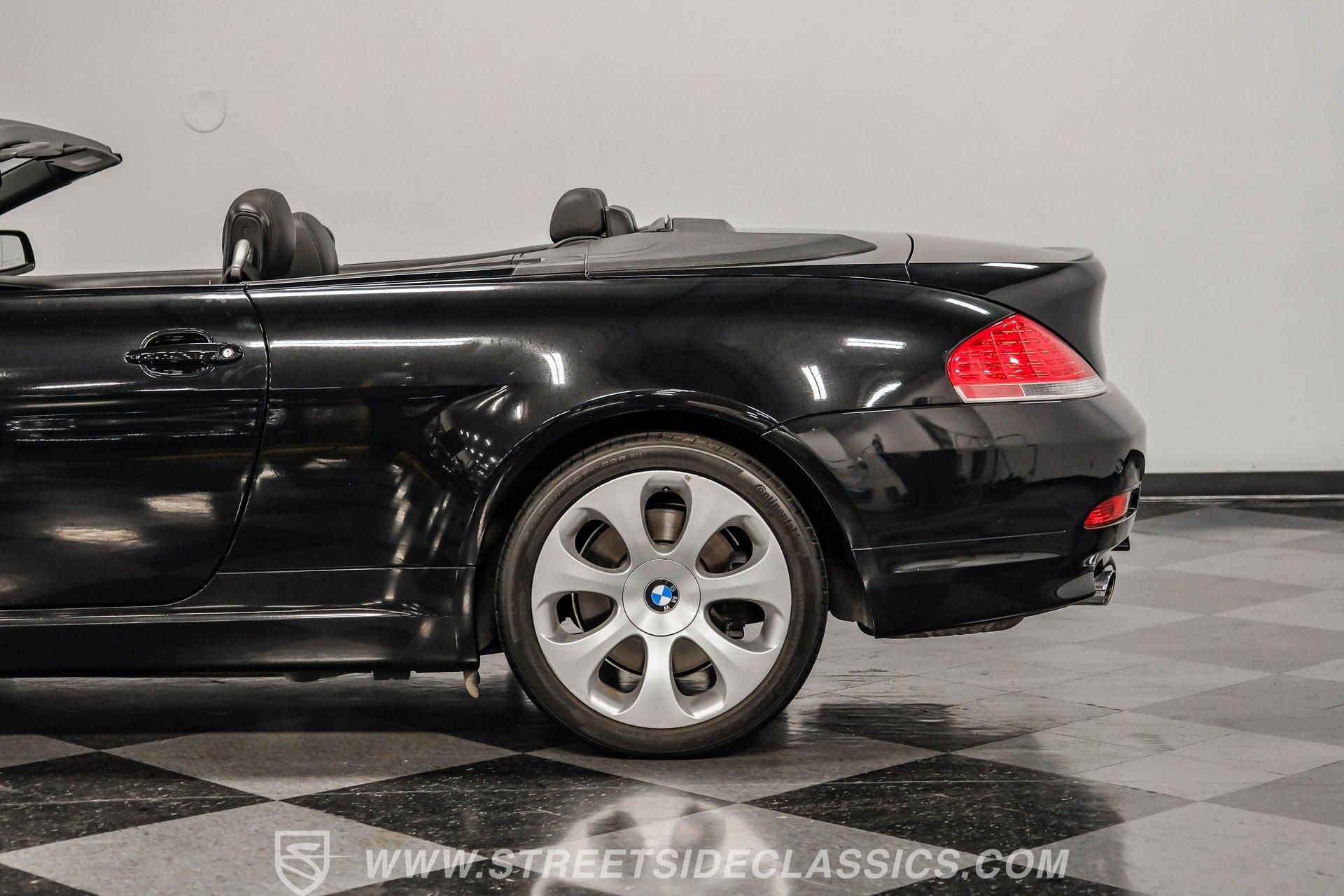 Sleek, sophisticated, and ready for the road, this 2006 BMW 650i Convertible shows off its Black Diamond metallic paint with understated elegance. German craftsmanship is evident in every curve and angle of this high-performance convertible. The black power-operated soft top gives you two cars in one – an open-air cruiser when down or a sleek coupe when up. Sitting on 19-inch alloy wheels, this BMW gives a planted, confident stance. The rubber meets the road with 245/40R19 Michelin tires up front and wider 275/35ZR19 Continental tires at the rear for optimal handling. Inside this BMW, black leather covers the supportive bucket seats that keep you planted during spirited driving. The driver-centric layout puts all controls at your fingertips, with the floor-mounted shifter and steering wheel paddle shifters offering multiple ways to control the transmission. The heads-up display projects speed and navigation information directly onto the windshield, keeping your eyes on the road. Dual-zone climate control maintains your ideal cabin temperature, while the power-adjustable heated seats offer personalized comfort for driver and passenger alike. Powering this 650i is a potent 4.8-liter V8 engine that generates strong acceleration and passing power. The 6-speed automatic transmission with SMG technology shifts smoothly in automatic mode or gives you direct control via the paddle shifters. This BMW's independent suspension system at all four corners absorbs bumps while keeping the car firmly planted in corners. When it's time to slow down, the four-wheel power disc brakes with anti-lock technology provide sure-footed stopping ability. The dual exhaust system produces a refined note that never overwhelms the luxury experience. HIGHLIGHTS: 4.8L V8 Engine 6-Speed Automatic Transmission with SMG Technology Independent Front and Rear Suspension Dual Exhaust System Black Diamond Metallic Paint Power Convertible Top 19" Alloy Wheels 245/40R19 Michelin Front, 275/35ZR19 Continental Rear Tires Black Leather Interior with Power Heated Bucket Seats Memory Seat Package Dual Zone Air Conditioning Paddle Shift AM/FM/XM Radio with CD Changer Heads-Up Display Navigation System Back-Up Camera Clean CarFax With just 81,456 miles on the odometer and a clean Carfax report, this 2006 BMW 650i Convertible combines V8 power, luxury appointments, and open-air enjoyment in one exceptional package. Call today!