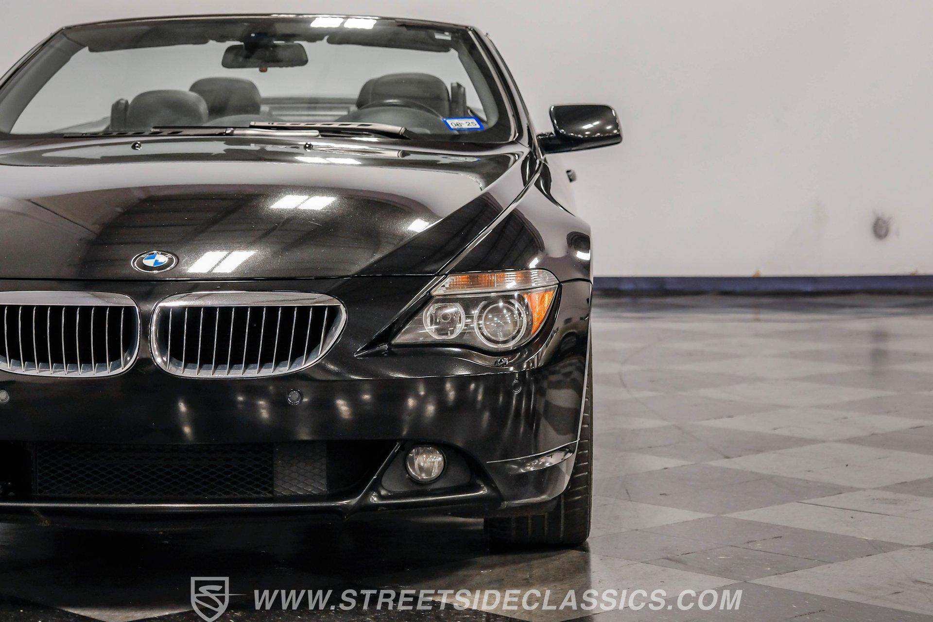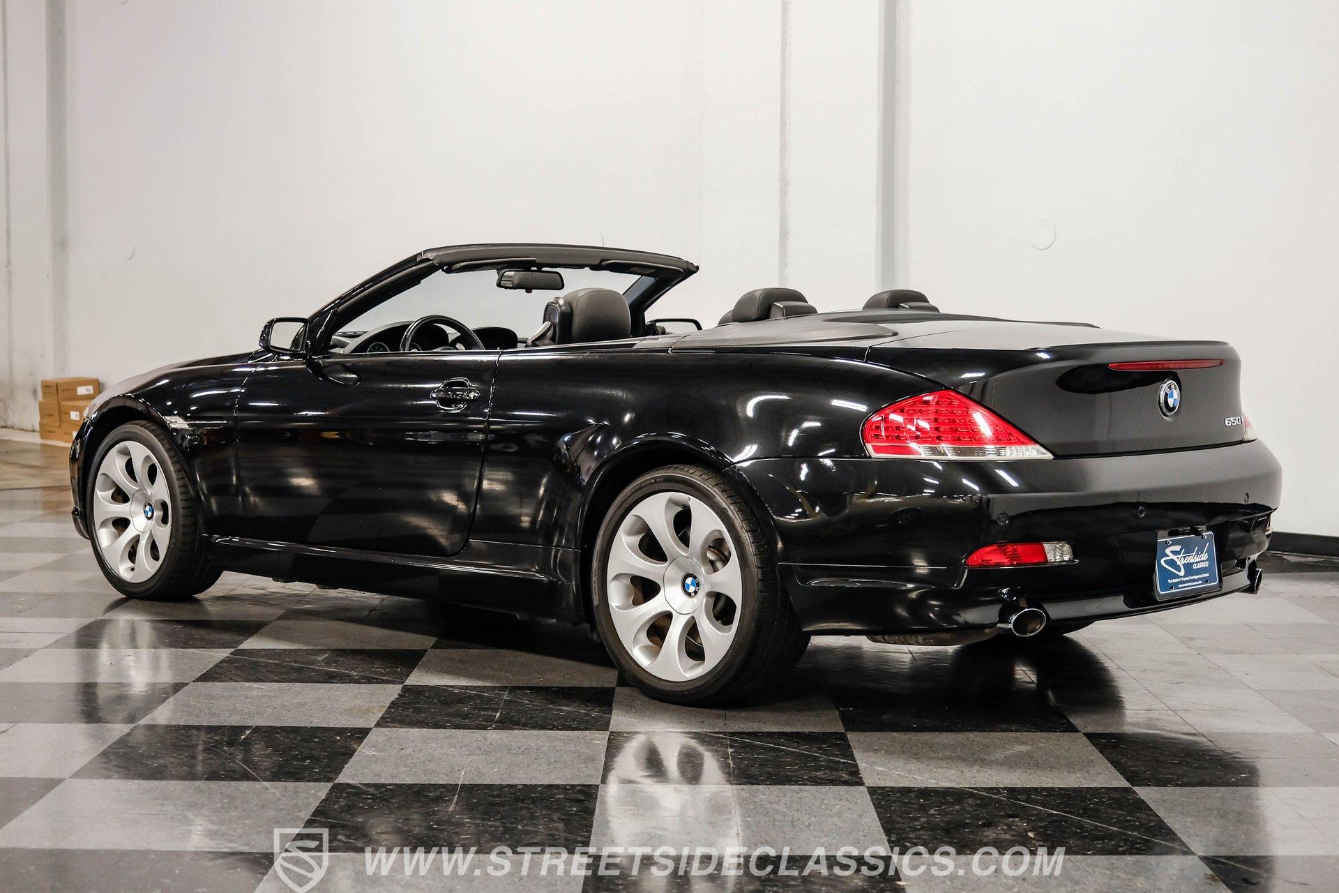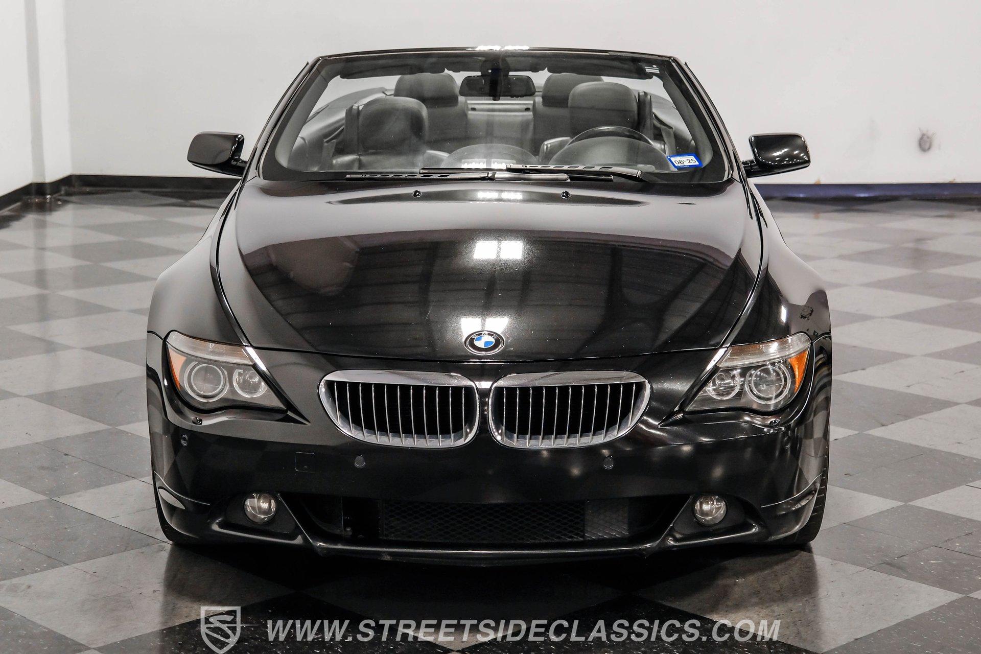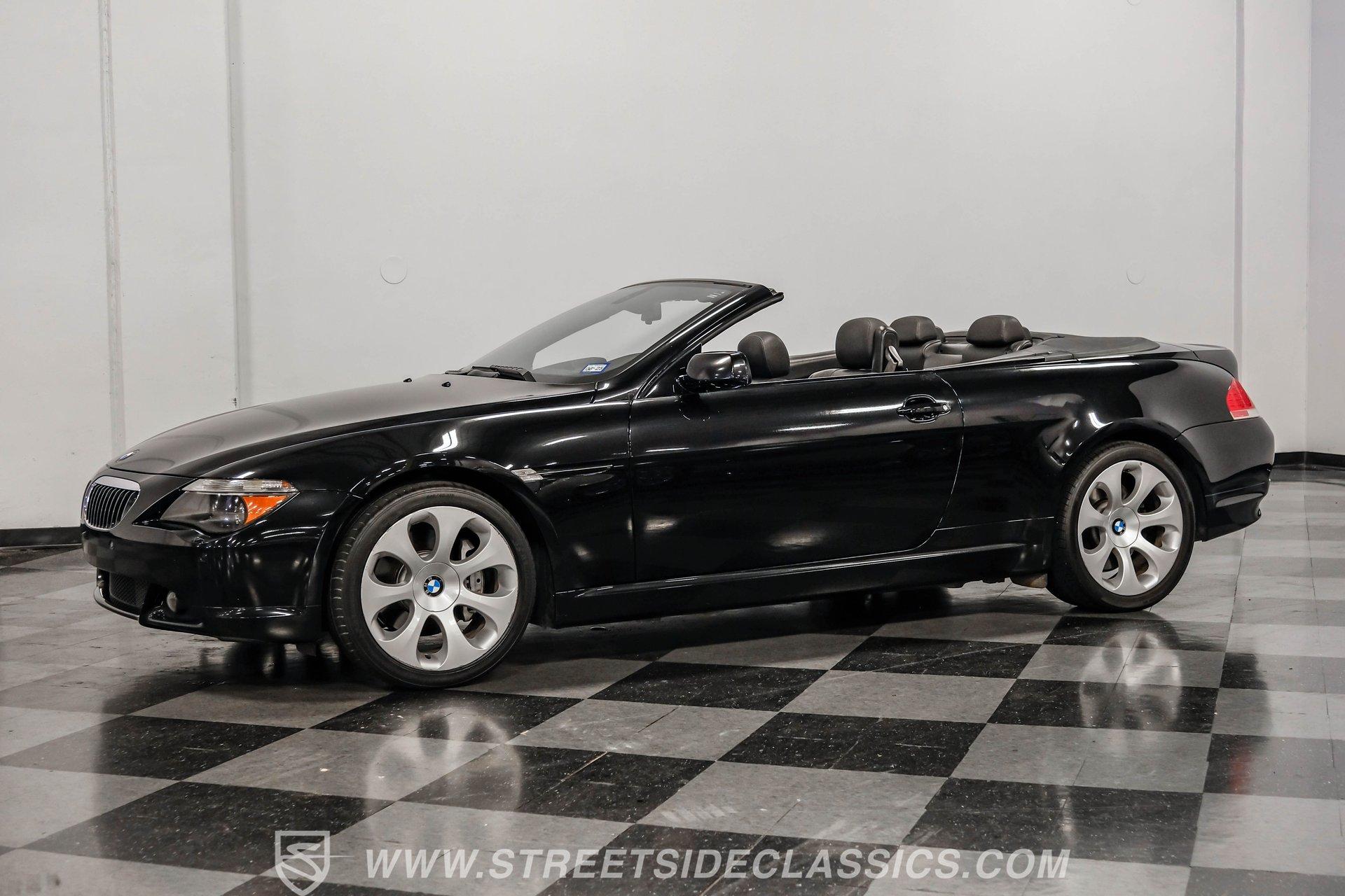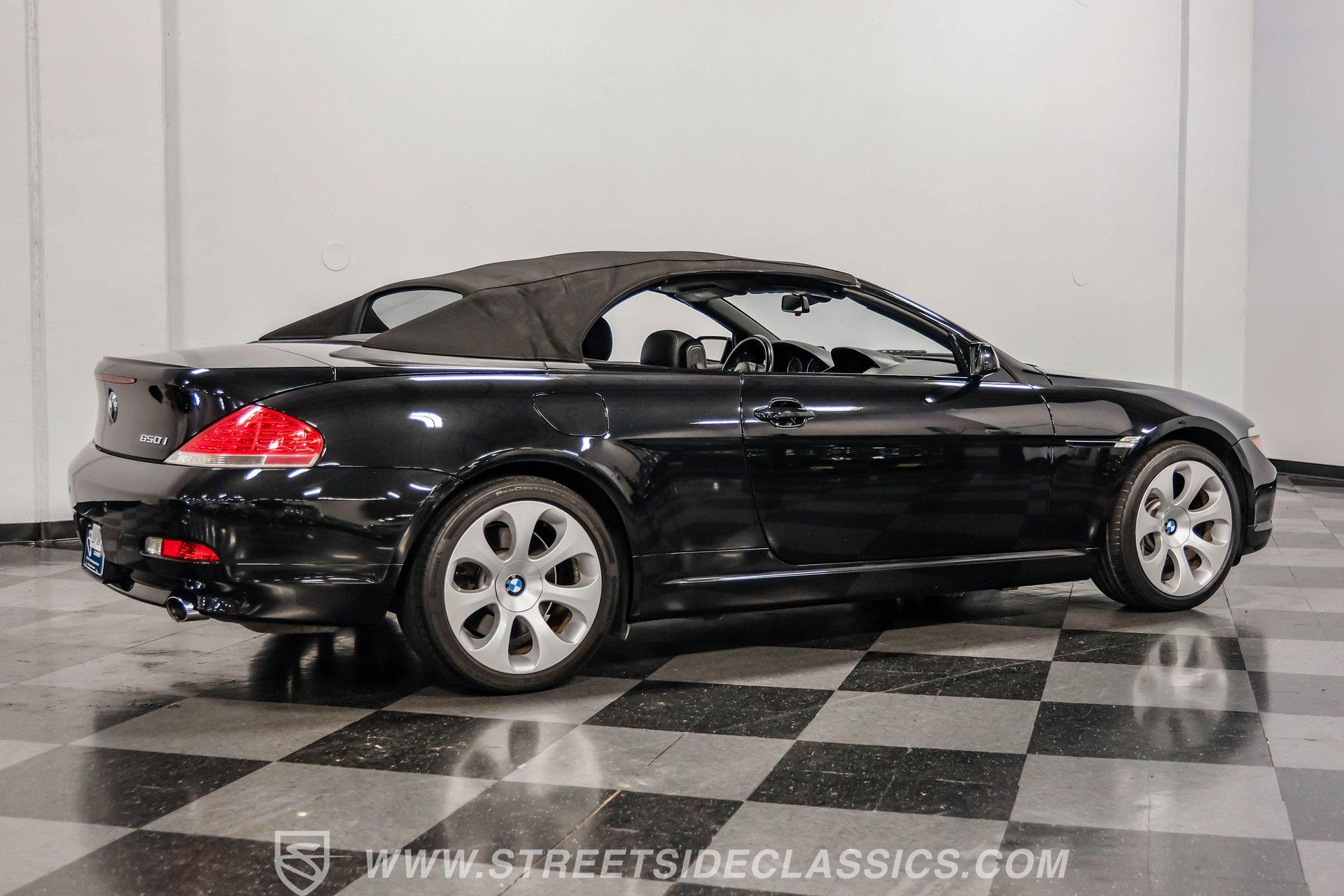 Sleek, sophisticated, and ready for the road, this 2006 BMW 650i Convertible shows off its Black Diamond metallic paint with understated elegance. German craftsmanship is evident in every curve and angle of this high-performance convertible. The black power-operated soft top gives you two cars in one – an open-air cruiser when down or a sleek coupe when up. Sitting on 19-inch alloy wheels, this BMW gives a planted, confident stance. The rubber meets the road with 245/40R19 Michelin tires up front and wider 275/35ZR19 Continental tires at the rear for optimal handling. Inside this BMW, black leather covers the supportive bucket seats that keep you planted during spirited driving. The driver-centric layout puts all controls at your fingertips, with the floor-mounted shifter and steering wheel paddle shifters offering multiple ways to control the transmission. The heads-up display projects speed and navigation information directly onto the windshield, keeping your eyes on the road. Dual-zone climate control maintains your ideal cabin temperature, while the power-adjustable heated seats offer personalized comfort for driver and passenger alike. Powering this 650i is a potent 4.8-liter V8 engine that generates strong acceleration and passing power. The 6-speed automatic transmission with SMG technology shifts smoothly in automatic mode or gives you direct control via the paddle shifters. This BMW's independent suspension system at all four corners absorbs bumps while keeping the car firmly planted in corners. When it's time to slow down, the four-wheel power disc brakes with anti-lock technology provide sure-footed stopping ability. The dual exhaust system produces a refined note that never overwhelms the luxury experience. HIGHLIGHTS: 4.8L V8 Engine 6-Speed Automatic Transmission with SMG Technology Independent Front and Rear Suspension Dual Exhaust System Black Diamond Metallic Paint Power Convertible Top 19" Alloy Wheels 245/40R19 Michelin Front, 275/35ZR19 Continental Rear Tires Black Leather Interior with Power Heated Bucket Seats Memory Seat Package Dual Zone Air Conditioning Paddle Shift AM/FM/XM Radio with CD Changer Heads-Up Display Navigation System Back-Up Camera Clean CarFax With just 81,456 miles on the odometer and a clean Carfax report, this 2006 BMW 650i Convertible combines V8 power, luxury appointments, and open-air enjoyment in one exceptional package. Call today!