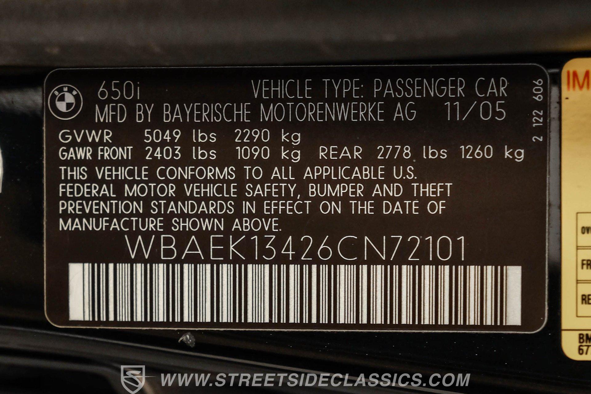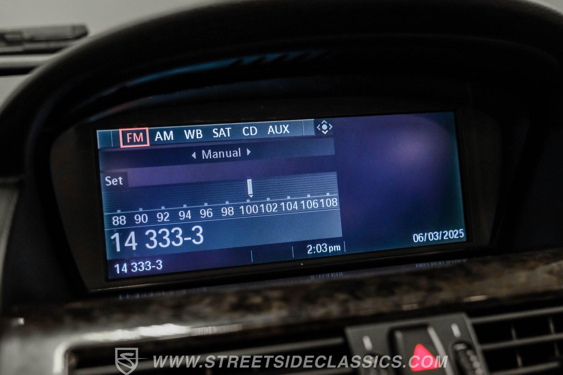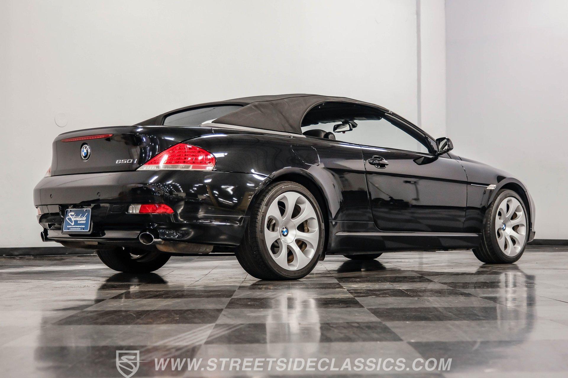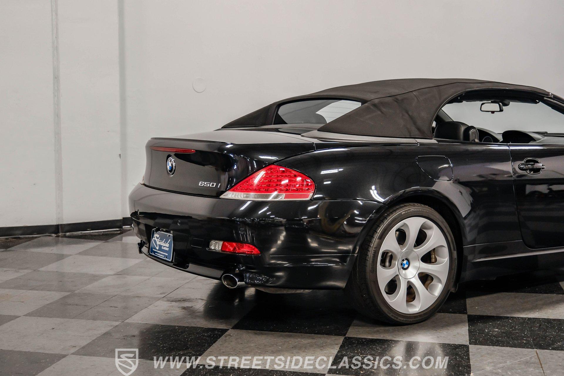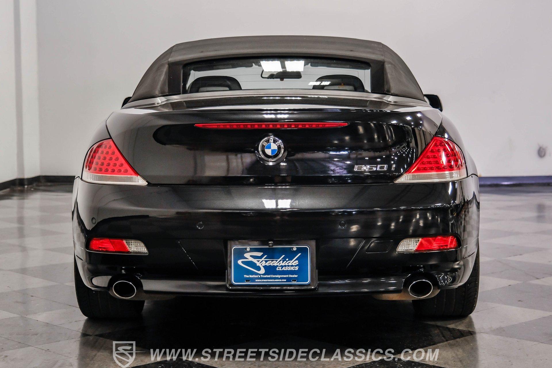 Sleek, sophisticated, and ready for the road, this 2006 BMW 650i Convertible shows off its Black Diamond metallic paint with understated elegance. German craftsmanship is evident in every curve and angle of this high-performance convertible. The black power-operated soft top gives you two cars in one – an open-air cruiser when down or a sleek coupe when up. Sitting on 19-inch alloy wheels, this BMW gives a planted, confident stance. The rubber meets the road with 245/40R19 Michelin tires up front and wider 275/35ZR19 Continental tires at the rear for optimal handling. Inside this BMW, black leather covers the supportive bucket seats that keep you planted during spirited driving. The driver-centric layout puts all controls at your fingertips, with the floor-mounted shifter and steering wheel paddle shifters offering multiple ways to control the transmission. The heads-up display projects speed and navigation information directly onto the windshield, keeping your eyes on the road. Dual-zone climate control maintains your ideal cabin temperature, while the power-adjustable heated seats offer personalized comfort for driver and passenger alike. Powering this 650i is a potent 4.8-liter V8 engine that generates strong acceleration and passing power. The 6-speed automatic transmission with SMG technology shifts smoothly in automatic mode or gives you direct control via the paddle shifters. This BMW's independent suspension system at all four corners absorbs bumps while keeping the car firmly planted in corners. When it's time to slow down, the four-wheel power disc brakes with anti-lock technology provide sure-footed stopping ability. The dual exhaust system produces a refined note that never overwhelms the luxury experience. HIGHLIGHTS: 4.8L V8 Engine 6-Speed Automatic Transmission with SMG Technology Independent Front and Rear Suspension Dual Exhaust System Black Diamond Metallic Paint Power Convertible Top 19" Alloy Wheels 245/40R19 Michelin Front, 275/35ZR19 Continental Rear Tires Black Leather Interior with Power Heated Bucket Seats Memory Seat Package Dual Zone Air Conditioning Paddle Shift AM/FM/XM Radio with CD Changer Heads-Up Display Navigation System Back-Up Camera Clean CarFax With just 81,456 miles on the odometer and a clean Carfax report, this 2006 BMW 650i Convertible combines V8 power, luxury appointments, and open-air enjoyment in one exceptional package. Call today!