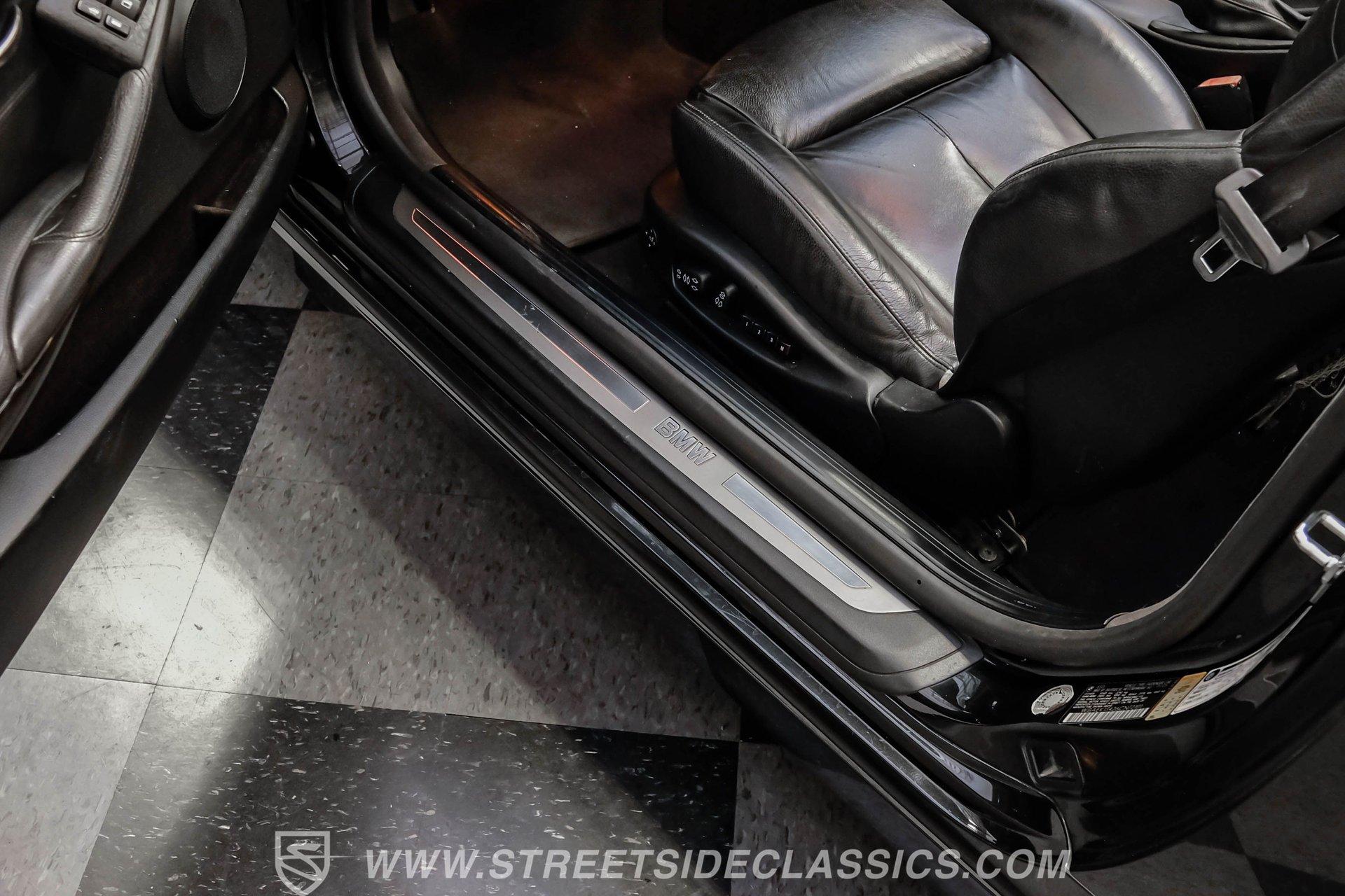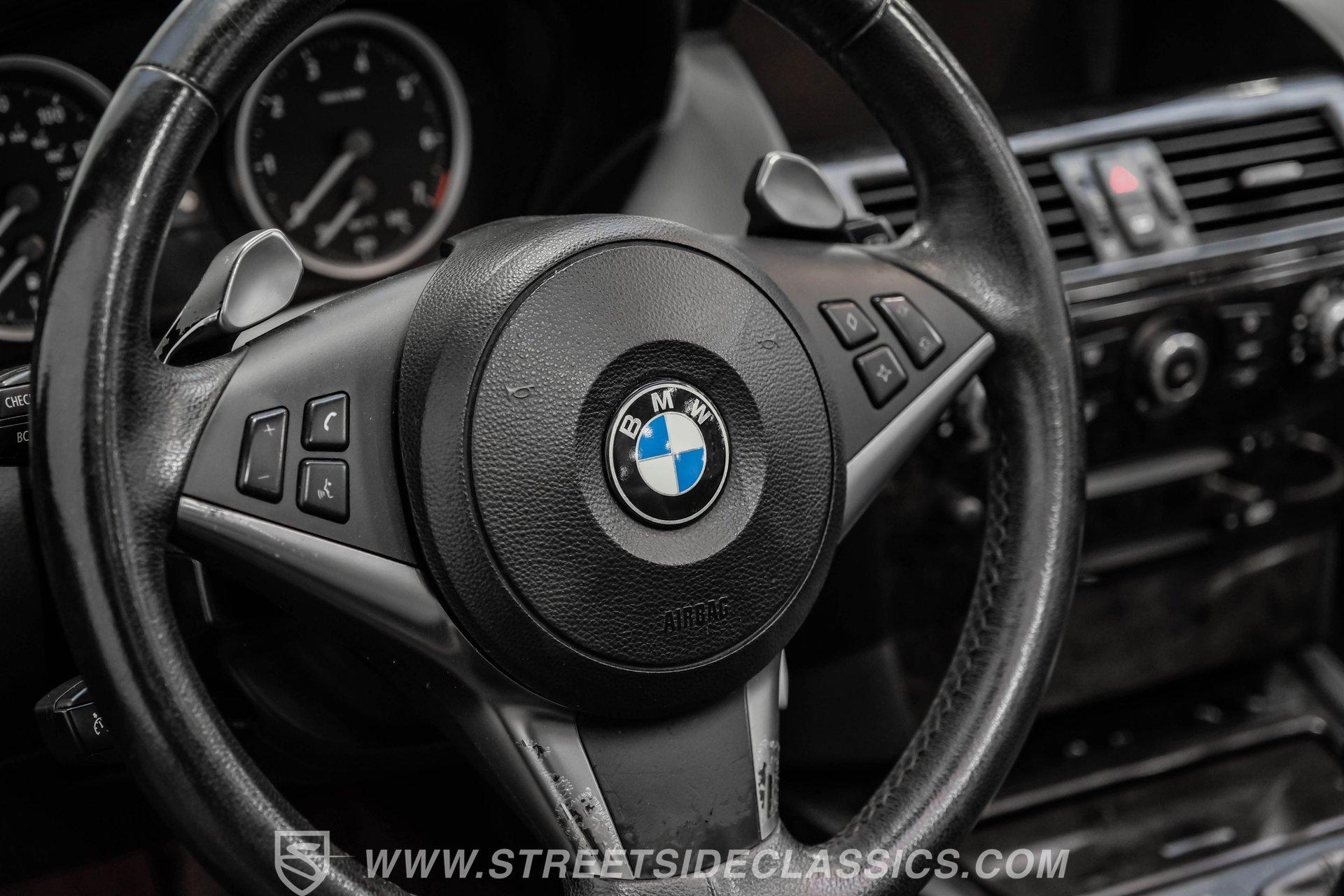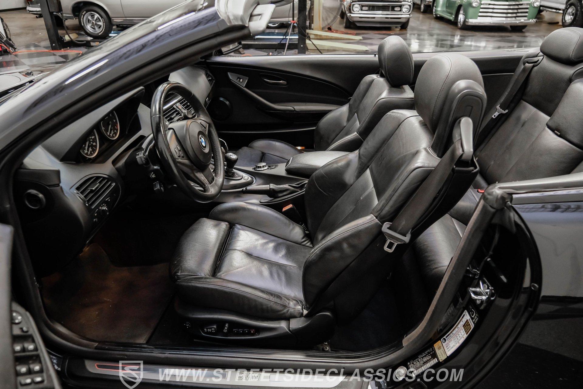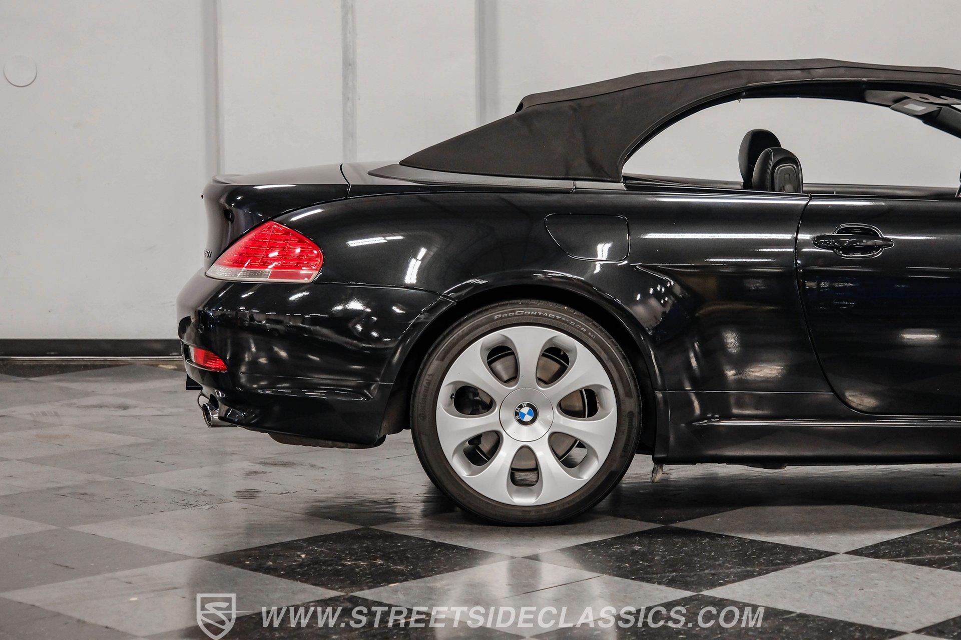 Sleek, sophisticated, and ready for the road, this 2006 BMW 650i Convertible shows off its Black Diamond metallic paint with understated elegance. German craftsmanship is evident in every curve and angle of this high-performance convertible. The black power-operated soft top gives you two cars in one – an open-air cruiser when down or a sleek coupe when up. Sitting on 19-inch alloy wheels, this BMW gives a planted, confident stance. The rubber meets the road with 245/40R19 Michelin tires up front and wider 275/35ZR19 Continental tires at the rear for optimal handling. Inside this BMW, black leather covers the supportive bucket seats that keep you planted during spirited driving. The driver-centric layout puts all controls at your fingertips, with the floor-mounted shifter and steering wheel paddle shifters offering multiple ways to control the transmission. The heads-up display projects speed and navigation information directly onto the windshield, keeping your eyes on the road. Dual-zone climate control maintains your ideal cabin temperature, while the power-adjustable heated seats offer personalized comfort for driver and passenger alike. Powering this 650i is a potent 4.8-liter V8 engine that generates strong acceleration and passing power. The 6-speed automatic transmission with SMG technology shifts smoothly in automatic mode or gives you direct control via the paddle shifters. This BMW's independent suspension system at all four corners absorbs bumps while keeping the car firmly planted in corners. When it's time to slow down, the four-wheel power disc brakes with anti-lock technology provide sure-footed stopping ability. The dual exhaust system produces a refined note that never overwhelms the luxury experience. HIGHLIGHTS: 4.8L V8 Engine 6-Speed Automatic Transmission with SMG Technology Independent Front and Rear Suspension Dual Exhaust System Black Diamond Metallic Paint Power Convertible Top 19" Alloy Wheels 245/40R19 Michelin Front, 275/35ZR19 Continental Rear Tires Black Leather Interior with Power Heated Bucket Seats Memory Seat Package Dual Zone Air Conditioning Paddle Shift AM/FM/XM Radio with CD Changer Heads-Up Display Navigation System Back-Up Camera Clean CarFax With just 81,456 miles on the odometer and a clean Carfax report, this 2006 BMW 650i Convertible combines V8 power, luxury appointments, and open-air enjoyment in one exceptional package. Call today!