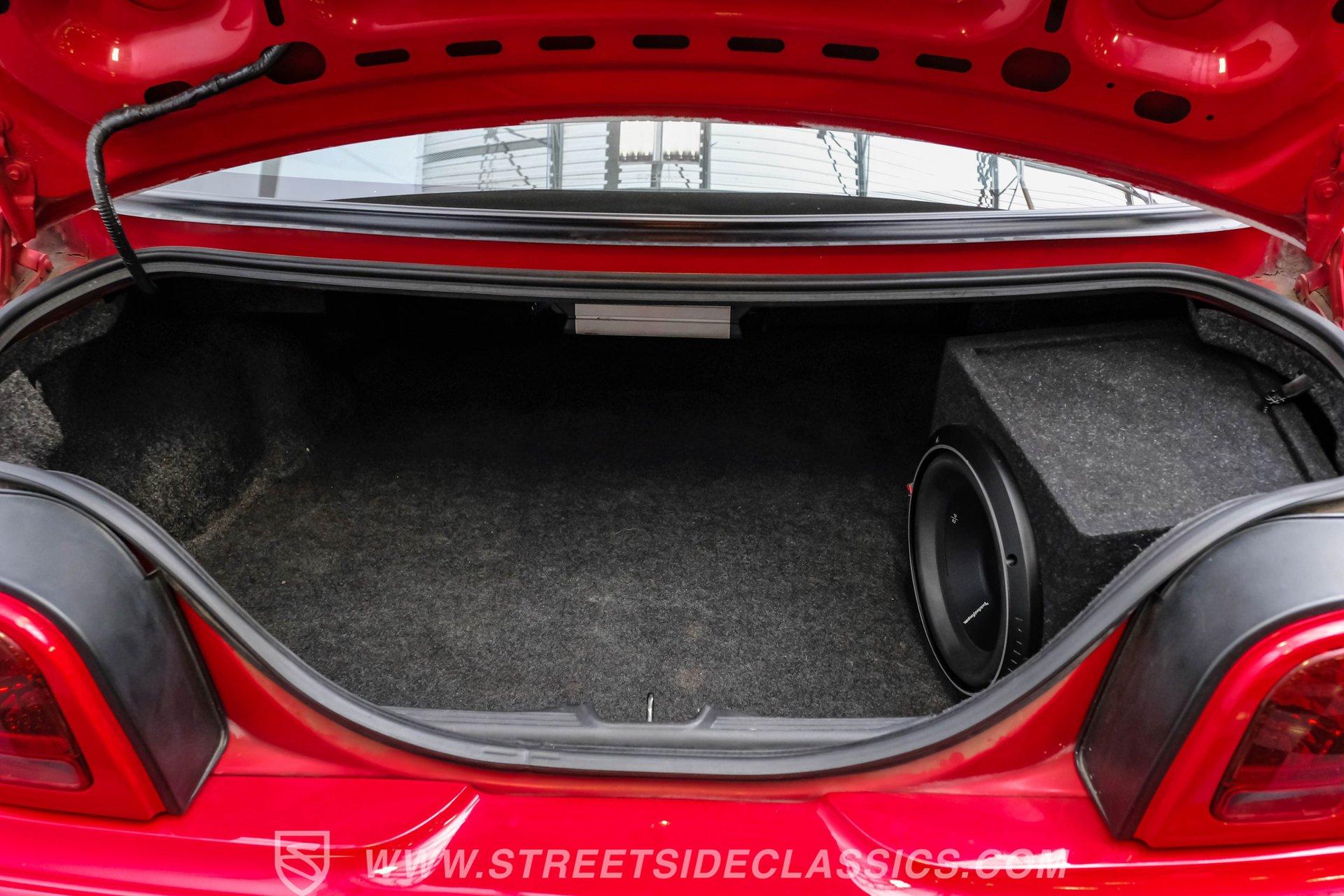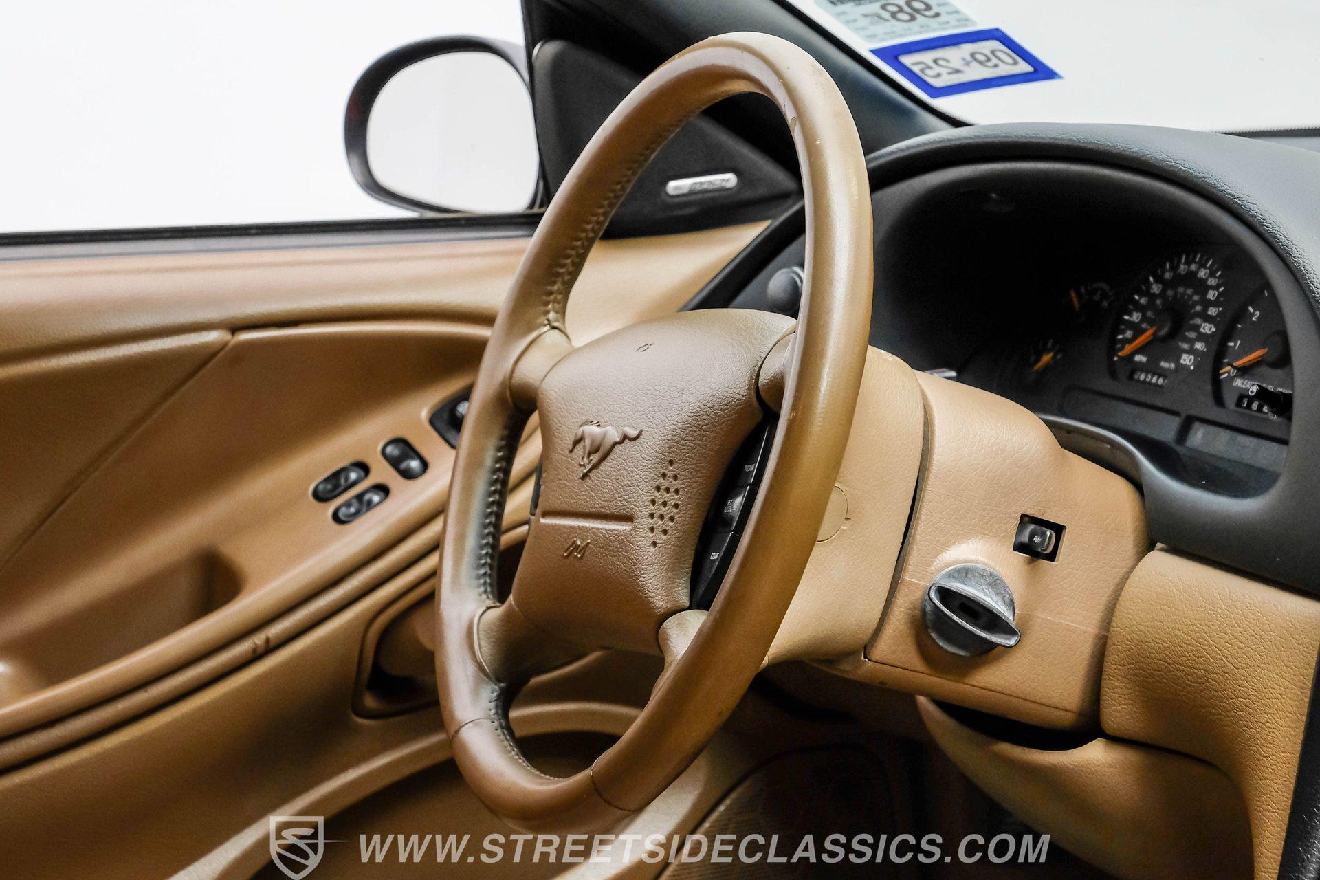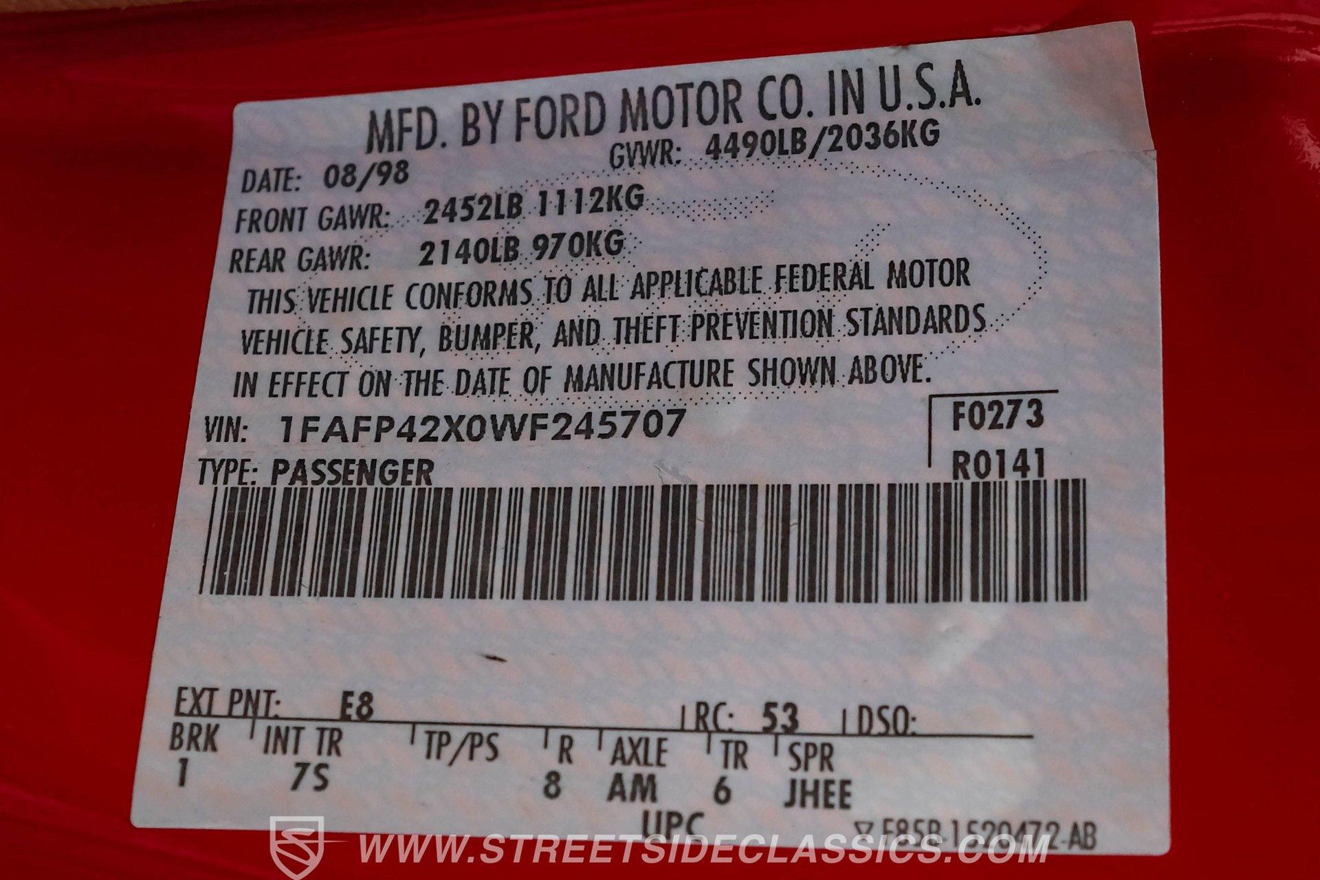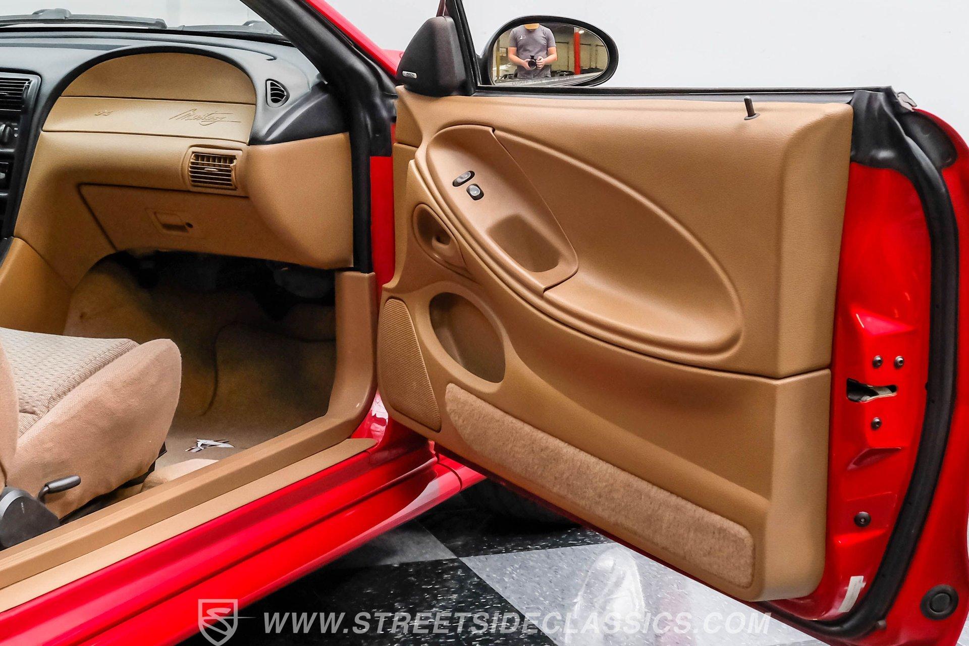This 1998 Ford Mustang GT in Rio Red is a showstopper. Its bold color, makes this Mustang stand out from the crowd. The 17-inch wheels wrapped in 245/45R17 tires not only enhance its appearance but also promise a gripping drive. The aggressive stance and sleek lines of this coupe hint at the power beneath its stylish exterior. The paint is in great shape, accentuating the Mustang's timeless design. Inside, the Mustang's Tan cloth interior offers a blend of comfort and sportiness with bucket seats that are both supportive and stylish. Power features abound, including driver's seat, windows, mirrors and locks, making every drive a convenient pleasure. The dash and headliner are in excellent condition, maintaining the car's well-kept appearance. Tunes come courtesy of an upgraded Sony AM/FM/CD/Bluetooth stereo, providing quality sound for every journey. Powering this Mustang is a 4.6-liter V8 engine with just about 85,800 actual miles paired with a 5-speed manual transmission. The engine bay is factory-clean, reflecting the car's meticulous maintenance. Power steering and power 4-wheel disc brakes ensure confident handling and stopping power. The dual exhaust with Flowmasters adds a throaty note to the driving experience, making each ride an exhilarating one. The rear 3.27 Limited Slip differential further enhances performance, ensuring traction and control. HIGHLIGHTS: 4.6 Liter V8 Engine 5 Speed Manual Transmission Power Steering Power 4-Wheel Disc Brakes Dual Exhaust 3.27 Limited Slip Rear Differential Rio Red Paint Flowmaster Mufflers 17" Wheels in 245/45R17 Tires Tan Interior Bucket Seats Power Seats Power Windows Power Locks Sony AM/FM/CD/Bluetooth Stereo With only about 85k miles on the odometer, this 1998 Ford Mustang GT is a true gem. Its powerful 4.6L V8 engine, luxurious interior, and eye-catching Rio Red exterior make it a car that's sure to turn heads wherever it goes. Call today!