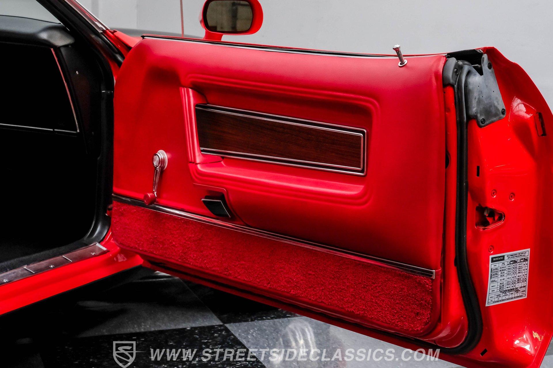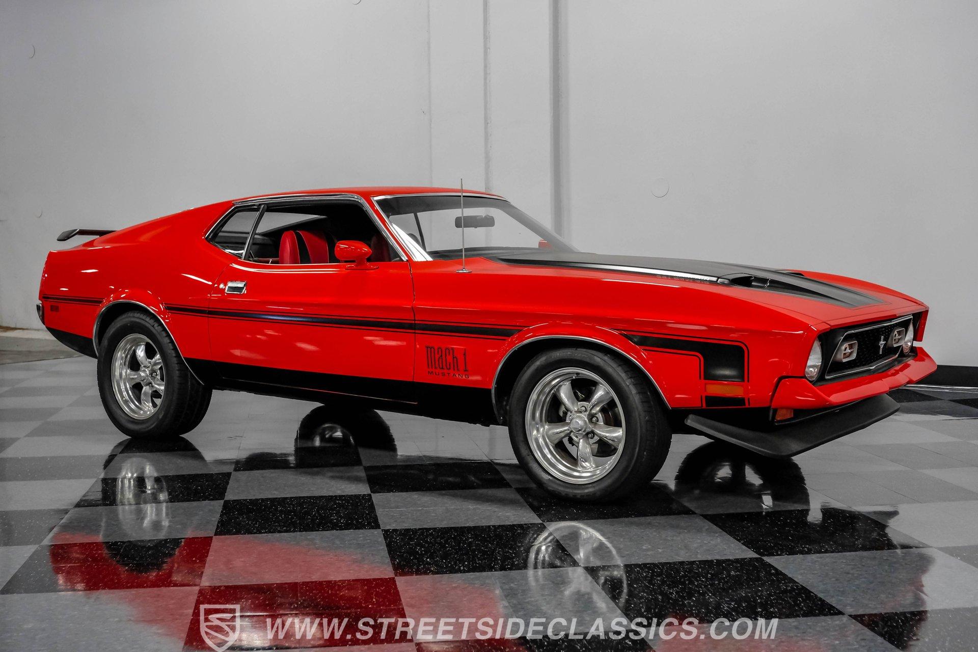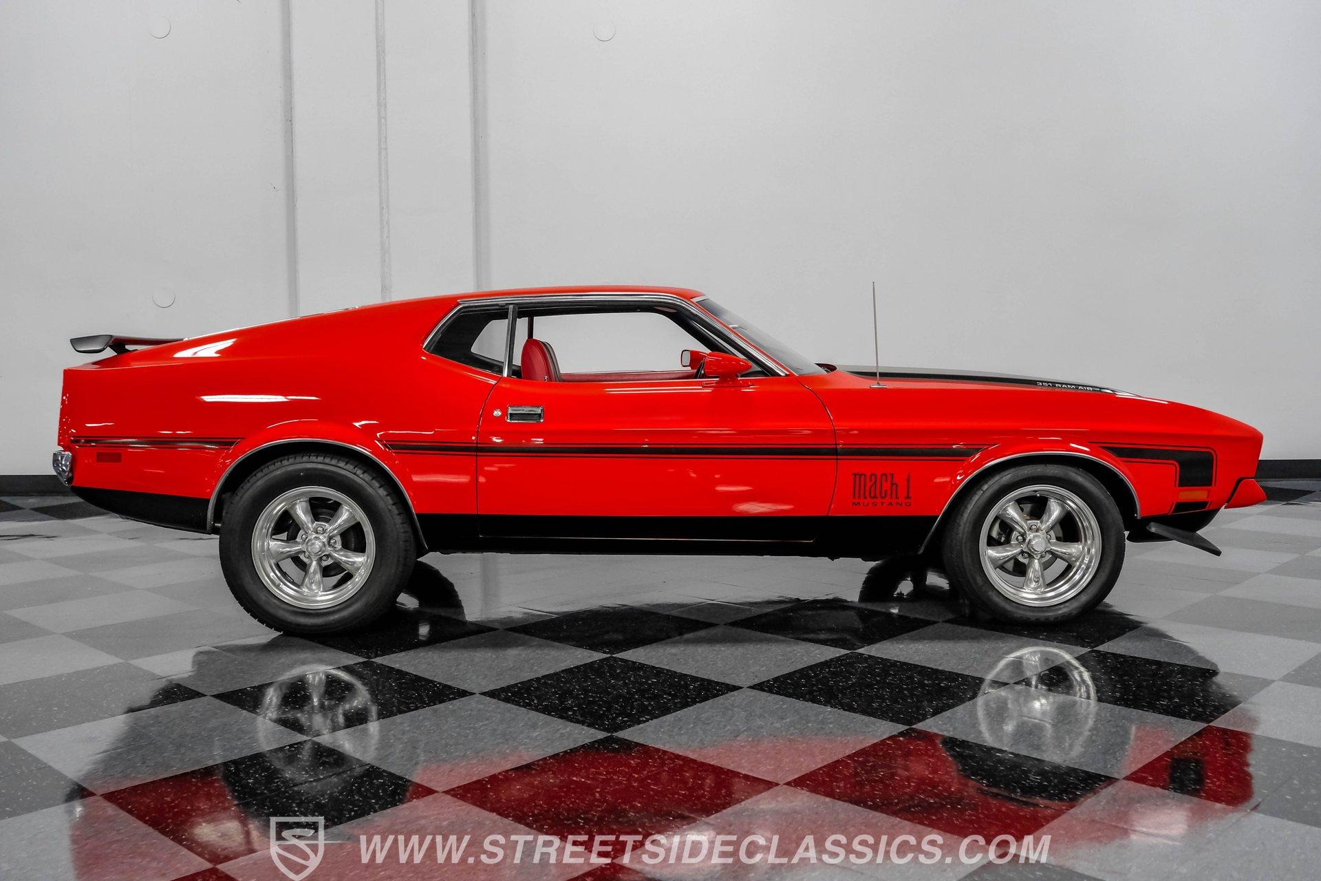 The 1971 Ford Mustang Mach 1 is an icon of American muscle-bold, powerful, and timeless. This fully restored classic features a Calypso Coral repaint, black stripes, front and rear spoilers, a functional ram air hood, and chrome accents. Built for enthusiasts who value heritage and performance, it's ready for its next chapter on the open road. Step inside and you are greeted by a factory-style interior that blends vintage charm with tasteful upgrades. Red and black vinyl bucket seats provide classic comfort and eye-catching appeal, while matching door panels and a wood grain steering wheel complete the authentic look. The center console houses the factory shifter, and the dash features original gauges, all complemented by a RetroSounds AM/FM/Aux/BT radio for modern connectivity. Under the hood sits a period-correct 351 Cleveland V8, enhanced with a mild performance cam and an Edelbrock 4-barrel carburetor for a robust driving experience. The engine bay is very detailed, and the engine starts up with ease, idling smoothly and offering impressive acceleration. Paired with a C6 3-speed automatic transmission and Ford 8" rear axle, this Mach 1 delivers both reliability and excitement. Power disc brakes in the front and power steering ensure confident handling and control. HIGHLIGHTS: Restored Approx. 3 yrs Ago, Same Family Owners Last 46 Years 351 Cleveland V8 With Mild Cam Edelbrock 4-Barrel Carburetor C6 3-Speed Automatic Transmission Ford 8-Inch Rear Axle Power Disc Front Brakes Power Steering American Racing 17-Inch Wheels Professional Repaint in Calypso Coral Factory Style Red and Black Vinyl Interior RetroSounds AM/FM/Aux/BT Radio Aftermarket Air Conditioning (Needs servicing) Functional Ram Air Hood Financing Available Vehicle Protection Plans Available Worldwide Shipping This 1971 Ford Mustang Mach 1 stands as a testament to expert restoration and classic American muscle. With its striking presentation, period-correct upgrades, and show-quality finish, it is ready to create new memories with its next owner. Call, email, or come visit our showroom today!