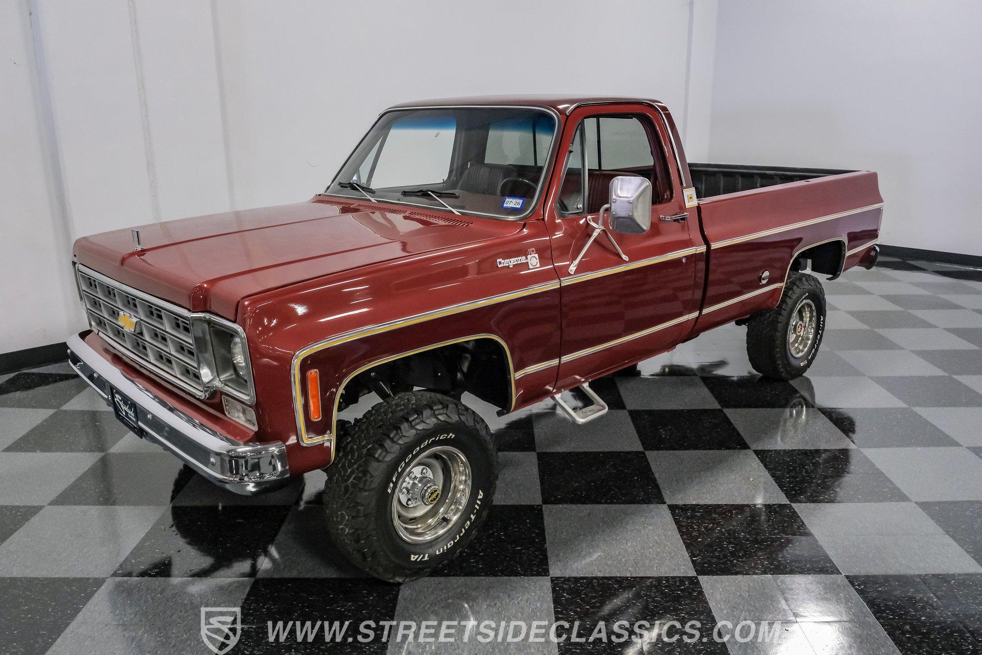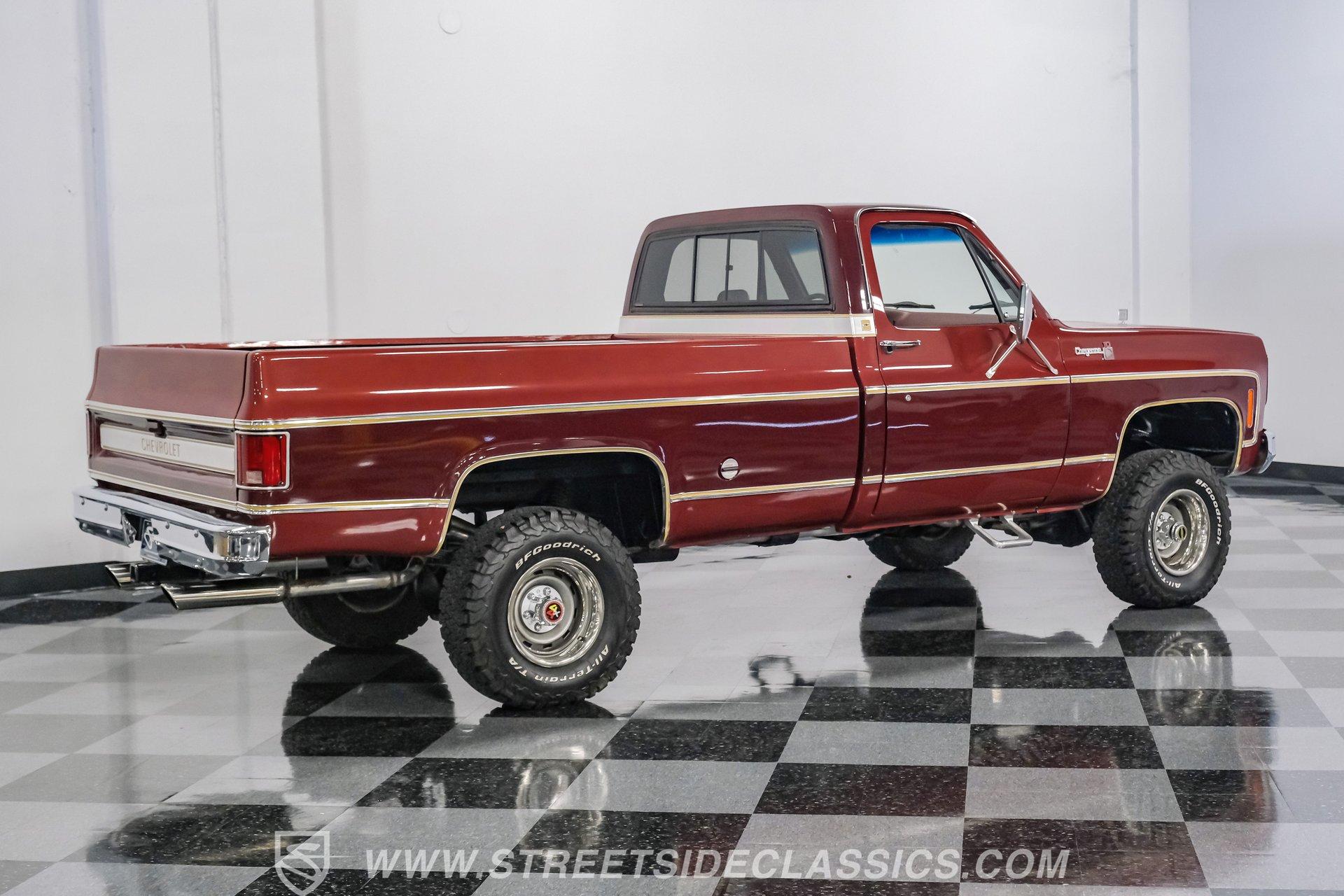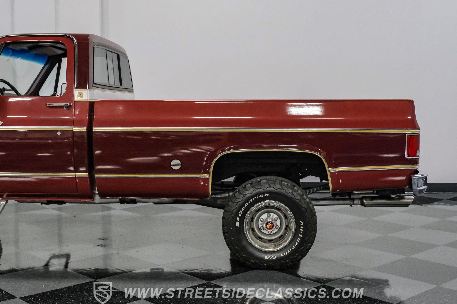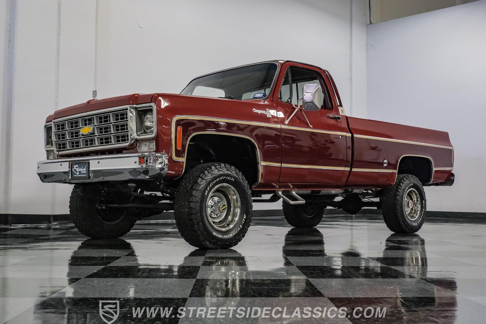 A classic truck brings back simpler times and the promise of adventure. The 1977 Chevrolet K10 Cheyenne 4x4 is more than transportation-it's a rugged American icon. With a full two-tone Red and Burgundy repaint, chrome bumpers, factory grille, Rhino-lined bed, and receiver hitch, this restored legend is ready for the road. Step inside and discover a thoughtfully restored red interior that blends vintage charm with modern comfort. Newly upholstered bucket seats and a center console provide support and style, while the factory red dash features classic wood applique and updated Classic Instruments gauges. Enjoy tunes from a retro-style AM/FM/Aux/BT radio and stay comfortable with Vintage Air A/C. Red carpets, door panels, and headliner complete the inviting, factory-inspired cabin, and a Kicker subwoofer system adds a modern touch for your favorite soundtrack. Under the hood, this K10 is powered by a Blueprint Engines 350 V8 crate engine, equipped with aluminum heads, an Edelbrock 4-barrel carburetor, and Edelbrock intake for reliable performance. The 700R4 4-speed automatic transmission with column shifter ensures smooth, confident shifts, while dual electric fans and a Griffin radiator keep things cool even on demanding drives. Hedman headers and a well-organized engine bay reflect careful attention to detail, and the drivetrain upgrades deliver strong acceleration and a responsive driving experience. HIGHLIGHTS: Blueprint Engines 350 V8 Crate Engine Edelbrock 4-Barrel Carburetor and Intake 700R4 4-Speed Automatic Transmission 1,231 Miles Since Built Full Two-Tone Red and Burgundy Repaint Chrome Bumpers, Factory Grille, Receiver Hitch Rhino-Liner Painted Bed Factory-Style Lifted Suspension 15" Wheels with BFG 31x10.50R15 Tires Power Front Disc Brakes, Power Steering Vintage Air A/C, Blows Cold Newly Upholstered Red Vinyl Bucket Seats Classic Instruments Gauges, Retro Radio with Bluetooth Financing Available Vehicle Protection Plans Available Worldwide Shipping This 1977 Chevrolet K10 Cheyenne 4x4 is a standout example of classic American trucks, blending vintage style with modern upgrades and reliable performance. If you're seeking a restored square-body that's ready for both daily drives and weekend adventures, this is the truck for you. Call, email, or come visit our showroom today!