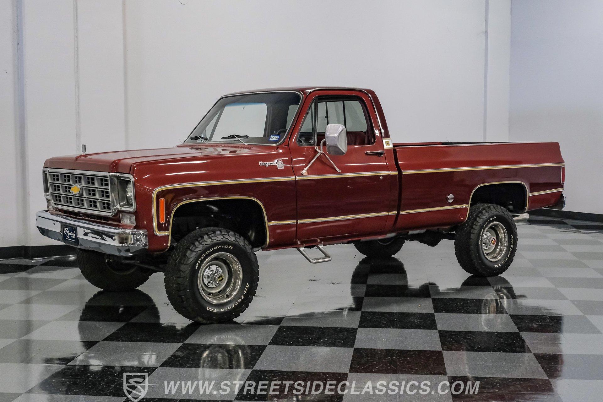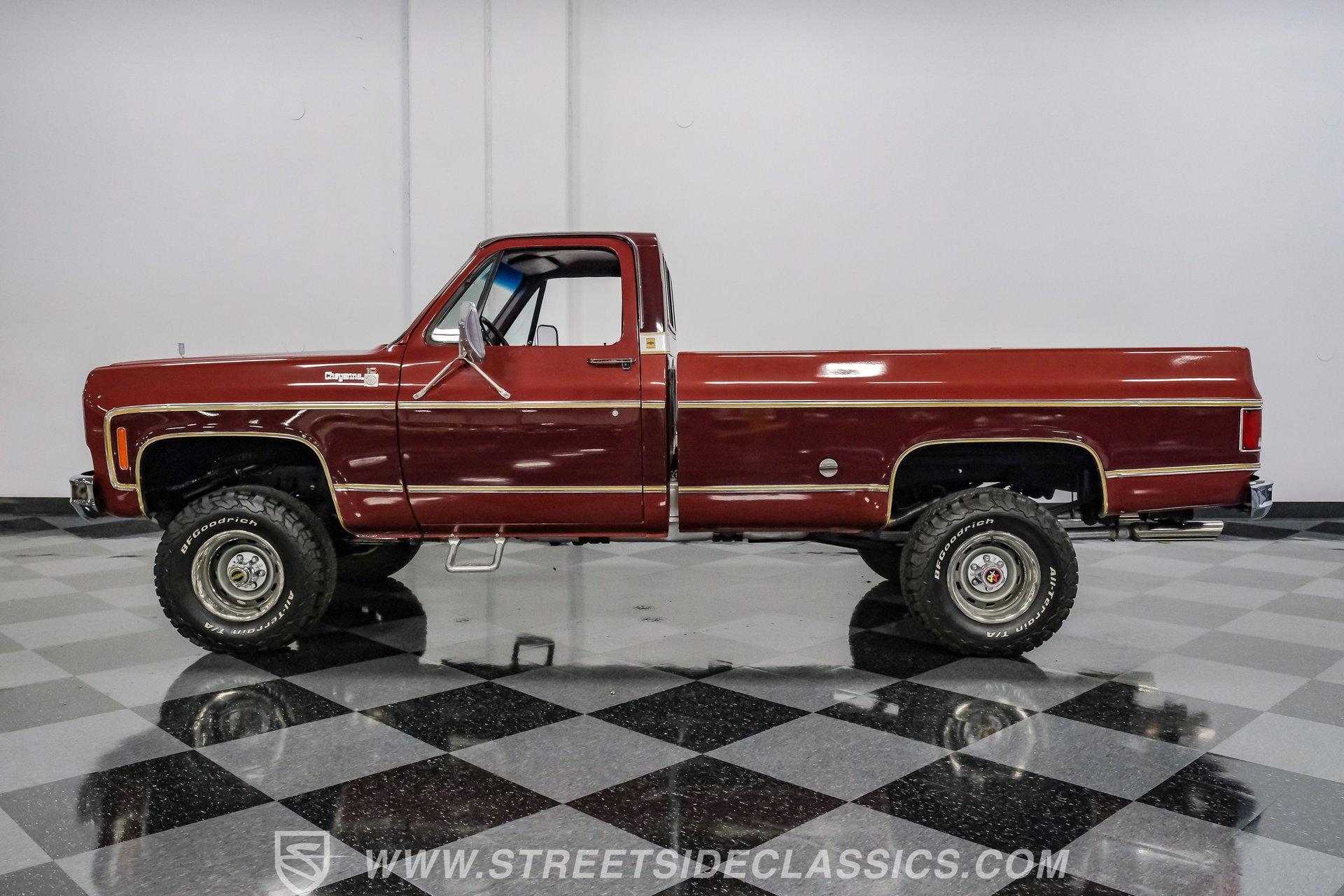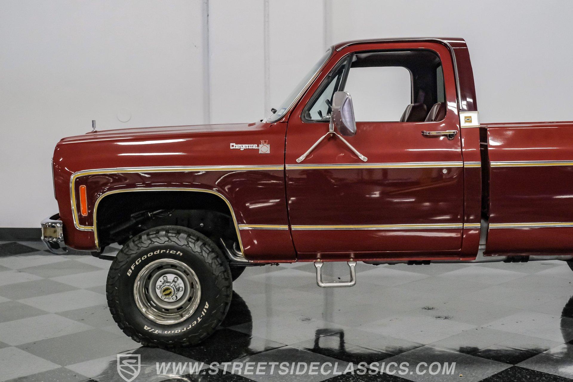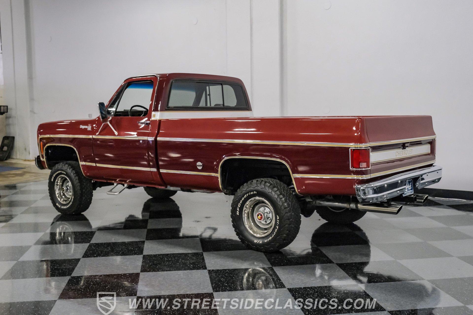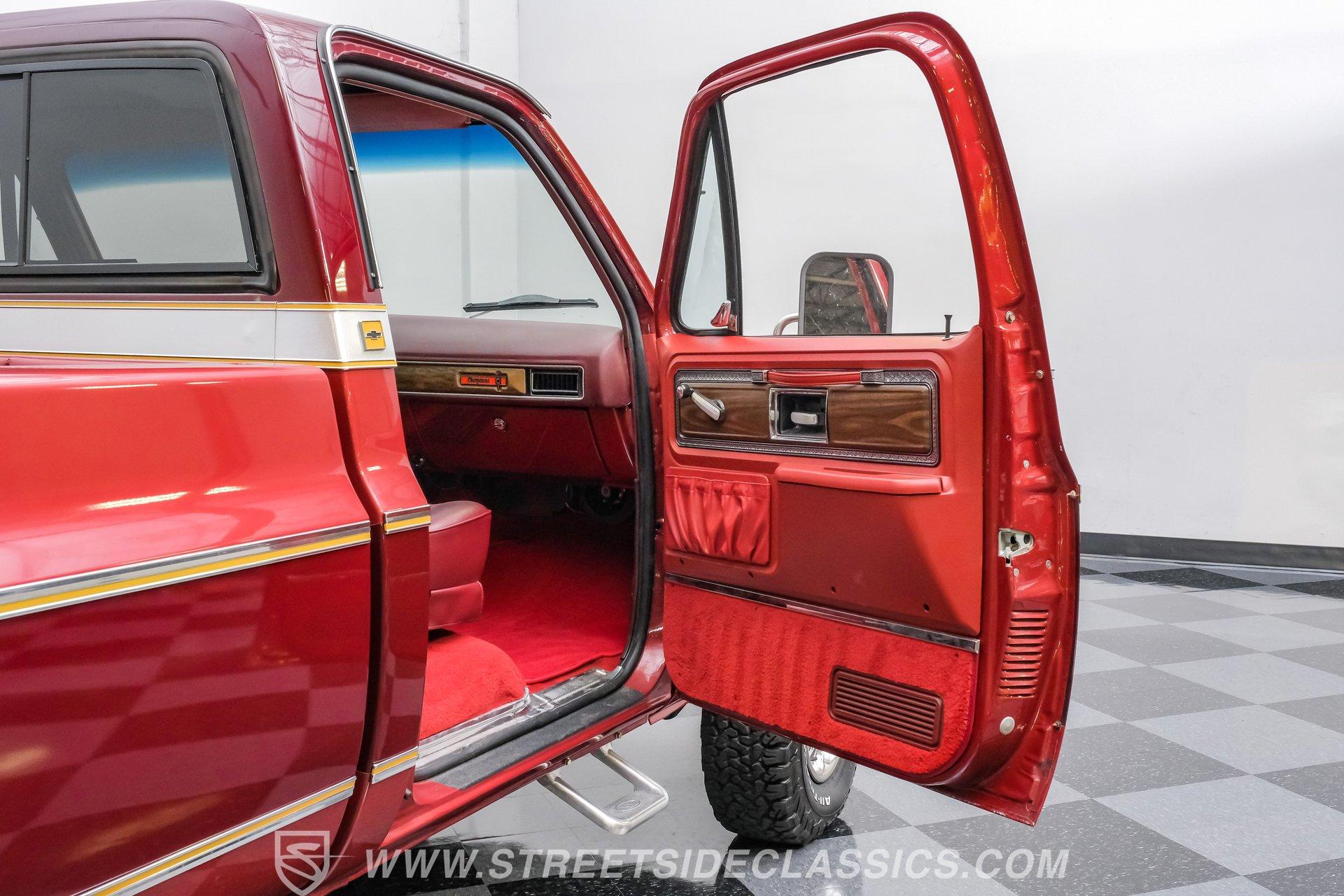 A classic truck brings back simpler times and the promise of adventure. The 1977 Chevrolet K10 Cheyenne 4x4 is more than transportation-it's a rugged American icon. With a full two-tone Red and Burgundy repaint, chrome bumpers, factory grille, Rhino-lined bed, and receiver hitch, this restored legend is ready for the road. Step inside and discover a thoughtfully restored red interior that blends vintage charm with modern comfort. Newly upholstered bucket seats and a center console provide support and style, while the factory red dash features classic wood applique and updated Classic Instruments gauges. Enjoy tunes from a retro-style AM/FM/Aux/BT radio and stay comfortable with Vintage Air A/C. Red carpets, door panels, and headliner complete the inviting, factory-inspired cabin, and a Kicker subwoofer system adds a modern touch for your favorite soundtrack. Under the hood, this K10 is powered by a Blueprint Engines 350 V8 crate engine, equipped with aluminum heads, an Edelbrock 4-barrel carburetor, and Edelbrock intake for reliable performance. The 700R4 4-speed automatic transmission with column shifter ensures smooth, confident shifts, while dual electric fans and a Griffin radiator keep things cool even on demanding drives. Hedman headers and a well-organized engine bay reflect careful attention to detail, and the drivetrain upgrades deliver strong acceleration and a responsive driving experience. HIGHLIGHTS: Blueprint Engines 350 V8 Crate Engine Edelbrock 4-Barrel Carburetor and Intake 700R4 4-Speed Automatic Transmission 1,231 Miles Since Built Full Two-Tone Red and Burgundy Repaint Chrome Bumpers, Factory Grille, Receiver Hitch Rhino-Liner Painted Bed Factory-Style Lifted Suspension 15" Wheels with BFG 31x10.50R15 Tires Power Front Disc Brakes, Power Steering Vintage Air A/C, Blows Cold Newly Upholstered Red Vinyl Bucket Seats Classic Instruments Gauges, Retro Radio with Bluetooth Financing Available Vehicle Protection Plans Available Worldwide Shipping This 1977 Chevrolet K10 Cheyenne 4x4 is a standout example of classic American trucks, blending vintage style with modern upgrades and reliable performance. If you're seeking a restored square-body that's ready for both daily drives and weekend adventures, this is the truck for you. Call, email, or come visit our showroom today!