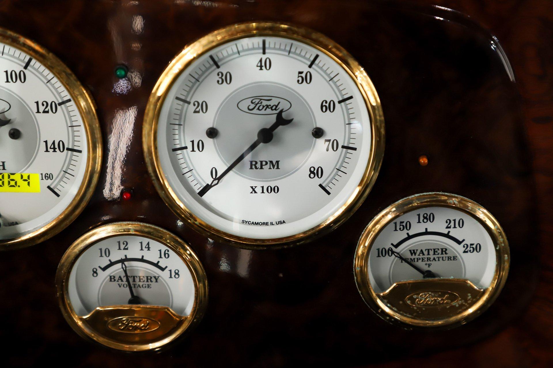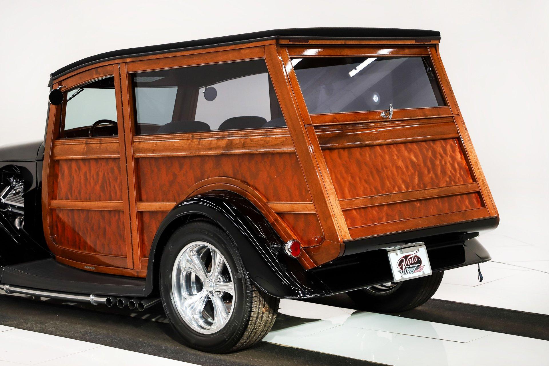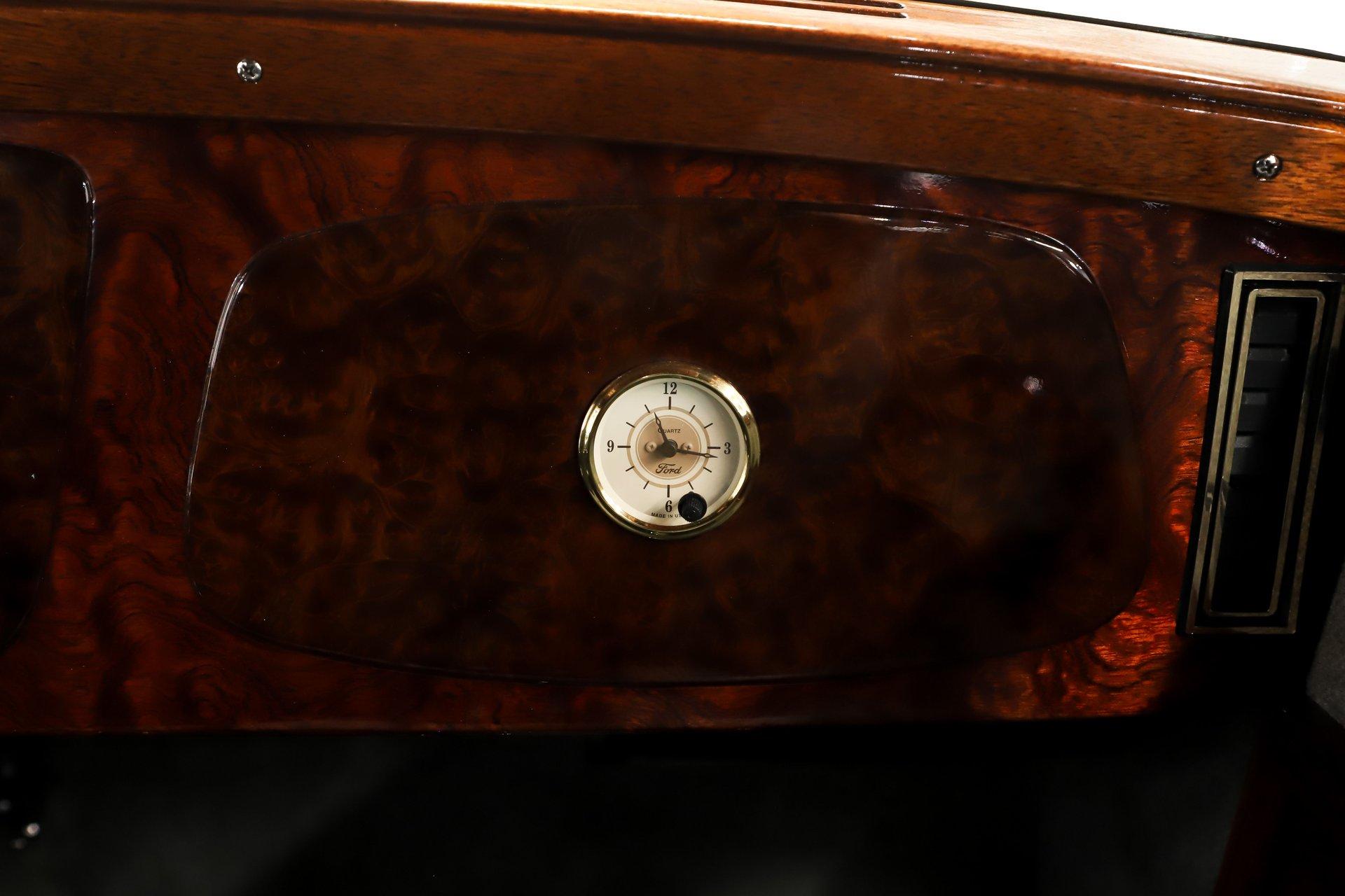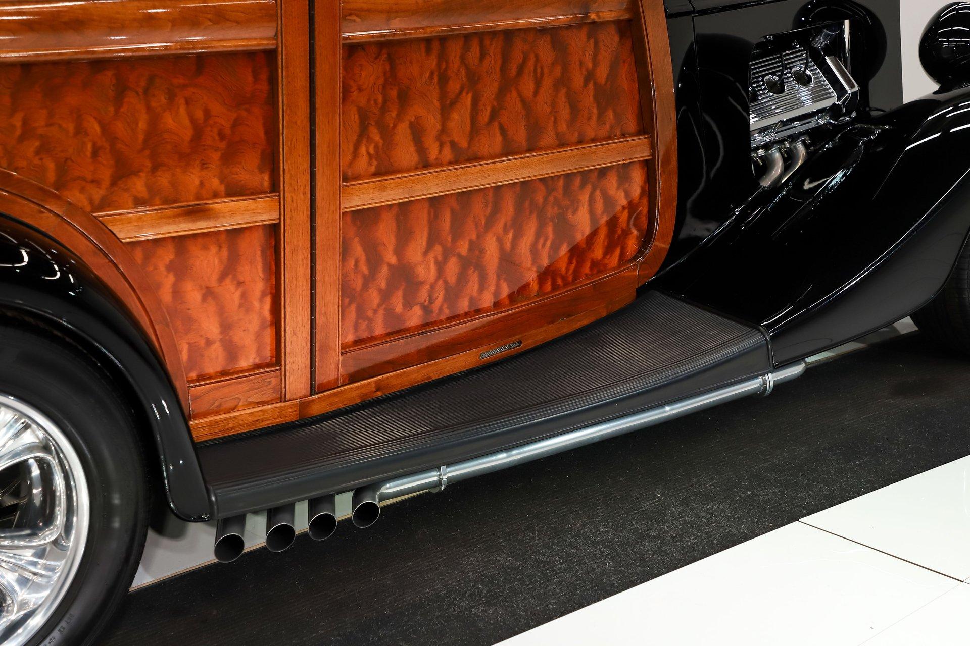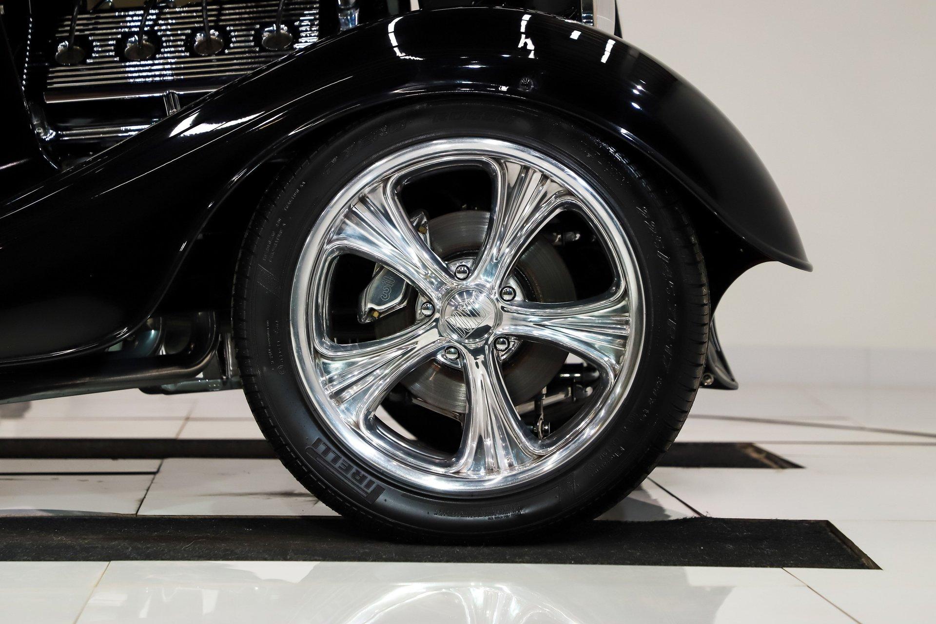 INTRODUCTION: Meticulous build top to bottom! The fit and finish is excellent, stainless hardware was used throughout, and it functions great! Less than 800 miles showing on the odometer, it still looks fresh. The walnut body, chromed Northstar engine and TCI chassis are just a few of the unique features on this classy hot rod. My guys really love this one, cars come and go here and this one has grabbed a lot of people's attention including my Father's, he flipped over it! EXTERIOR: Rare walnut body with Kewazingo inserts. The woodwork is solid and has a beautiful glossy finish. The doors use piano hinges for a solid and square fit, they shut like a regular car. The black painted surfaces are laser straight and have a mirror reflection. The padded top is finished in a rich black cloth. The glass is all smoked, the doors even have power windows! I love the big original style headlamps with Ford script lenses, the front turn signals are inconspicuously mounted under the fenders. In back it is using original style taillights along with flush mounted LED brake lights in the body. Those aren't the only flush mounted lights, there are some under the doors that light up when you open the doors with the hidden levers. How about the 4 individual side pipes showing under each fender! It is rolling proud and pretty on the Boyd's wheels: 17s in front, 18s in back and they are wearing Pirelli P Zero tires. INTERIOR: It is actually a very comfortable interior, I'm sitting in the car as I write this. The Tea seats are sporty buckets in front and a matching bench in back. Professionally installed gray tweed upholstery and cut carpet with bound edges. It also has 4 sets of seat belts, a Lokar shifter and chrome e-brake handle on the floor. There is certainly an abundance of beautiful woodwork inside as well, all with a high gloss polished finish in excellent shape. The walnut dash has vintage style gauges with Ford script and a matching quartz clock. The polished tilt column has a beautiful banjo style steering wheel with a walnut rim. An overhead console has a stereo and power deadbolt lock switches for the suicide doors. ENGINE COMPARTMENT: Cadillac Hot Rod Fabricators (CHRF) figured the really cool old school hot rods used Cadillac motors so why not incorporate the revolutionary Northstar engine into a Ford hot rod today. Well they successfully did and then turned it into a business. This 4.6 liter all aluminum V-8 with dual overhead cams and 4 valves per cylinder was built using CHRF components and innovation. It also has the Northstar Performance head bolt upgrade. It's covered in chrome and just looks cool, everyone thinks it's a Hemi! TRUNK COMPARTMENT: The rear is very accessible with easy to open upper and lower doors. When the tailgate is down it has a beautiful wood finish. UNDERSIDE: TCI chassis. Boxed and smoothed frame with tubular center support The front independent suspension is completely polished including the tubular control arms, swaybar, coilover adjustable gas shocks, spindles. in back it has a 4 link system with polished tubular control arms and panhard bar, coilover adjustable gas shocks. There are disc brakes at all 4 wheels , polished calipers, polished backing plates, polished master cylinder, chrome power booster, in front, e-brake. Rack & pinion steering. Polished stainless fuel tank. Looking up at the motor the oil pan is polished, the trans is a 700R4 overdrive automatic. polished aluminum driveshaft. Currie 9 inch rear with polished and finned center section chrome axle tubes. It's detailed under here, if it's not gloss black it's polished aluminum or chrome! SERVICE: We take pride in our cars and reputation. Therefore, we built a 2 million dollar, 10,000 square ft service center, and hired a team of technicians to service the essentials on every car we sell. CONCLUSION: The closer you look the more you will appreciate the extra care, time and skill that went into this build. I'm impressed! Vehicles are displayed in a museum setting. Admission applies without an appointment and is refunded with purchase, including a one-year museum membership. 815 385 3644 9-5 central Sales@volocars.com Answered ASAP Air conditioning Fuel injection Power brakes 4 wheel disc Rack & pinion Side exhaust TCI chassis Power windows Stereo system Tilt wheel Seatbelts Cloth top Smoked glass Boyd's wheels Pirelli tires