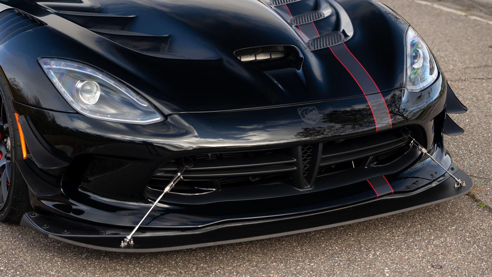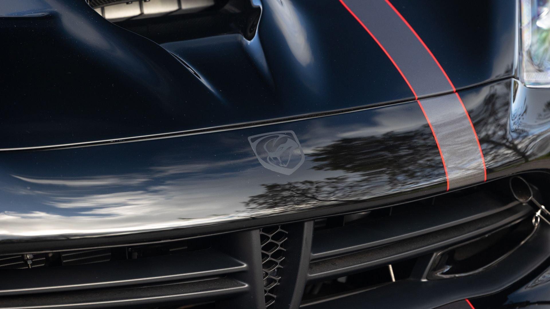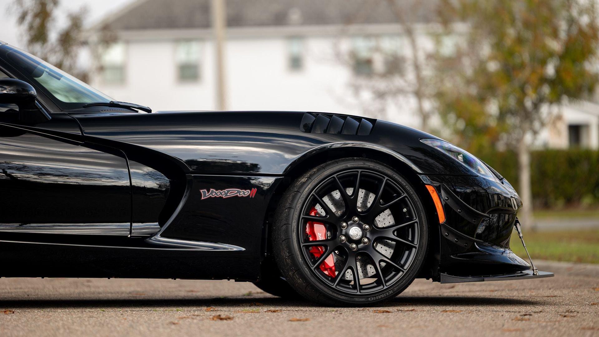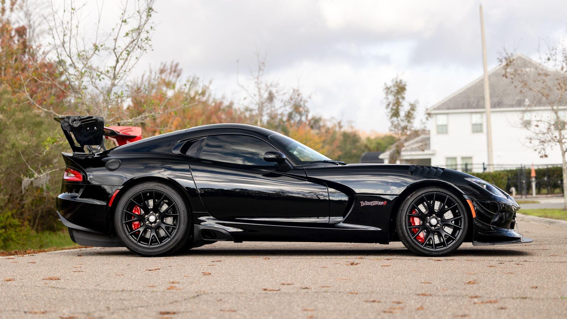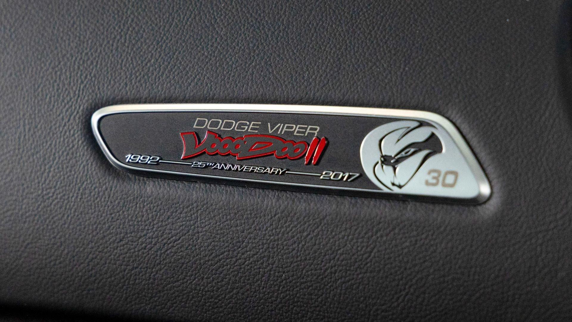 Chassis No. 1C3BDEDZ8HV500168 VoooDoo II Edition No. 30/31 The Dodge Viper ACR (American Club Racer), launched in 2016, took the performance car world by storm by setting 13 road course lap records, the most of any production car, as certified by the SCCA. At the heart of the Viper ACR is a formidable 8.4-liter V10 engine, delivering an impressive 645 horsepower through a six-speed manual transmission. It features Brembo Carbon Ceramic Matrix 15-inch rotors with six-piston calipers and double-adjustable Bilstein coil-over suspension capable of sustaining up to 1.5 g while cornering. This 2017 Dodge Viper is the 30th of just 31 VoooDoo II Edition ACRs—one of the most evocative tributes built to commemorate both the Viper’s 25th anniversary and the end of the model’s production in 2017. Built to revive the 2010 special edition Viper ACR of the same name, the 2017 VoooDoo II Edition ACR is unmistakable in specification—finished in Venom Black with a graphite metallic ACR driver’s stripe and red tracer outline, complemented by VoooDoo II exterior sill decals and badges. Step inside its black Alcantara and leather-trimmed ACR interior to discover silver accent stitching throughout, plus a serialized VoooDoo II instrument panel plaque above the glove compartment. It is further equipped with the desirable Extreme Aero Package ($6,900), which further elevates the vehicle's aerodynamic capabilities with an extreme front splitter, removable hood louvers to reduce front wheel drag, four dive planes, a rear carbon fiber diffuser, and a 74-inch adjustable dual-element rear wing that combine to produce one ton of downforce at 177 miles per hour. According to its clean CARFAX Vehicle History Report, this special Viper ACR was sold new in July 2017 through Ed Tomko Chrysler Jeep Dodge and was first registered in New Jersey. It has remained under single ownership, accumulating just 150 miles at cataloging. This example is furnished with its original delivery items including two keys, front splitter, owner's manuals, and supplementary literature. This 2017 Dodge Viper Vooodoo II Edition ACR-Extreme is offered in collector grade condition and additionally outfitted with some of the most desirable options during the final year of production. It is a stunning blend of track-focused, circuit capability and street legal use producing an analog driving experience nearly impossible to match today.