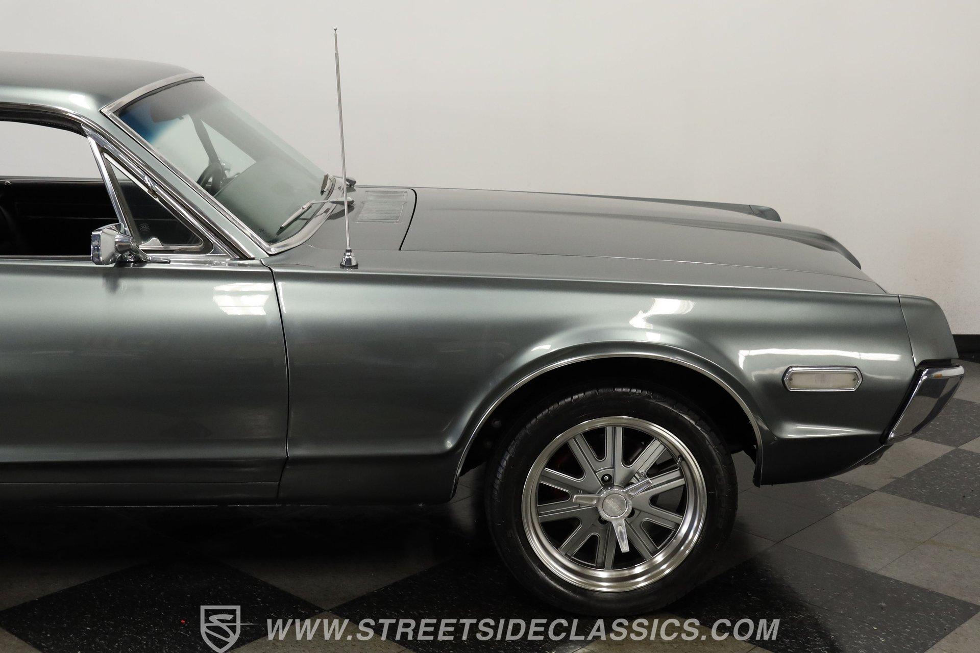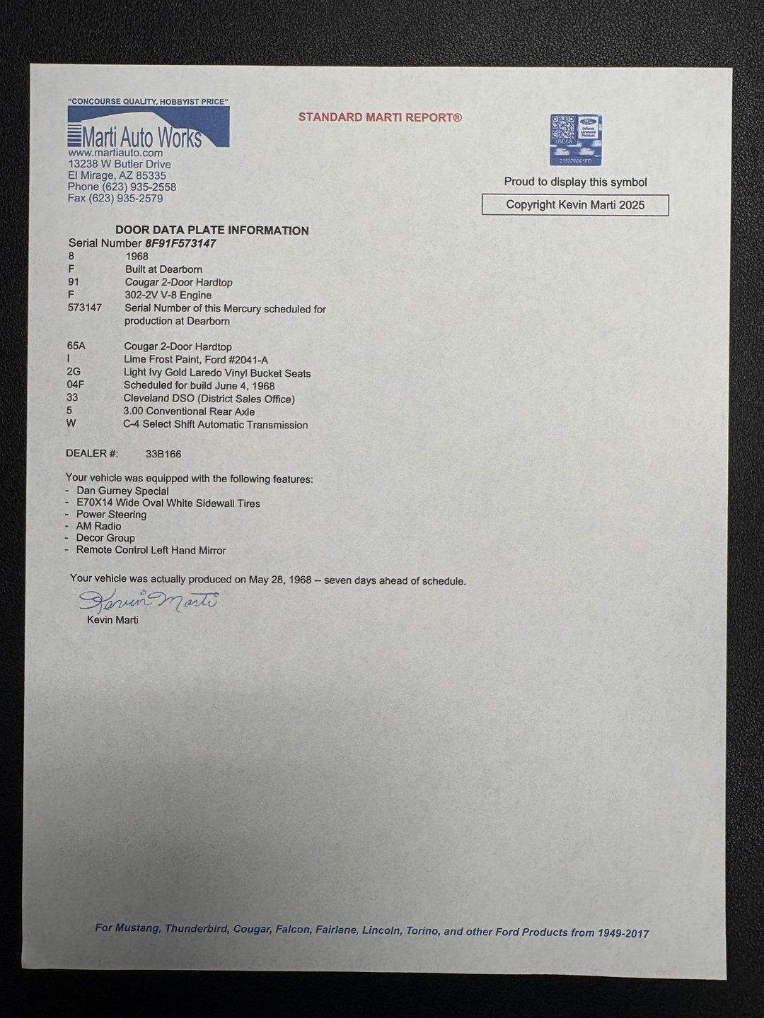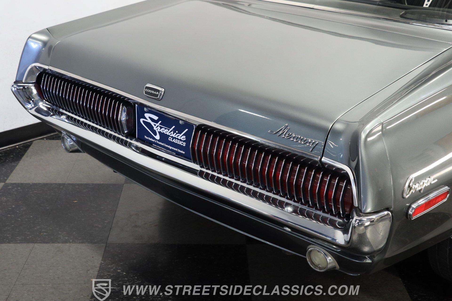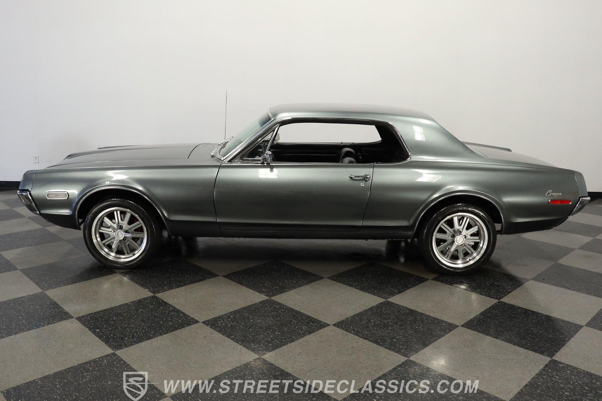 There's something special about sliding behind the wheel of a true classic, a car that turns every drive into a celebration of style and history. The 1968 Mercury Cougar is more than just a vehicle-it's an experience, a statement, and a piece of American automotive heritage. From its unmistakable silhouette to the rumble of its V8, this Cougar represents the spirit of the late sixties, when muscle and elegance met on the open road. If you're ready to make memories, turn heads, and own a conversation piece, this 1968 Mercury Cougar is waiting for you. Step inside to discover a thoughtfully restored interior that blends classic charm with subtle upgrades. The black vinyl seats show very light wear, maintaining a crisp look that complements the upgraded dash featuring aftermarket classic gauges and a RetroSound AM/FM radio with modern touches. The Grant steering wheel feels just right in your hands, while the headliner and factory-style shifter on the floor complete the inviting and comfortable cabin. Under the hood sits a robust 302 V8, enhanced with a high-rise Edelbrock Performer intake and a 4-barrel Edelbrock carburetor for responsive power. An upgraded MSD ignition system ensures reliable performance, while the aluminum radiator with electric fan assembly keeps things cool even on spirited drives. The 3-speed automatic transmission delivers smooth shifts, and the R134A air conditioning system brings modern comfort to this vintage ride. Highlights Original Or Older Restoration 302 V8 With MSD Ignition Upgrade High-Rise Edelbrock Performer Intake 3-Speed Automatic Transmission Aluminum Radiator With Electric Fan R134A Air Conditioning Power Disc Brakes Front And Rear Factory Style Front And Rear Suspension 17" American Racing Shelby Wheels Cooper Radial Tires, 2017 Date Code Upgraded Aftermarket Classic Gauges RetroSound AM/FM Radio Marti Report Documented Dan Gurney Special Full Professional Repaint Financing Available Vehicle Protection Plans Available Worldwide Shipping This 1968 Mercury Cougar offers a winning combination of classic looks, upgraded performance, and documented history. Whether you're a seasoned collector or a first-time classic owner, this Cougar stands ready for your next adventure. Call, email, or come visit our showroom today! Be sure to ask about our services offered; Financing, Vehicle Protection Plan, Insurance, and Transportation to your driveway!