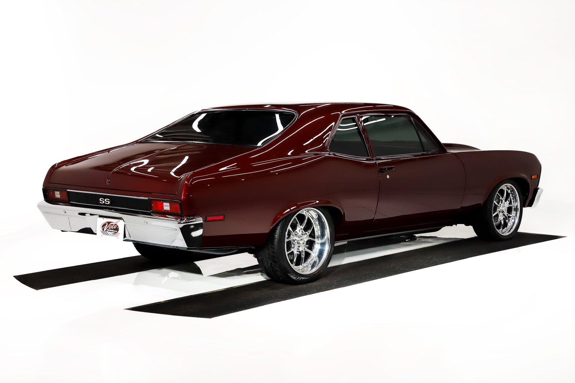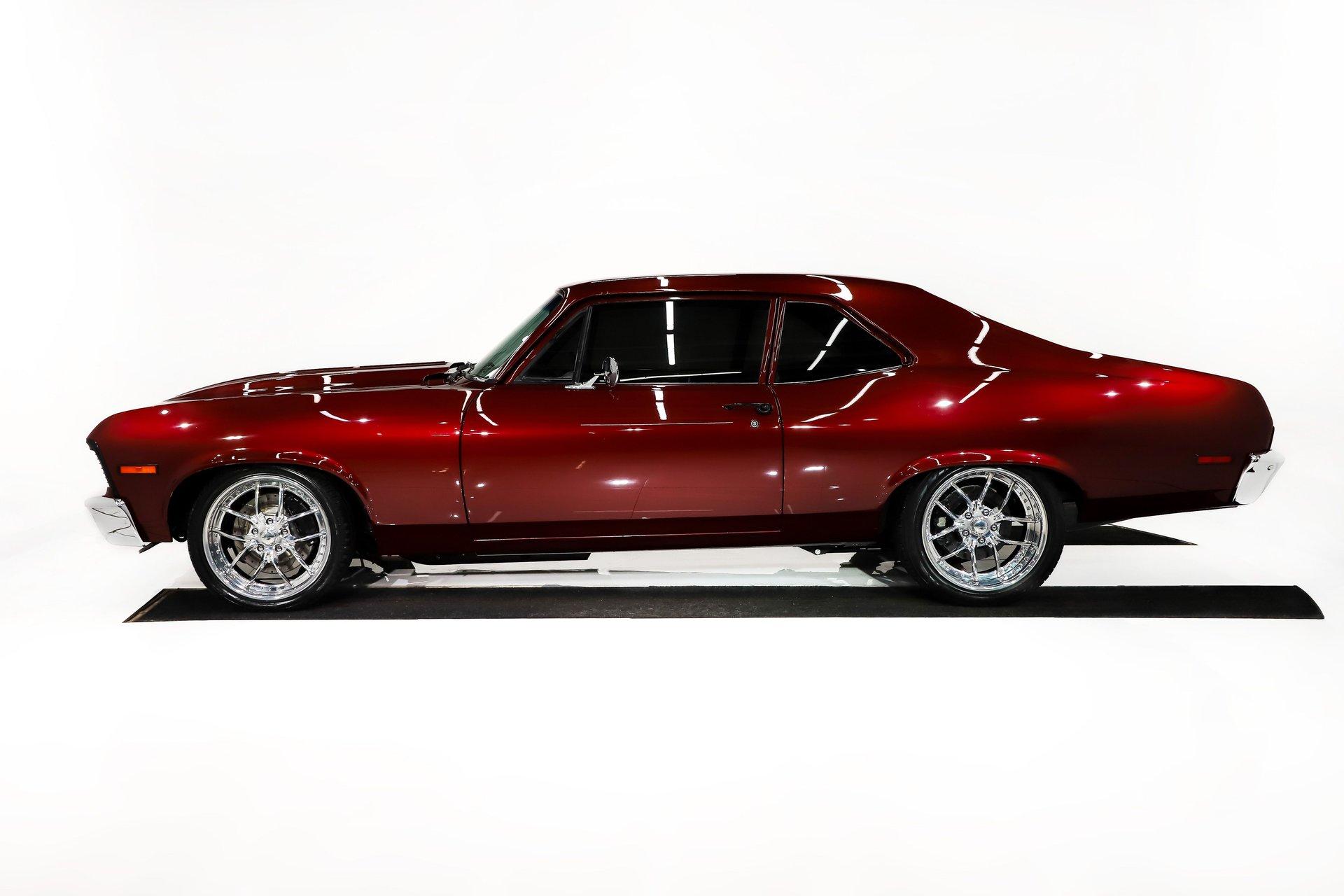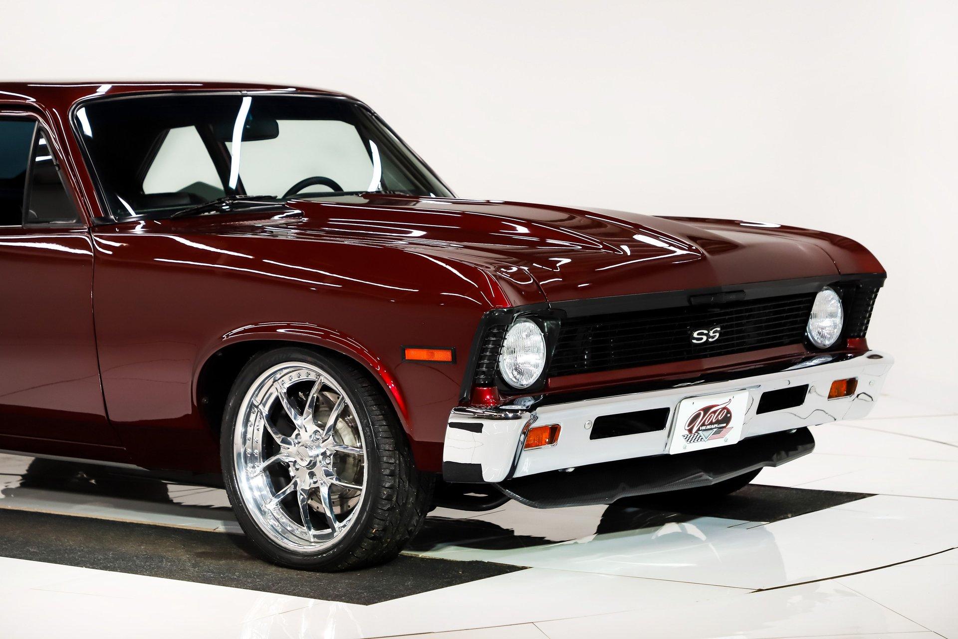 INTRODUCTION: The color, stance and wheels make this Nova a knockout! The LS motor and upgraded chassis make it just as awesome to drive! I promise you will be bombarded with looks, thumbs up and compliments. EXTERIOR: Wow, it's beautiful! The body is laser straight, fits right and has a cowl hood. Painted a beautiful burgundy metallic, it looks like a piece of hard candy. Most of the trim has been blacked out, the bumpers have a fresh bright chrome finish. Upfront there's a carbon fiber front spoiler and Holley Retrobright LED headlights. The windshield and back window were replaced, the side glass has been tinted. The wheels may be the star of the show! 18x7 Billet Specialties in front and 18x9.5s in back and they are wrapped in performance tires. INTERIOR: This is a full custom interior, sporty and comfy! TMI seats front and back with alcantara inserts and red stitching. There is custom carpet on the floor with embroidered mats and up above is a fiberglass 1 piece headliner covered in alcantara with matching visors. The side panels are reproductions. The center console offers an armrest and cup holders. The dash pad is new and the e-brake instrument panel is custom with a totally cool Holley digital screen for the engine's vitals. Upgraded Vintage Air electric slide control panel and a tilt column with a leather cushion grip three spoke wheel. It also has a Bluetooth system with kick panel speakers, 6x9s and an amplifier. The LED dome light is nice and bright. ENGINE COMPARTMENT: That's a strong and reliable 6.0L LS motor with a BTR Stage III cam, PRC aluminum heads, stainless headers, polished air intake tube and a Terminator X ECU. The front of the motor has all the modern components and serpentine belt system. Other features include modern heat and air conditioning, modern power steering and power brake systems. Upgraded aluminum radiator with an aluminum overflow bottle and a big electric fan. The engine bay is painted beautiful like the car, the firewall was smoothed out and the wiper motor was deleted. TRUNK COMPARTMENT: Under the lid and the jamb are painted slick like the car. Inside is lined with a sound and the floor was carpeted. It was boxed and upholstered, the gel battery was relocated behind the rear panel. UNDERSIDE: The body was off the frame, it appears to be solid with two floor pan patches. The steering and suspension was completely redone and upgraded with fat tubular control arms, lowering springs, gas shocks, billet spindles and a heavier swaybar. In back is a four link setup with tubular control arms, coilover adjustable gas shocks and a panhard bar. The fuel system was replaced and compatible with the fuel injection motor. It has a custom exhaust with stainless mufflers and was coated. There are drilled and slotted disc brakes at all four of the wheels. Looking up at the motor it has an aluminum Holley oil pan and high torque starter. The trans is a 4L60 overdrive automatic for easy highway cruising. In back is a rad looking Fab 9 narrowed rear end with an aluminum center section and 3.73 posi gears. SERVICE: We take pride in our cars and reputation. Therefore, we built a 2 million dollar, 10,000 square ft service center, and hired a team of technicians to service the essentials on every car we sell. CONCLUSION: Bottomline, this is a hot car! Outside on a sunny day- Wow! It's so much more than a pretty face though- it's an exhilarating, comfortable car to drive too. Vehicles are displayed in a museum setting. Admission applies without an appointment and is refunded with purchase, including a one-year museum membership. 815 385 3644 9-5 central Sales@volocars.com Answered ASAP Air conditioning Power steering Power brakes 4 wheel disc 3.73 posi Fuel injection Tilt wheel TMI seats Console Digital dash display Bluetooth stereo Tinted glass Cowl hood Front spoiler Billet Specialties wheels
