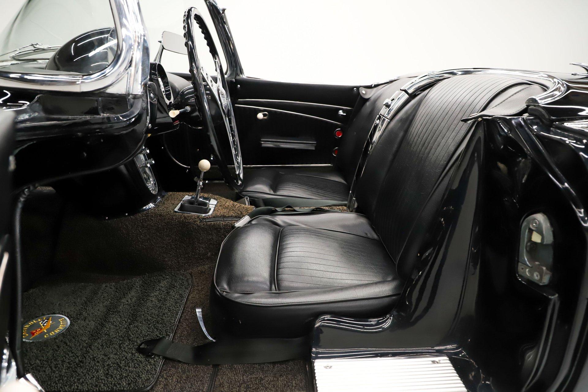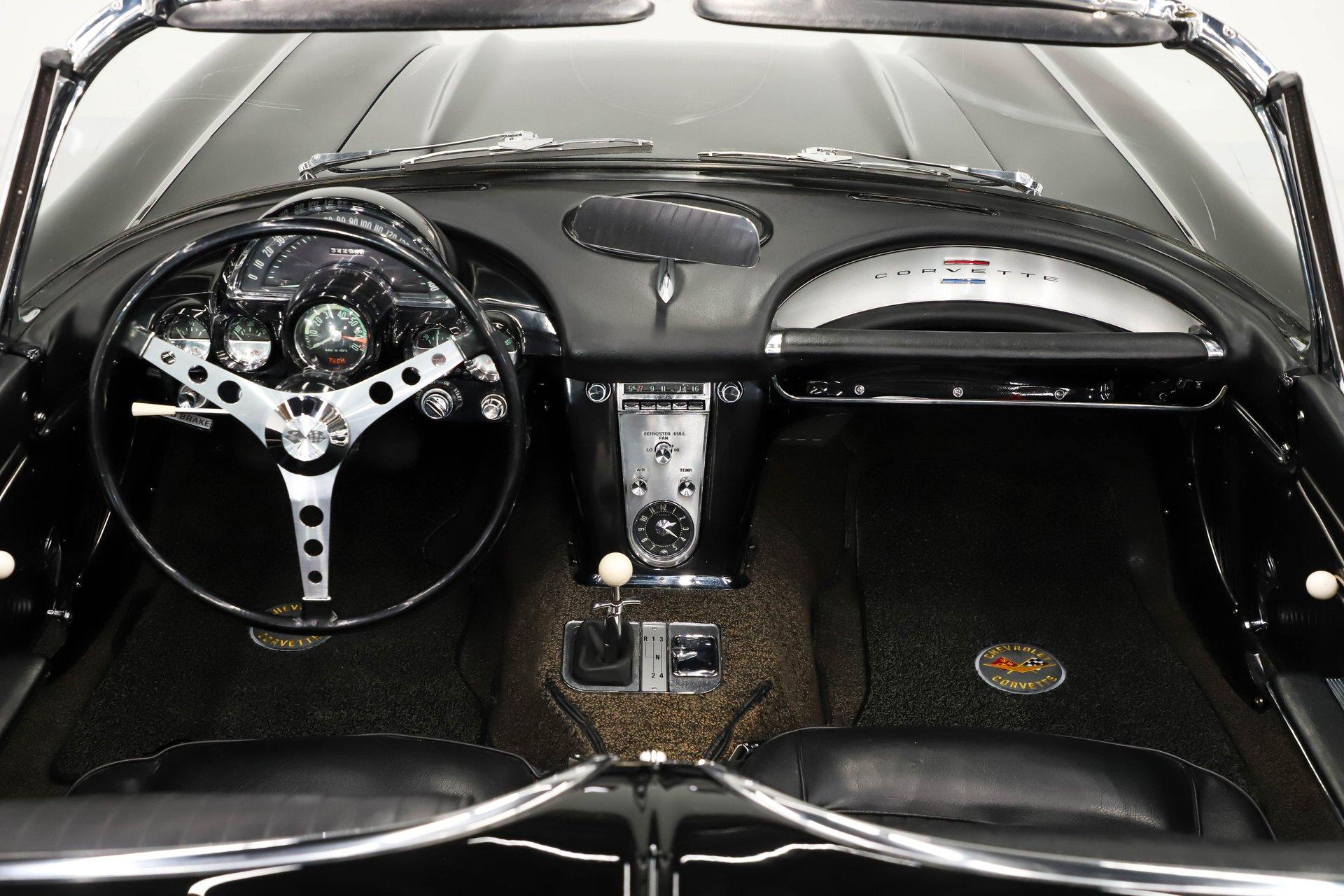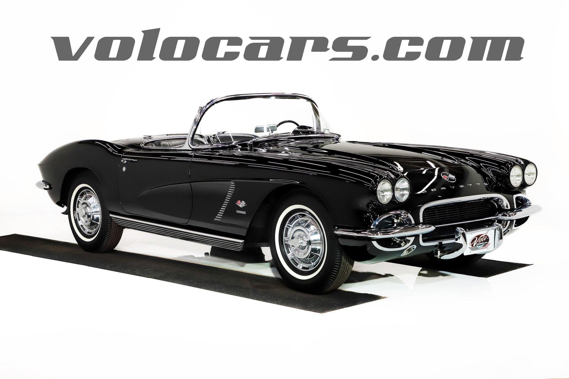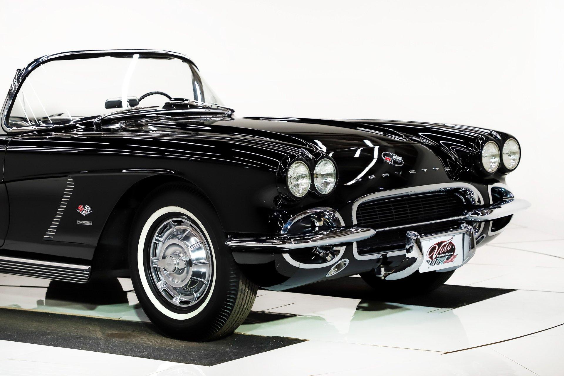INTRODUCTION: A two top Fuelie! VIN #s matching 327 fuelie, 4 speed manual trans, and 4.11 posi rear end. Being triple black doesn't hurt it either; what a mischievous and gorgeous color combination. It's been nicely restored, starts easily, and drives fantastic. This is the pinnacle of first generation Corvettes! EXTERIOR: Desirable color combo! Plus it's a 2 topper that includes a folding black convertible top and a removable hardtop that matches the exterior paint. Very good fit and finishes throughout with consistent gaps and doors that close easily. Looking down the side of the nice and straight body is impressive with its smooth contours and sharp lines. The paint has a shiny high gloss finish and the brightwork has a lustrous shine. The weatherstrips are soft and pliable. It's sitting pretty on a set of 15” painted steel rims with factory spinner hubcaps and reproduction Firestone Deluxe Champion whitewall tires. INTERIOR: Very nicely restored! It has the correct style grey and black speckled carpet that's in great shape. The upholstery and door panels were replaced plus the dash pad is fresh. The fiberglass was repainted and has a nice shiny finish. All the gauges are clean with clear lenses and it has the correct 6500 redline tachometer. It also has the original style Wonderbar in the factory location. All the knobs, handles, armrests look great. Correct lockout shifter with original knob, and a new bezel. It has seat belts and some embroidered mats too. ENGINE COMPARTMENT: Great originality! The original #’s matching fuel injected 327 with 360 horsepower. The casting codes and dates line up, the matching vin is stamped on the pad, the fuel injection unit even has correct #s on its tag. In addition to the fuel injection some of the other features included an aggressive cam, domed pistons, high compression, high revving solid lifters, high performance heads and they were dressed with finned aluminum valve covers. It has correct air cleaner, ignition shielding, deep groove pulleys, choke tube, glass fuel filter etc. Correct radiator, shroud, fan, expansion tank and even the clamps. It is detailed very nicely. TRUNK COMPARTMENT: Beautifully finished! The underside of the trunk lid, inside the jamb, and the trunk pan have all been neatly repainted. The black rubber mat, divider, latch mechanism, and weatherstrip were all replaced. Under the mat is all clean fiberglass and a spare tire. A car cover is also included. UNDERSIDE: It's very clean, well preserved and maintained as needed. The floors are still in their raw fiberglass and have not been painted over like most of them. The frame and chassis components are clean metal painted satin black. After our inspection of the suspension and steering we replaced the kingpins and bushings then had the front end aligned. It still has its travel limit straps in back.The exhaust system looks solid and has a crossover pipe. The brakes are working properly, e-brake is hooked up. Looking up at the motor it is clean and has the correct canister type oil filter. The original #s matching T10 4-speed was just rebuilt and it has a new clutch. The u-joints look fresh on the driveshaft which leads back to its original 4.11 posi; dated 1962, code CN. SERVICE: Turnkey ready! We take pride in our cars and reputation. Therefore, we built a 2 million dollar, 10,000 square ft service center, and hired a team of technicians to service the essentials on every car we sell. CONCLUSION: This is a classic Corvette with aggressive power and looks to match! It's exhilarating to drive, so much more fun than stocks or bonds. Vehicles are displayed in a museum setting. Admission applies without an appointment and is refunded with purchase, including a one-year museum membership. 815-385-3644 9-5 central Sales@volocars.com Answered ASAP Fuel injection 4.11 posi Removable hardtop Convertible top Seatbelts Reproduction whitewalls
