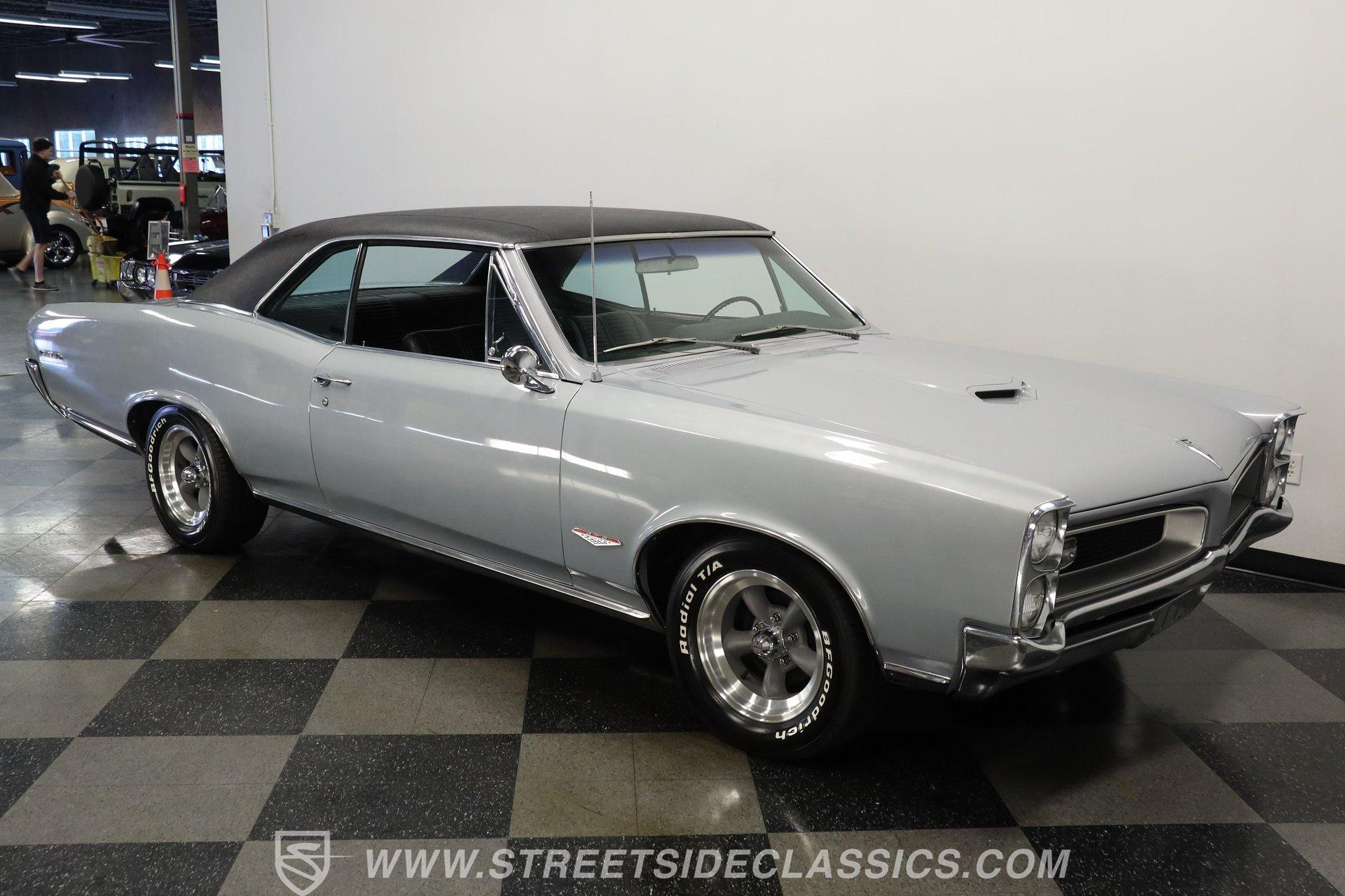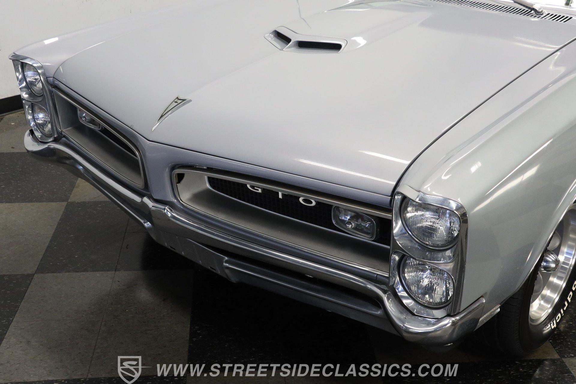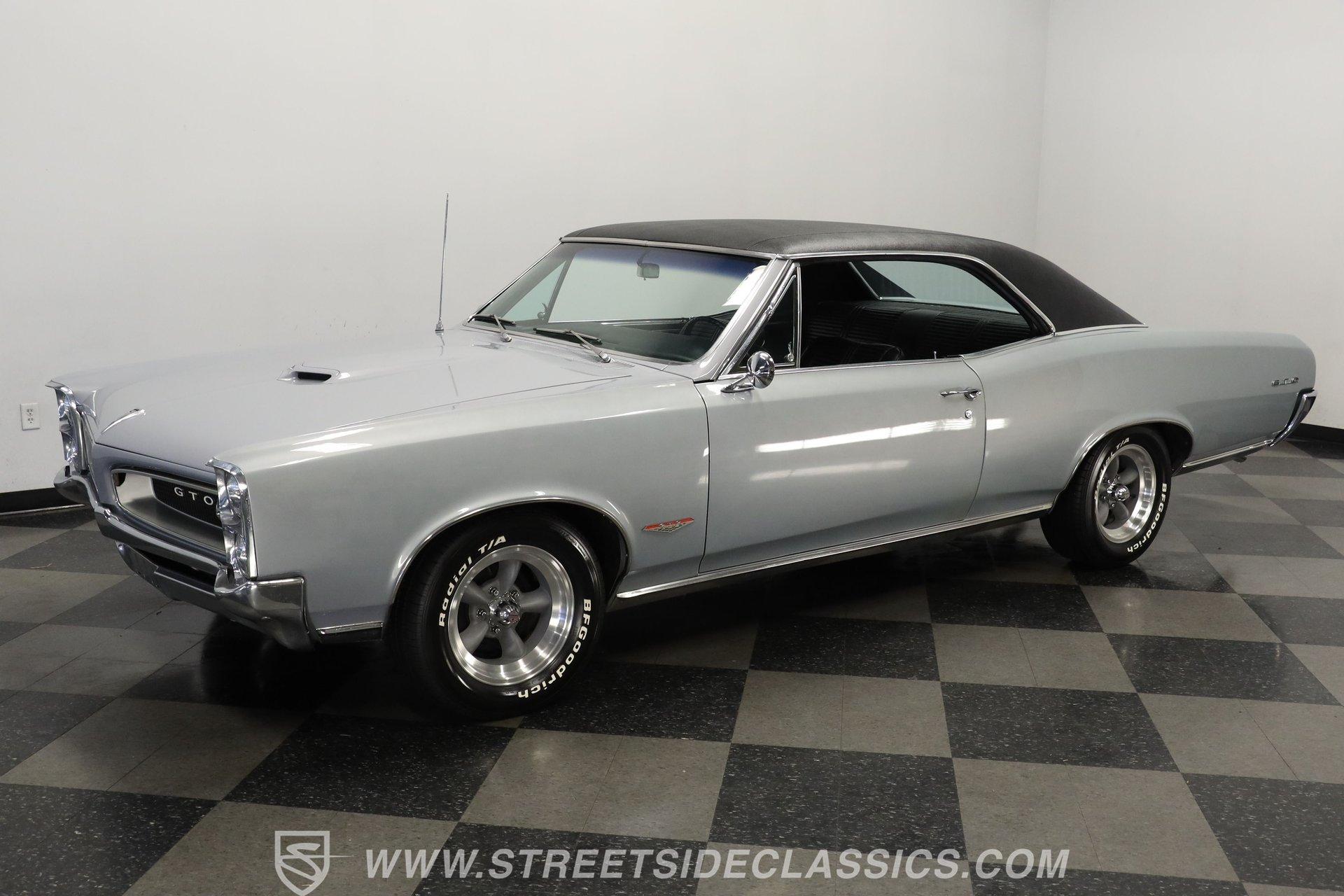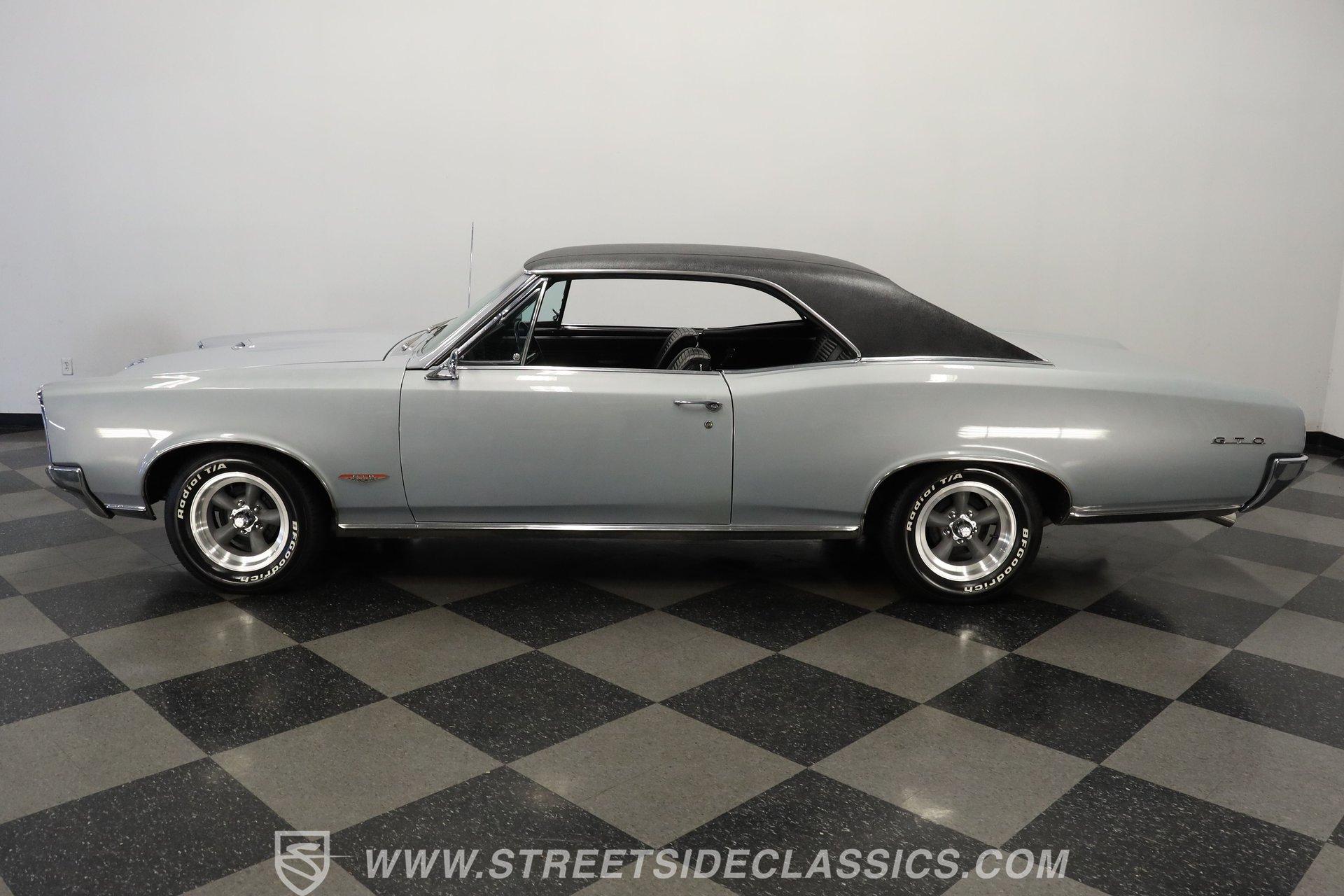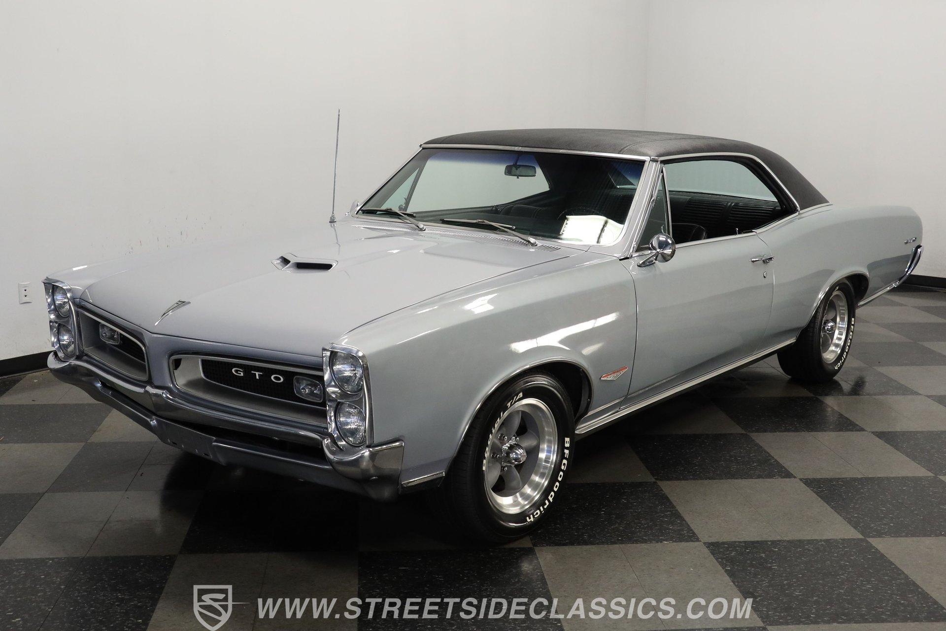 For Sale: 1966 Pontiac GTO – Platinum Power, Timeless Cool There is something truly special about slipping behind the wheel of a classic muscle car like the 1966 Pontiac GTO. It is more than a mode of transportation-it is a symbol of American ingenuity and the golden era of cruising. Imagine the sound of a throaty V8 rumbling to life, the glint of platinum paint under the sun, and the unmistakable presence this GTO brings wherever it goes. Every drive is a journey back to a time when style and power ruled the road. If you are ready to own a piece of history, this 1966 Pontiac GTO is waiting for you. Step inside and you are greeted by a well-preserved black interior, true to the original trim code (223 Black). The dash stands out with no cracks or fading, and the original gauge cluster and steering column evoke the car's heritage. The factory-style center console provides handy storage, while the headliner remains clean and intact. Manual windows and door locks keep things authentic, and an upgraded Pioneer radio hides discreetly in the glovebox, blending modern sound with classic looks. Under the hood, you will find a robust 389 V8 engine topped with a 4-barrel Edelbrock carburetor and high-rise Edelbrock intake, delivering the classic performance GTOs are known for. Power steering and power brakes make driving effortless, and an upgraded aluminum radiator with electric fan assembly helps keep things cool. The 3-speed automatic transmission ensures smooth cruising, while the clean engine bay speaks to the level of care this car has received. This GTO is equipped for both spirited drives and relaxed weekend outings. Highlights 1966 Pontiac GTO Platinum With Black Vinyl Top 389 V8 Engine With Edelbrock 4-Barrel Carb High Rise Edelbrock Intake Manifold 3-Speed Automatic Transmission Power Steering And Power Drum Brakes R12 Air Conditioning Upgraded Aluminum Radiator With Electric Fan Factory Style 15" American Racing Wheels Original Black Interior With Factory Console Repainted In Original Platinum (W-2 Code) Black Vinyl Top In Good Condition Pioneer Radio Mounted In Glovebox Financing Available Vehicle Protection Plans Available Worldwide Shipping The 1966 Pontiac GTO blends timeless design with classic American muscle, offering a driving experience that never goes out of style. Whether you are looking to turn heads at your next car show or simply want a piece of automotive history for your garage, this GTO is ready to impress. Call, email, or come visit our showroom today! Be sure to ask about our services offered; Financing, Vehicle Protection Plan, Insurance, and Transportation to your driveway!