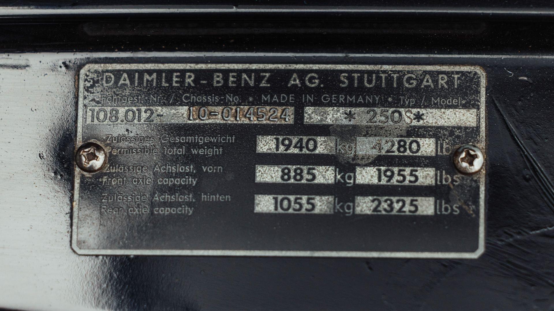 Chassis No. 108.012.10.014524 Engine No. 108.920.10.009358 As noted on its original sales invoice, this exceptional 250 S was sold new by Garage SAP of Tielt, Flanders, Belgium, and purchased new by its original owner on 5 July 1966. Befitting the S-Class, the car was specified in Black (040) over a stunning Red MB-Tex interior. Over the next 24 years, the car was maintained to the highest level while its use remained limited. Never driving the car without gloves, they would turn around at the sight of rain to keep the car clean and dry. So fanatical about keeping the car as clean as possible, they even requested that the top part of the rear bumper be slightly raised by the dealer to make it easier to clean between the upper and lower part of the chrome. Additionally they requested a second fog light be added to the rear to bring a sense of symmetry to the singular one required by the Belgium government. Upon his passing in 1990, the car saw limited use by their son, with the last service recorded in June 1993. After this, the car remained tucked away in the garage under cover until 2021, when it was acquired by the current owner, only the car’s second registered owner from new. Taken by the car's impressive originality, and still wearing its original Belgian license plate, a comprehensive mechanical service after long period of dry storage began. This work was carried out by Miguel Vanluchene of Classic Car Garage that included restoring the Hydro-Pneumatic compensating spring, overhauling the cooling system, ignition system, fuel system, and brakes, along with servicing the engine with fresh fluids and filters, amounting to over €13.000 worth of work. As noted in a 2021 report on the car compiled by FSP SWD GmbH, as directed by TÜV Rheinland, the car remains in exceptional and highly original condition. It is believed that the entire car is still wearing its original, factory-applied Black paint. Furnished with the car is its original sales invoice, radio blanking plate, owner's manual, stamped service book, brochures, pouch and maps. As an exceptionally well-presenting example, it currently displays just 65,000 kilometers at the time of consignment and is surely among the finest original examples of the 250 S extant. An incredible find of a well-driven and high-preserved Mercedes which truly were engineered like no other car in the world. PREVIEW DETAILS: This lot will be available for viewing by appointment from Waregem, Belgium. SALE LOCATION: Belgium BUYER’S PREMIUM: 10% + VAT on the Hammer Price TITLE/REGISTRATION DOCUMENTS: Belgian Certificat d'Immatriculation ADDITIONAL NOTES: N/A POST-AUCTION REMOVAL AND STORAGE: Following receipt of payment, collection can be arranged by appointment only from Waregem, Belgium with 24 hours' notice.