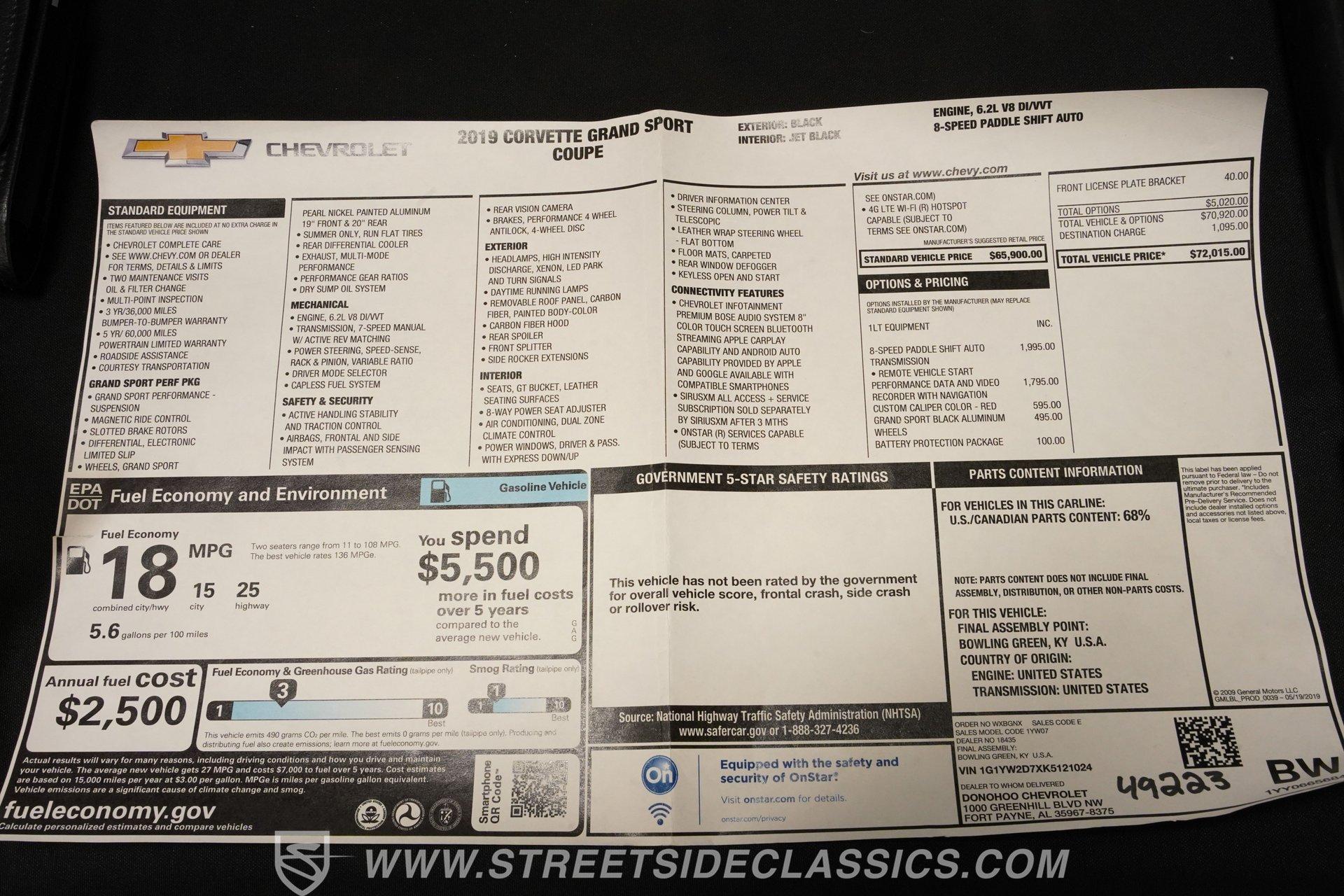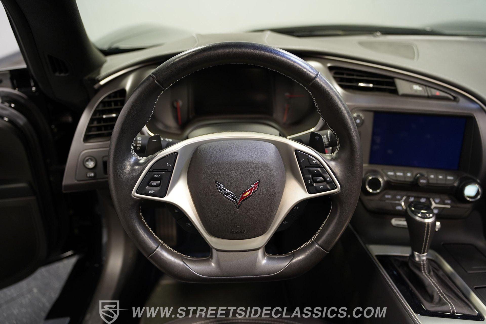In the vast landscape of the Corvette world, the seventh generation of Chevy's halo car holds a special significance. The C7 represents the last front-engine version of the 'Vette to (presumably ever) be made. Taking things a step further, the Grand Sport trim is a Corvette submodel often overlooked. But the GS does a marvelous job of splitting the difference between the base Sting Ray and the all-out Z06 racer, making it arguably the best of both worlds. To further subdivide things, this barely broken-in 2019 Chevrolet Corvette Grand Sport 1LT has just 7,635 miles on the odometer, making it an exceptionally unique and collectible car indeed. Painted in its original deep Black exterior hue, the aggressive lines of the Grand Sport standout remarkably well. With the car's removable targa top on or off, its louvered hood, front and rear spoilers, and massive chrome wheels show off the Grand Sport's nod to the Z06. Inside, the 1LT package takes luxury and technology up to its highest level for the Corvette to date. Supple and supportive eight-way power leather seats, a leather-wrapped steering wheel, power locks, mirrors, windows, telescopic wheel, backup camera, navigation, and a Bose stereo system that features Apple CarPlay, Android Auto, and Bluetooth connectivity to make this Grand Sport feel truly grand inside and out. Under the traditional front-hinged hood, we find the spectacular 6.2-liter Gen 5 LT1 V-8 that, when stock, pumps out an impressive 460 hp and 465 lb-ft of torque. That power then gets funneled through an eight-speed paddle-shifted automatic transmission before being sent out to the 2.73-geared transaxle, which transfers those ponies to the pavement via big 20-inch rear wheels wrapped in their massive steamroller-sized low-profile 335/25/ZR-20 Michelin Pilot Sport rubber, waiting ready for launch, while staggered 19-inch rims shod in 285/30ZR-19 rubber handle steering duties. And launch this car does, capable in stock form of rocketing from 0-60 mph in just 3.6 seconds, according to Motor Trend. HIGHLIGHTS: Last Year for Front Engine Corvette 7635 Actual Miles Factory Wide Body Z06 Fenders Rear Spoiler LT1 V8 Dry Sump Lubrication 8 Speed Auto Paddle Shifters Magnetic Ride Control Speed Sensitive Power Steering Electronic Limited Slip Rear Diff Power Options Bose Touchscreen Apple CarPlay/Android Auto Original Window Sticker Owner's Manual This 2019 Chevrolet Corvette Grand Sport 1LT also comes with GM's excellent magnetic ride control suspension and speed-sensitive power steering for an unbeatably comfortable ride. If you have been looking for a unique version of Chevy's final front-engine 'Vette, this almost new Grand Sport, complete with its original window sticker, is as close to buying it straight off the showroom floor as it gets. So, don't miss your chance to own one of the last front-engine Corvettes ever made. Call today!