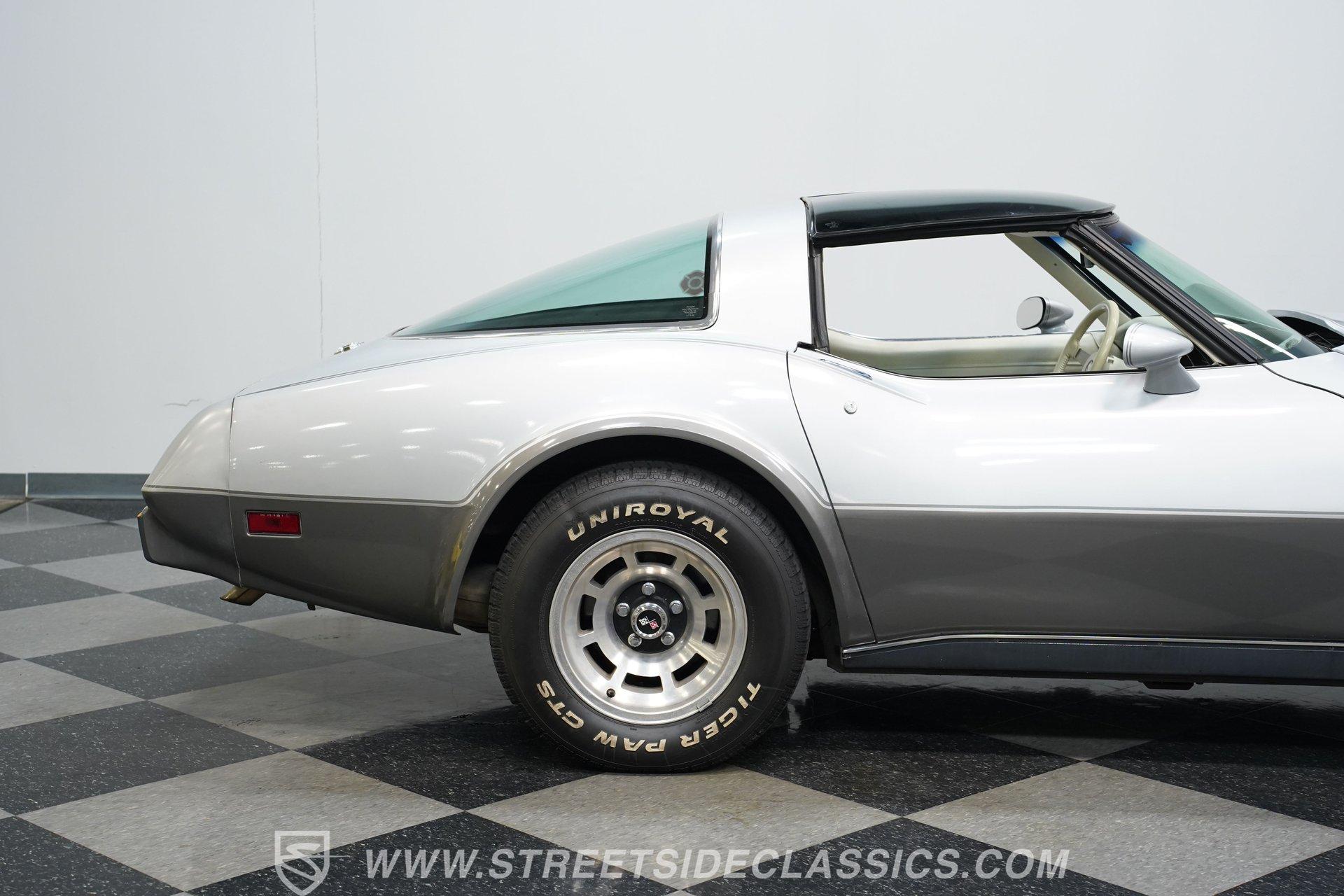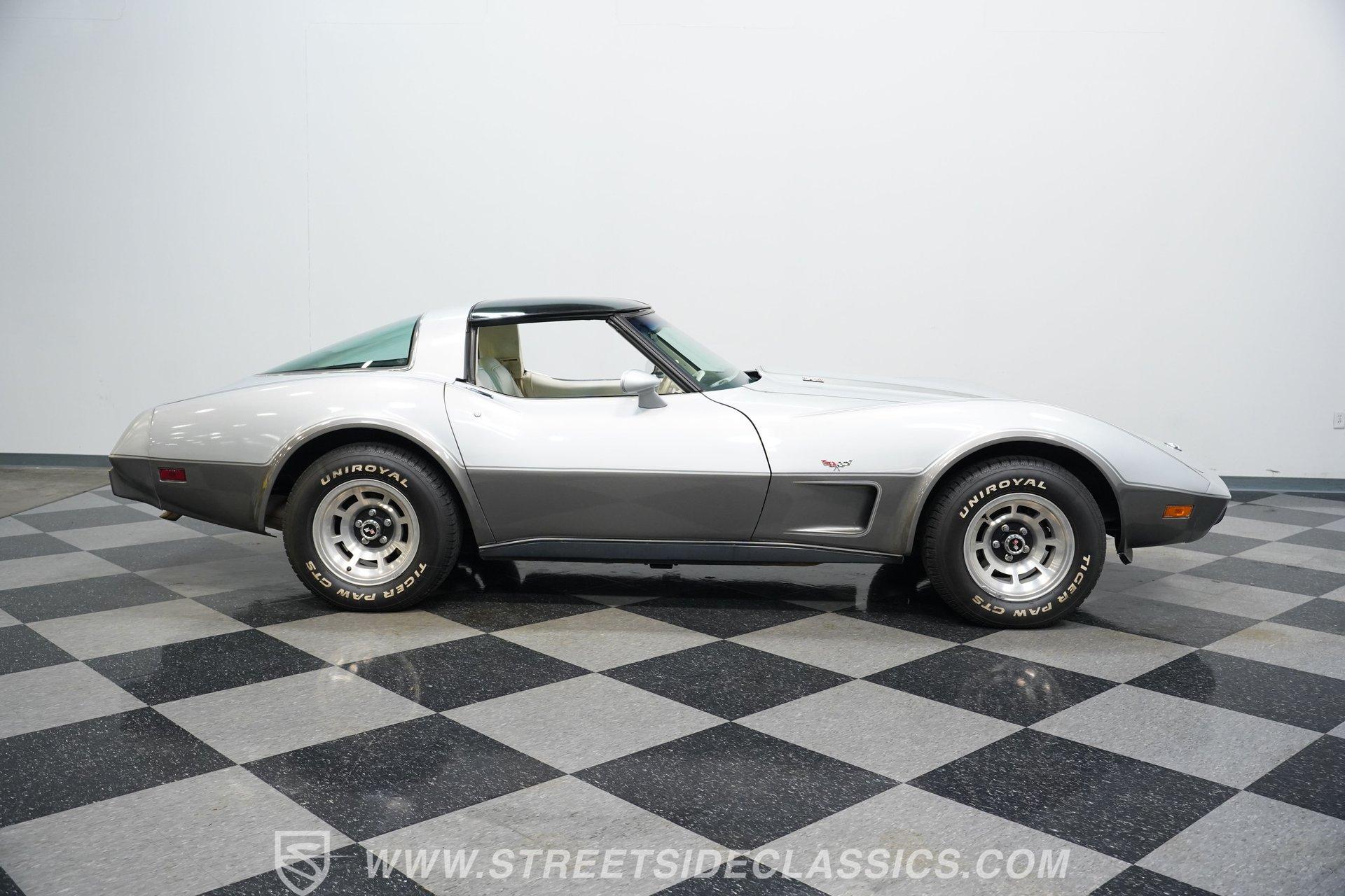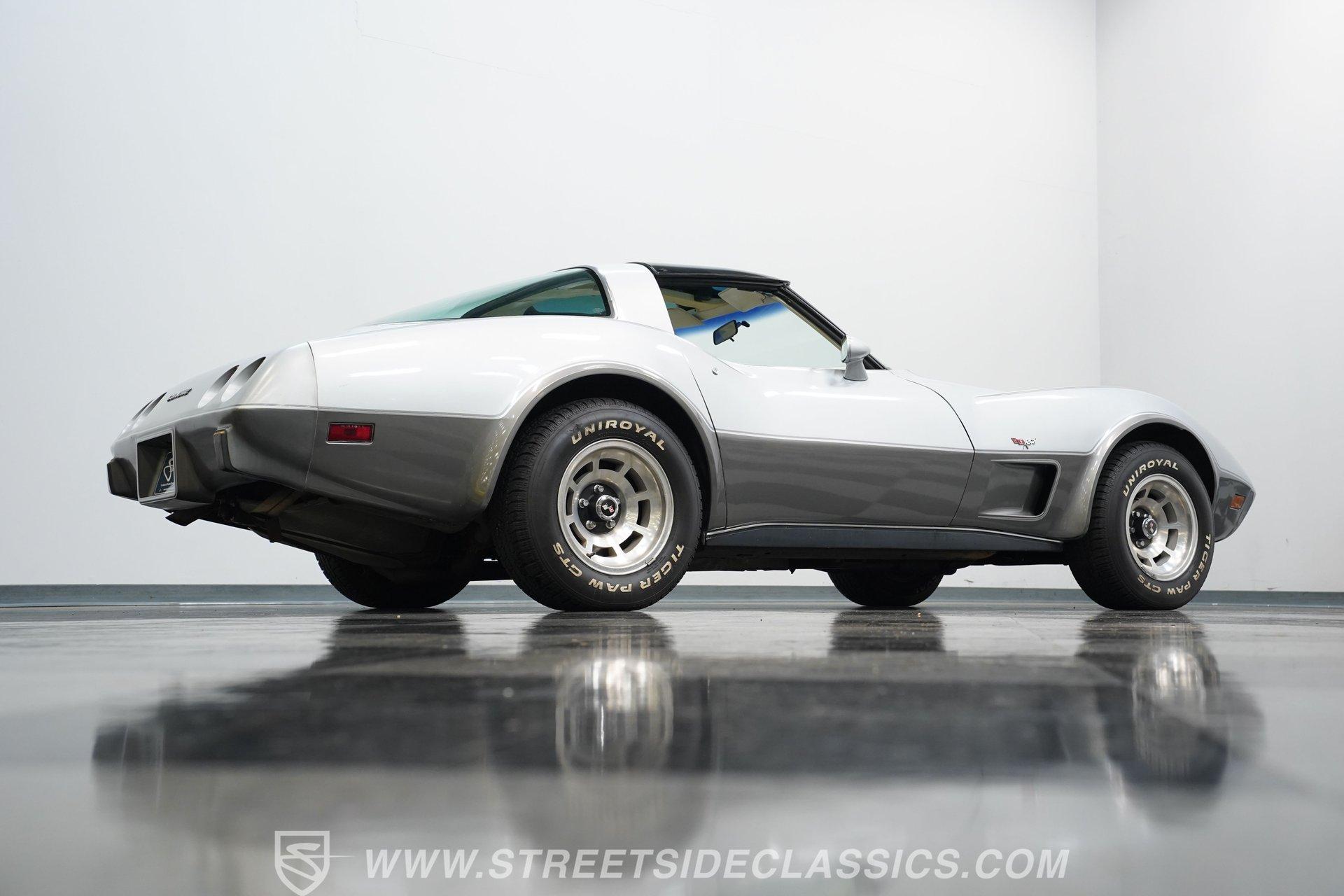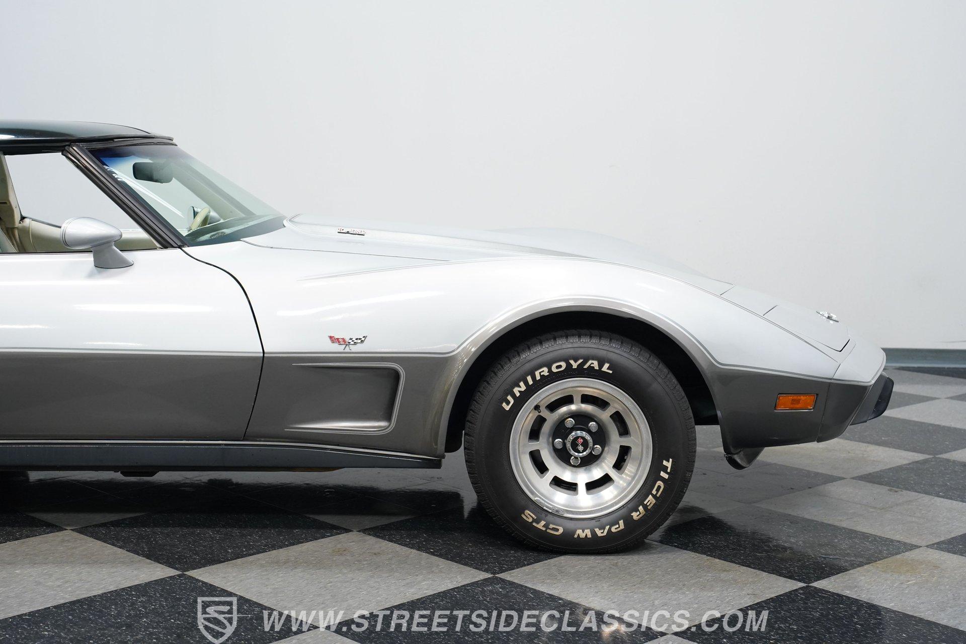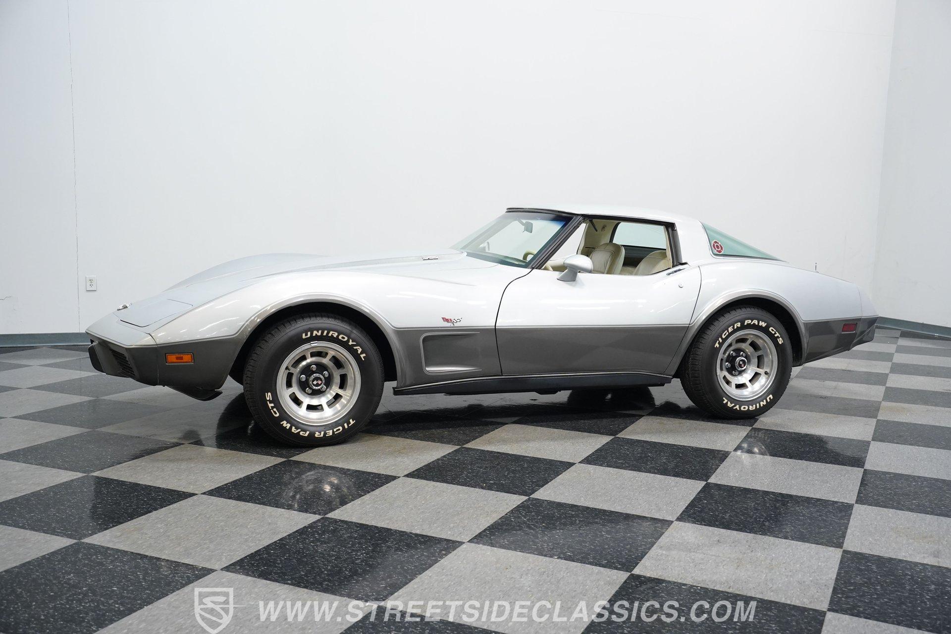There's something undeniably captivating about sliding behind the wheel of a classic American sports car. The sweeping lines, the unmistakable rumble of a V8, and the promise of open roads transport you to a time when every drive felt like a celebration. Whether you grew up watching these icons cruise Main Street or always dreamed of owning a legend, a classic Corvette stands as a symbol of power, freedom, and timeless style. Now, the opportunity is yours with this 1978 Chevrolet Corvette L82 Silver Anniversary Edition, a true piece of automotive history just waiting for its next chapter. Step inside and you're greeted by an interior that perfectly balances vintage character with comfort and convenience. The original cabin features well-preserved upholstery with only minor wear, while the supportive seats and classic layout invite you to settle in for the journey. Enjoy the upgraded retro sound system, tilt and telescopic steering wheel, power windows, and power locks, all blending seamlessly with the Corvette's unmistakable styling. The T-tops overhead give you the option to embrace the sunshine or cruise under the stars. Under the sculpted hood sits the legendary L82 350 V8, a small block powerhouse that delivers the distinctive performance Corvette enthusiasts crave. This numbers-matching engine is paired with a smooth-shifting 3-speed automatic transmission, factory power brakes, power steering, and cold-blowing air conditioning, ensuring every drive is as enjoyable as it is memorable. The dual exhaust system adds a throaty note to the driving experience, while the factory-style suspension and 15-inch wheels keep you connected to the road. With just 12,924 believed actual miles, this Corvette stands as a remarkably preserved example. Highlights 1978 Silver Anniversary Edition L82 350 V8 Numbers-Matching Engine 3-Speed Automatic Transmission 12,924 Believed Actual Miles Factory Power Steering and Power Brakes Air Conditioning, Blows Cold T-Tops for Open-Air Driving Upgraded Retro Sound System with Aux/Bluetooth Power Windows and Power Locks Tilt and Telescopic Steering Wheel Factory Style Suspension with Air Shocks Dual Exhaust System, Cat-Delete Believed Original Paint and Panels Maintenance Records and Original Documentation Financing Available Vehicle Protection Plans Available Worldwide Shipping Owning a 1978 Chevrolet Corvette L82 Silver Anniversary Edition means more than just possessing a car-it's about joining a legacy of performance and style that never goes out of fashion. With its low mileage, rare options, and classic appeal, this Corvette is ready to become the centerpiece of your collection or the star of your next cruise. Call, email, or come visit our showroom today!