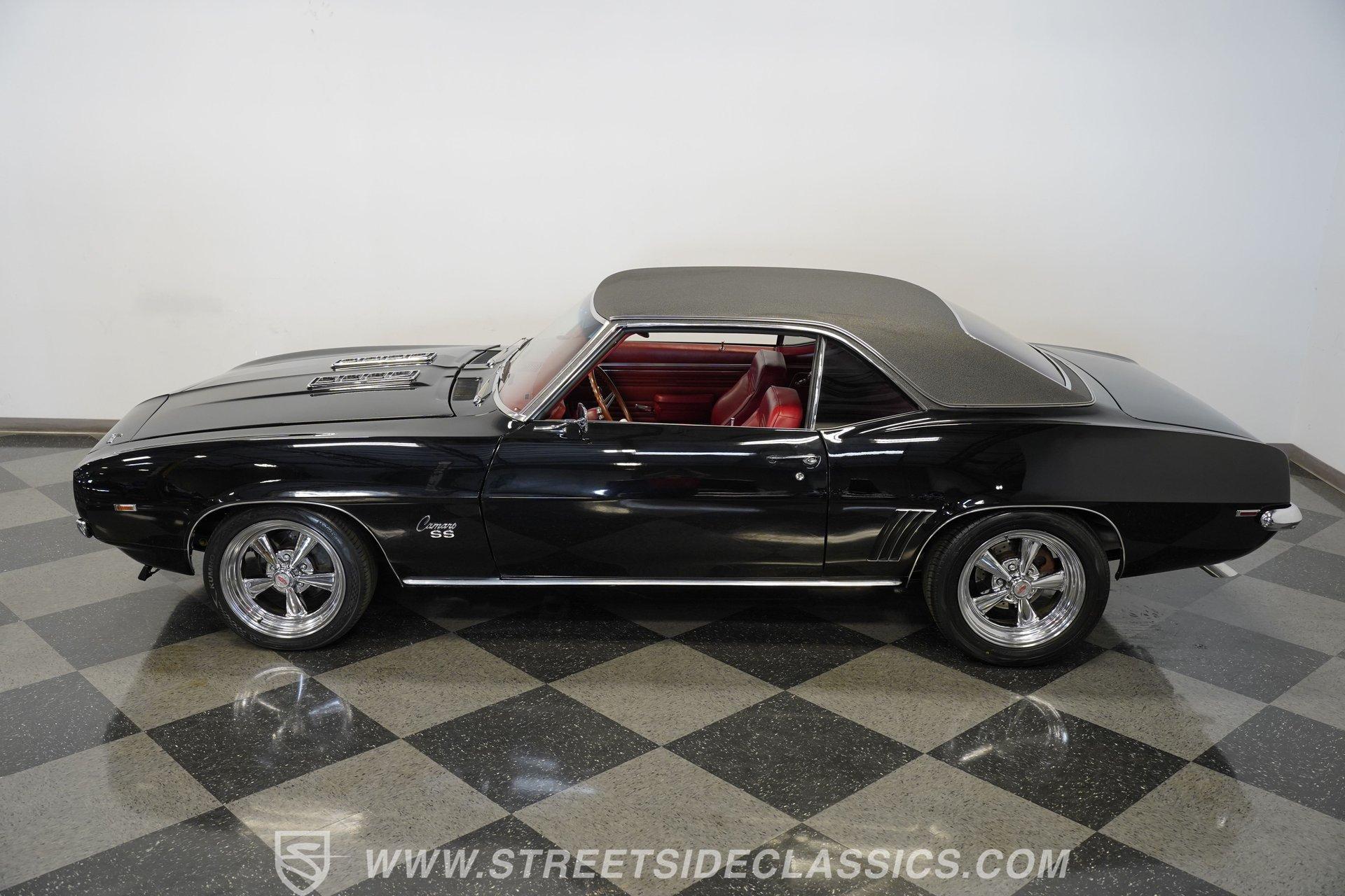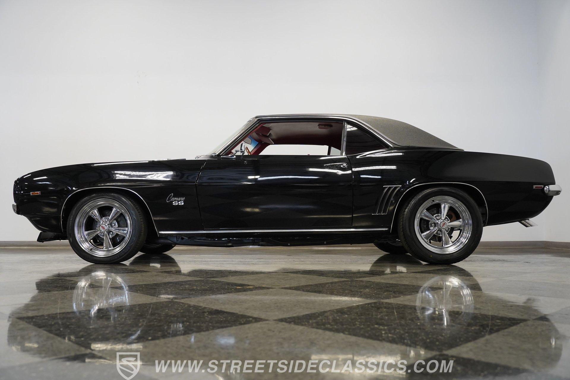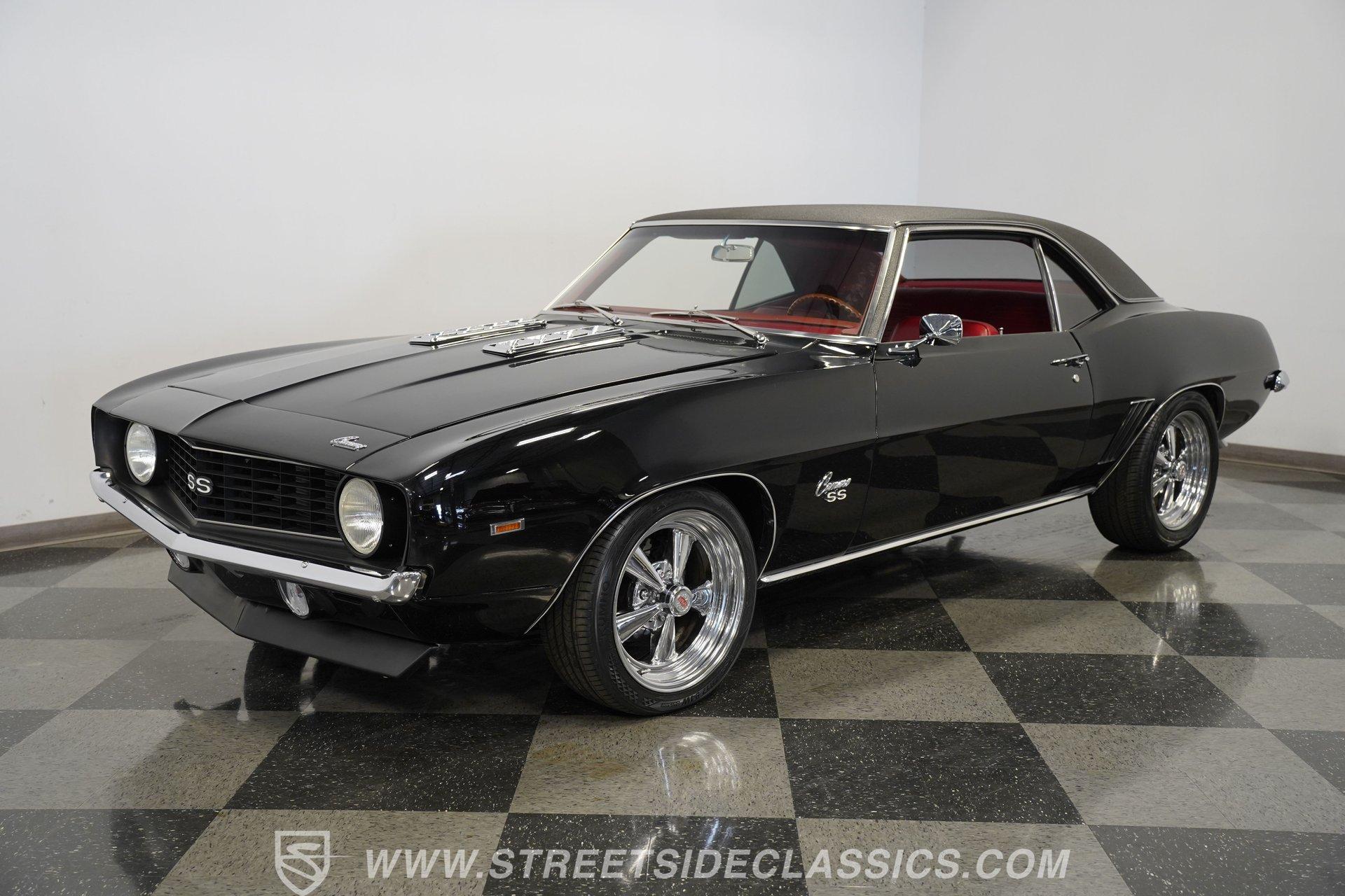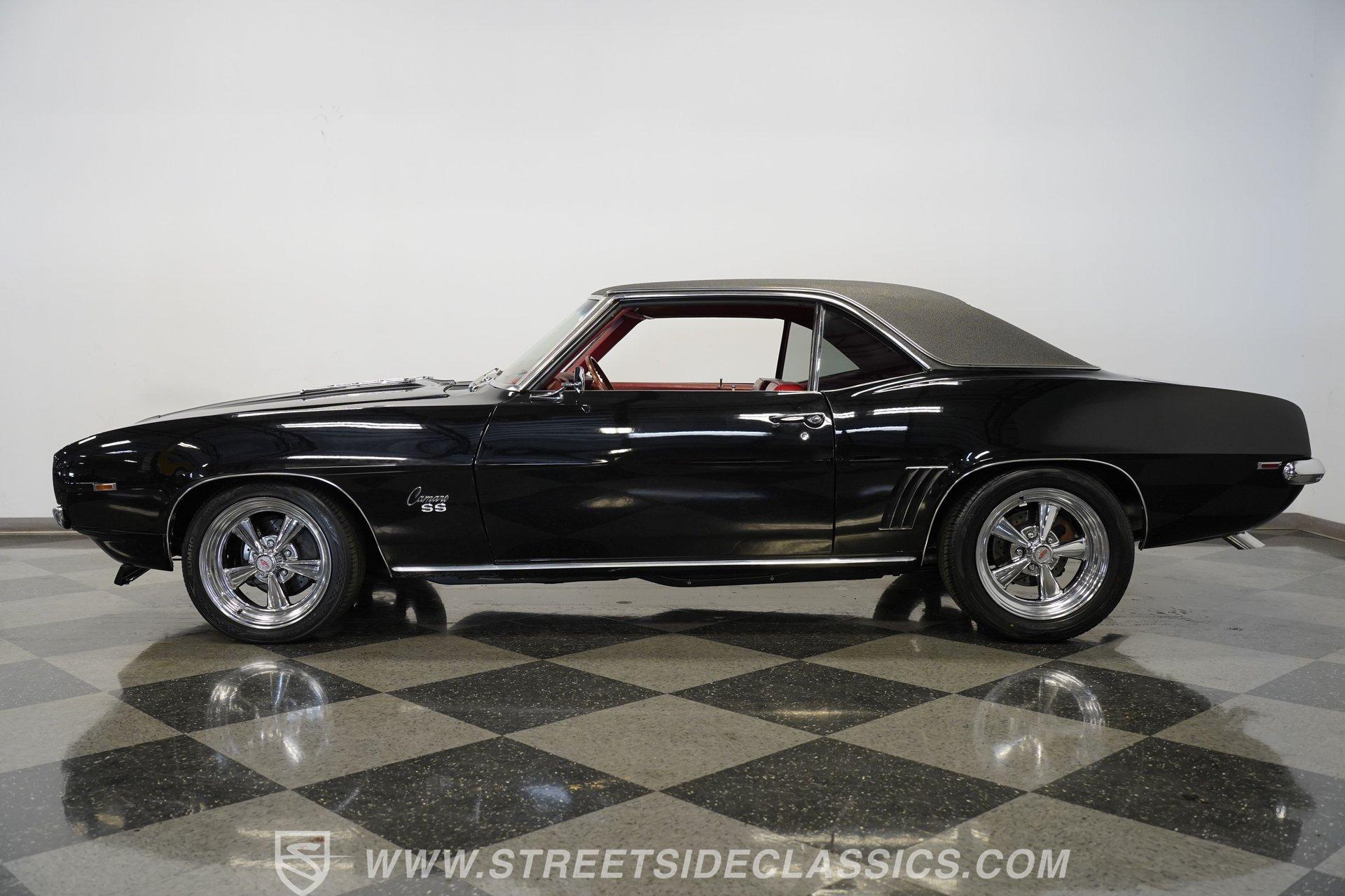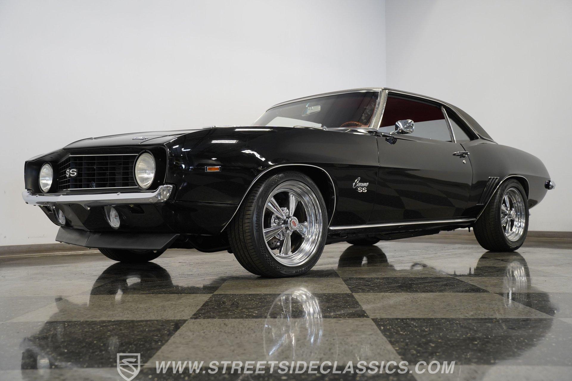 When it comes to muscle cars, there is nothing quite like a first-generation Camaro. Power, prestige, and pizazz begin to describe this beautiful 1969 Chevrolet Camaro SS 502. Fully repainted in a deep black exterior paint, this Super Sport comes with all the correct SS badging, and aside from its polished Cragar SS wheels, there is almost nothing hinting that this car has a bit more lurking under its hood than stock; at least not until you start it up. But before we get to that power part of the fun, first let us introduce you to this exquisitely redone red vinyl interior. A pair of plush and supportive bucket seats sit just ahead of a wood-rimmed steering wheel and matching woodgrain console trim to add a bit of contrast. Just beyond that wheel is a six-pod Marshall gauge cluster, featuring a big 160 mph speedometer and 10,000 rpm tachometer. A white Hurst cueball-style shifter and padded expletive handle give both the driver and passenger something to hold onto when this Pony Car really digs in. Under that louvered hood, we find a clean engine bay with a massive 502 cubic-inch naturally-aspirated V-8 sitting comfortably between the fenders. A single four-barrel Holley QFT carburetor feeds into an aluminum intake manifold, while a dual exhaust and chambered exhaust do away with spent gases. Power from that big block gets funneled through a tried-and-true Muncie four-speed manual before heading out to the twelve-bolt Moser rear end. HIGHLIGHTS: Full Black Repaint 502 Crate V8 Holley QFT Carb Aluminum Intake Dual Exhaust Muncie Four Speed Hurst Shifter Moser 12 Bolt Rear Fully Redone Interior Upgraded Bucket Seats Marshall Gauges Power Brakes Four Wheel Discs Cross Drilled Slotted Rotors Cragar SS Wheels Tubular A-arm Front Suspension Sway Bars Coilovers Subframe Connectors This 1969 Chevrolet Camaro SS 502 isn't just a straight-line monster. Thanks to a lowered suspension that features tubular A-arms, coilovers, and a sway bar up front, along with another sway bar and subframe connectors in the rear, this Pony Car can gallop through the twisties, too. A set of four-wheel power disc brakes featuring cross-drilled and slotted rotors stands ready to scrub off speed whenever necessary. If you enjoy the thrill of a first-gen Camaro as much as we do, but want just a bit more power than the factory ever made, then don't wait any longer because this beautiful black boulevard bruiser won't be around long. Call today!