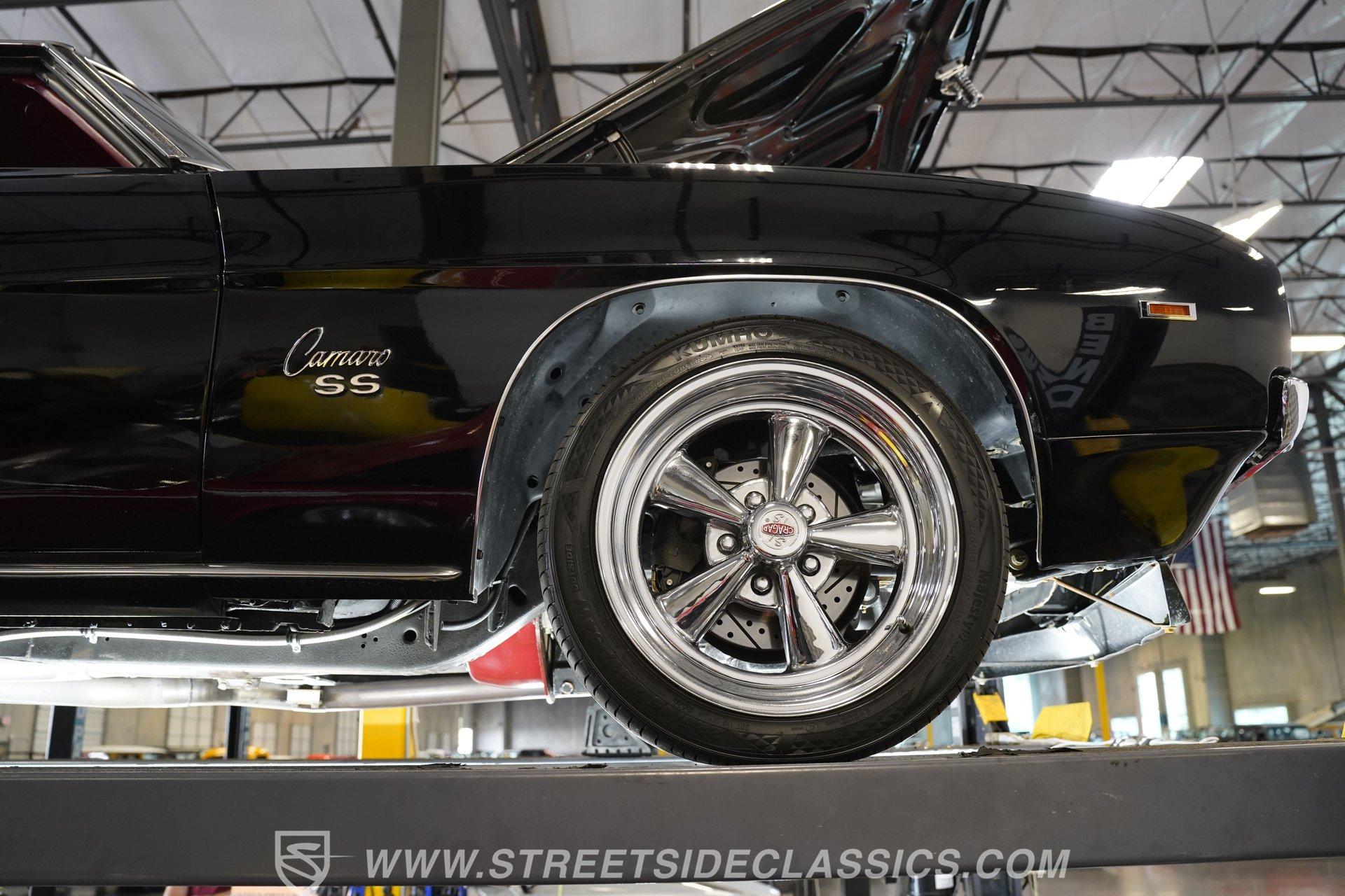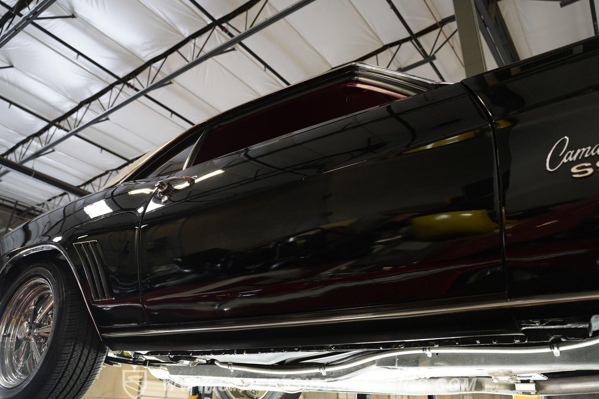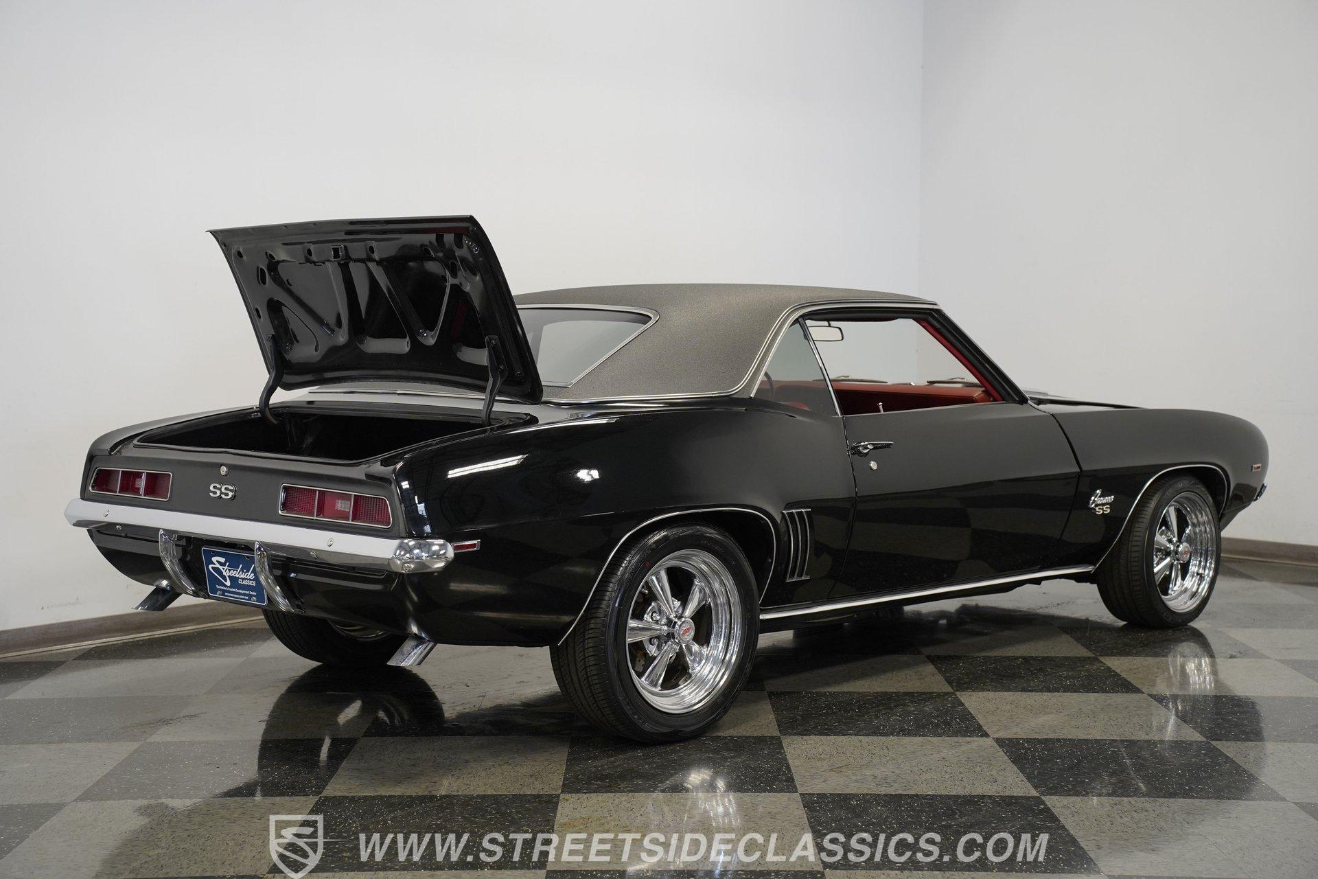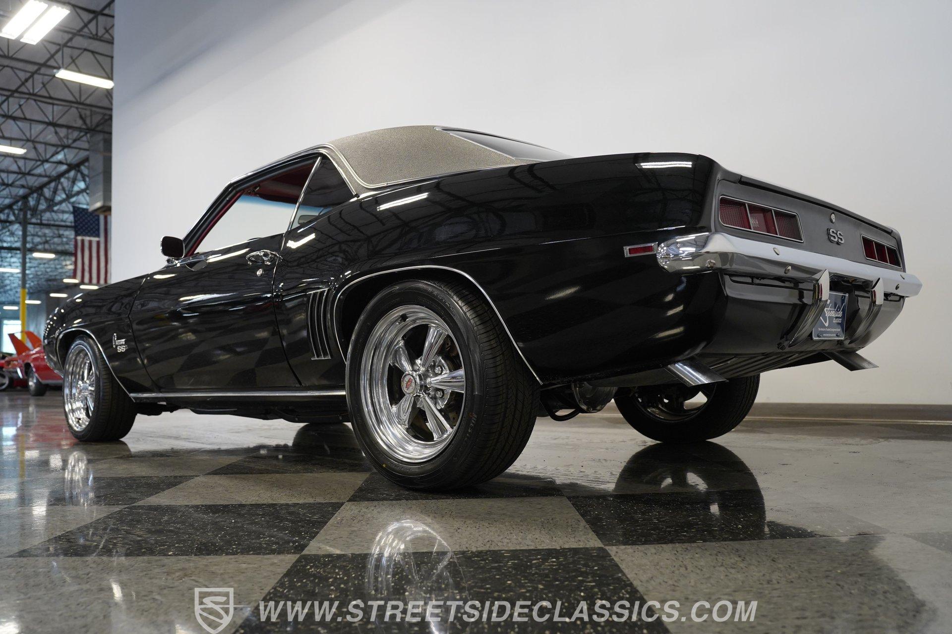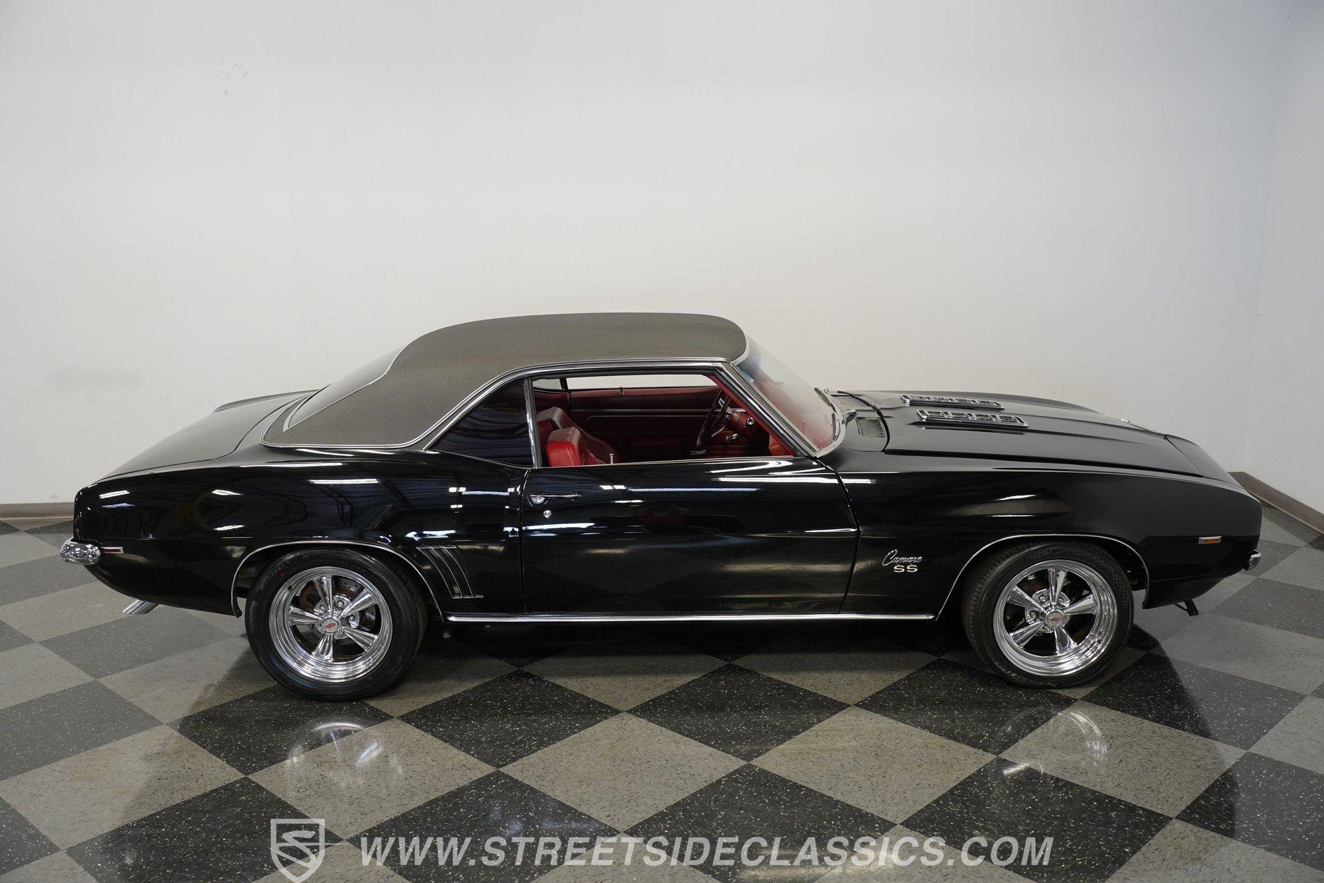 When it comes to muscle cars, there is nothing quite like a first-generation Camaro. Power, prestige, and pizazz begin to describe this beautiful 1969 Chevrolet Camaro SS 502. Fully repainted in a deep black exterior paint, this Super Sport comes with all the correct SS badging, and aside from its polished Cragar SS wheels, there is almost nothing hinting that this car has a bit more lurking under its hood than stock; at least not until you start it up. But before we get to that power part of the fun, first let us introduce you to this exquisitely redone red vinyl interior. A pair of plush and supportive bucket seats sit just ahead of a wood-rimmed steering wheel and matching woodgrain console trim to add a bit of contrast. Just beyond that wheel is a six-pod Marshall gauge cluster, featuring a big 160 mph speedometer and 10,000 rpm tachometer. A white Hurst cueball-style shifter and padded expletive handle give both the driver and passenger something to hold onto when this Pony Car really digs in. Under that louvered hood, we find a clean engine bay with a massive 502 cubic-inch naturally-aspirated V-8 sitting comfortably between the fenders. A single four-barrel Holley QFT carburetor feeds into an aluminum intake manifold, while a dual exhaust and chambered exhaust do away with spent gases. Power from that big block gets funneled through a tried-and-true Muncie four-speed manual before heading out to the twelve-bolt Moser rear end. HIGHLIGHTS: Full Black Repaint 502 Crate V8 Holley QFT Carb Aluminum Intake Dual Exhaust Muncie Four Speed Hurst Shifter Moser 12 Bolt Rear Fully Redone Interior Upgraded Bucket Seats Marshall Gauges Power Brakes Four Wheel Discs Cross Drilled Slotted Rotors Cragar SS Wheels Tubular A-arm Front Suspension Sway Bars Coilovers Subframe Connectors This 1969 Chevrolet Camaro SS 502 isn't just a straight-line monster. Thanks to a lowered suspension that features tubular A-arms, coilovers, and a sway bar up front, along with another sway bar and subframe connectors in the rear, this Pony Car can gallop through the twisties, too. A set of four-wheel power disc brakes featuring cross-drilled and slotted rotors stands ready to scrub off speed whenever necessary. If you enjoy the thrill of a first-gen Camaro as much as we do, but want just a bit more power than the factory ever made, then don't wait any longer because this beautiful black boulevard bruiser won't be around long. Call today!